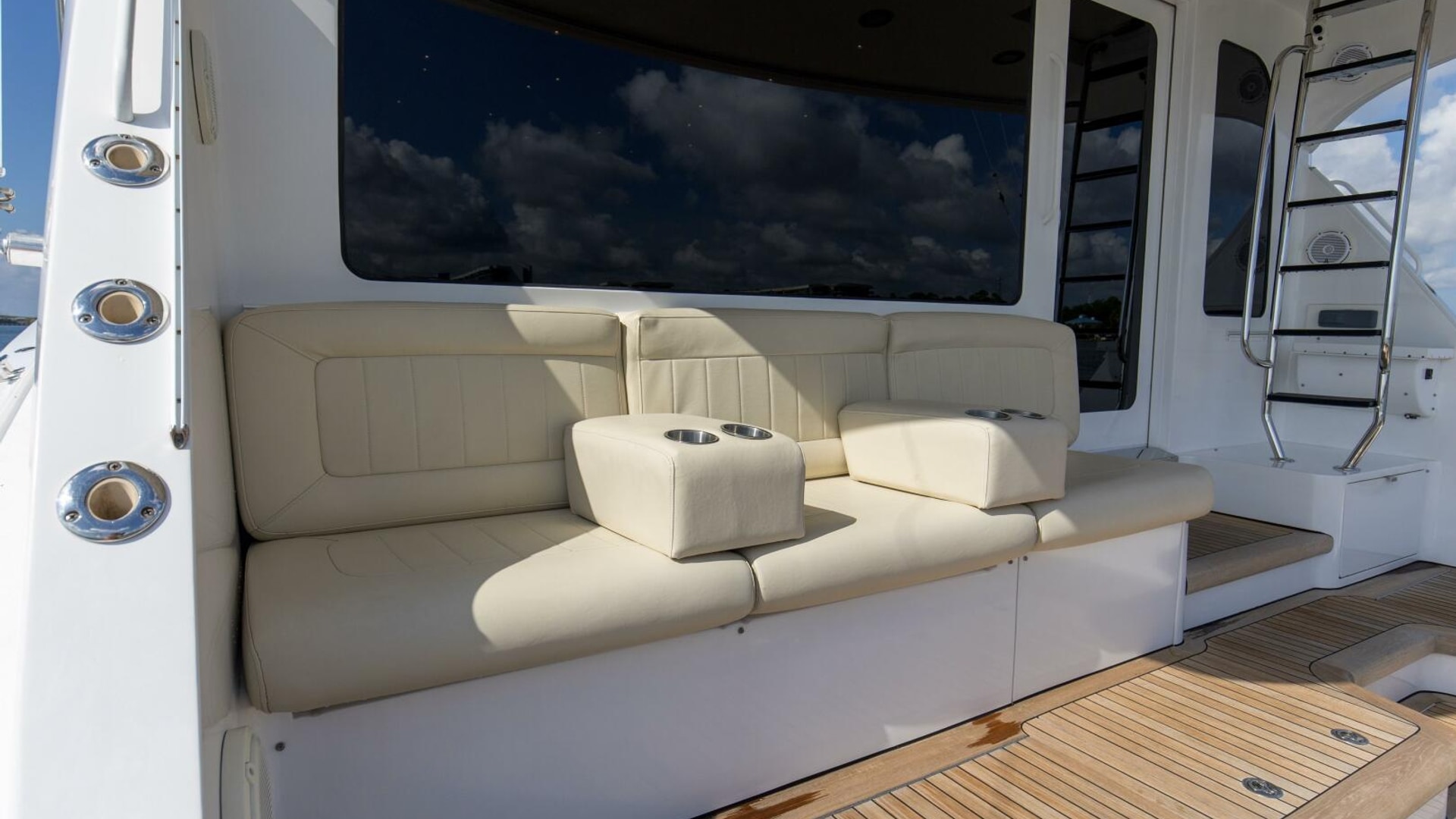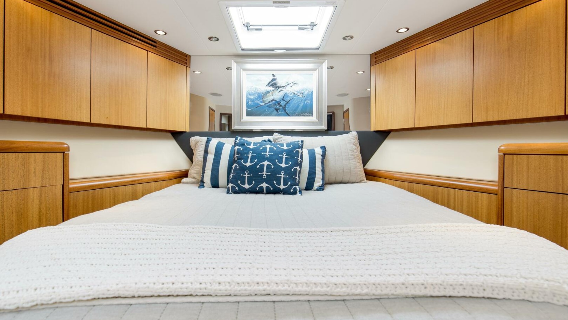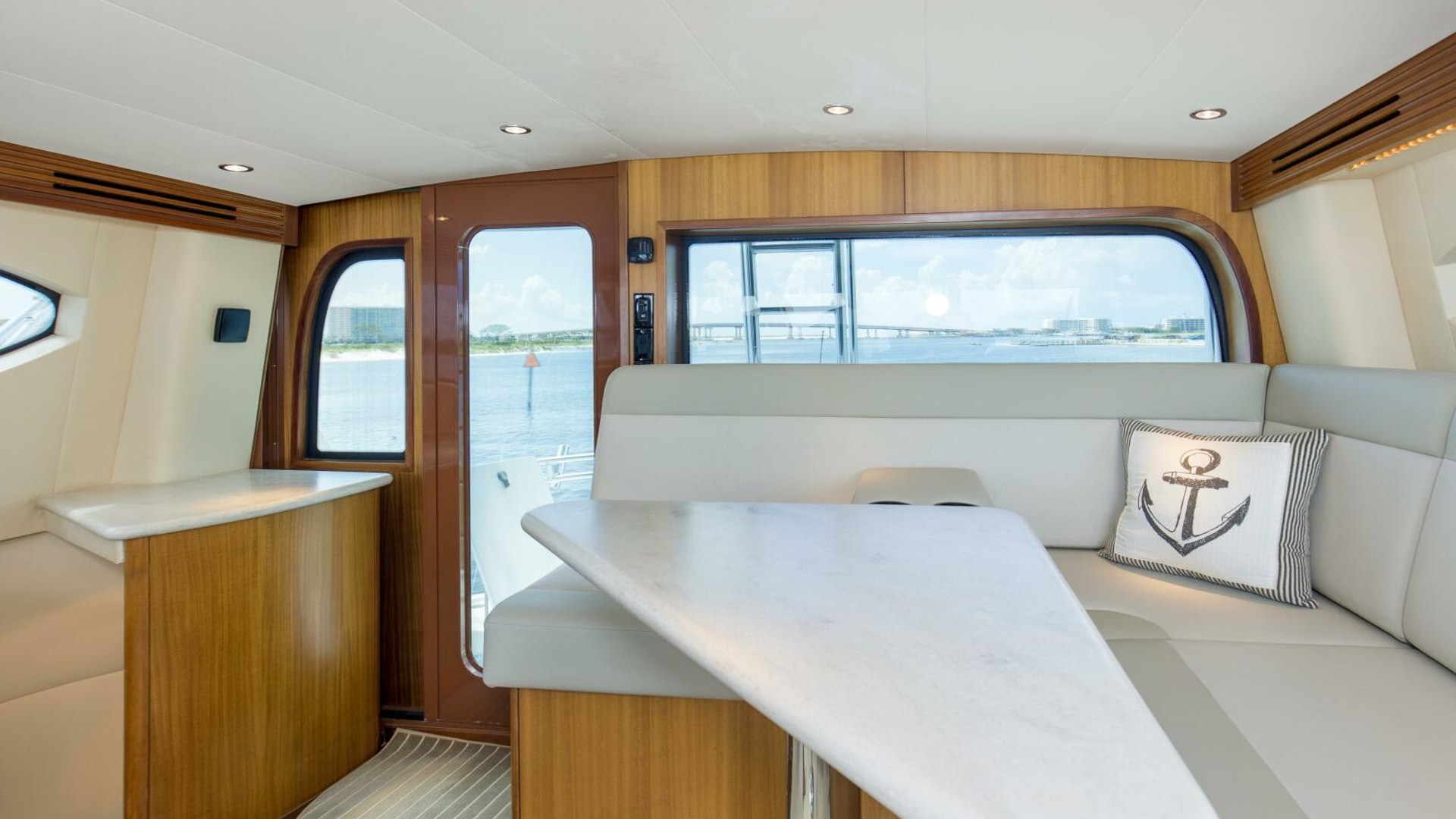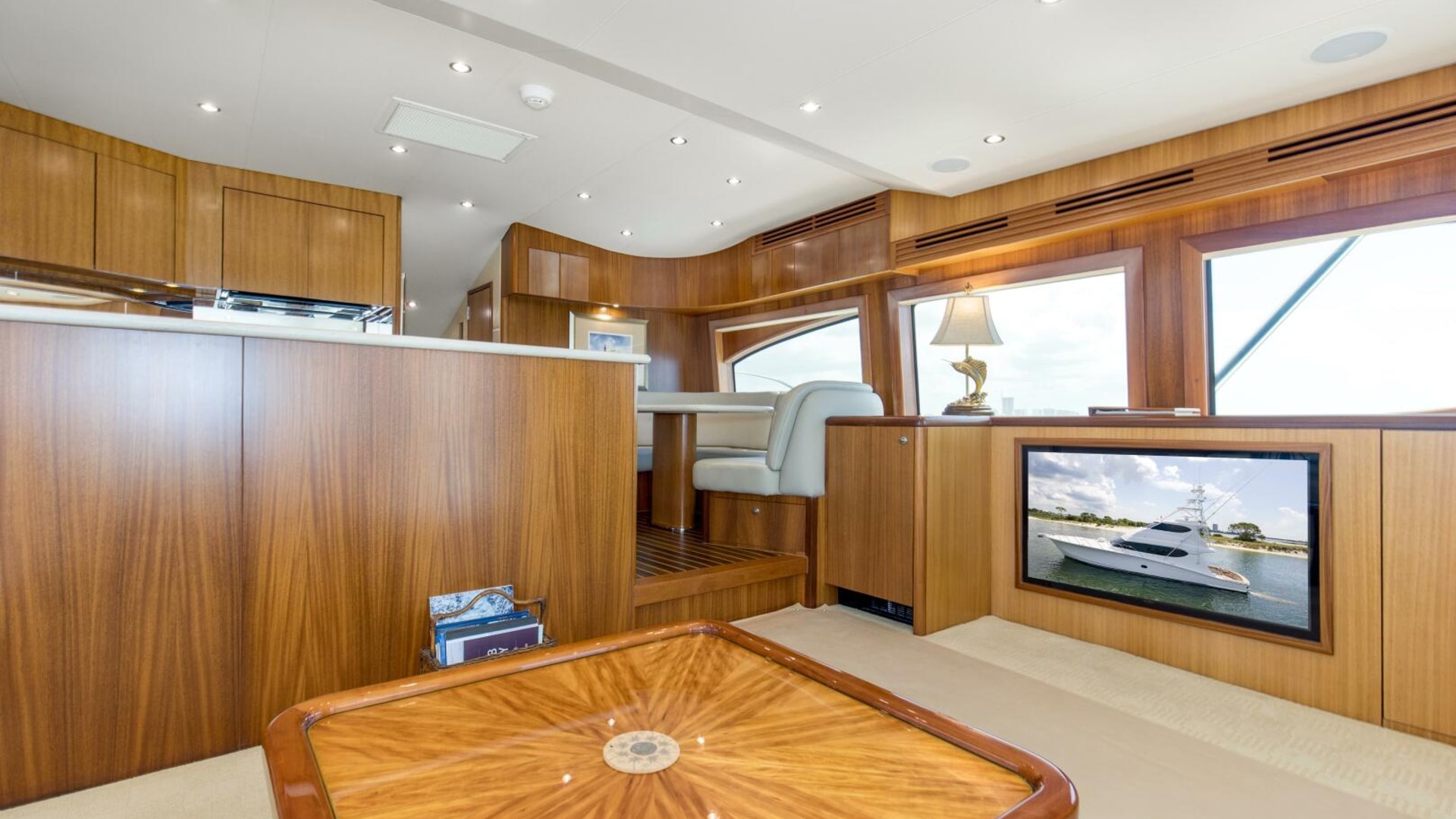 “REFUGE” features African Mahogany interior wood with a touch of classic eloquent soft good for a sophisticated touch. As you enter the salon door, the 21'6" beam provides for an expansive salon. A U-shaped sofa to port with storage underneath provides plenty of seating and storage for offshore tackle. To starboard, a 42" smart TV is neatly tucked into the bulkhead and connected to the onboard surround sound system. To provide additional protection, a full carpet runner covers the high traffic areas of the salon.