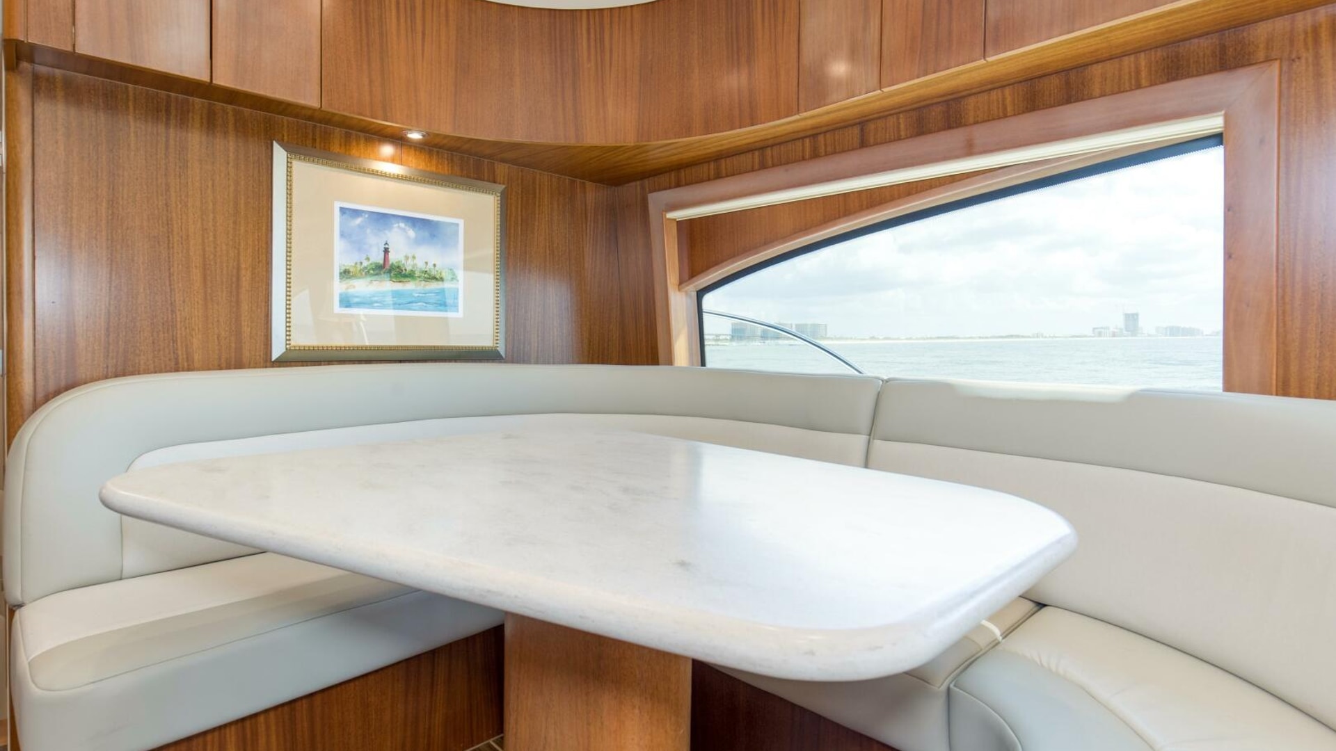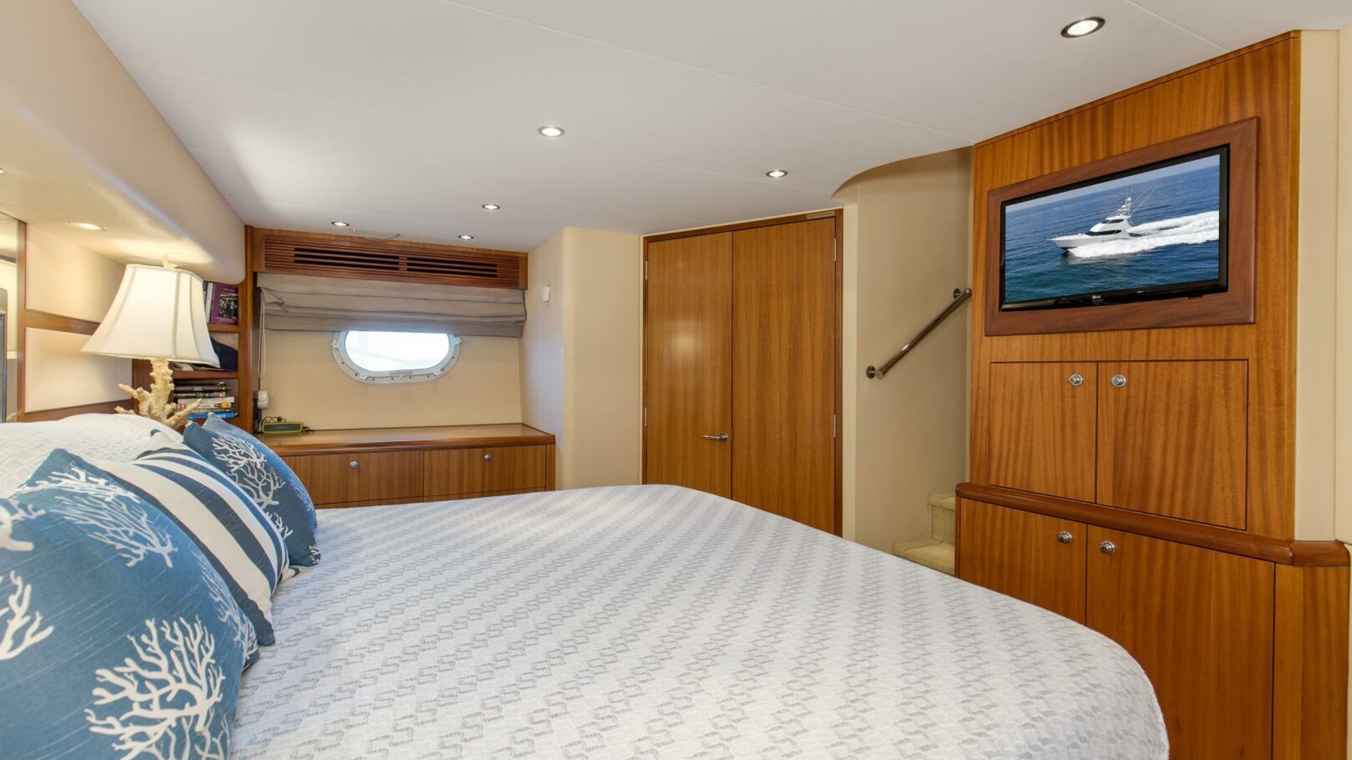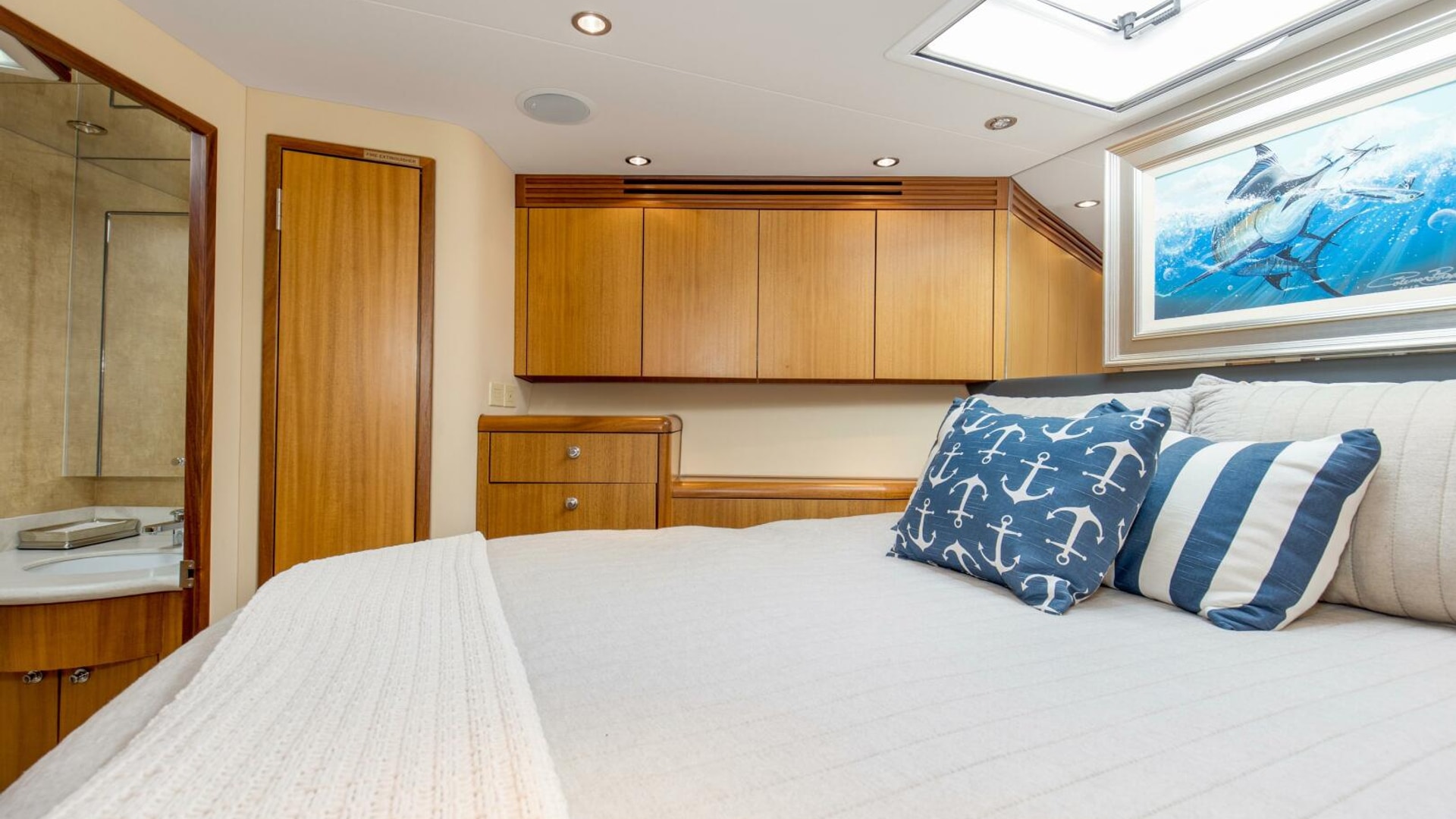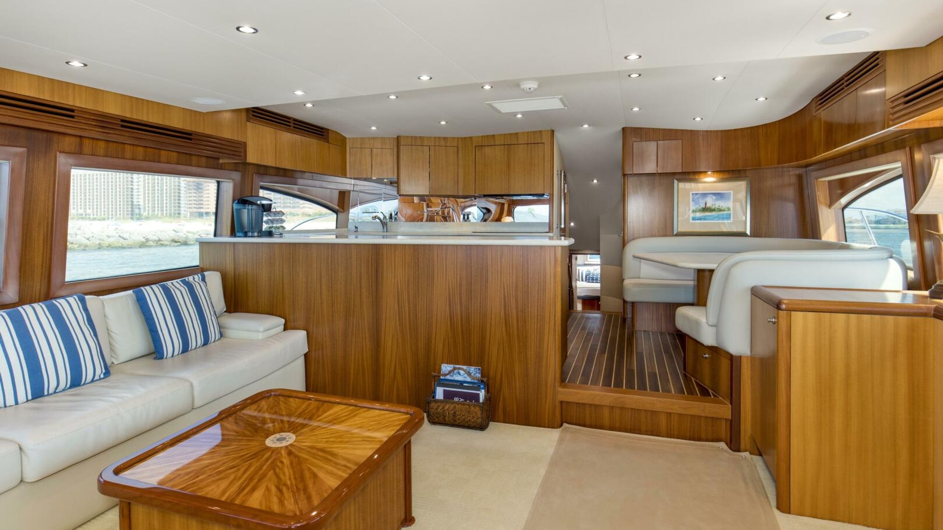 “REFUGE” features African Mahogany interior wood with a touch of classic eloquent soft good for a sophisticated touch. As you enter the salon door, the 21'6" beam provides for an expansive salon. A U-shaped sofa to port with storage underneath provides plenty of seating and storage for offshore tackle. To starboard, a 42" smart TV is neatly tucked into the bulkhead and connected to the onboard surround sound system. To provide additional protection, a full carpet runner covers the high traffic areas of the salon.