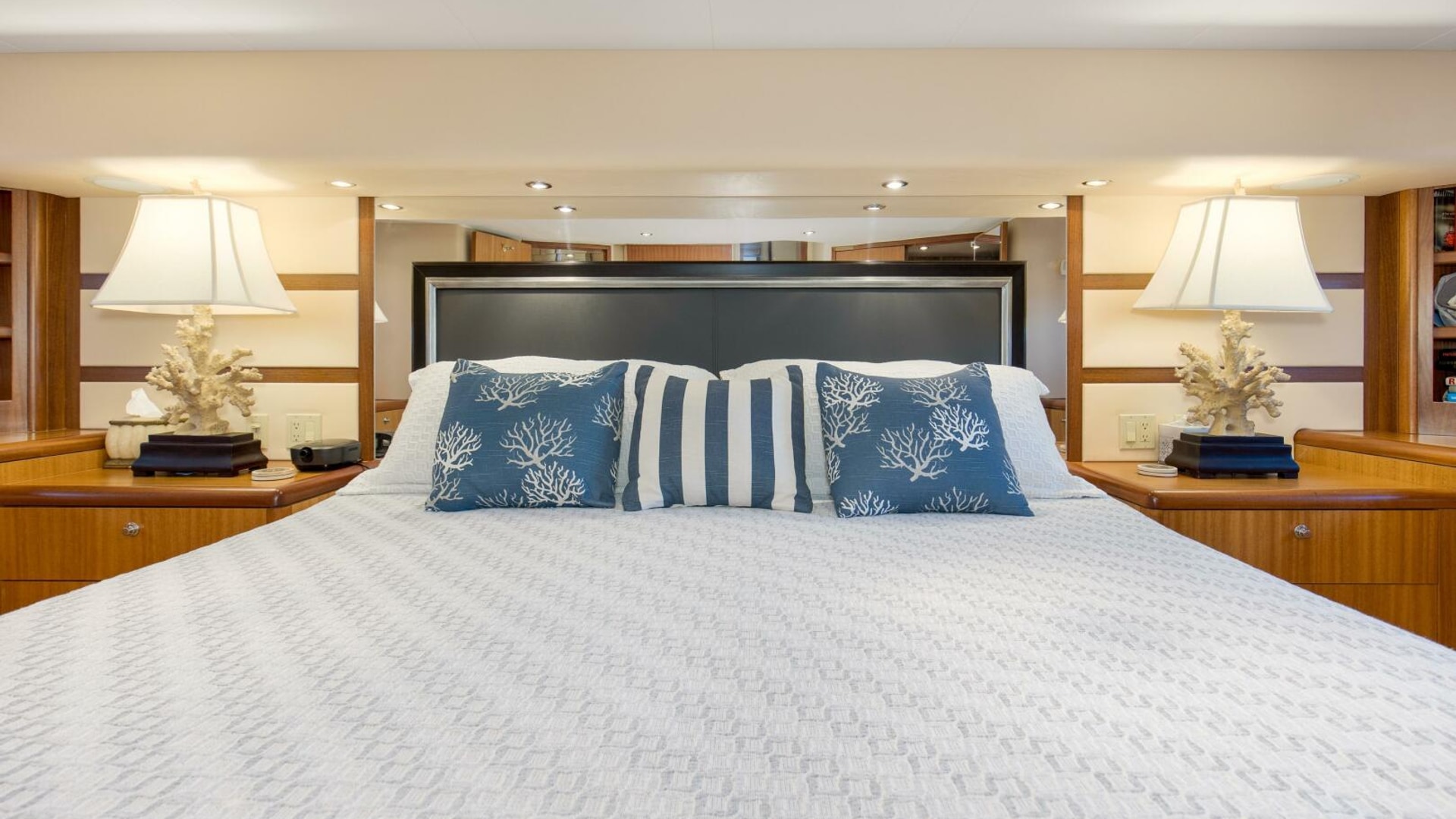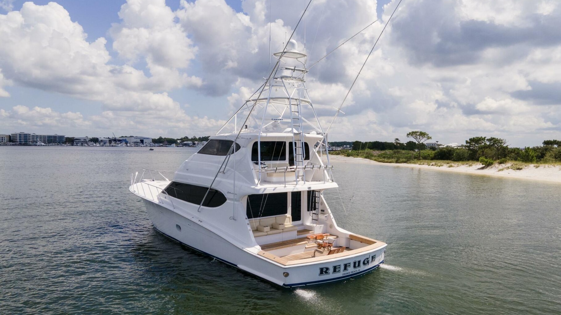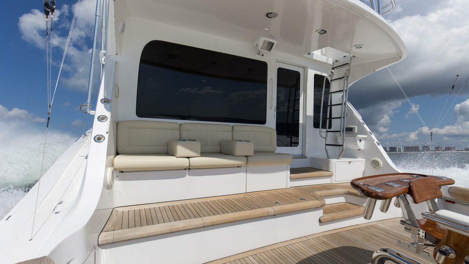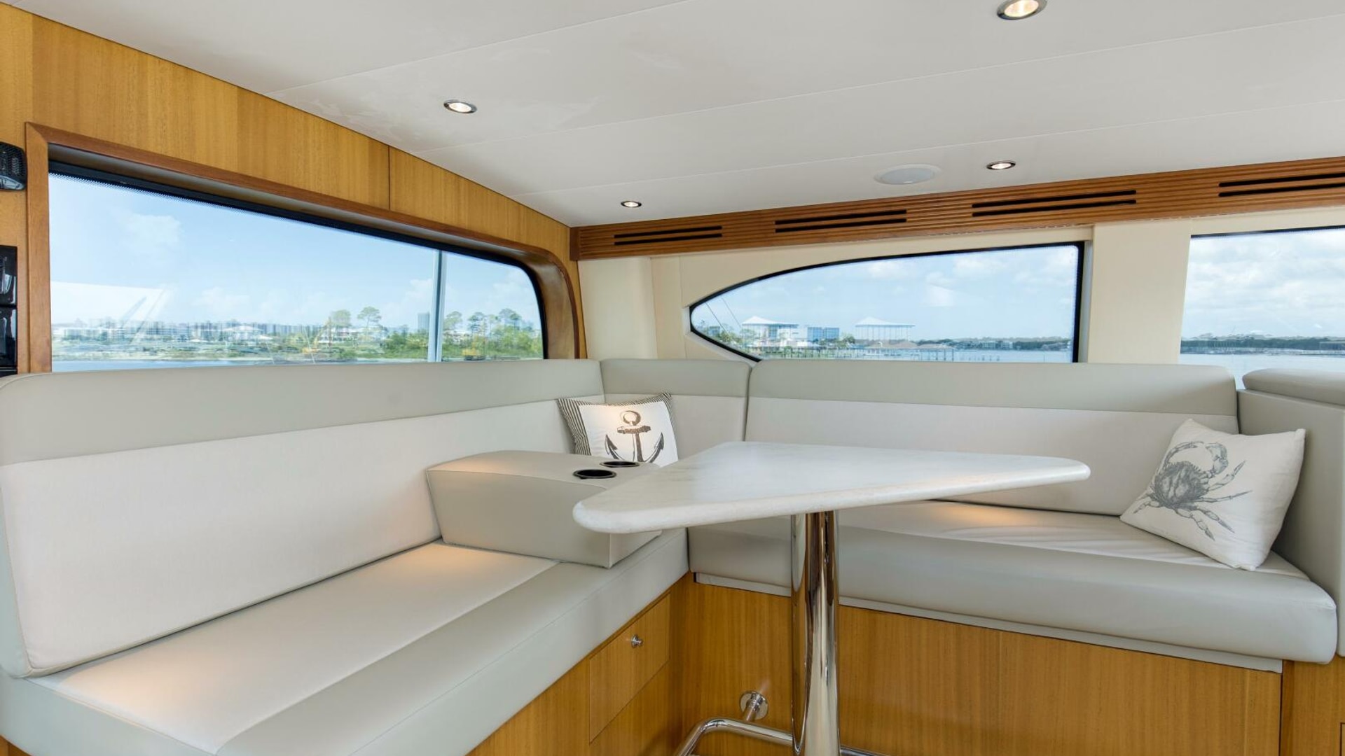 “REFUGE” features African Mahogany interior wood with a touch of classic eloquent soft good for a sophisticated touch. As you enter the salon door, the 21'6" beam provides for an expansive salon. A U-shaped sofa to port with storage underneath provides plenty of seating and storage for offshore tackle. To starboard, a 42" smart TV is neatly tucked into the bulkhead and connected to the onboard surround sound system. To provide additional protection, a full carpet runner covers the high traffic areas of the salon.