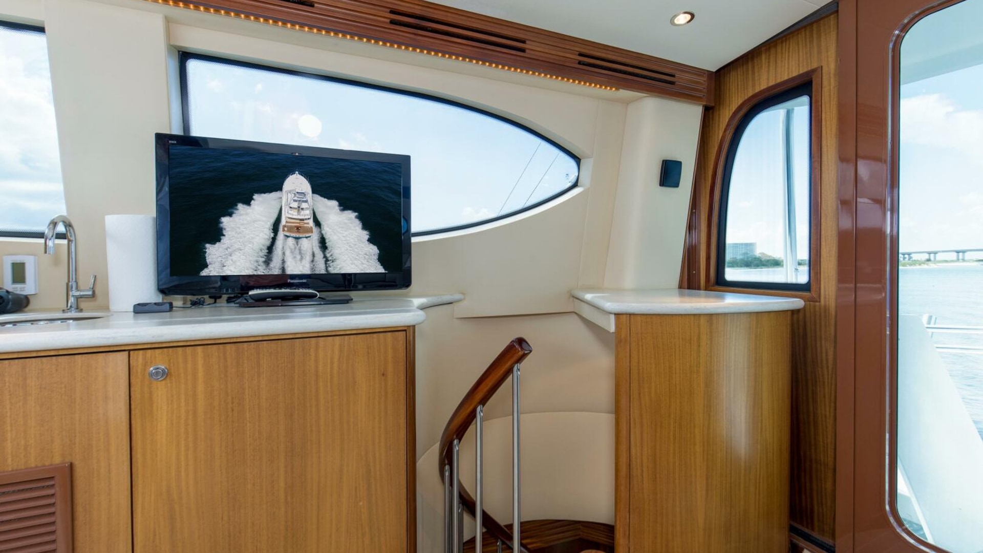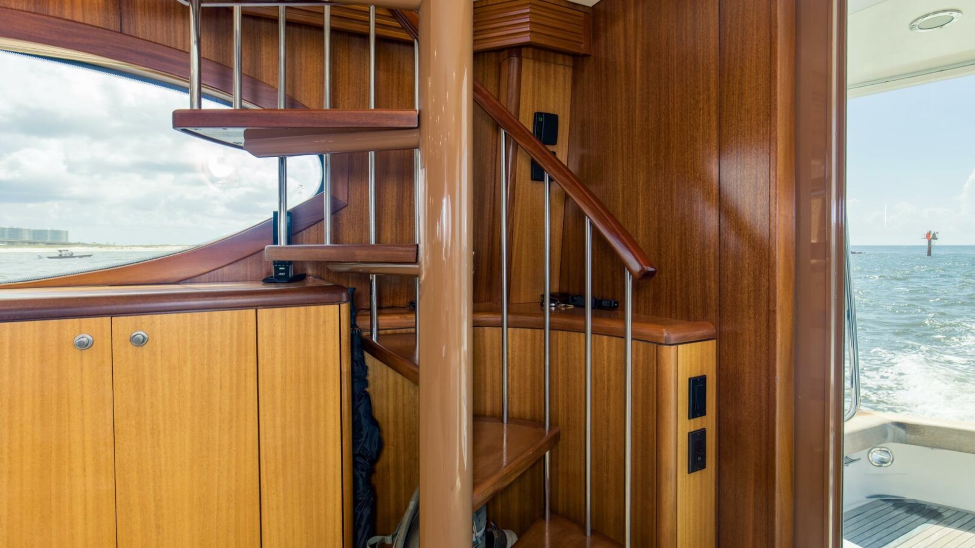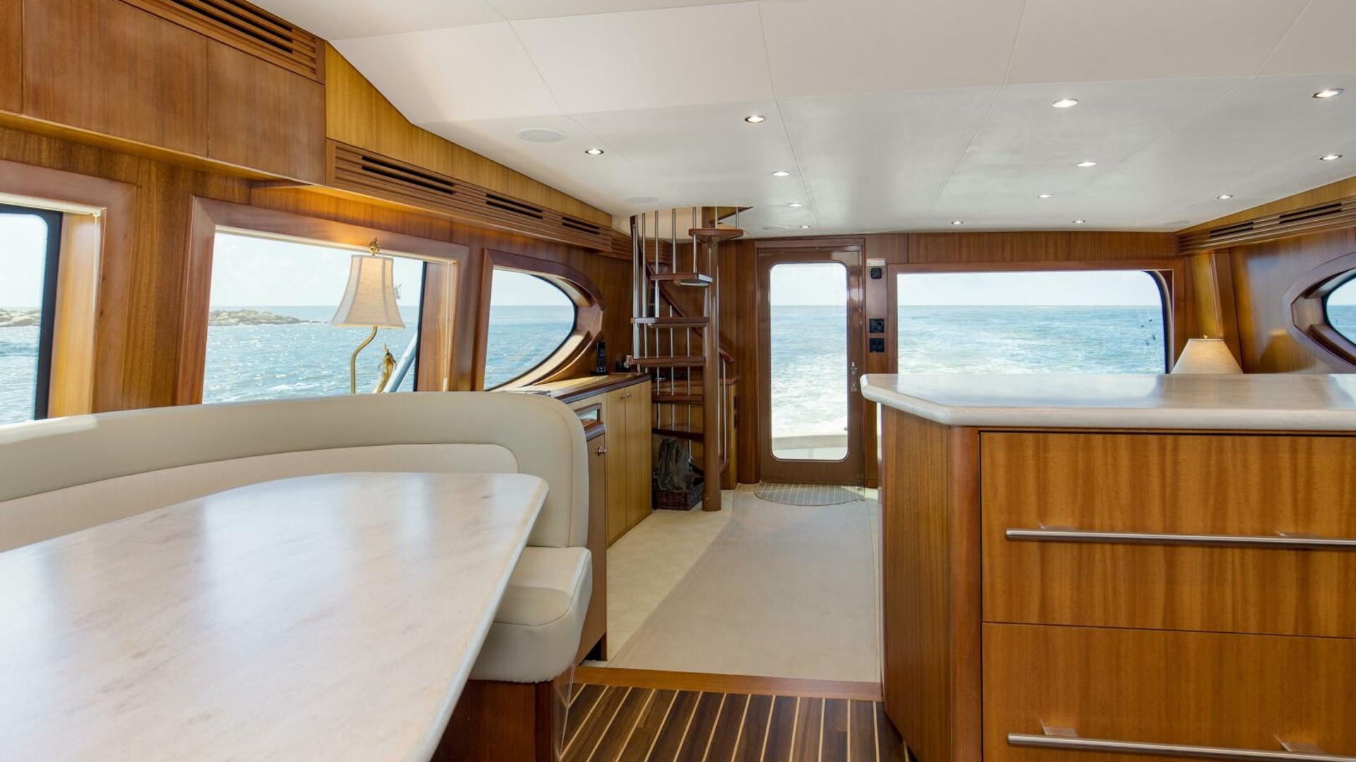 - Interior spiral staircase for access to enclosed flybridge