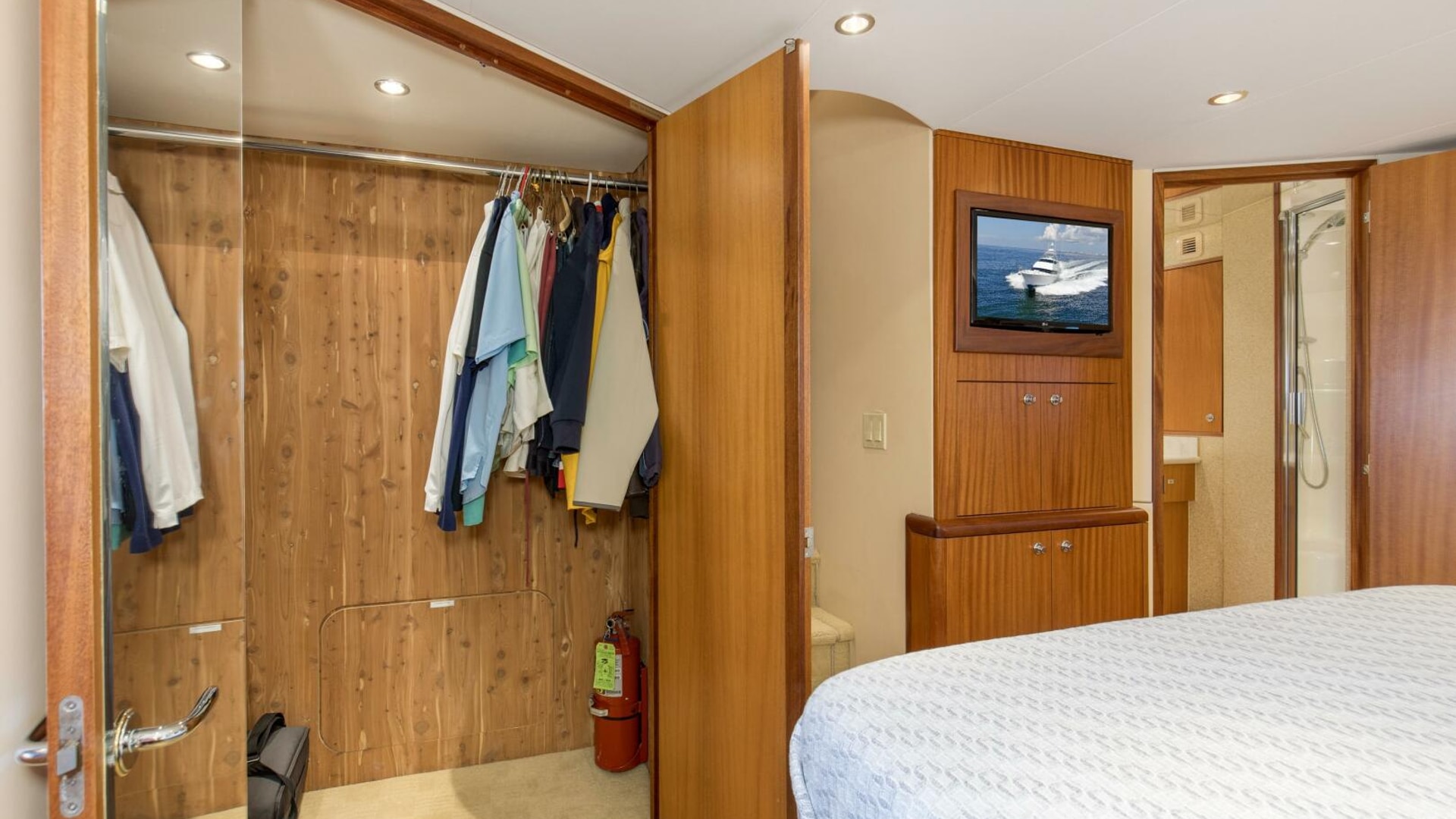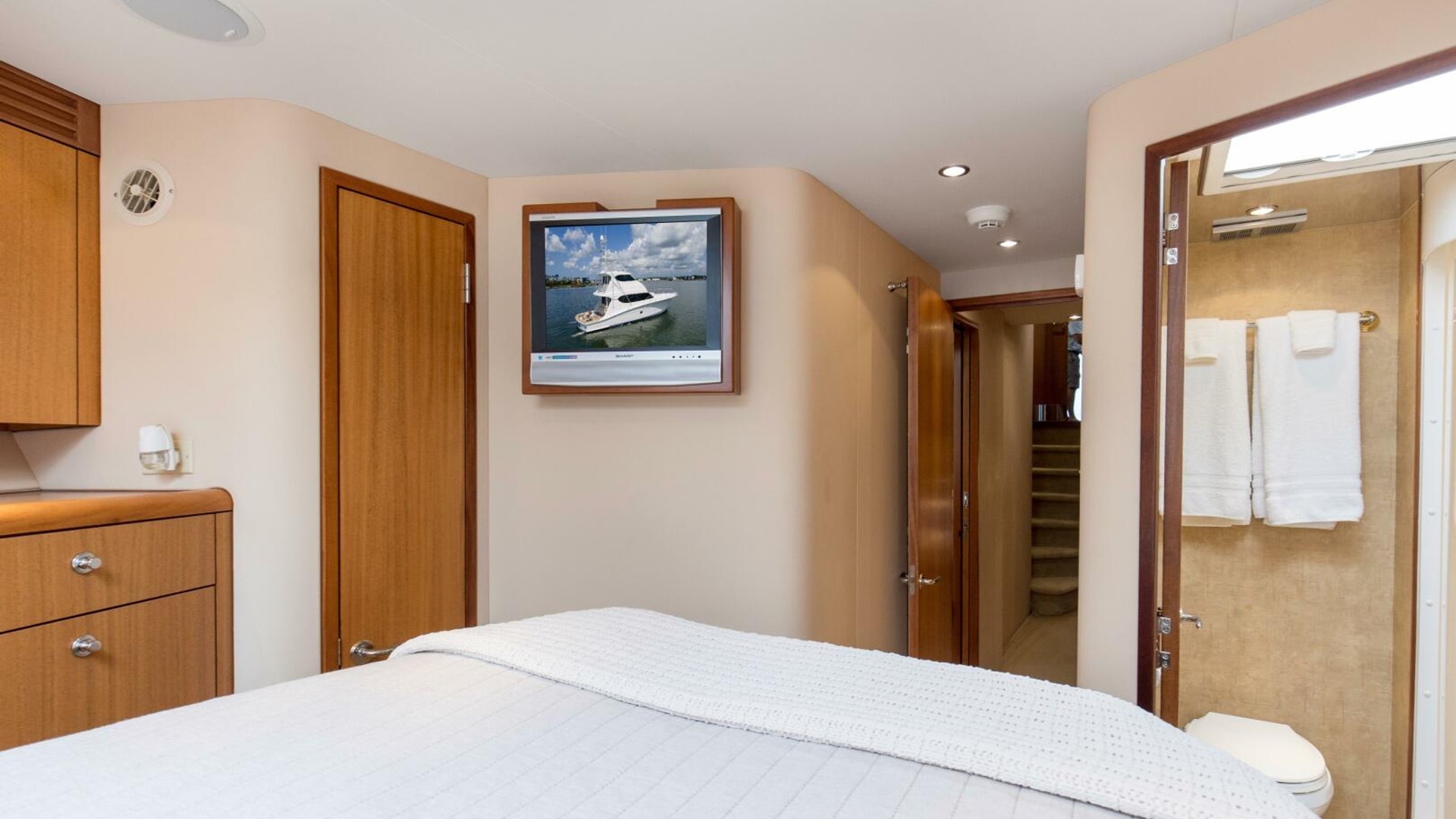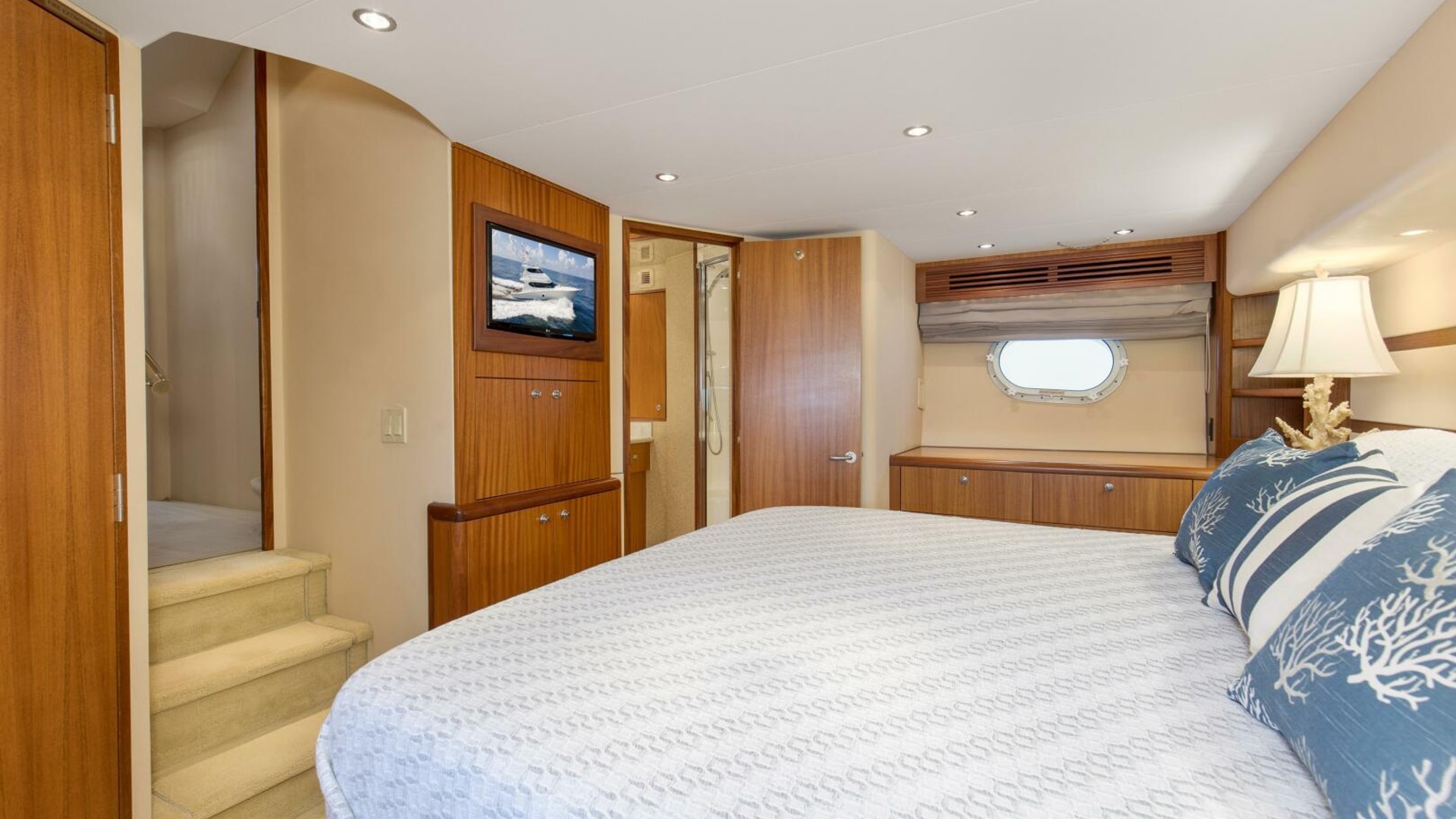 - Interior spiral staircase for access to enclosed flybridge