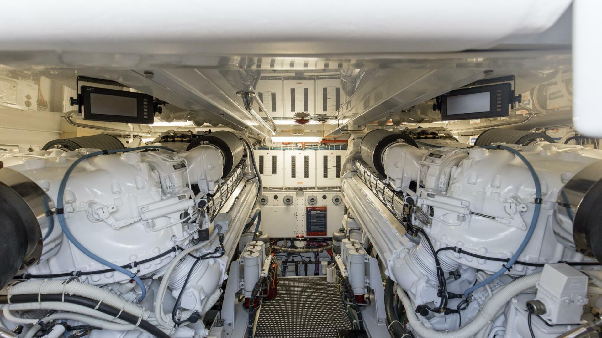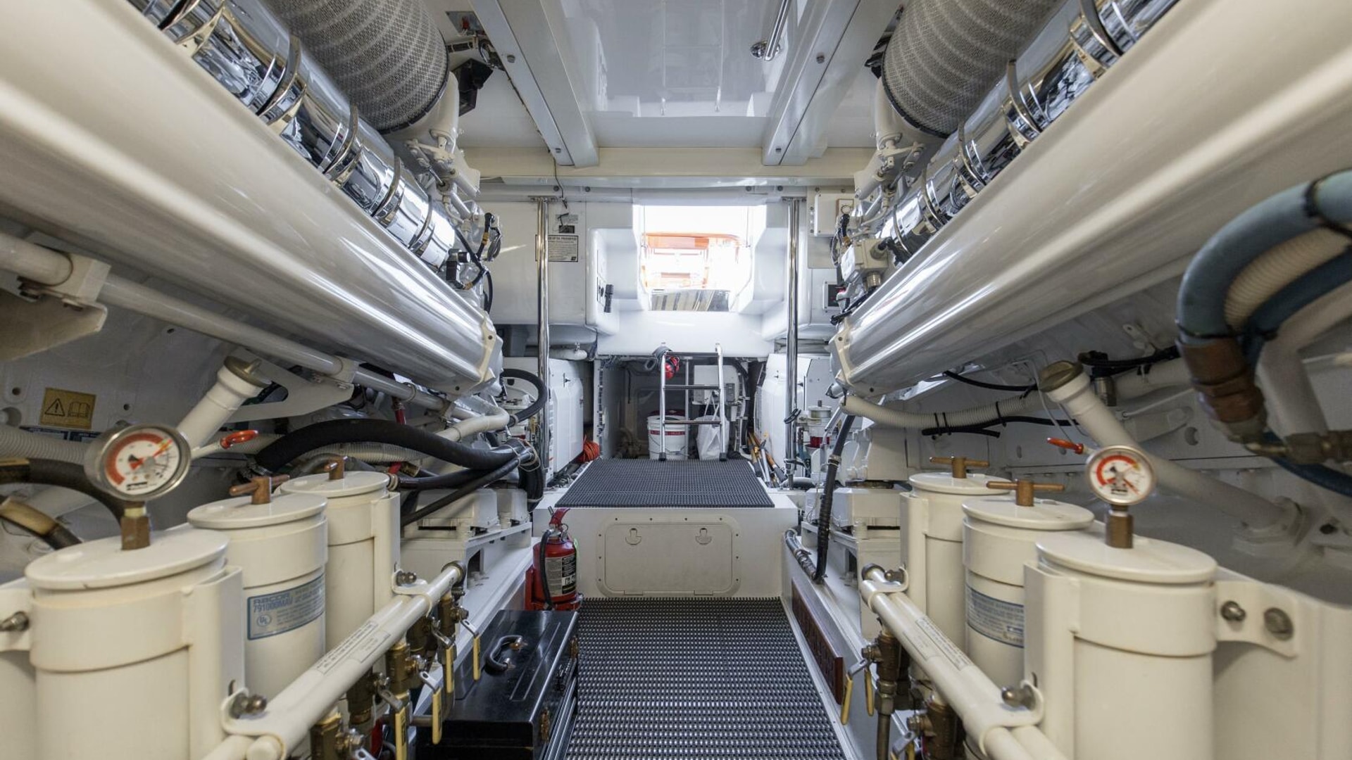 - Twin diesel, freshwater-cooled main engines with electrically controlled marine gears, neutral interlocks, exhaust silencers, engine hour meters, alternators, fuel filters and seawater strainers