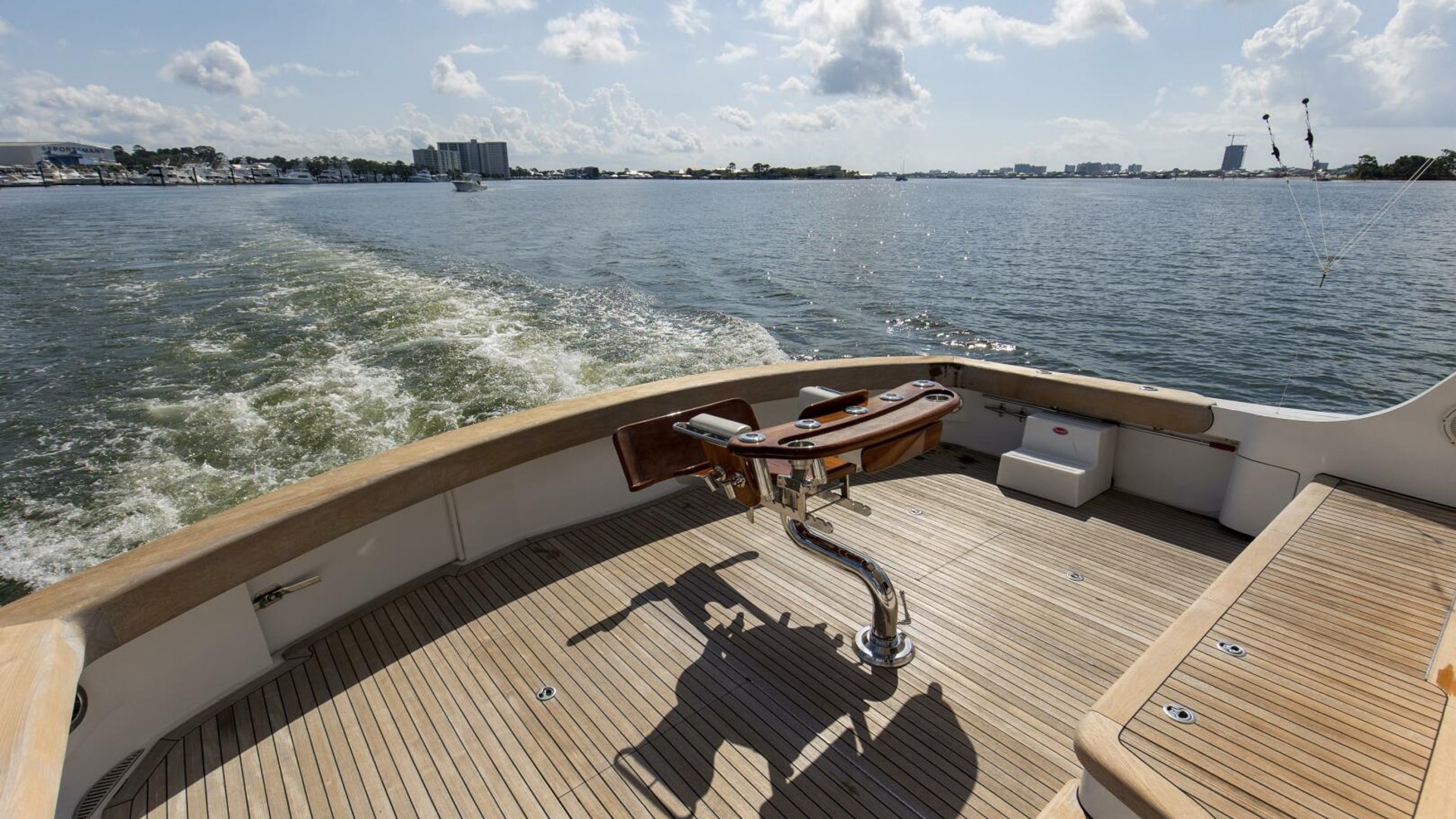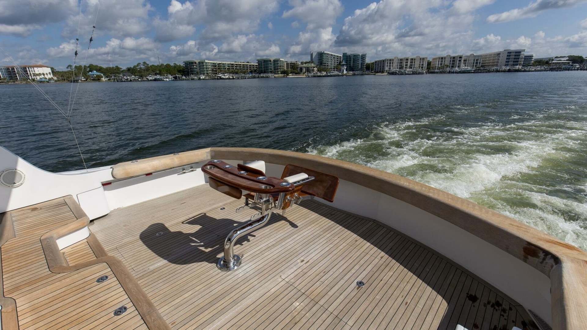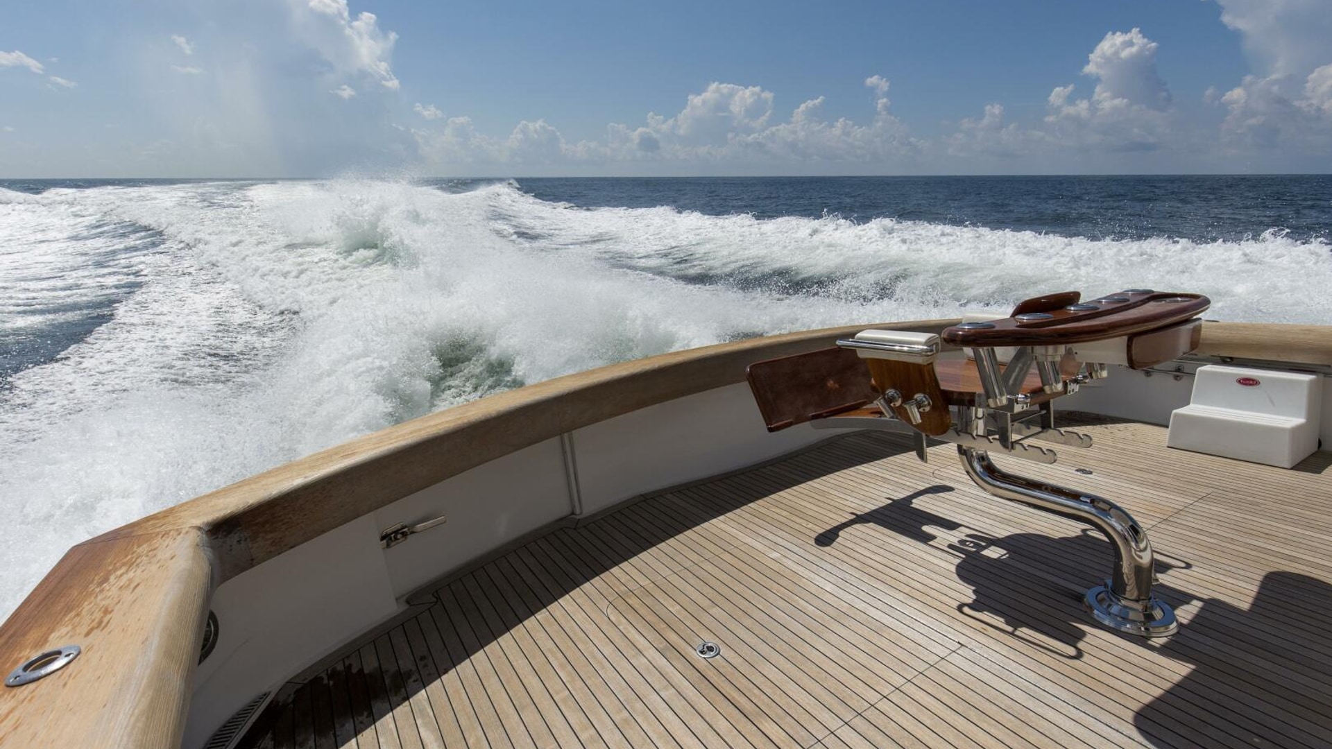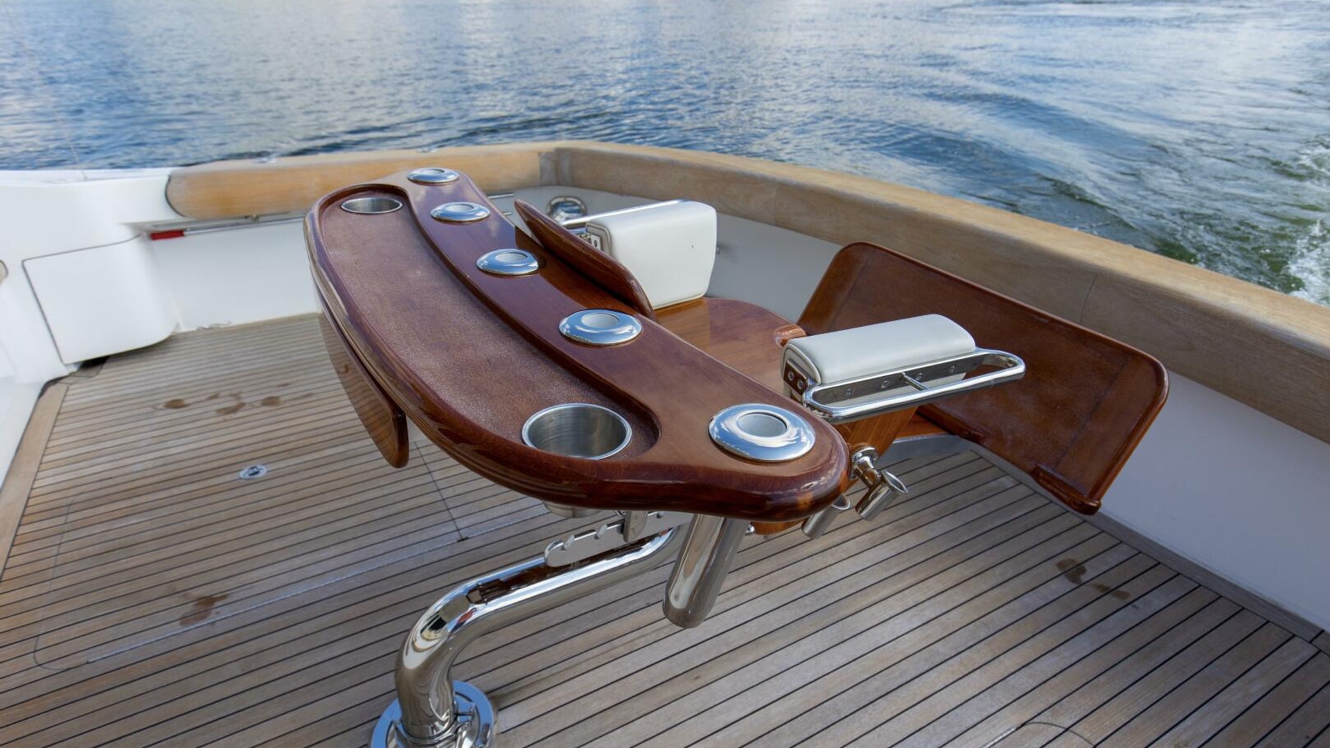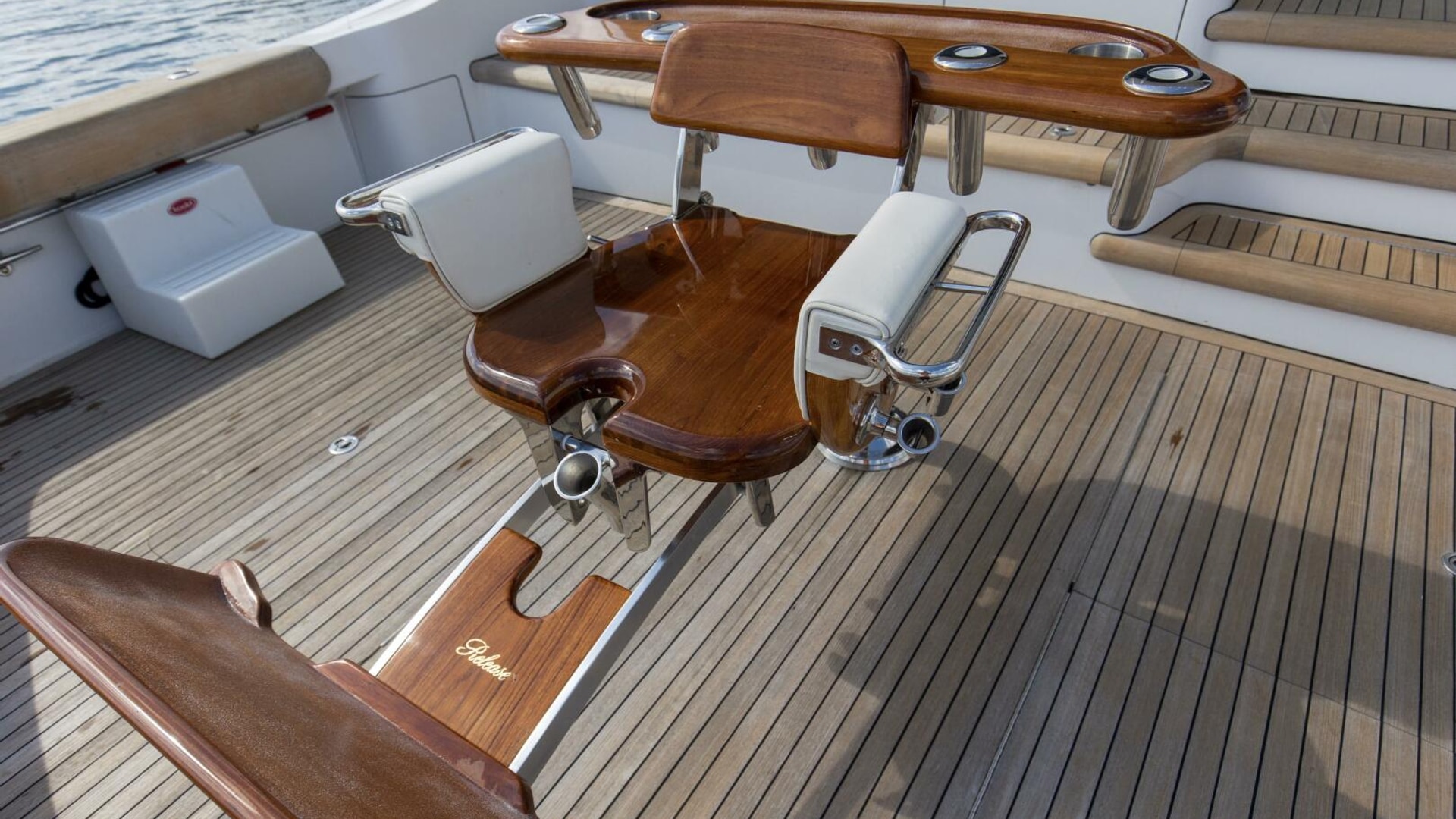 - Teak Release Marine Fighting Chair with offset pedestal and rocket launcher