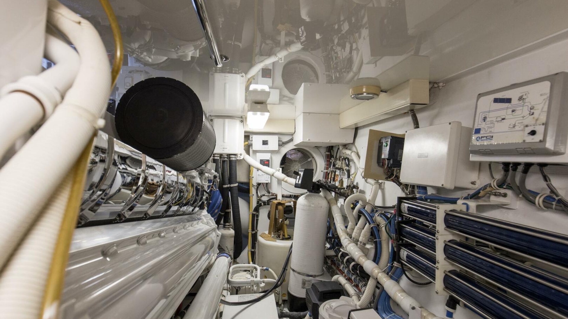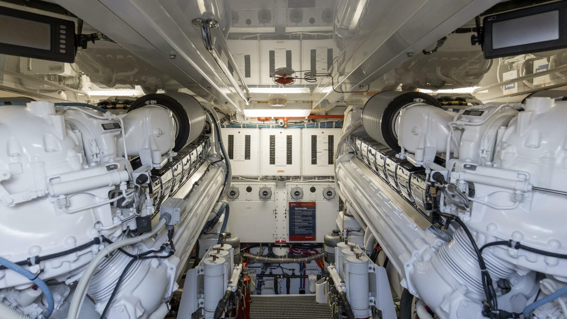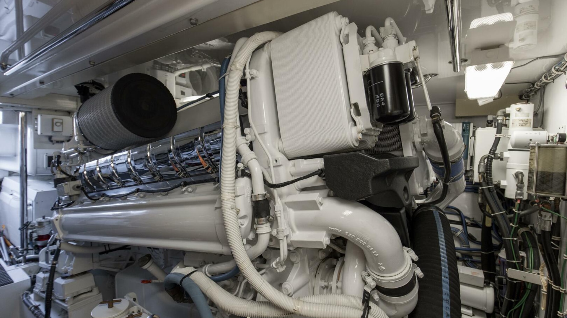 The engine room provides easy access to equipment and the bilges are painted with high gloss urethane paint for ease of cleaning. A forced air induction system draws cooling air for the engine room from underneath the cockpit gunwales, reducing saltwater intrusion into the engine room.