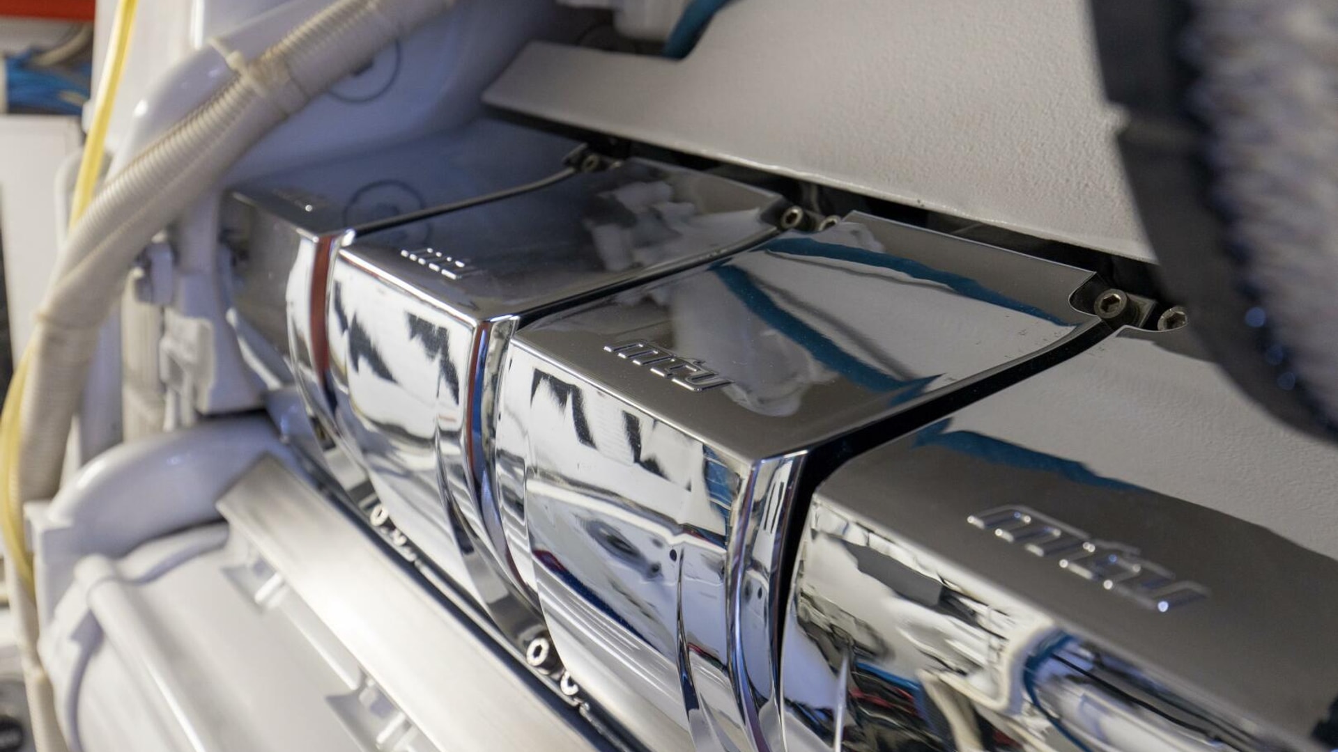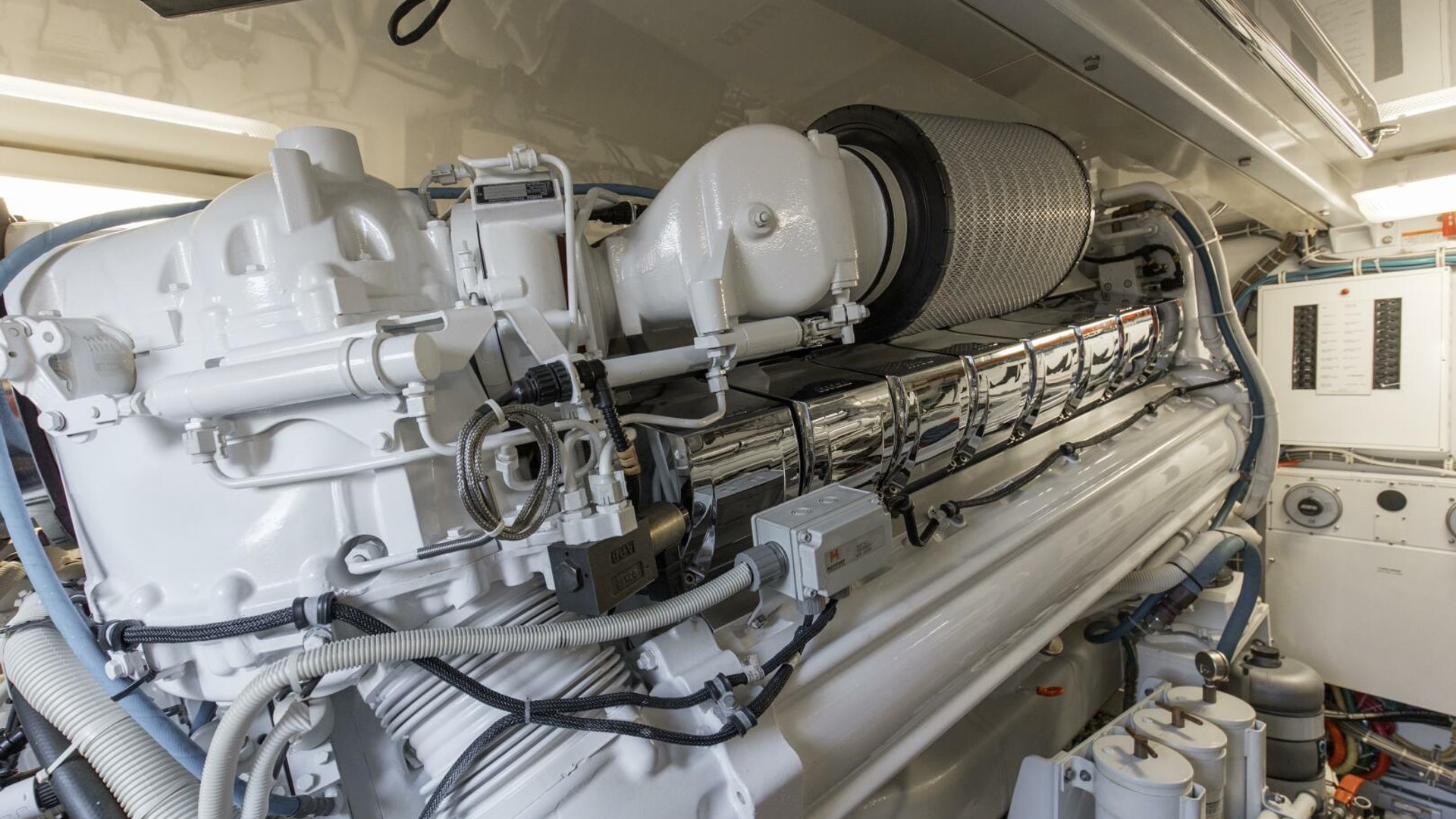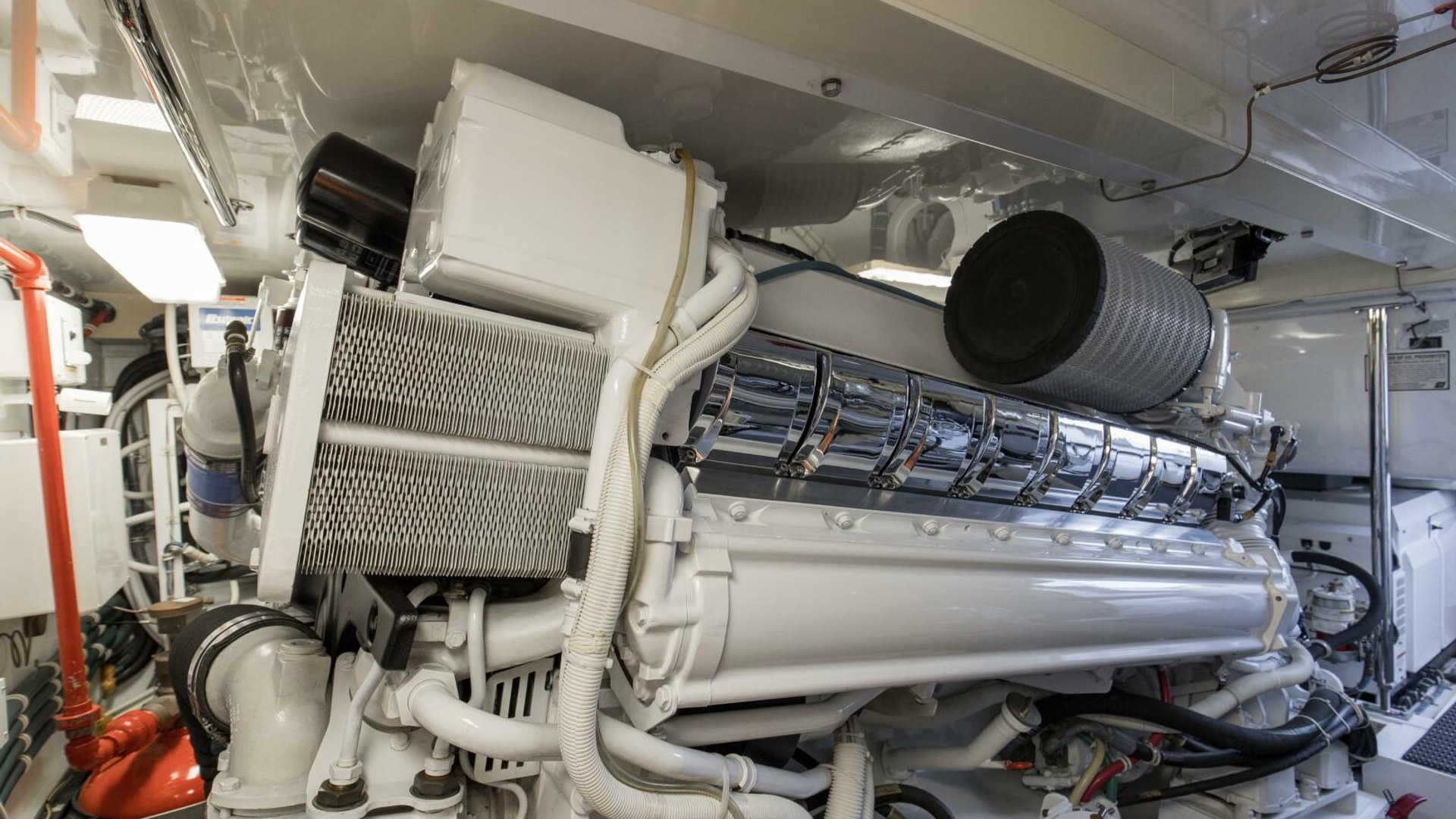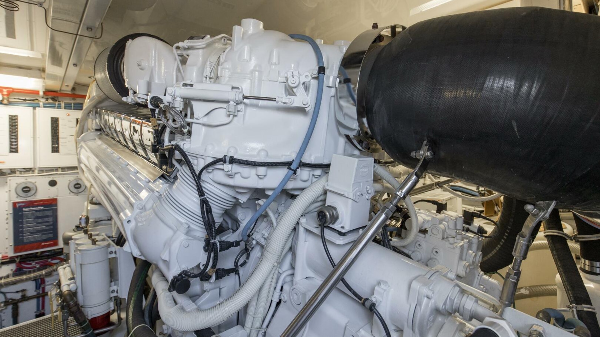The engine room provides easy access to equipment and the bilges are painted with high gloss urethane paint for ease of cleaning. A forced air induction system draws cooling air for the engine room from underneath the cockpit gunwales, reducing saltwater intrusion into the engine room.