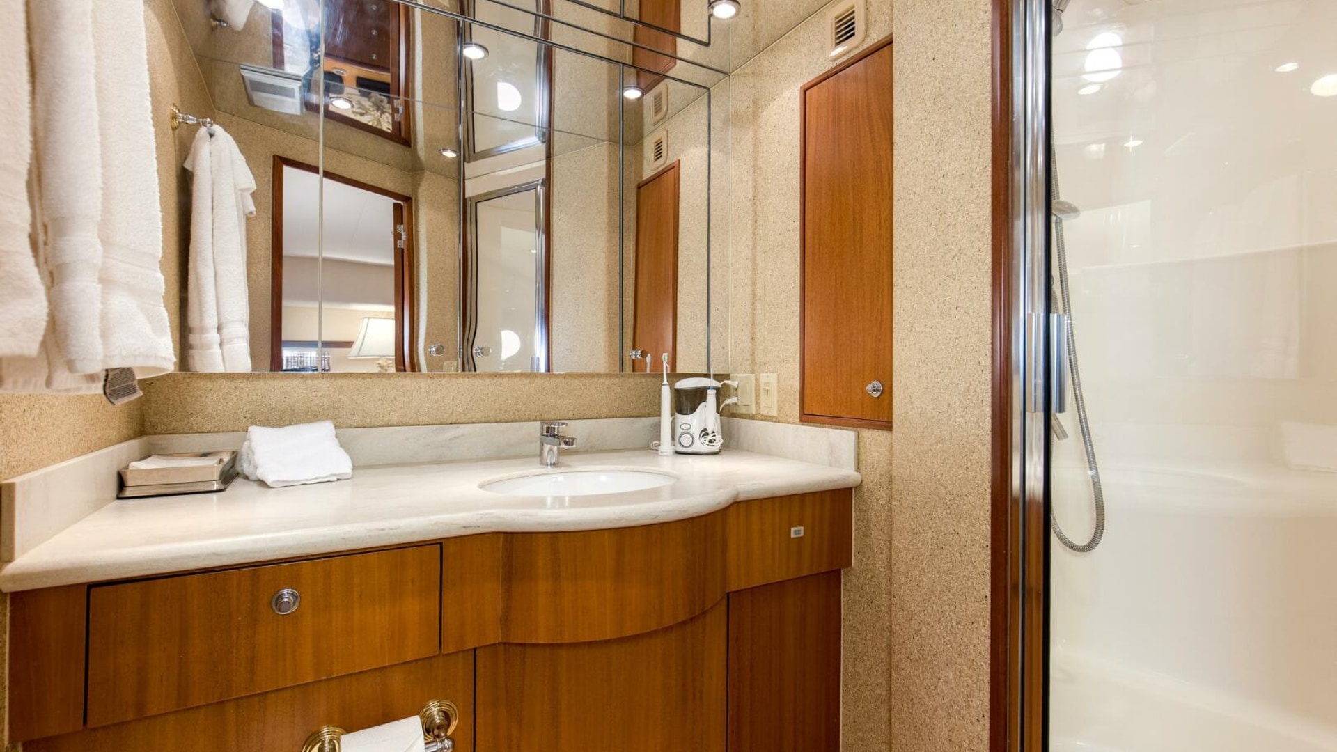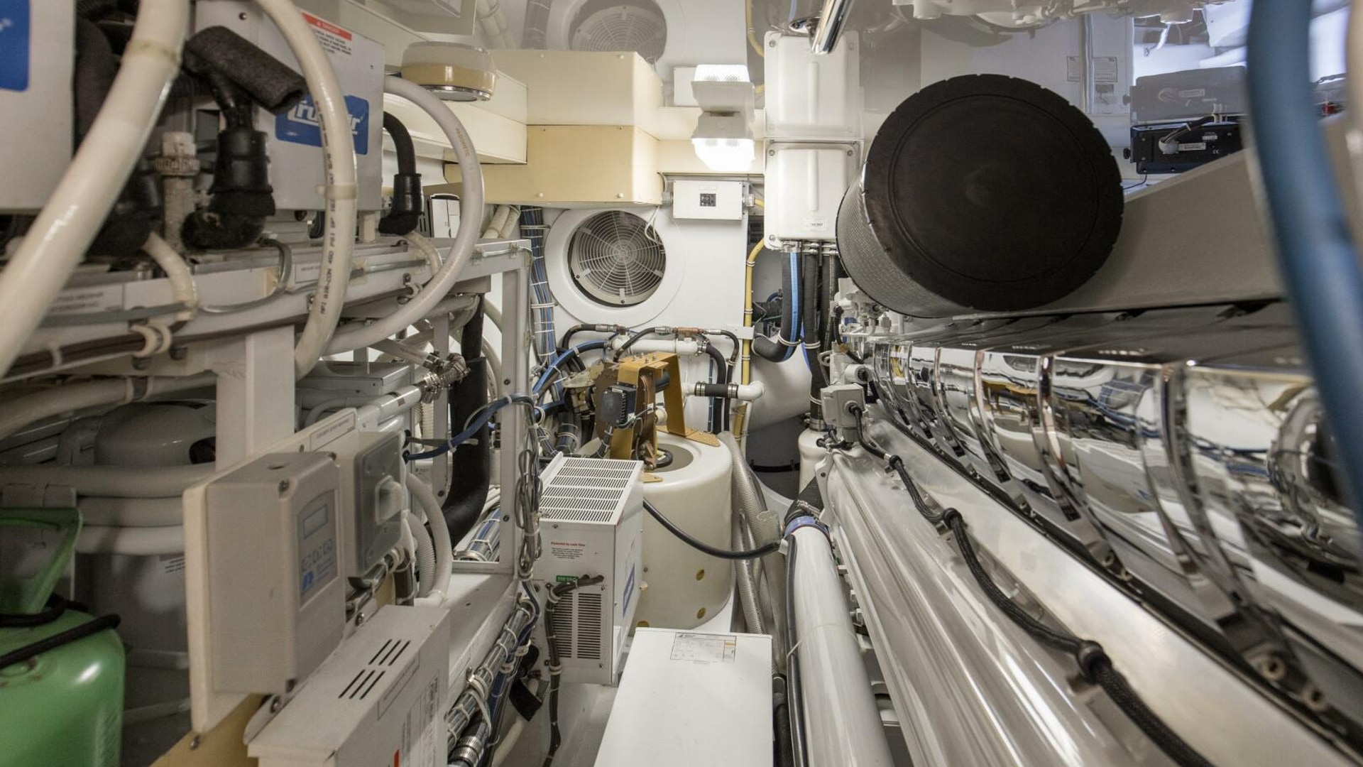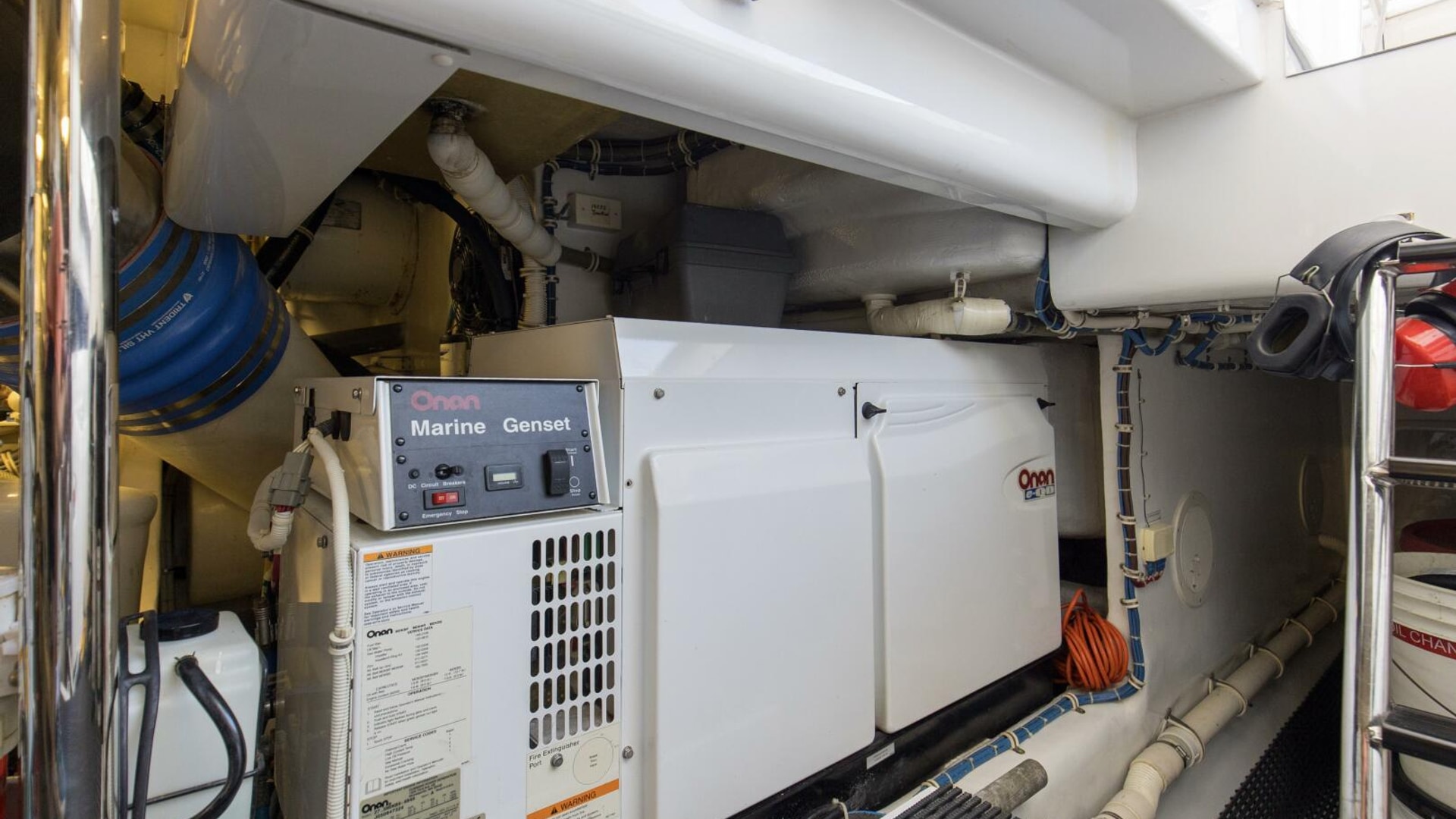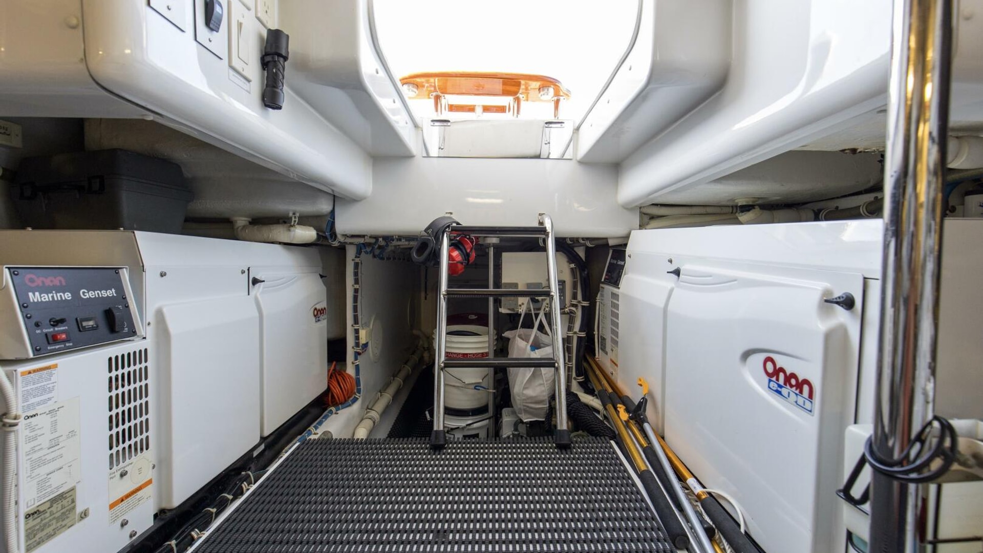 - Two 27.5kW freshwater-cooled Electronic Quiet Diesel Onan generators with shock mounts, seawater strainer, remote start, fuel/water separator, hour meter, water lift muffler and sound enclosure