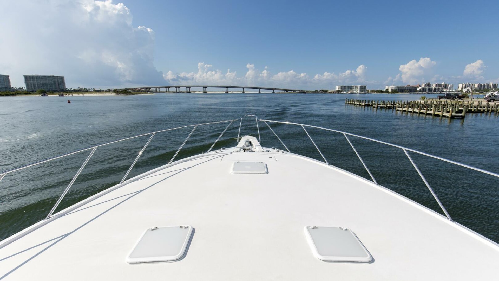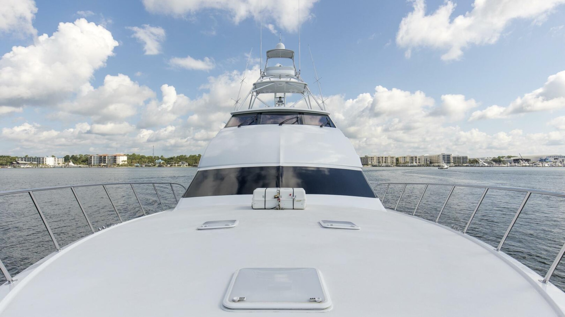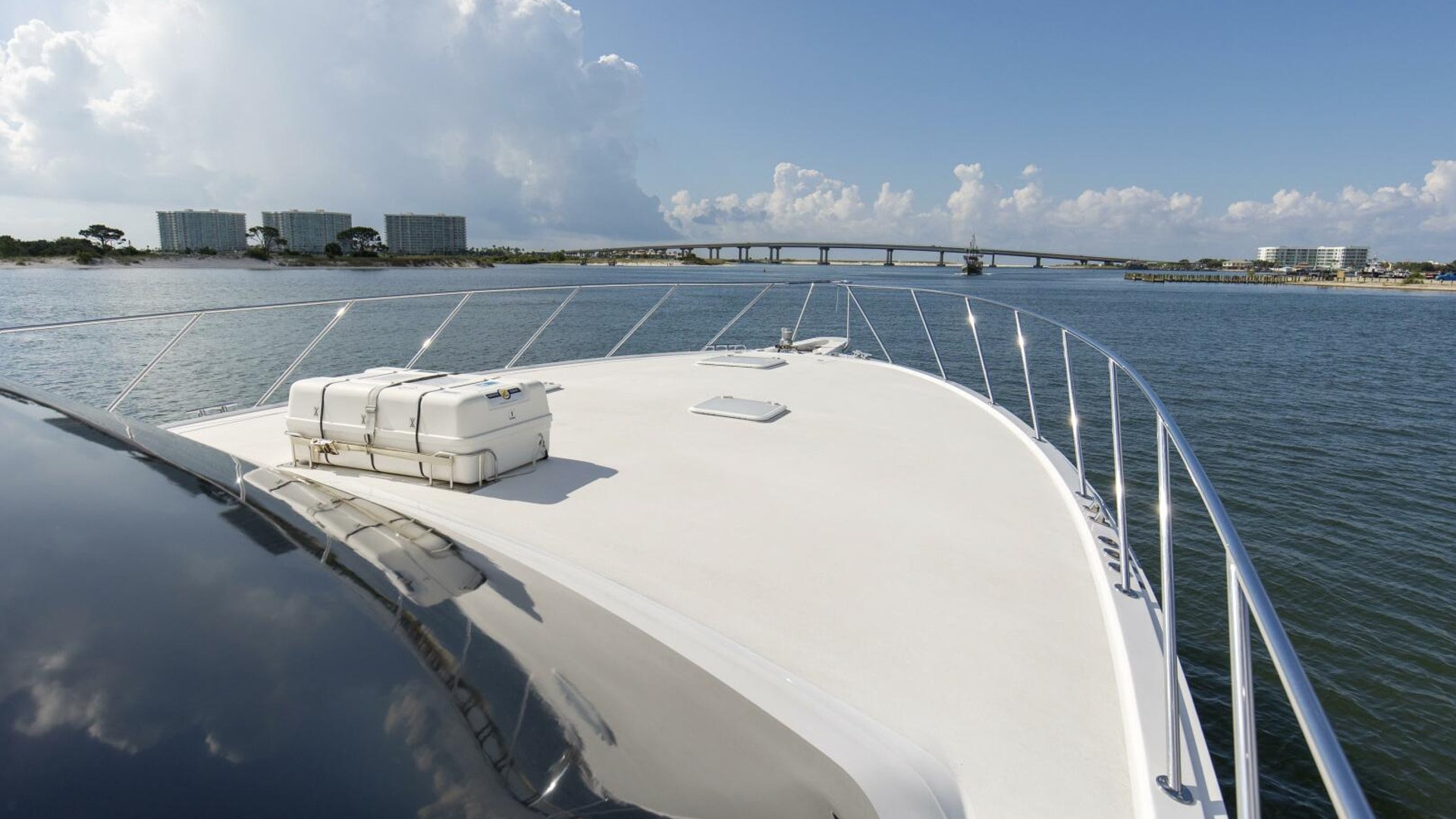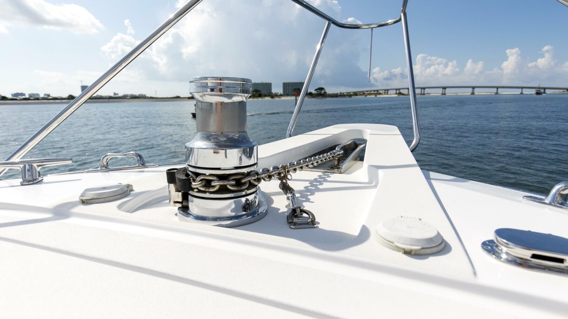 - Polished stainless-steel bow cleats and chocks with chafing strips, drilled and tapped in aluminum backing plate