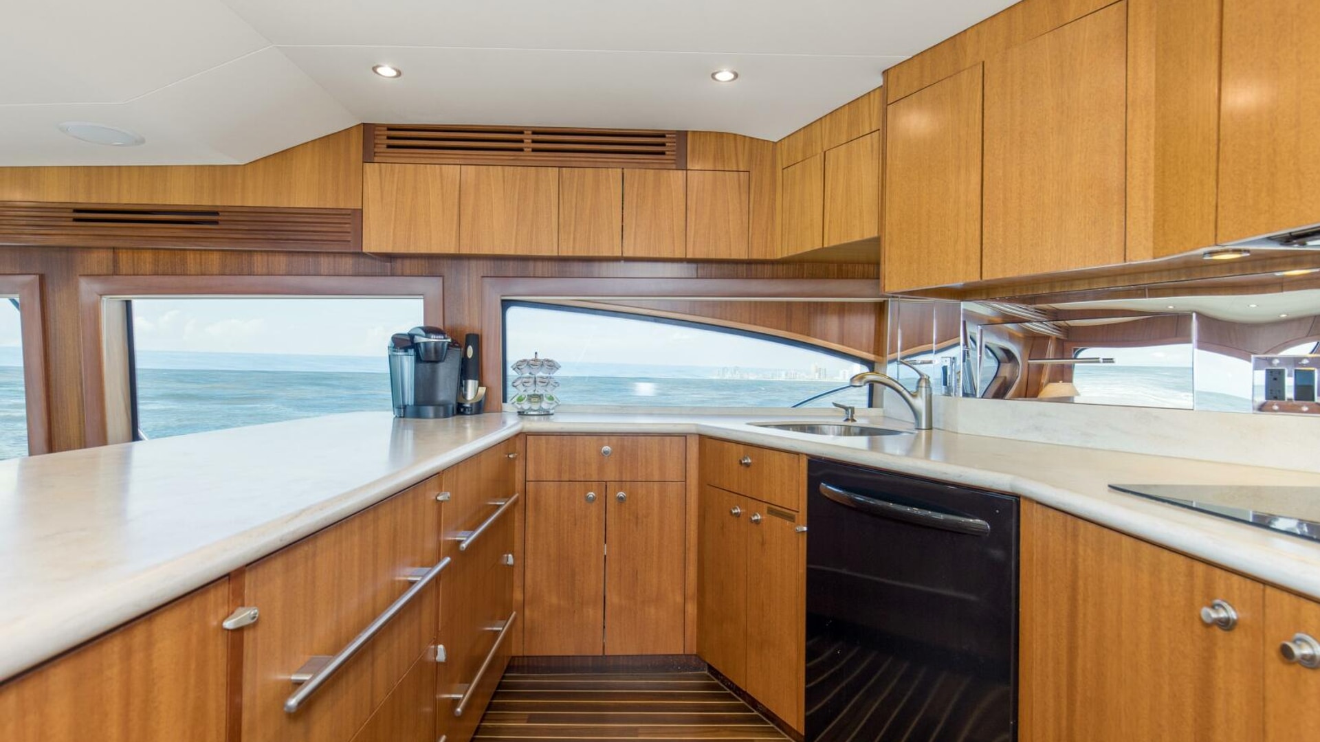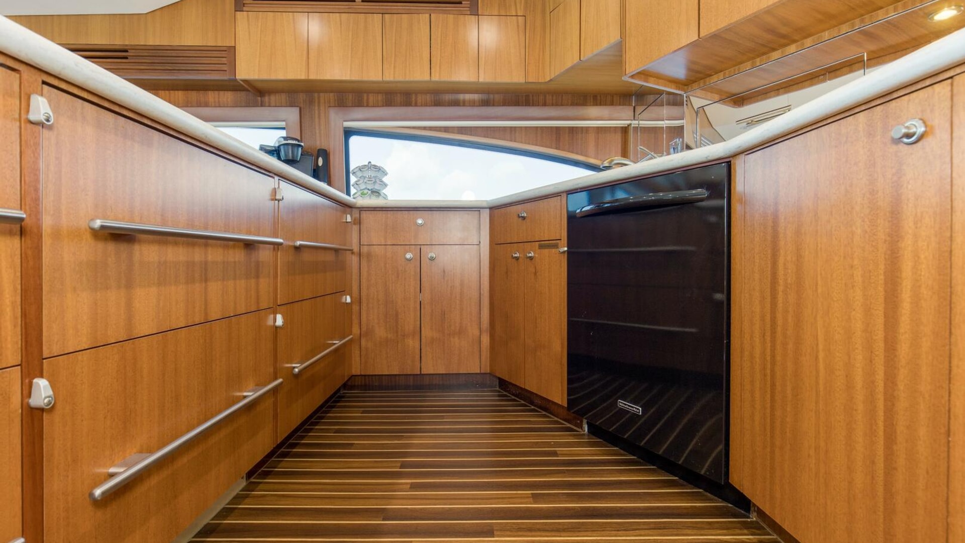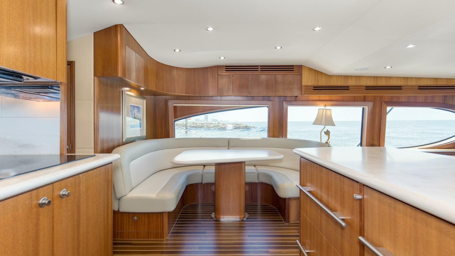 One step up from the galley you'll find several deep storage drawers and a surplus pantry just forward of both the dinette and galley. There are four under counter sub-zero refrigerator drawers and one freezer unit located in starboard brow attic, Corian galley counter tops and backsplashes, microwave convection oven, four burner ceramic cooktop and to starboard a large u-shaped dinette, all highlighted with Satan flat panel African Mahogany cabinetry.