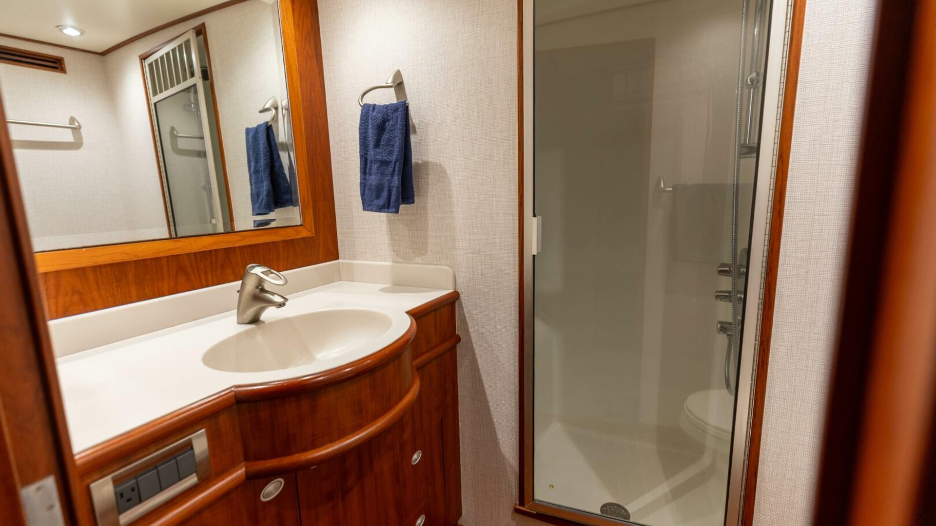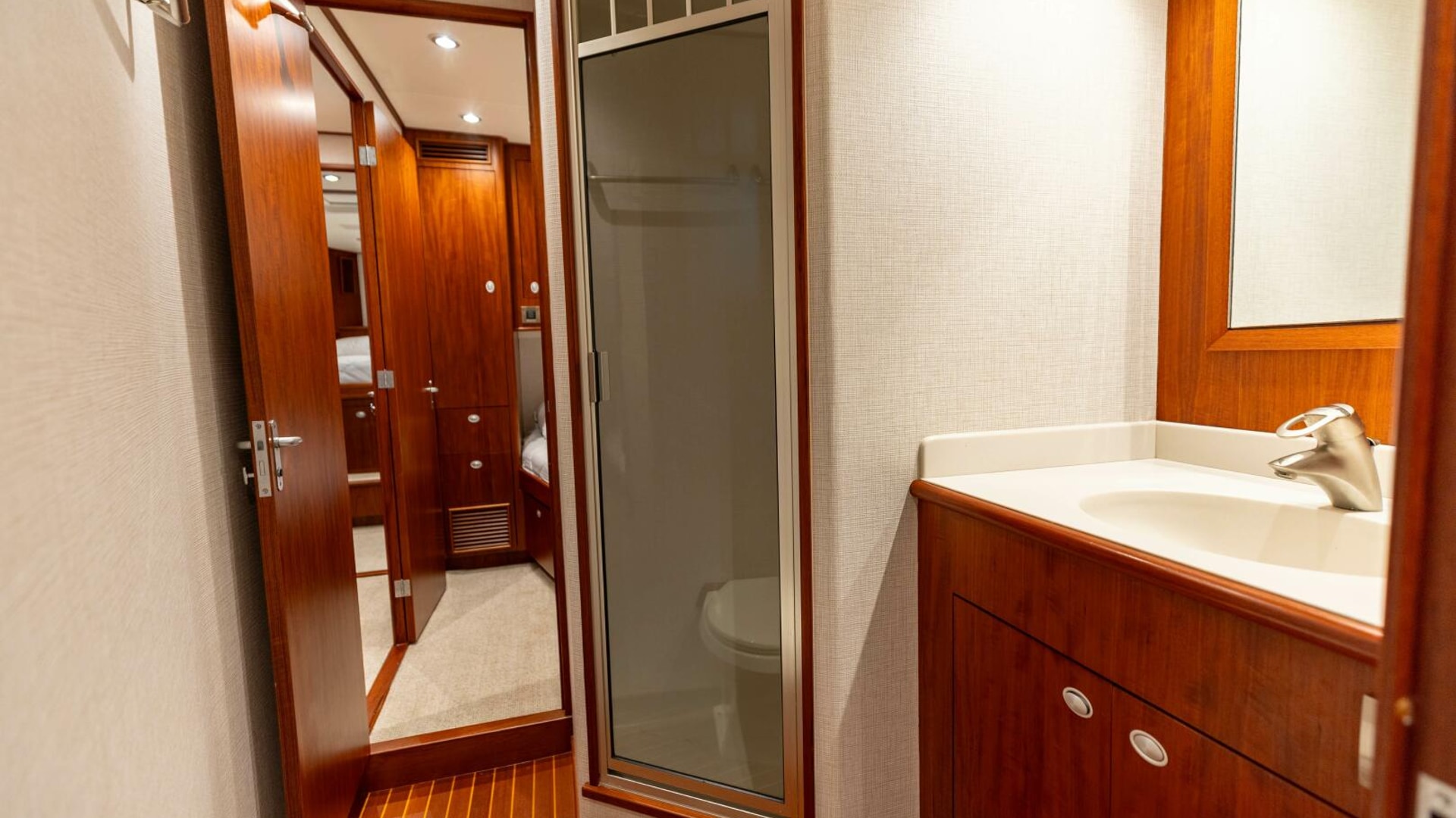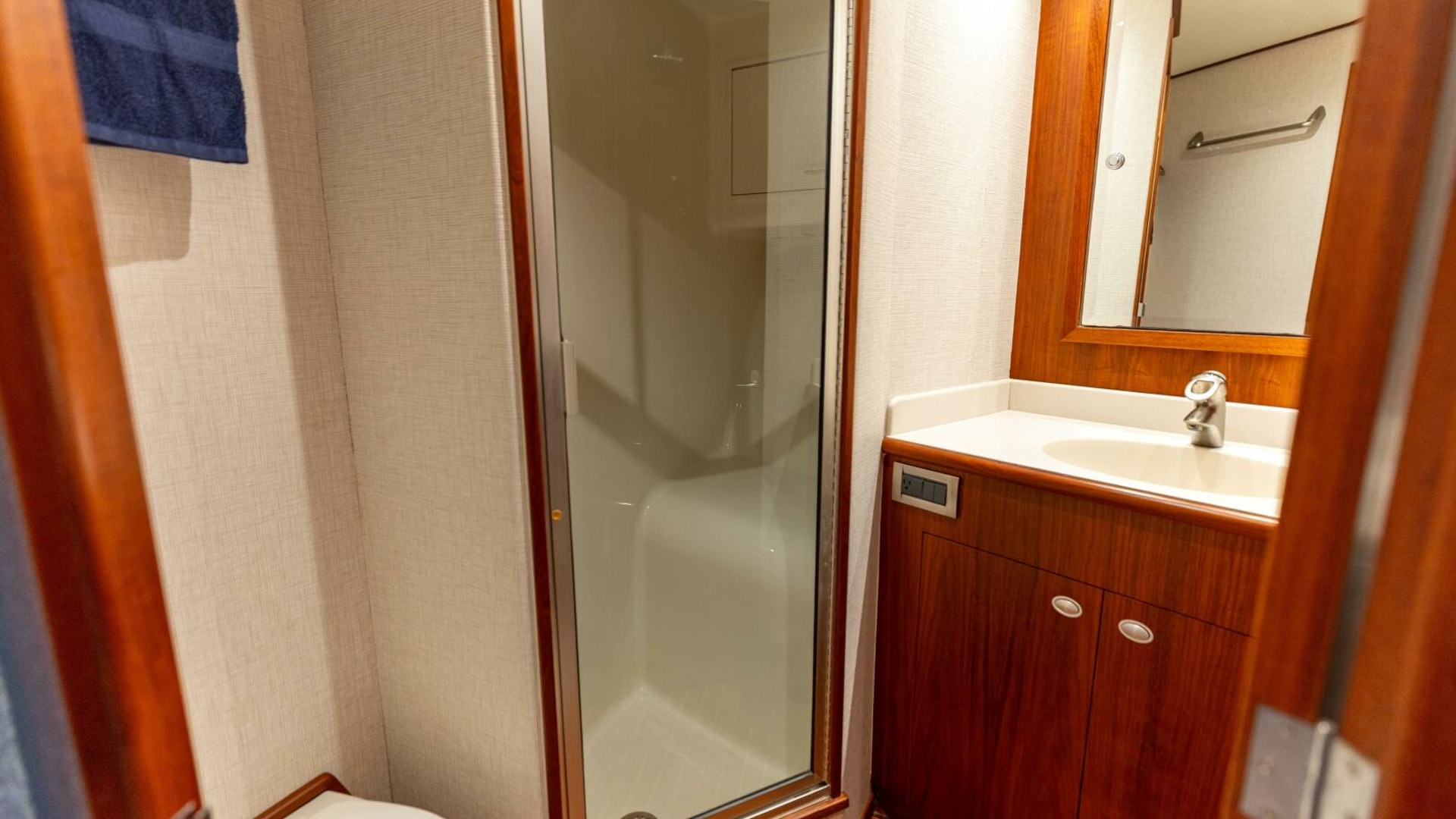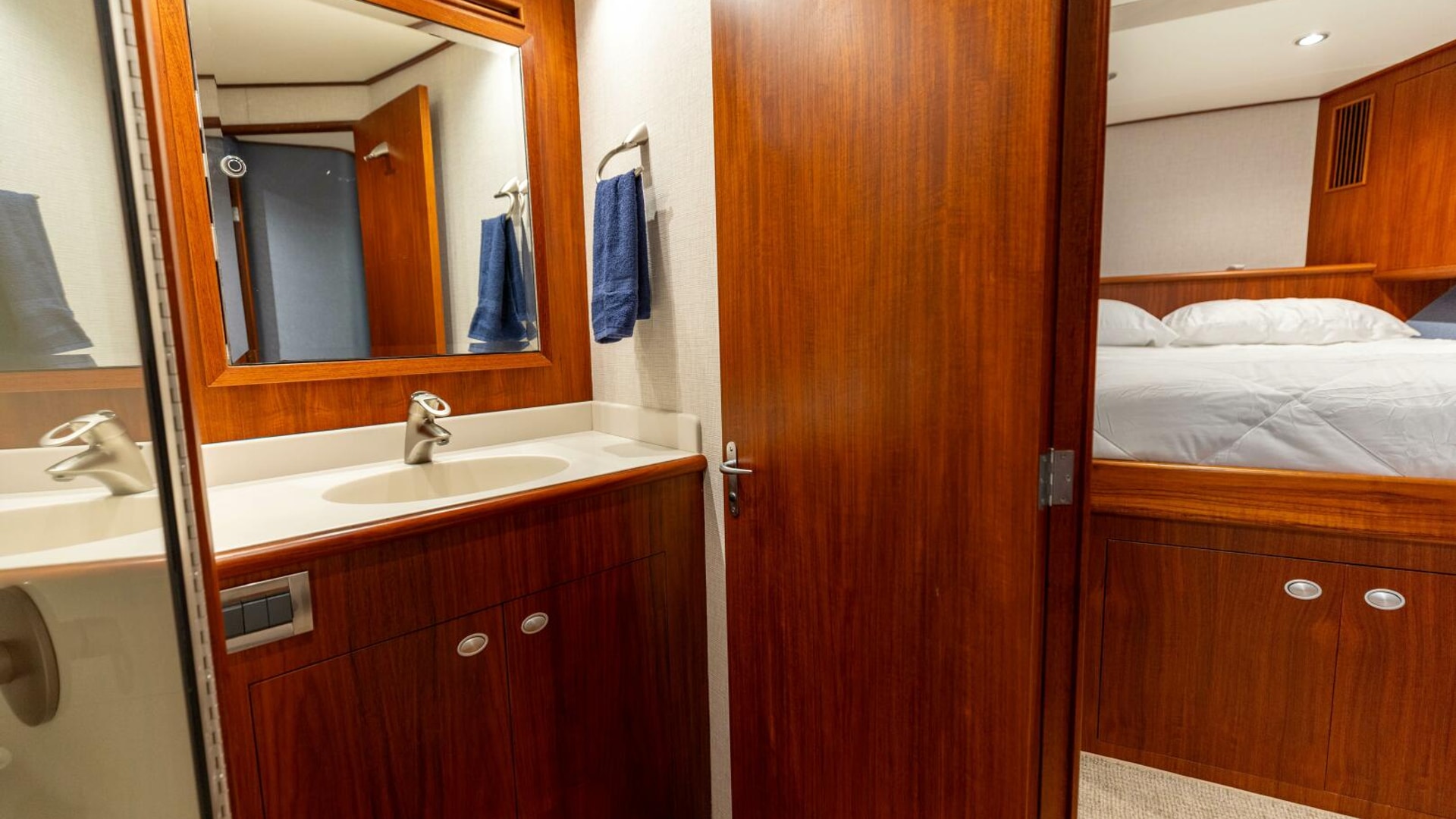 This Stateroom is a mirror image of the Aft Guest Stateroom. This head is a Jack & Jill style head, which shares the Aft and Forward Bunk rooms. This full head & shower area is quite large, offering a great shower and ample storage for guests.