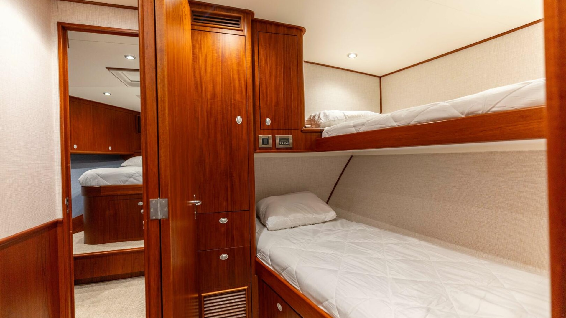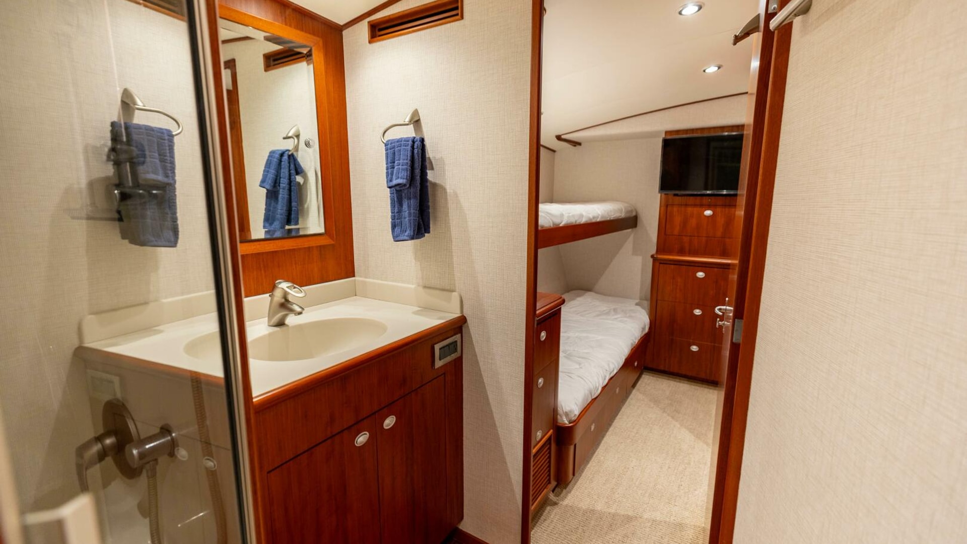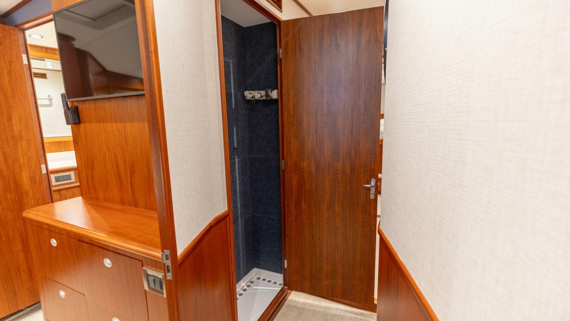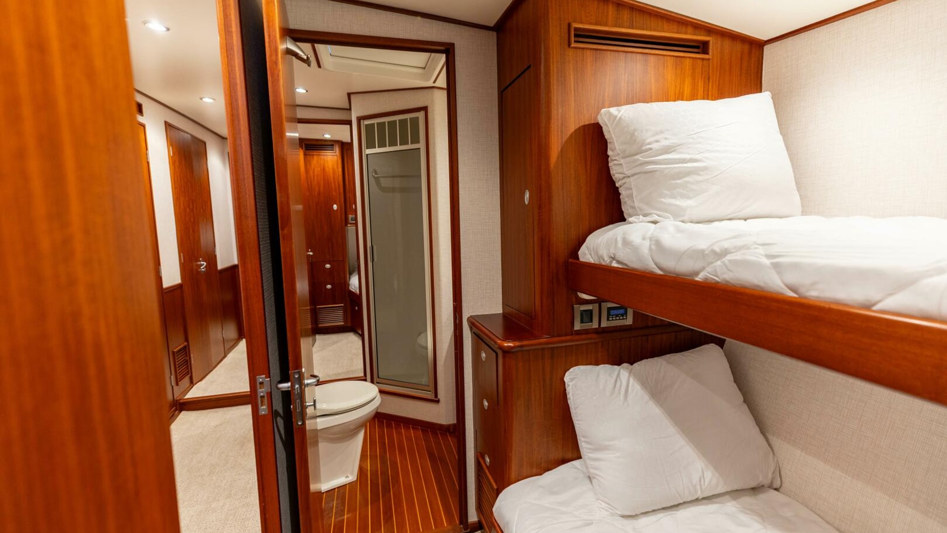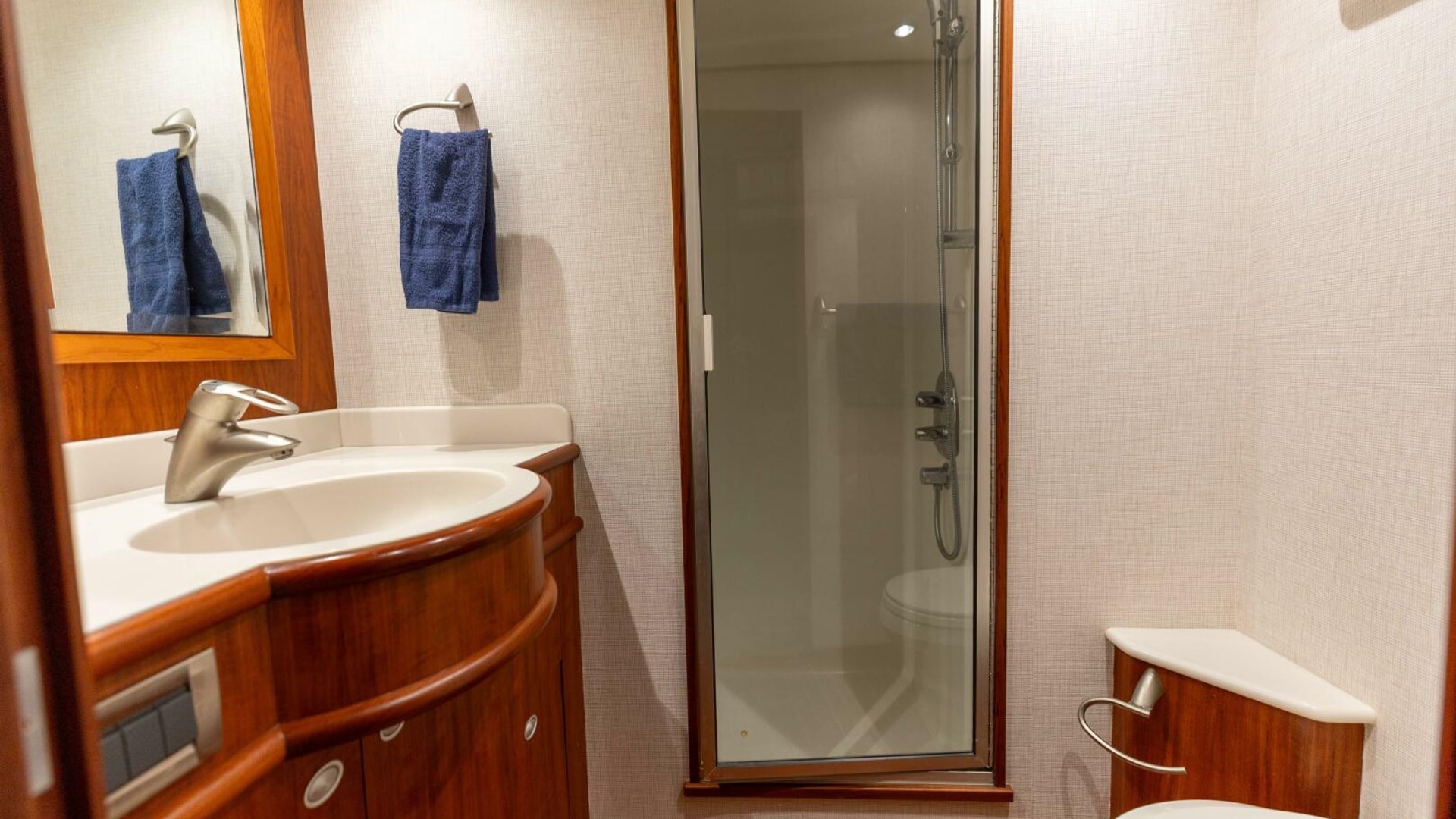 This Stateroom is a mirror image of the Aft Guest Stateroom. This head is a Jack & Jill style head, which shares the Aft and Forward Bunk rooms. This full head & shower area is quite large, offering a great shower and ample storage for guests.
