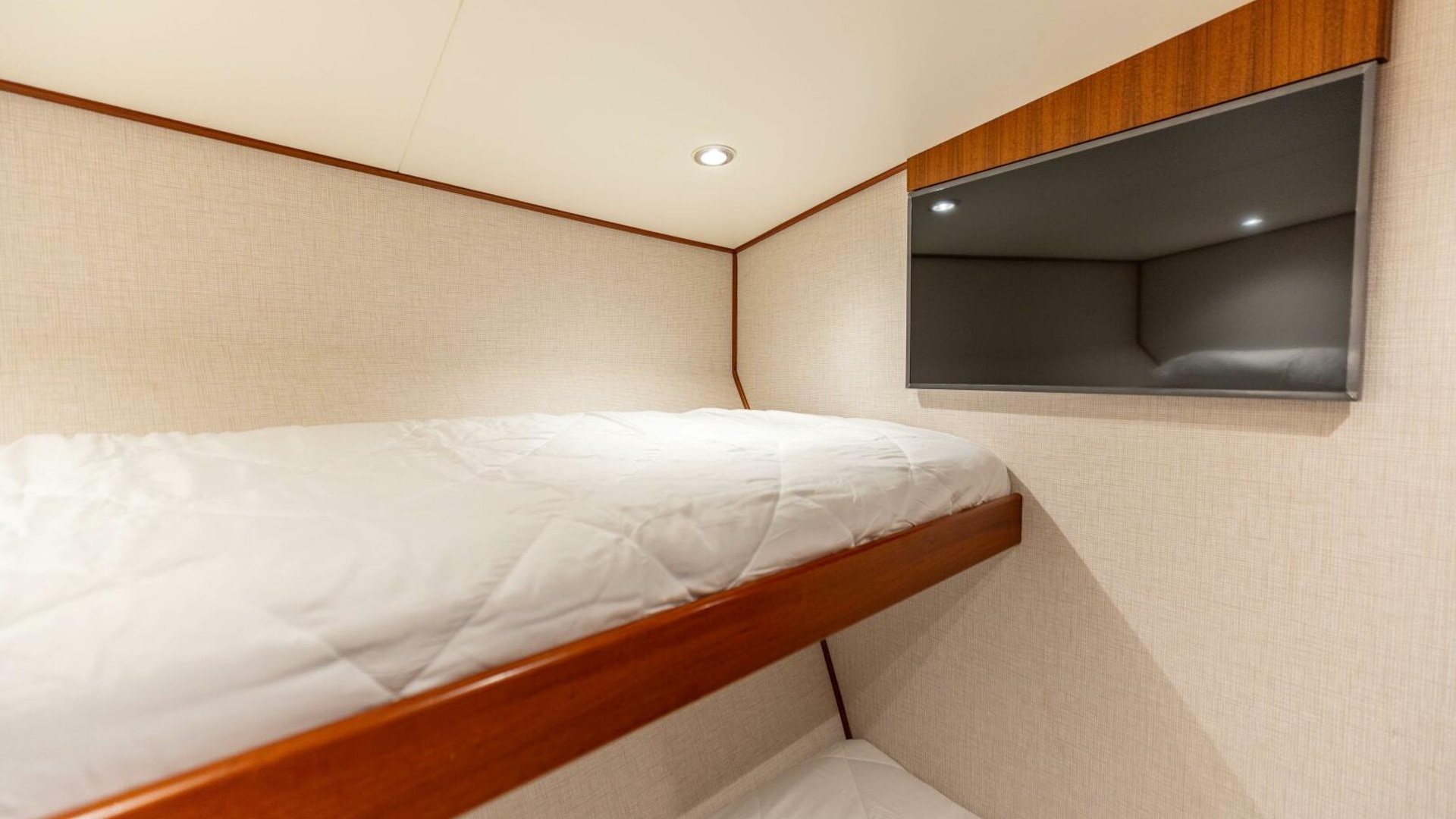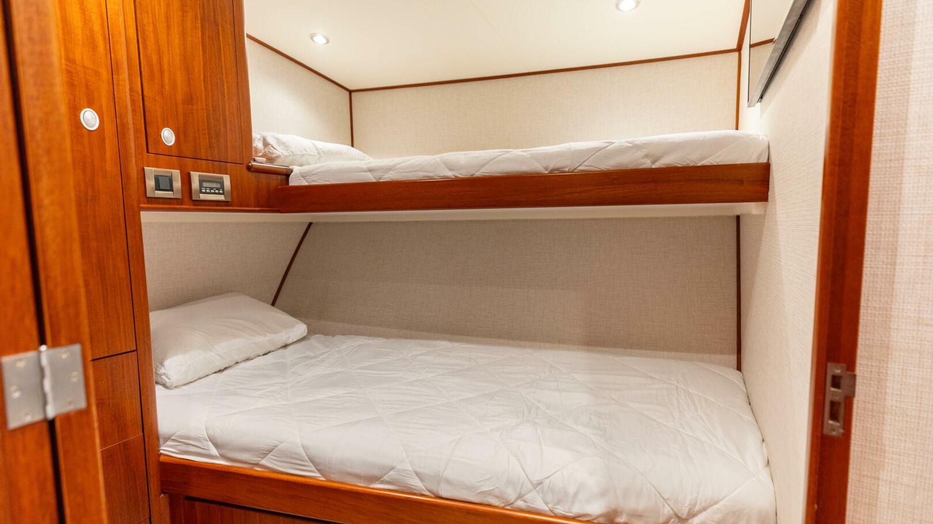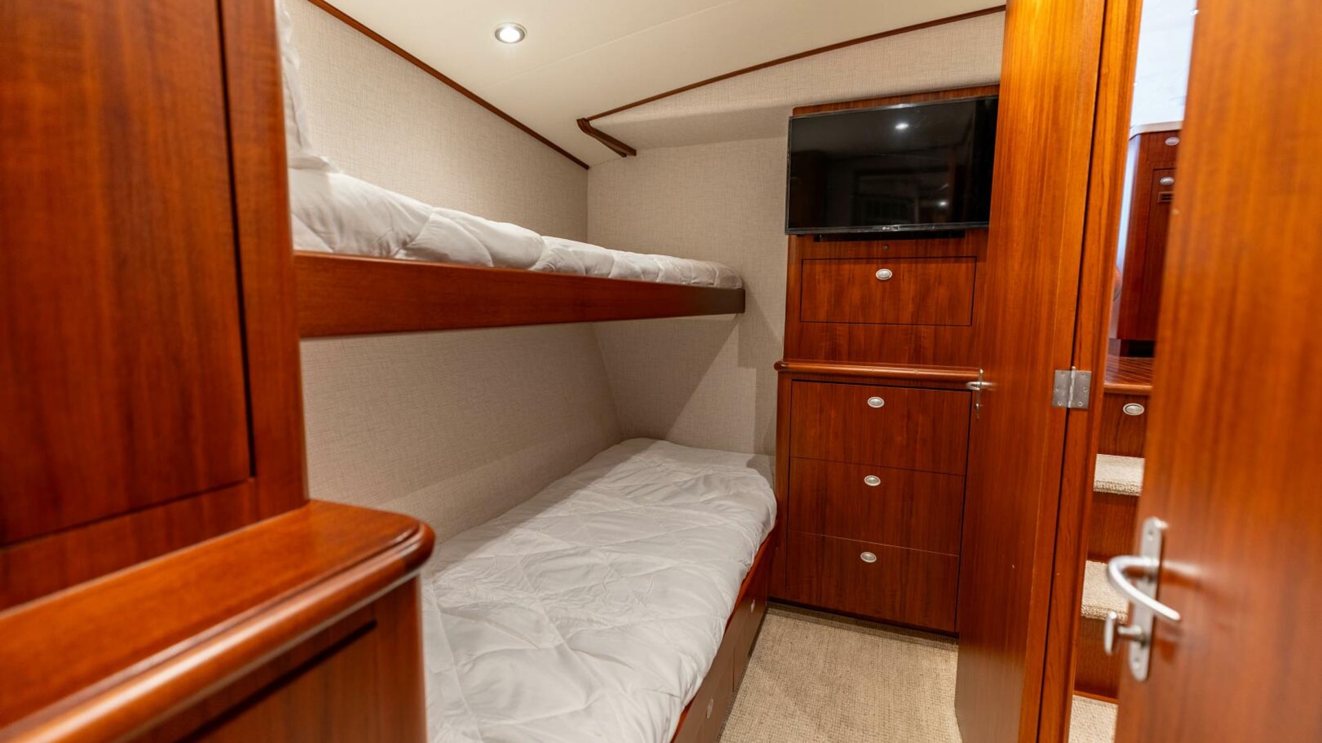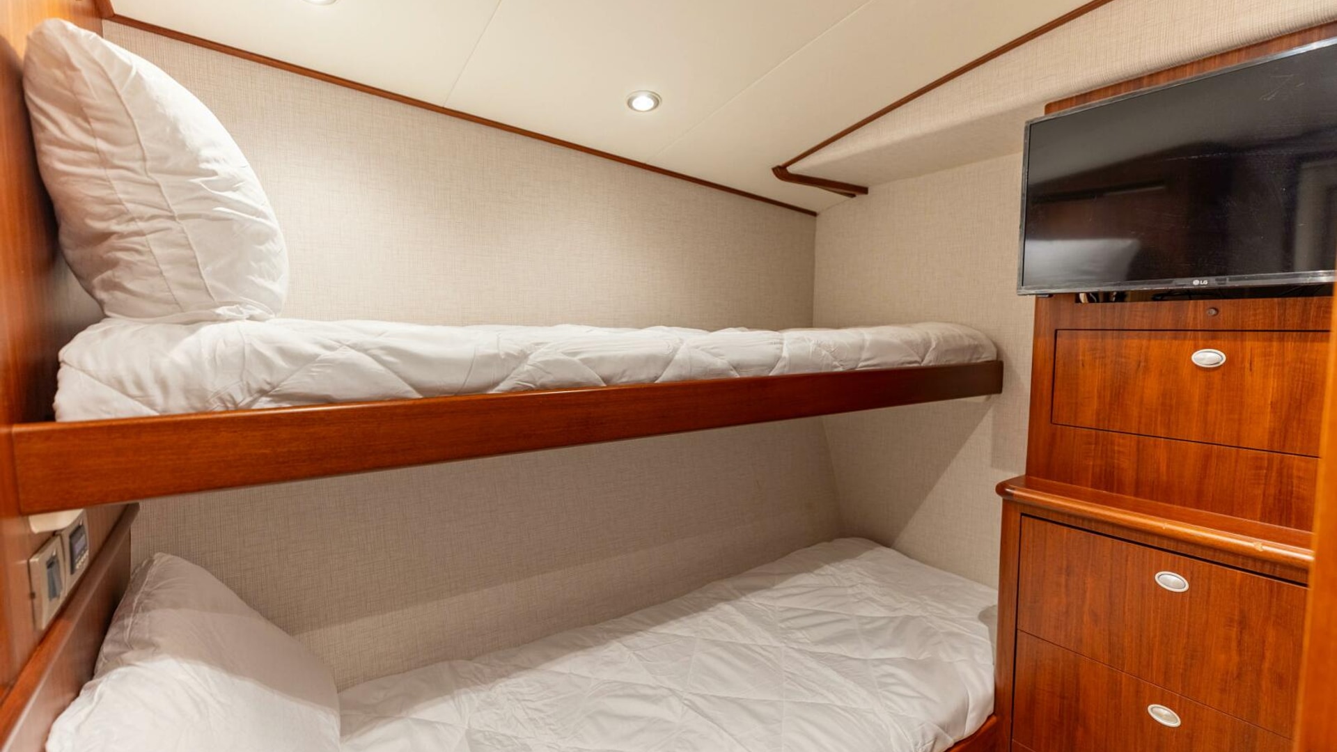 This Stateroom is a mirror image of the Aft Guest Stateroom. This head is a Jack & Jill style head, which shares the Aft and Forward Bunk rooms. This full head & shower area is quite large, offering a great shower and ample storage for guests.