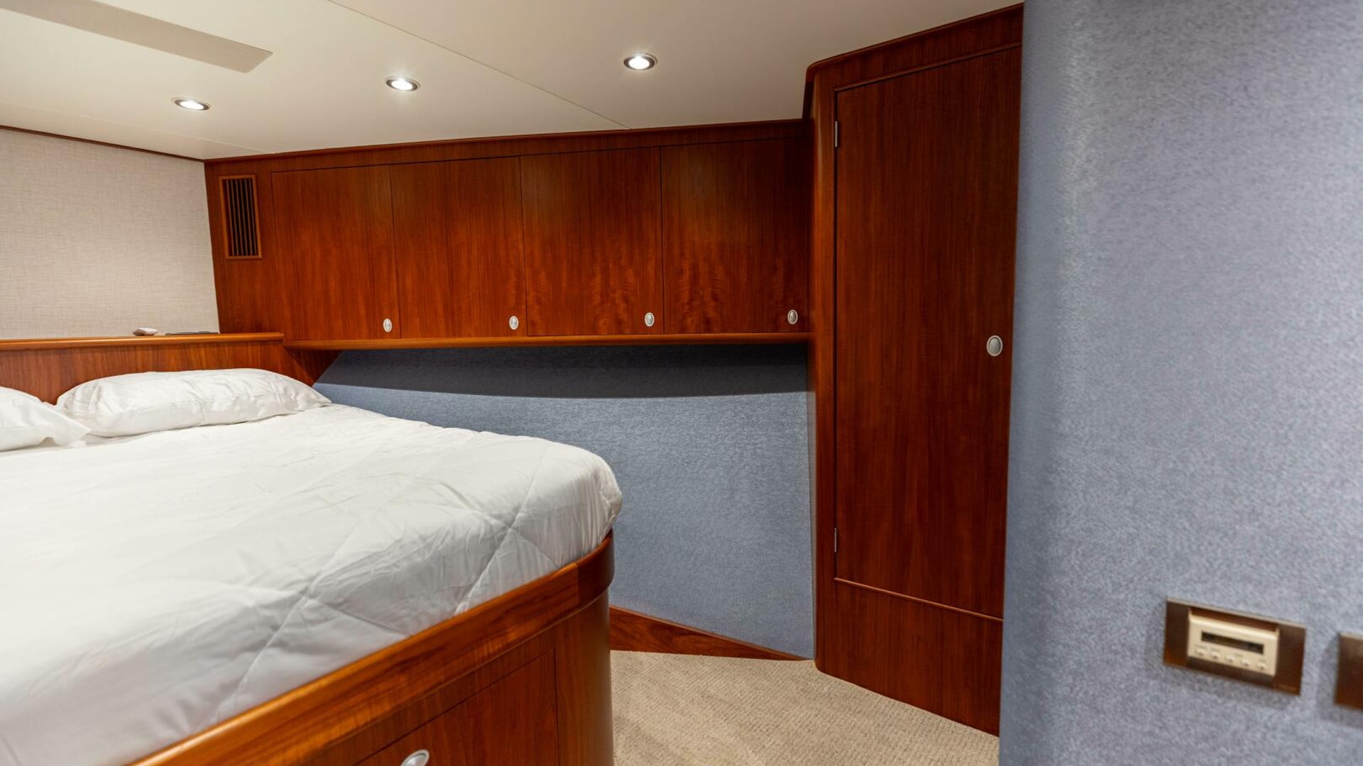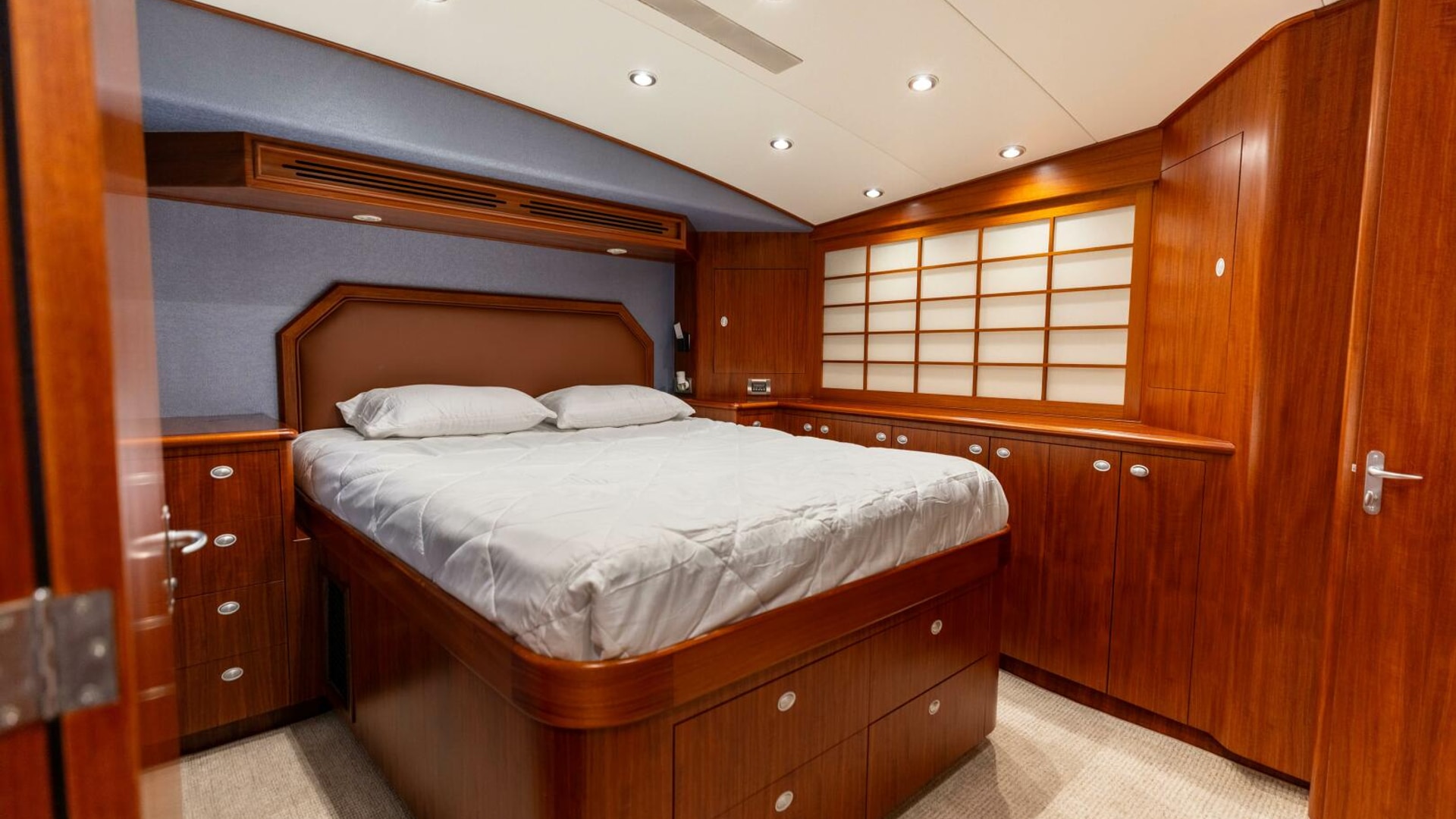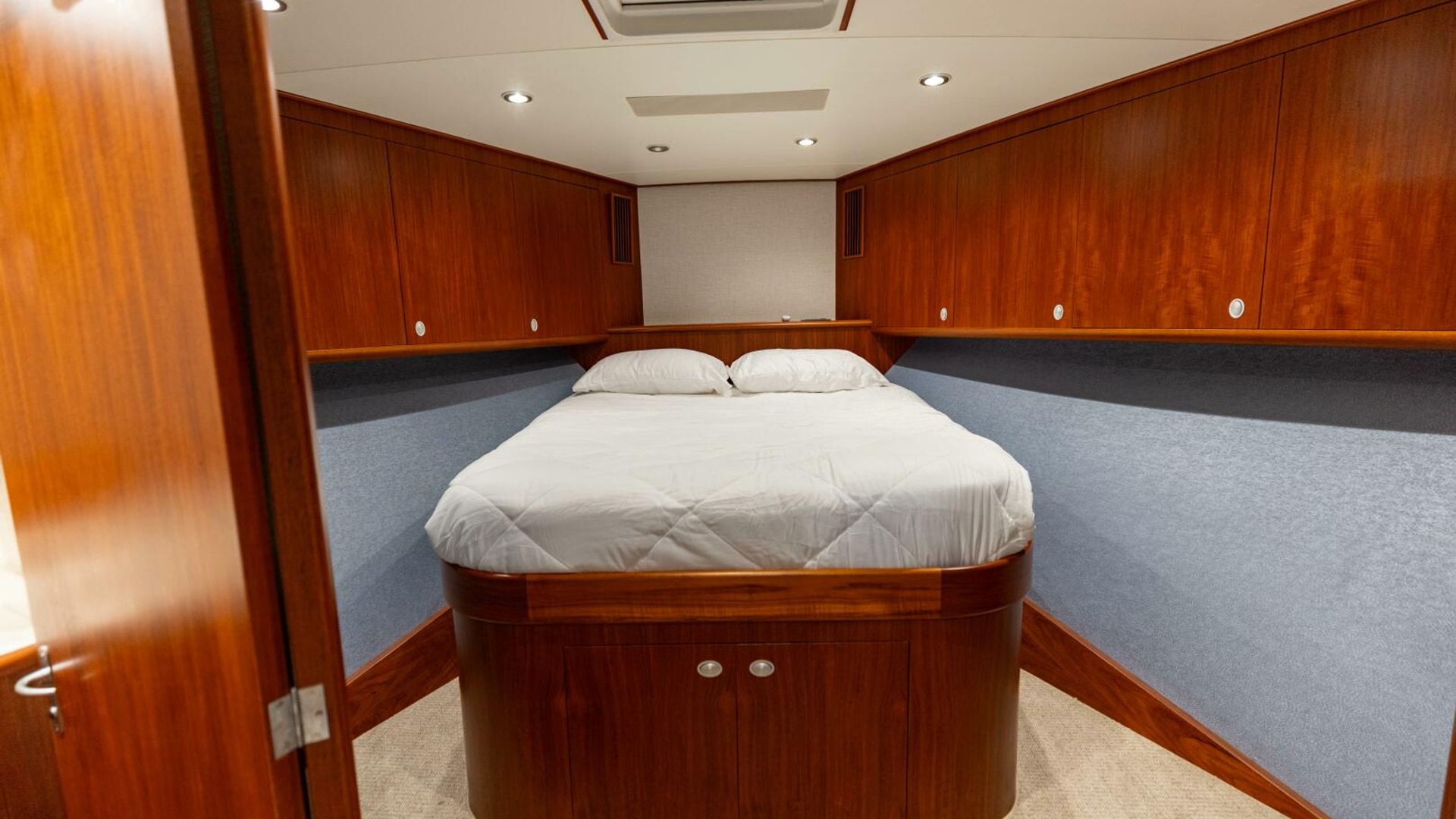 Features a full walk-around custom Queen with storage below. It generously offers fantastic storage and beautiful Cherry woodwork throughout. Very nice setting! The VIP full Head & Shower is also quite nice, a large shower with a custom seat and great storage counter space.