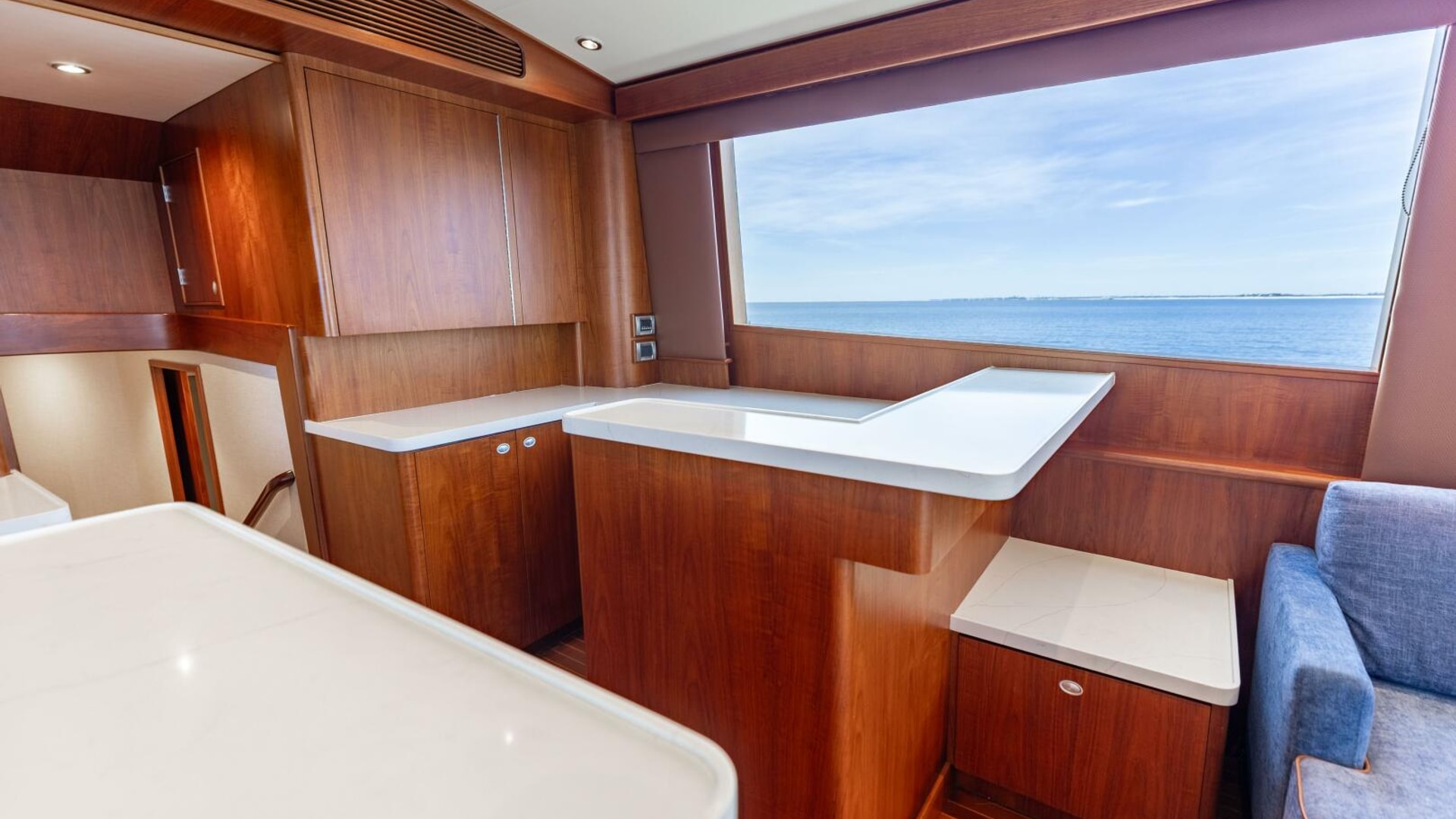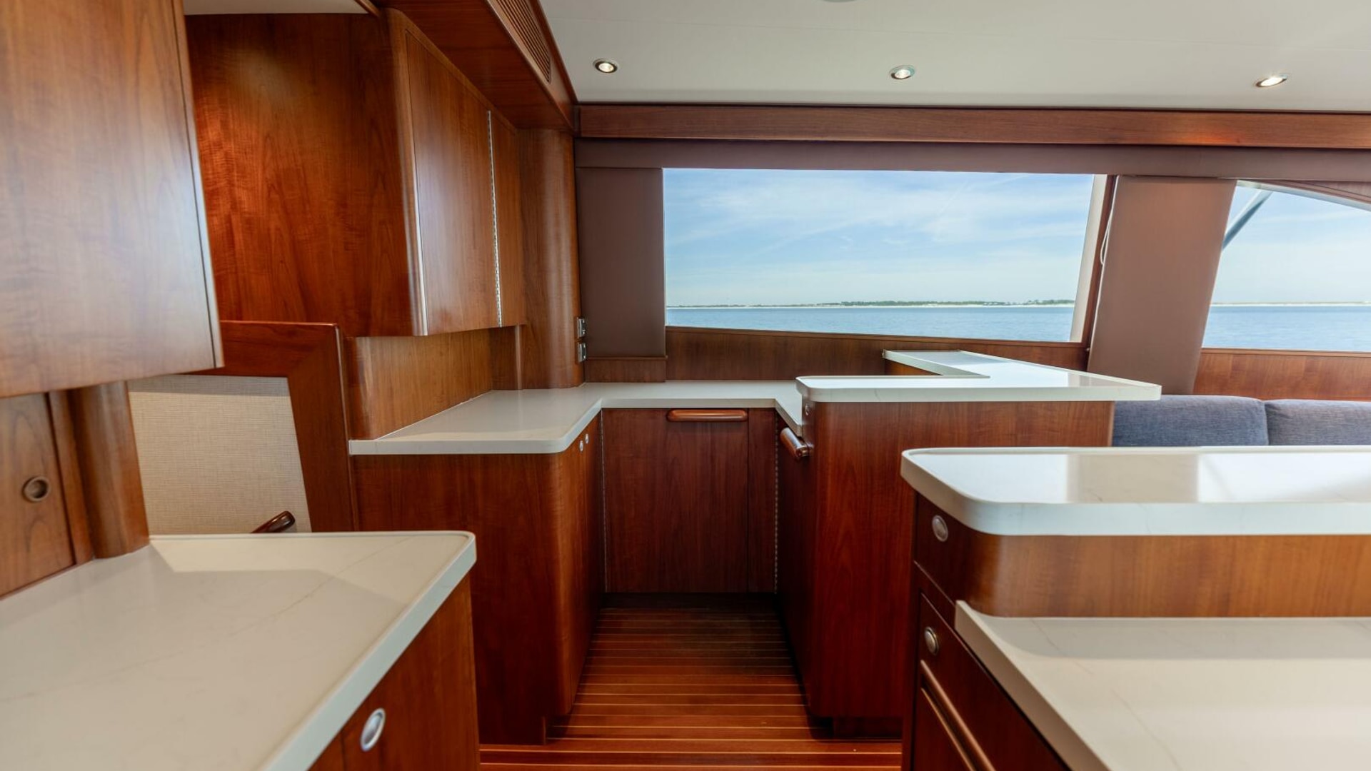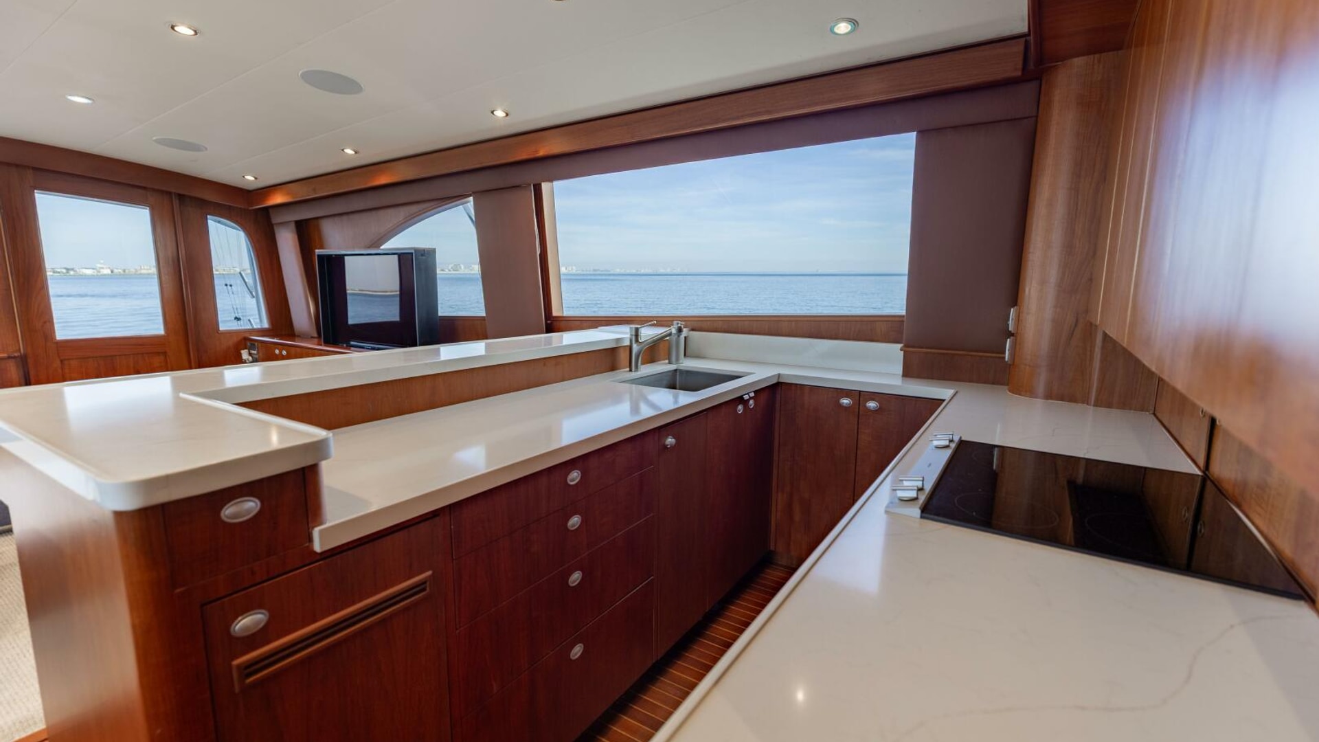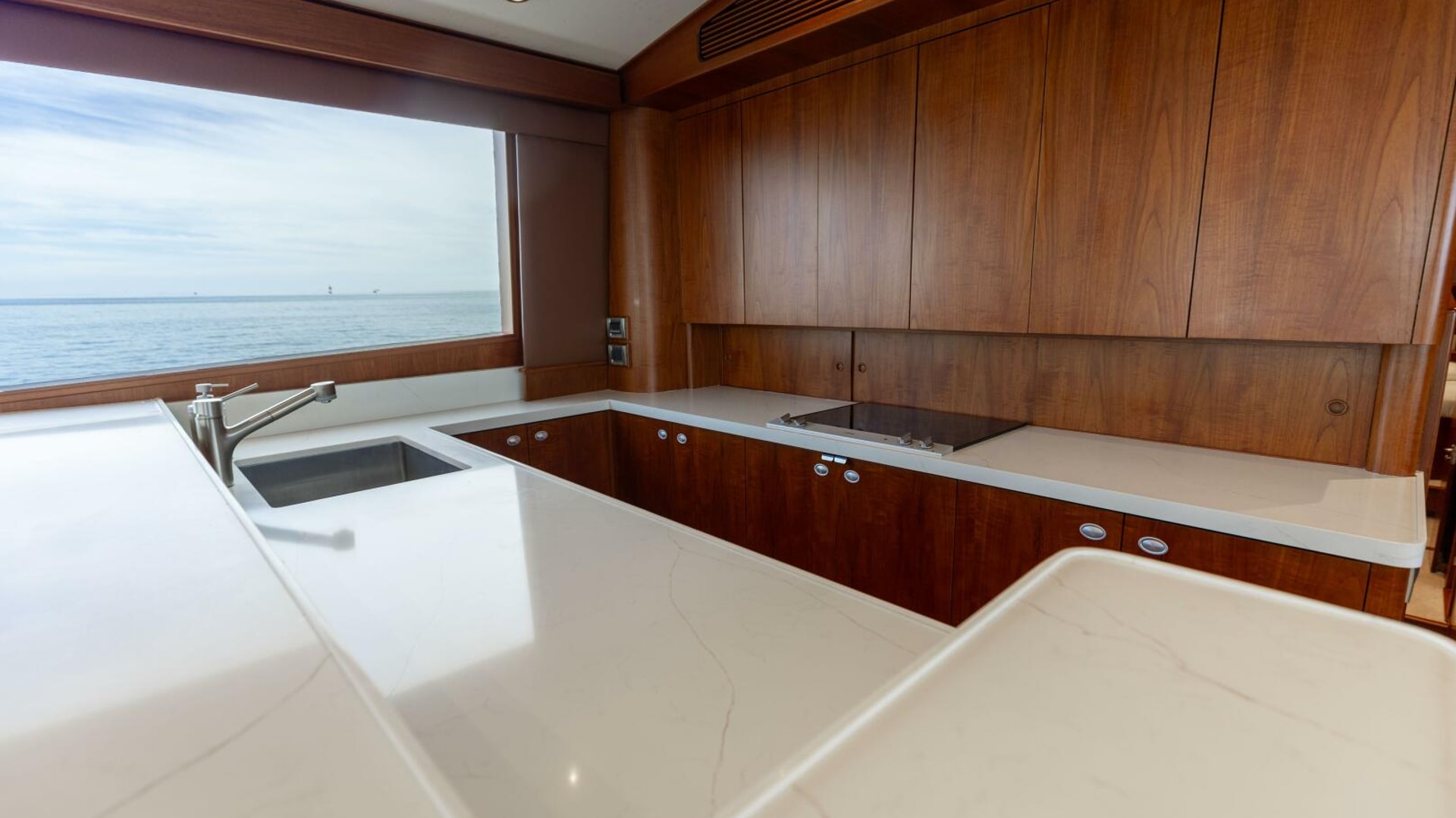 Super nice Galley, with lots of usable counter space for dining. Great appliances are also a feature, along with ample storage. A tremendous custom refrigeration space is also offered for extended travel. The Galley features beautiful custom countertops, top-of-the-line appliances, excellent storage, and custom-built-in refrigeration.