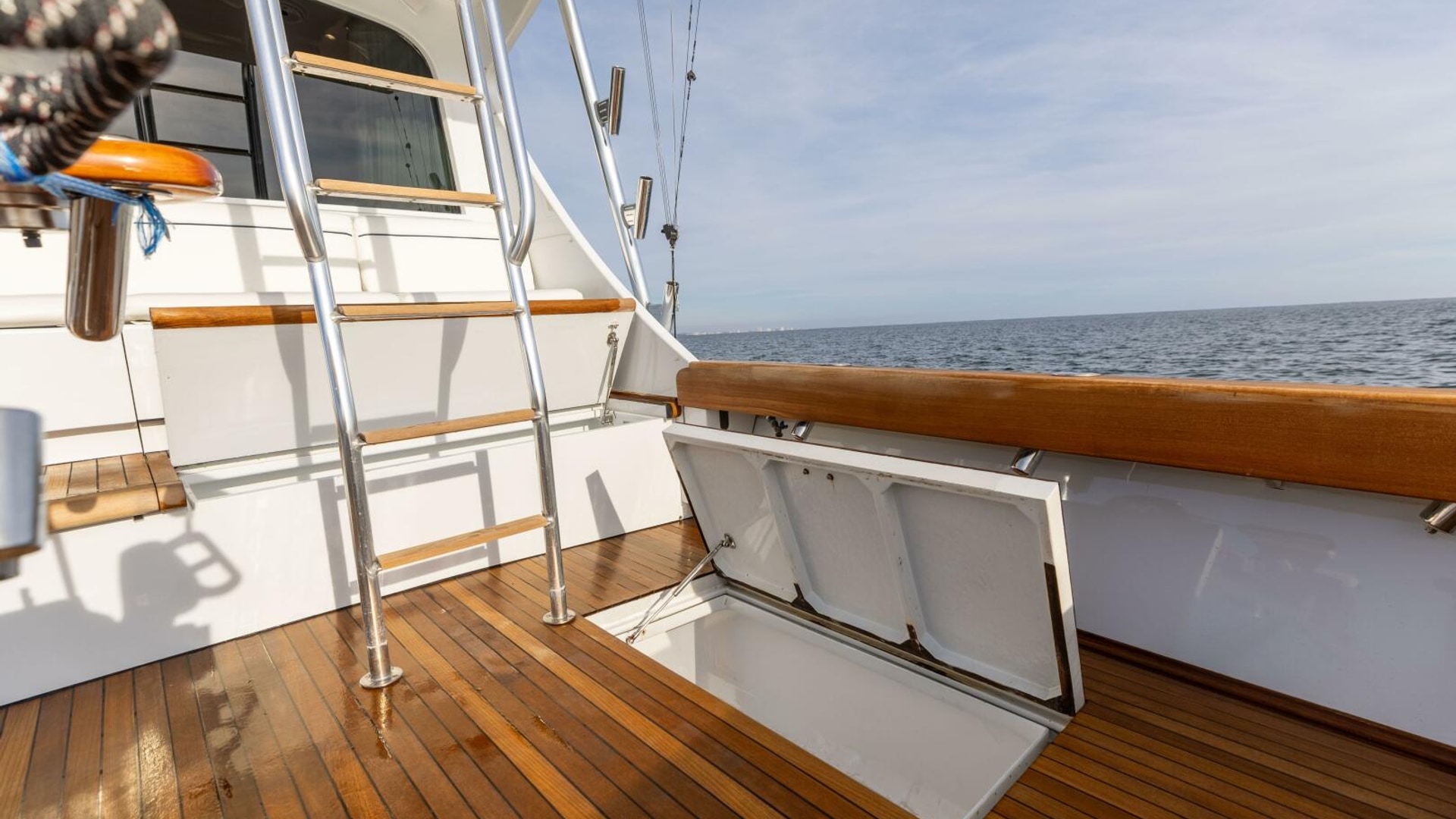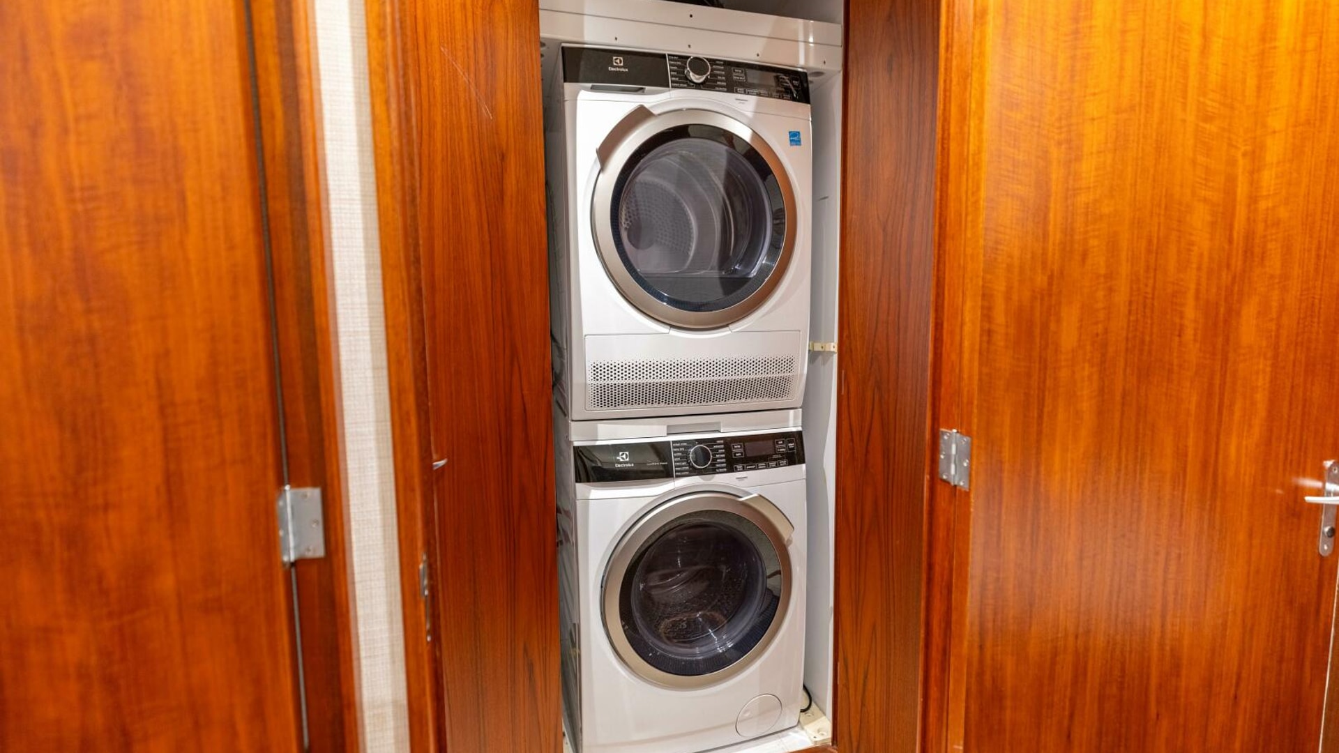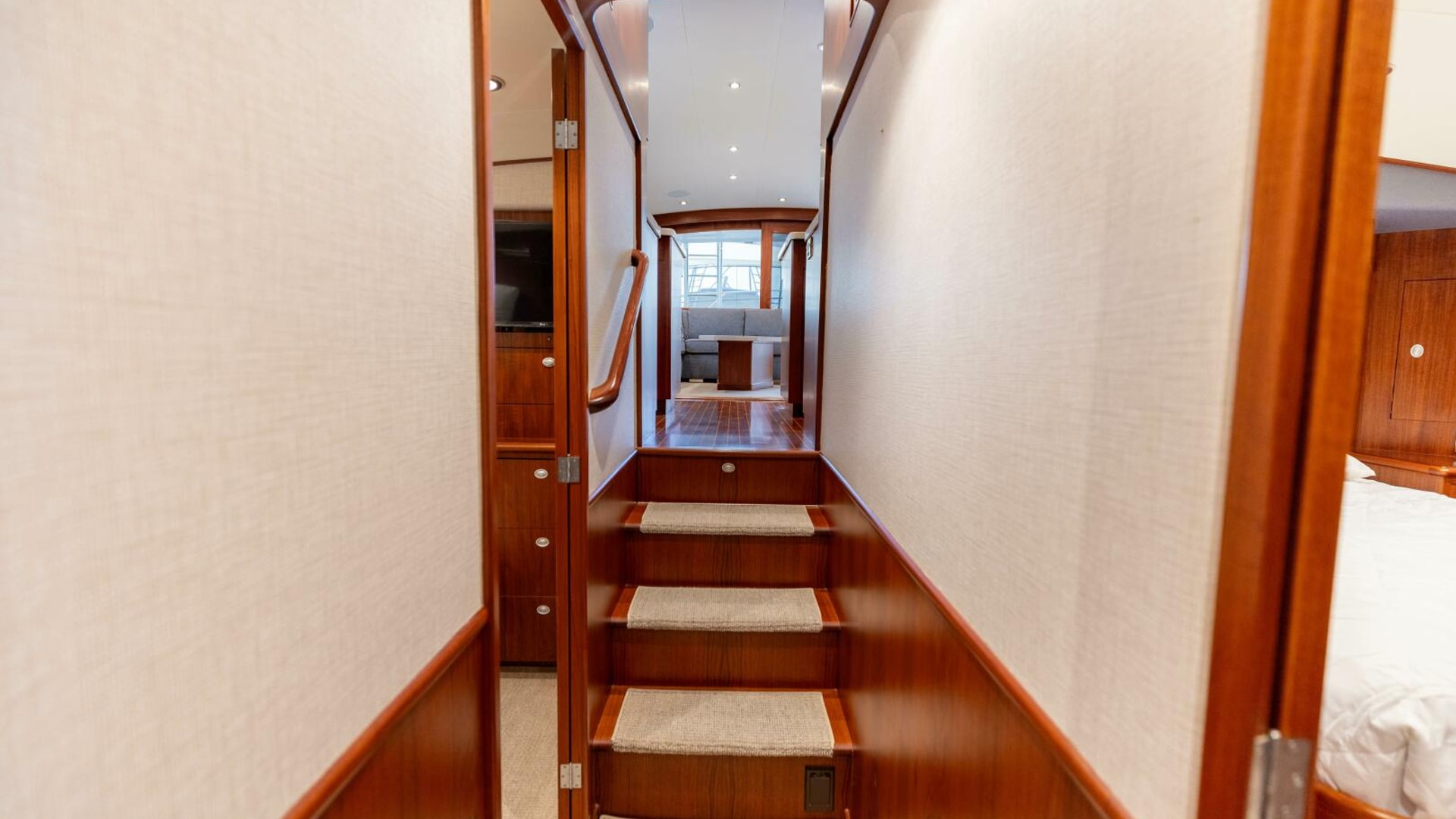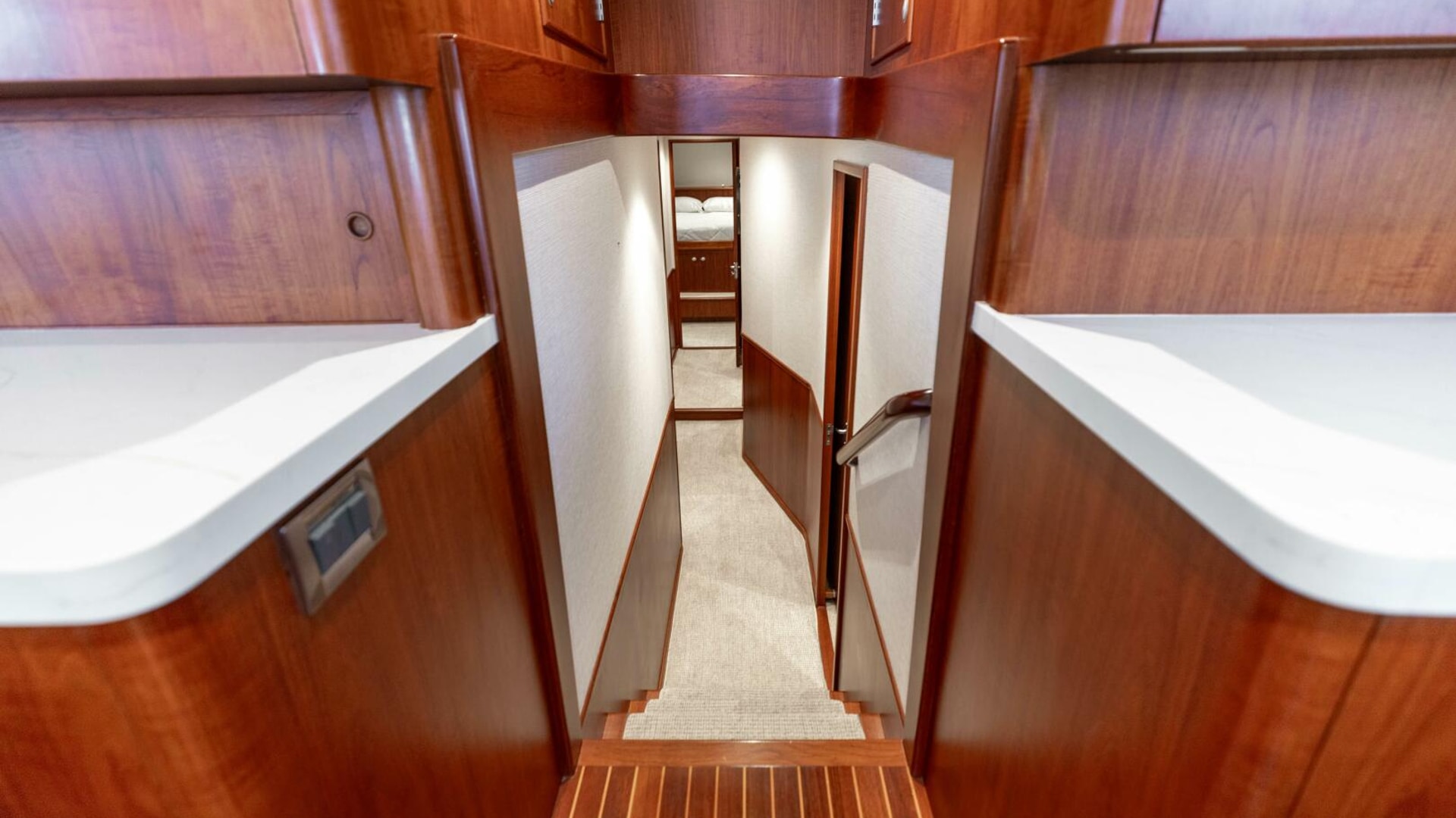 Offering a wide and curved walkway to the staterooms, also housing a large rod locker, along with a stacked large Electrolux washer & dryer. Storage below decks as well.