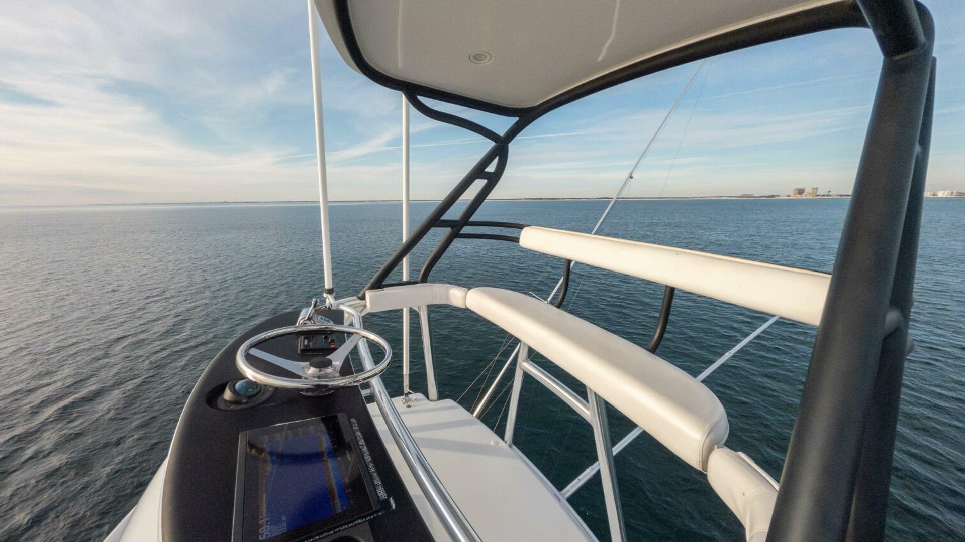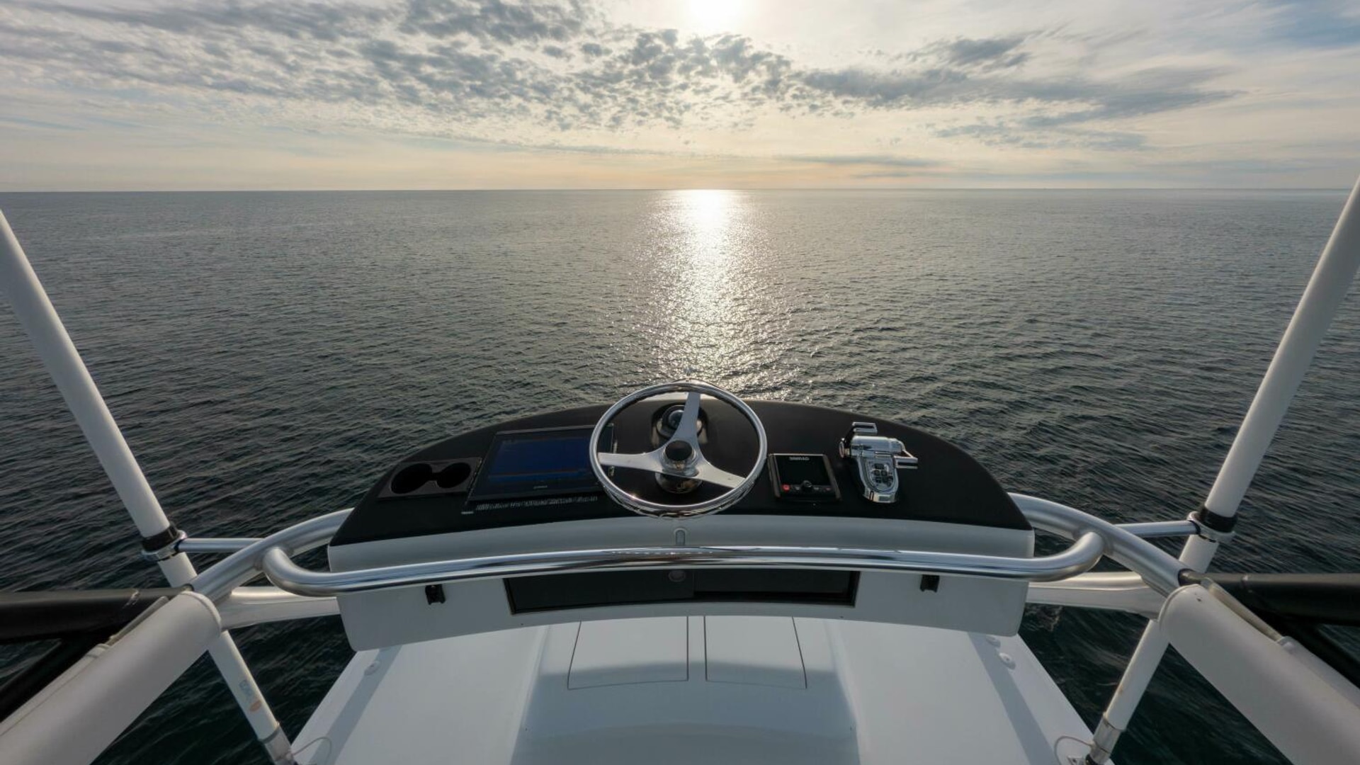 Extremely well-planned cockpit. Firstly, the Mezzanine area offers lots of comfortable seating, which is also air-conditioned. Under the seating area, you’ll find the massive custom Stainless-steel freezer. The Mezzanine step includes huge storage, additional refrigeration, and a drink box, along with tackle storage. This area also houses a very large Fish Box, Live Wells, and a Freeman hatch for the Quick Gyro.