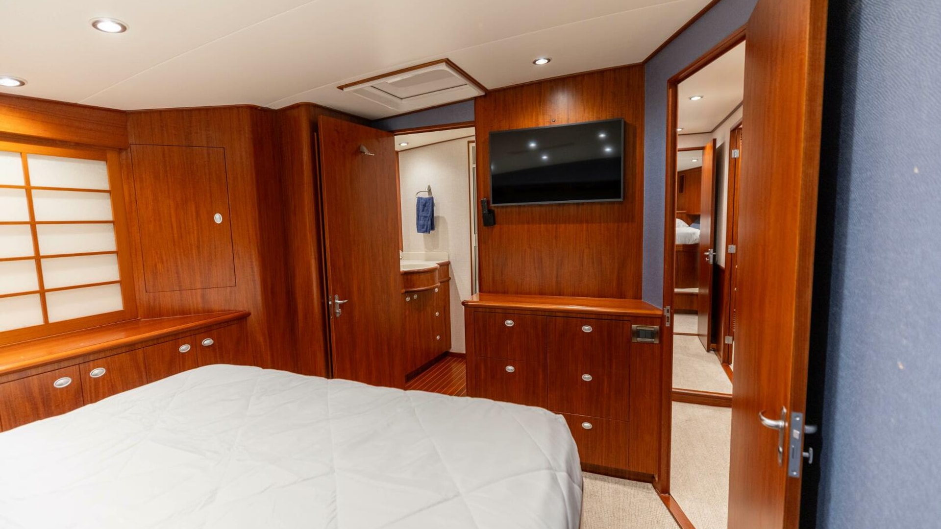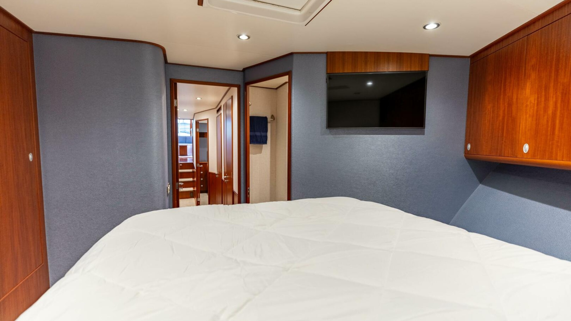 The beautiful, professionally decorated, spacious salon is surrounded by rich satin-finished cherry wood, which gives a very peaceful feel. The layout of this salon area works perfectly, with an oversized custom sofa to starboard, which can accommodate 6, to a cocktail table great for entertaining. Over to port, houses the complete entertainment center, which offers a large TV, sound system, and ample storage.