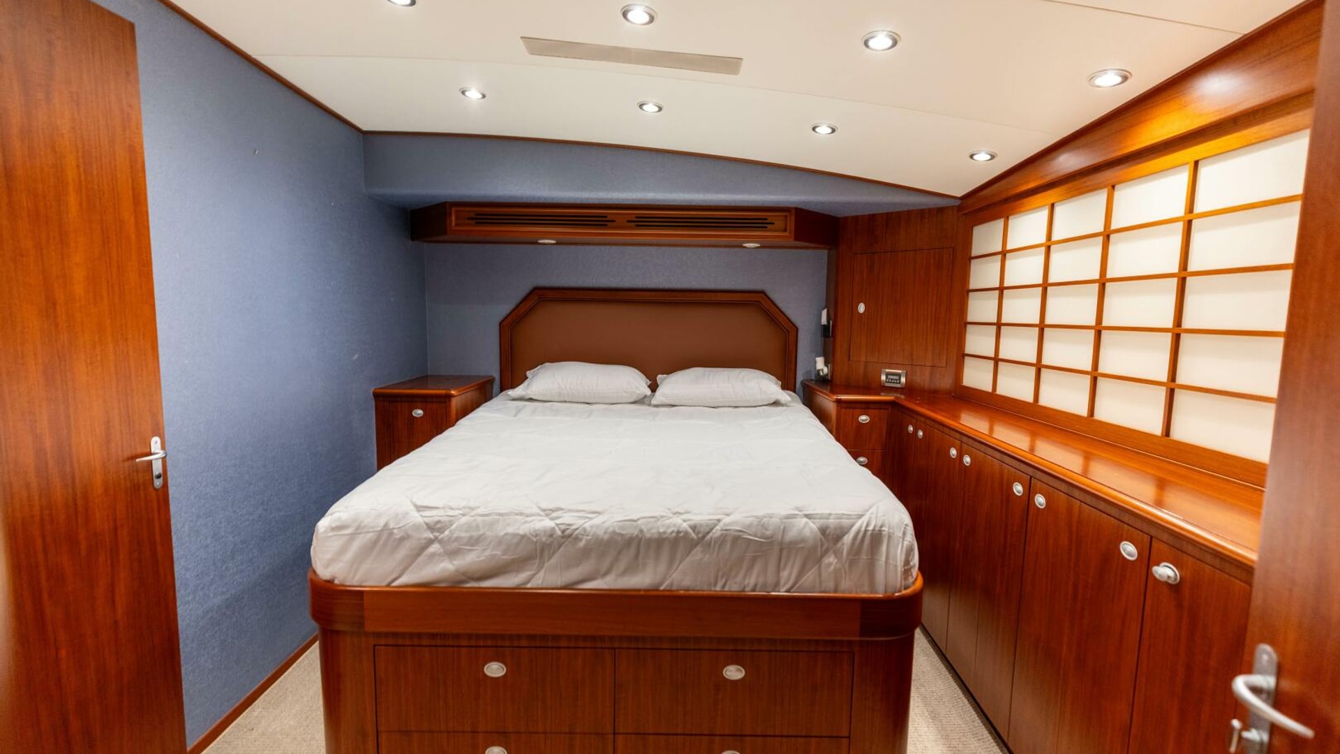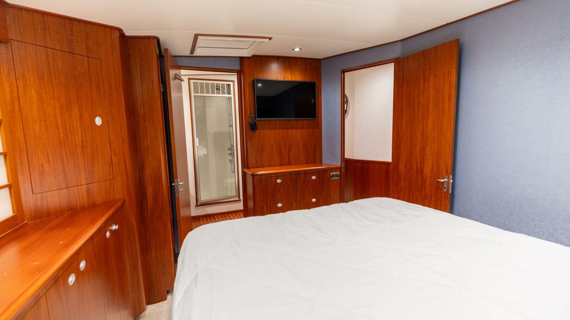Lavish satin cherry woodwork surrounds this fantastic room. A full walk-around Queen bed, with nightstands on both sides, with custom lighting. This room also offers tremendous storage, with great hanging closets too. The master head area has a large shower with a custom glass door, great storage, and a very nice vanity. Accented with Cherry wood and Teak & Holley floors.