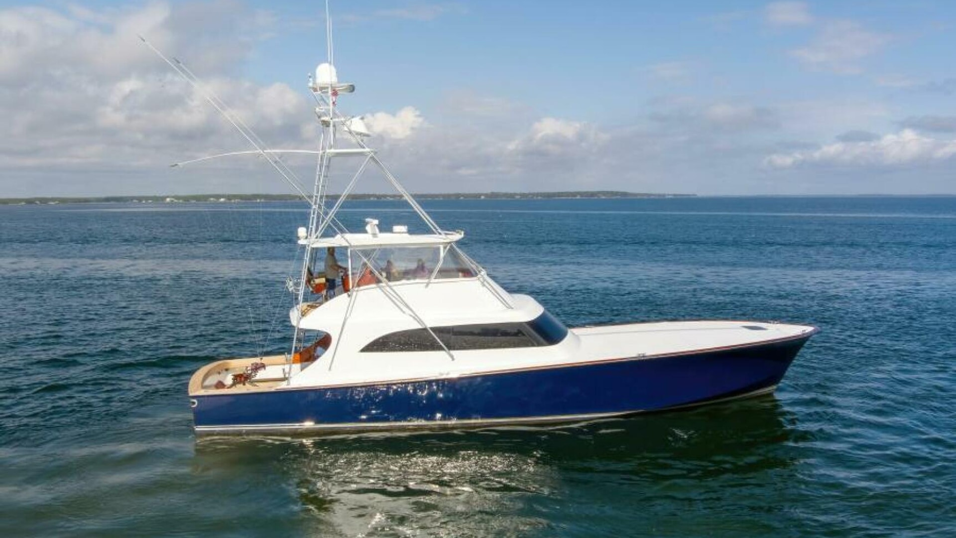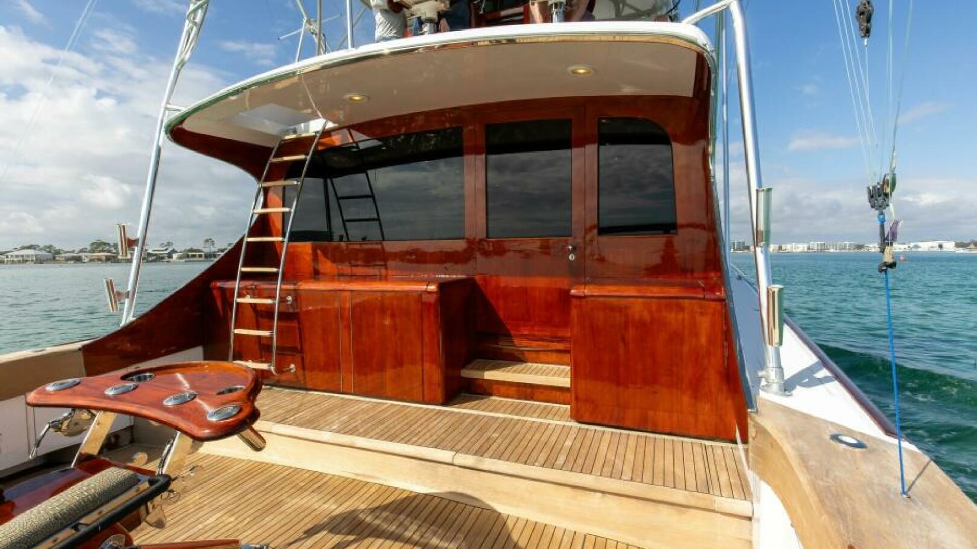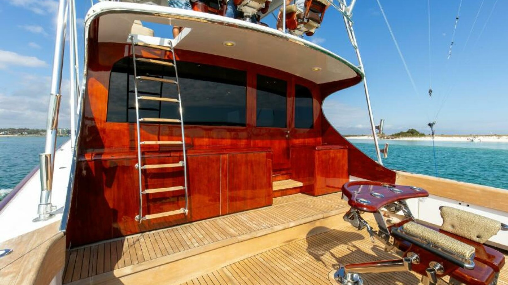 The cockpit is fitted with a portable boarding step, a freezer, a bait prep station, engine room and rod holders, tuna door, bridge ladder, in-deck live baitwell and fish box.