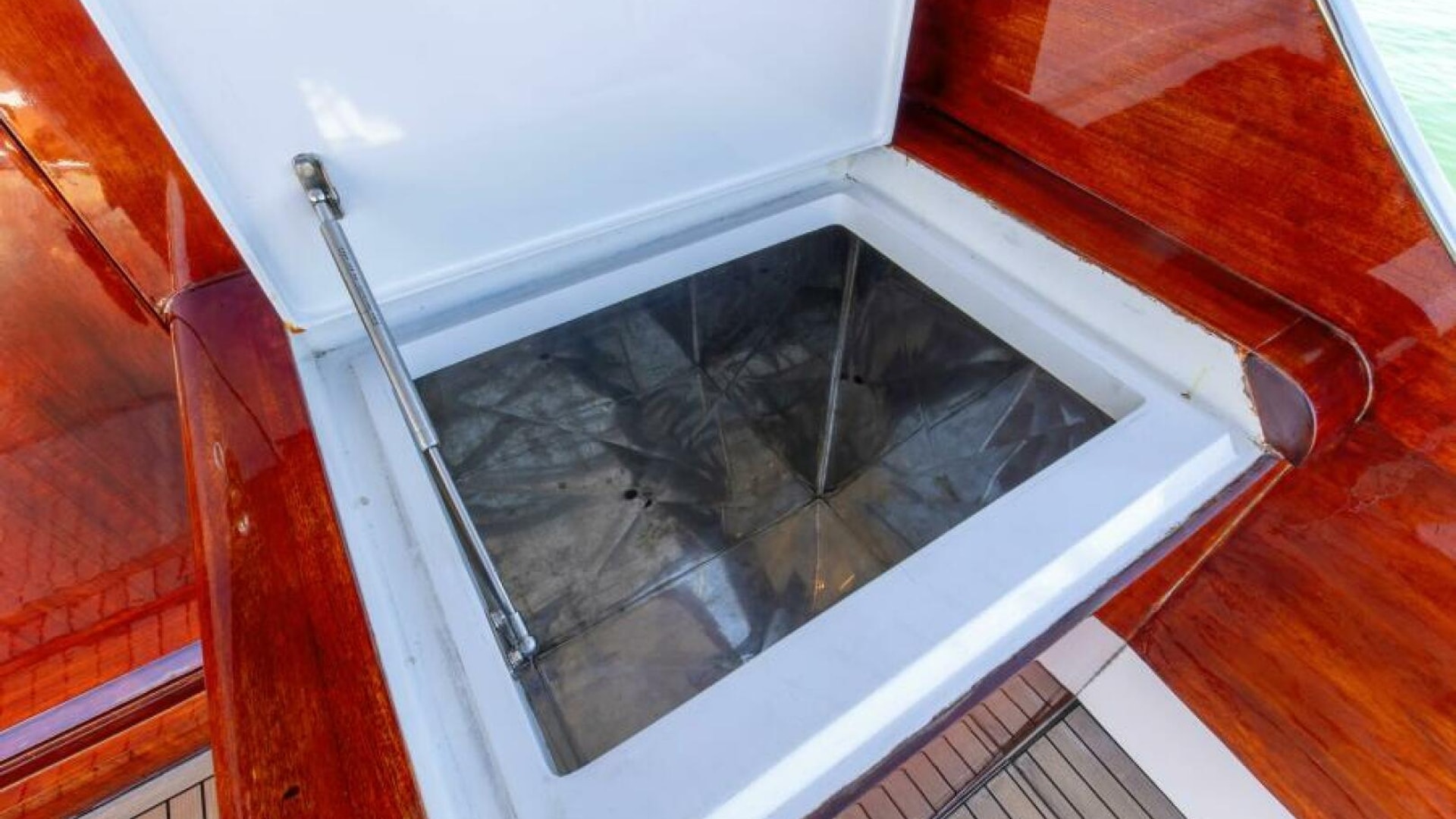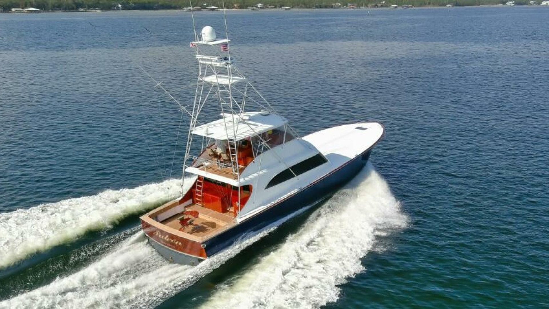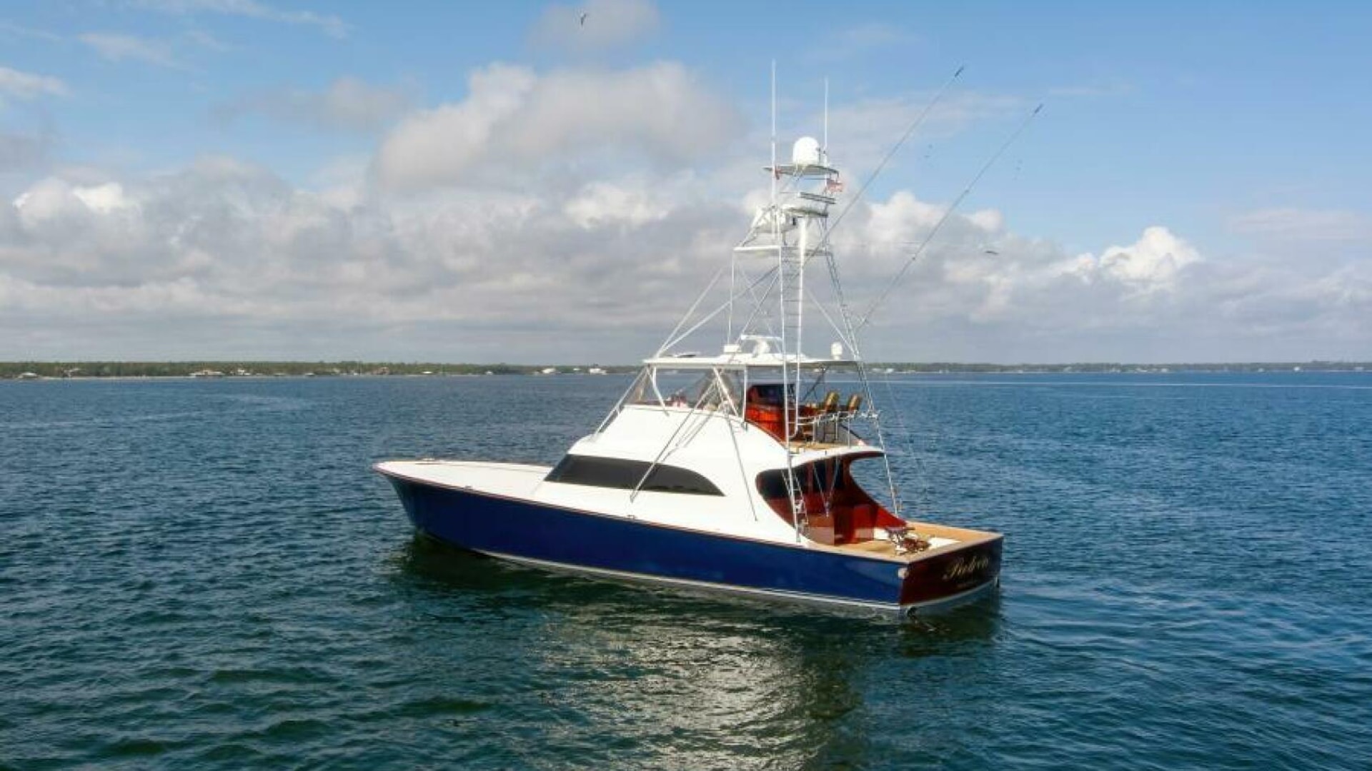 The cockpit is fitted with a portable boarding step, a freezer, a bait prep station, engine room and rod holders, tuna door, bridge ladder, in-deck live baitwell and fish box.