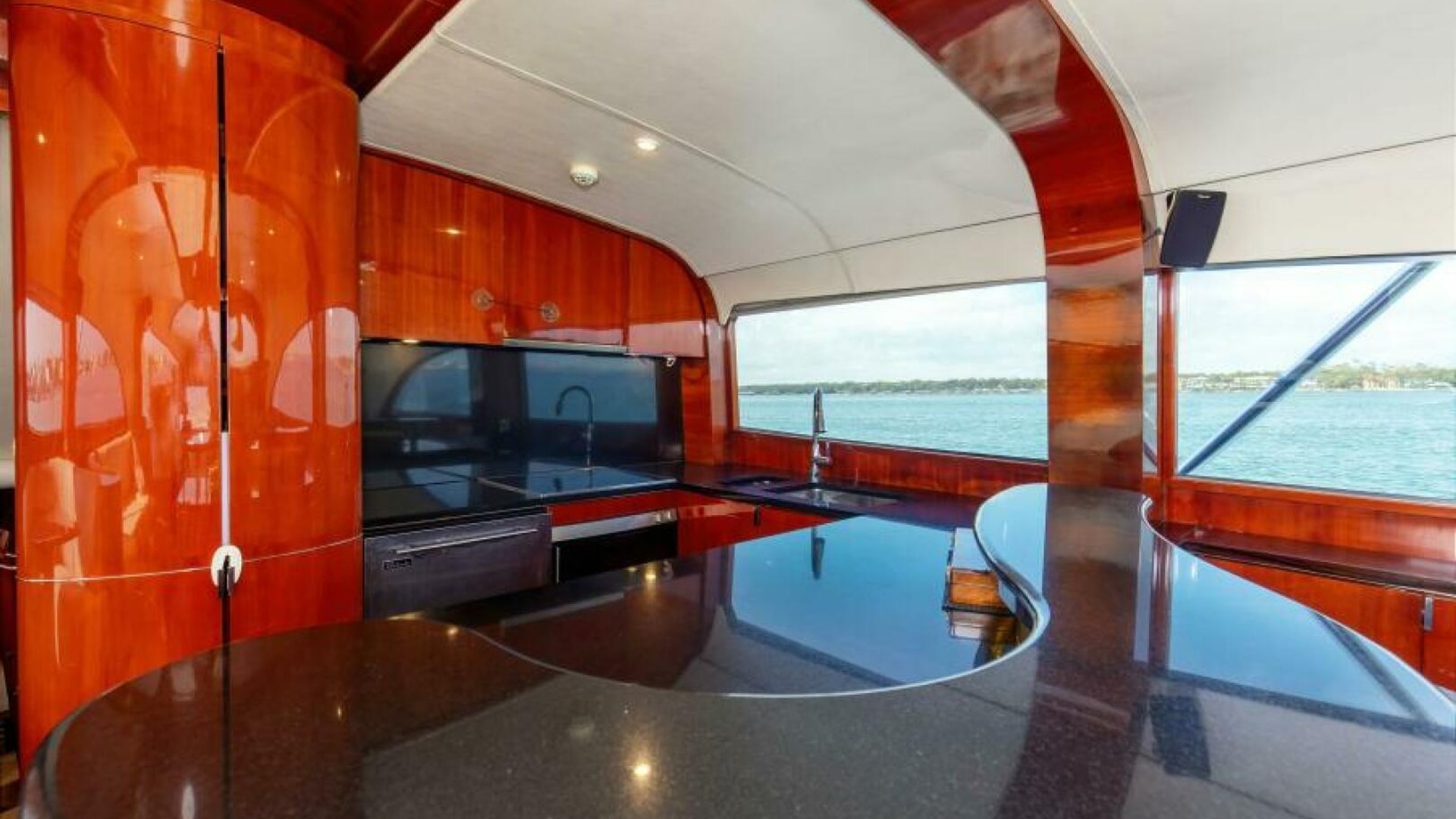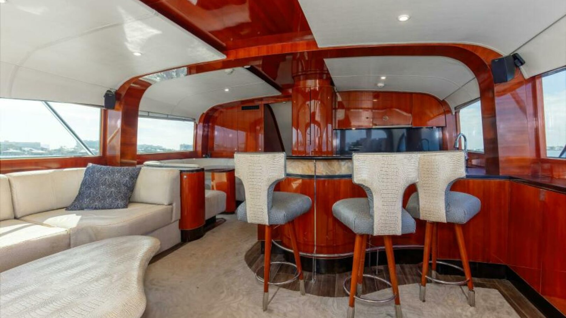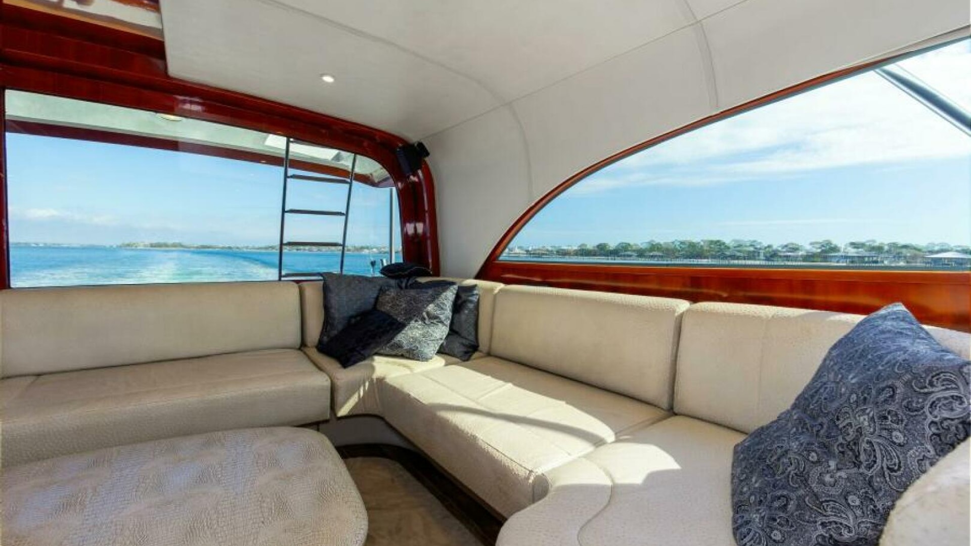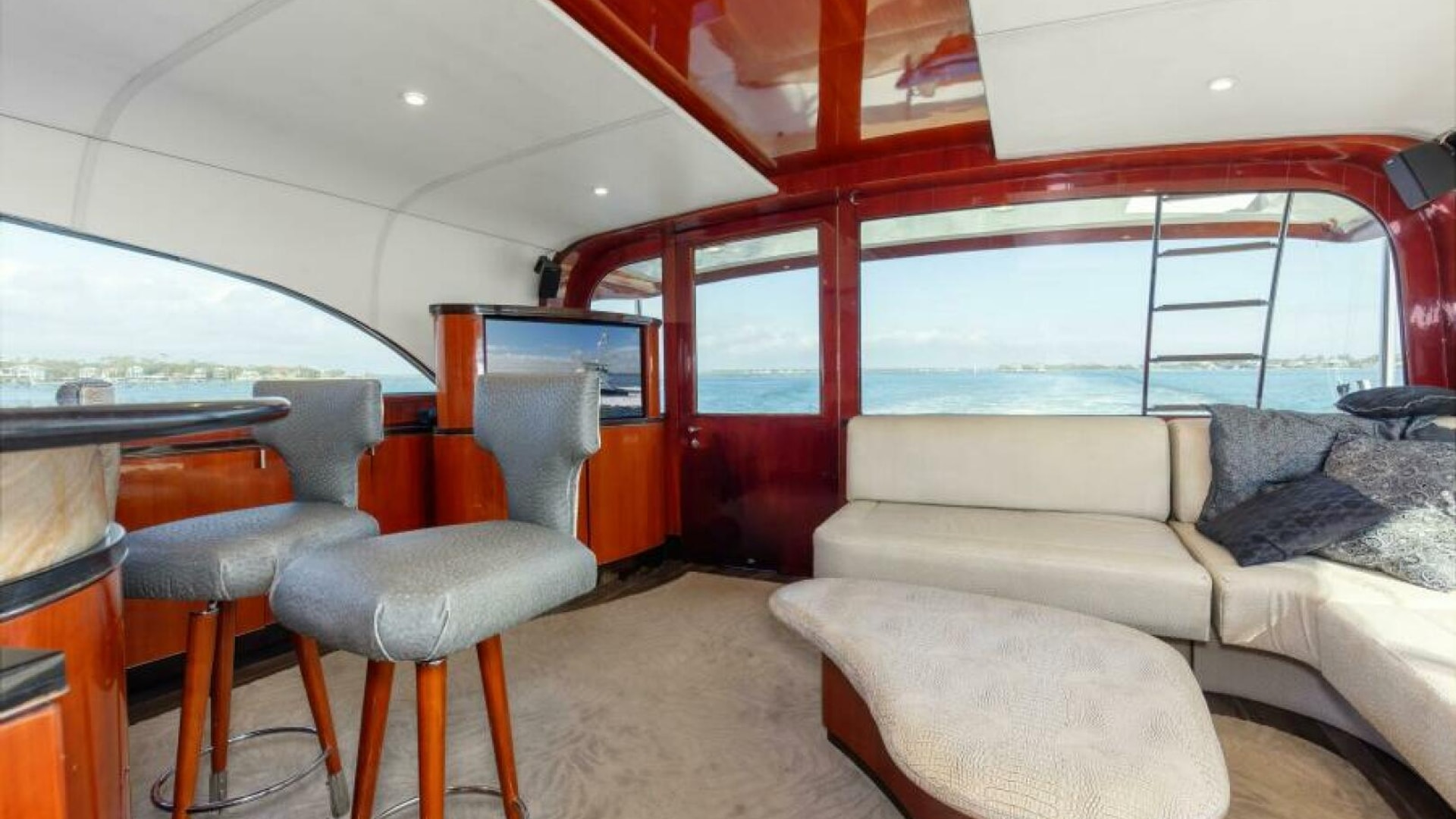 The engine room is located under the salon. The Salon is arranged with a U-shaped dinette, a U-shaped couch and a coffee table are along the port wing. The pantry, U-shaped galley, bar with (3) stools, main electric panels and entertainment center are along the starboard wing. Cabin and salon are fitted with VAC and VDC lighting. VAC outlets, air conditioner outlets and controls, lockers and shelving. Salon's swinging rear egress door takes you to the cockpit.