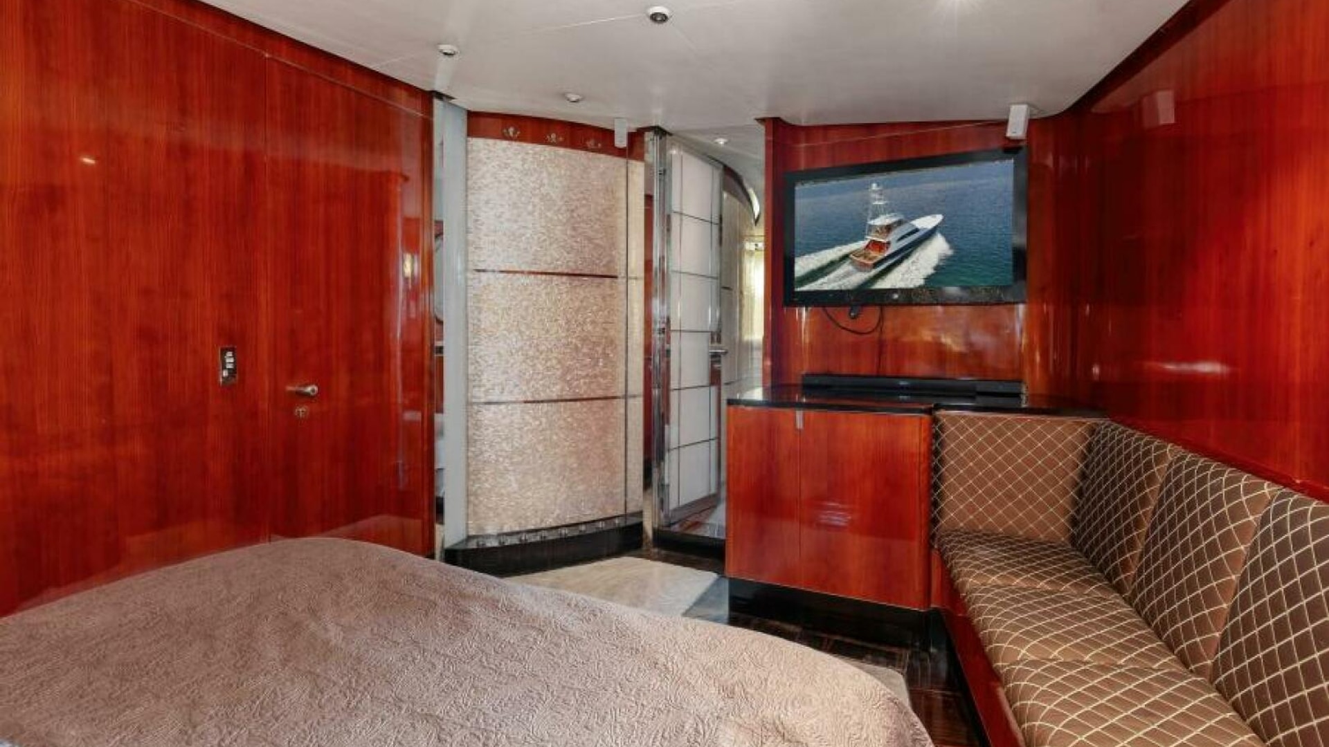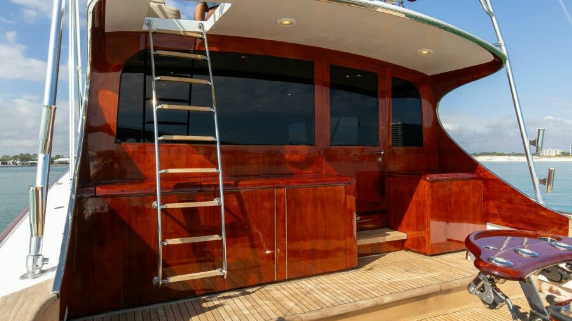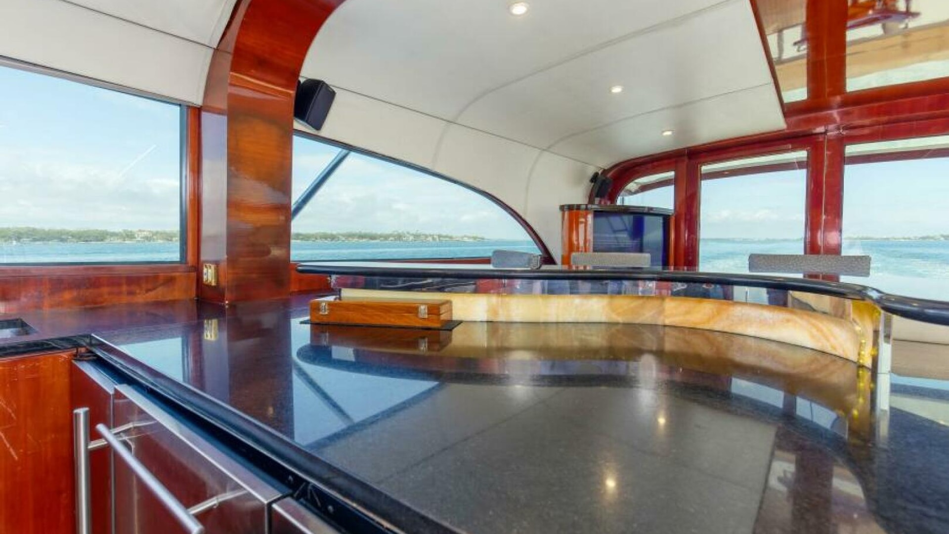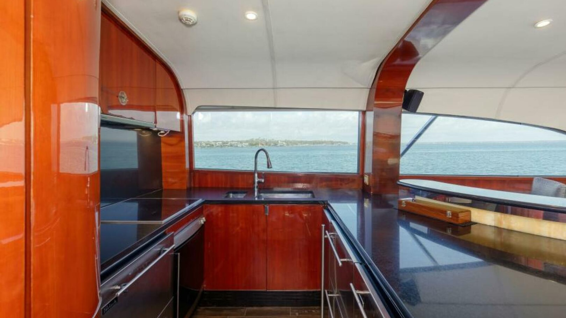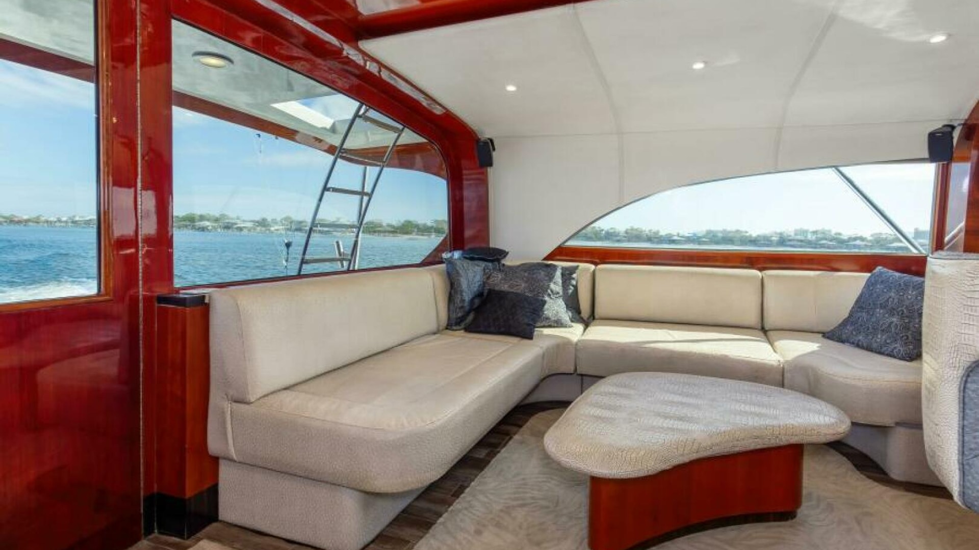 The engine room is located under the salon. The Salon is arranged with a U-shaped dinette, a U-shaped couch and a coffee table are along the port wing. The pantry, U-shaped galley, bar with (3) stools, main electric panels and entertainment center are along the starboard wing. Cabin and salon are fitted with VAC and VDC lighting. VAC outlets, air conditioner outlets and controls, lockers and shelving. Salon's swinging rear egress door takes you to the cockpit.