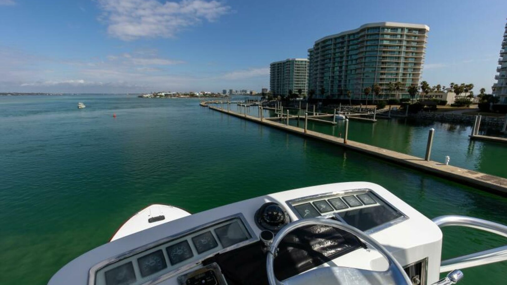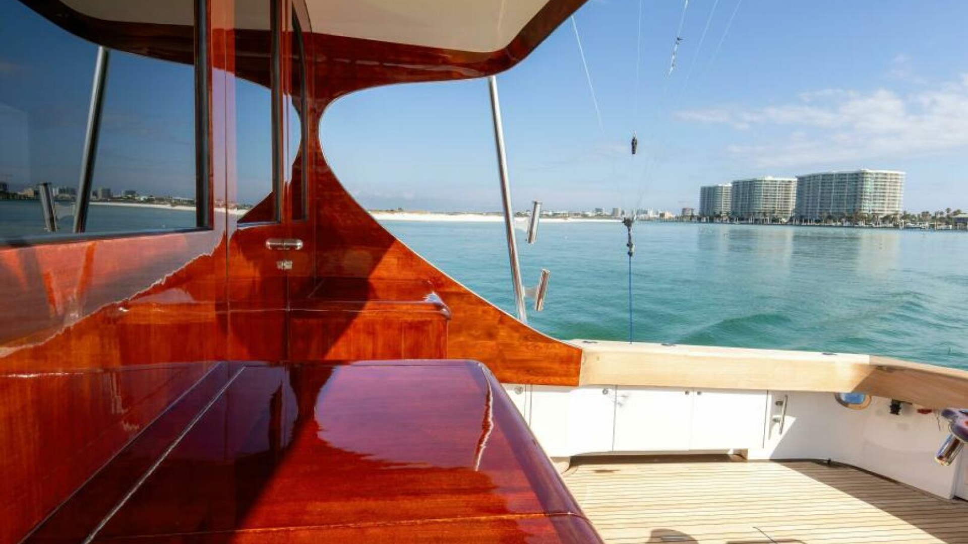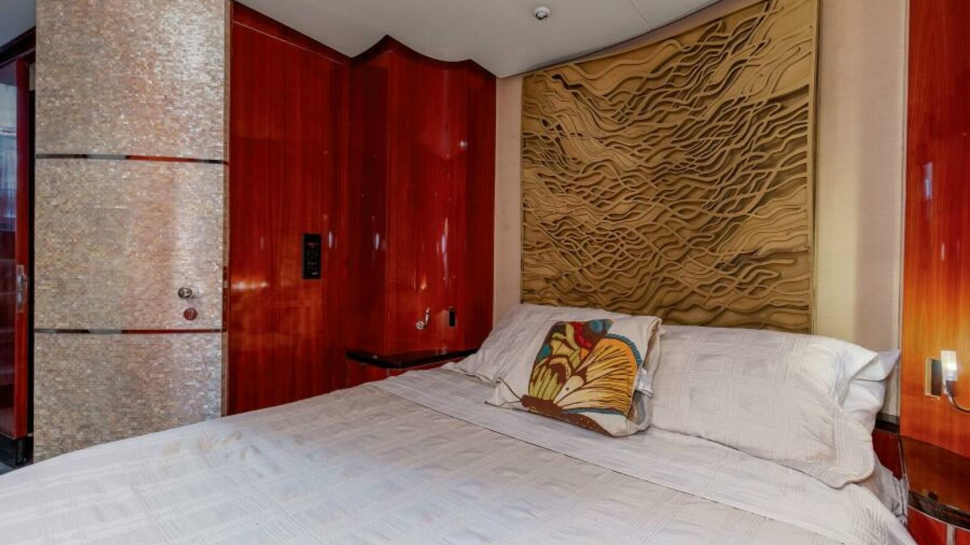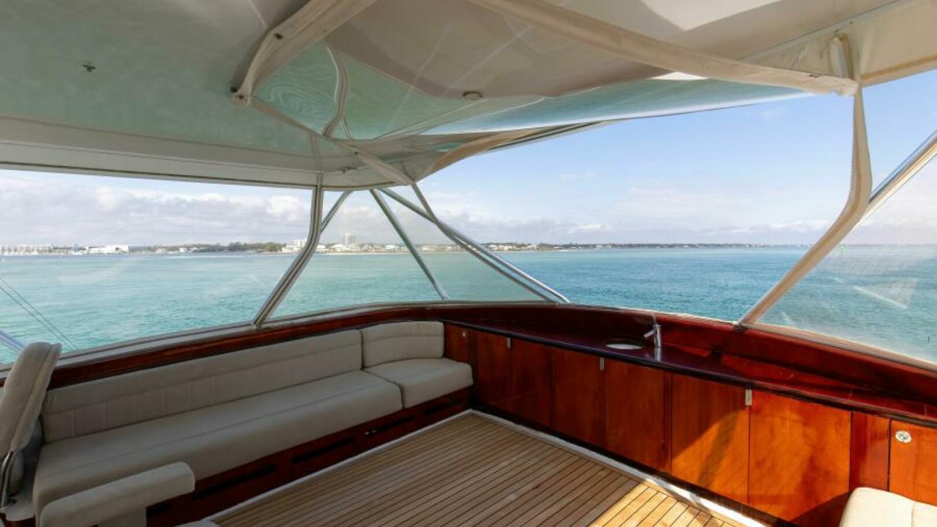 The engine room is located under the salon. The Salon is arranged with a U-shaped dinette, a U-shaped couch and a coffee table are along the port wing. The pantry, U-shaped galley, bar with (3) stools, main electric panels and entertainment center are along the starboard wing. Cabin and salon are fitted with VAC and VDC lighting. VAC outlets, air conditioner outlets and controls, lockers and shelving. Salon's swinging rear egress door takes you to the cockpit.