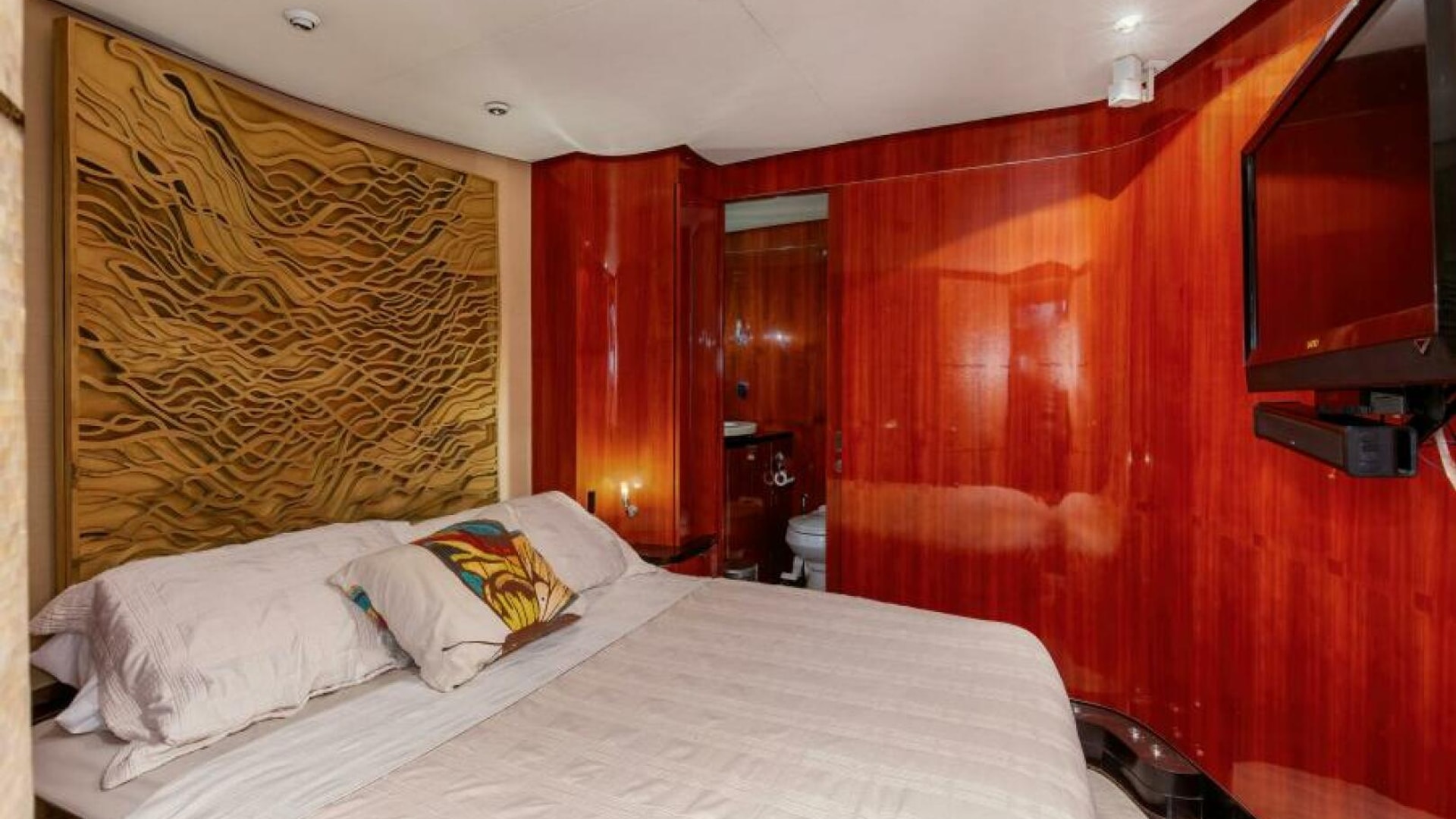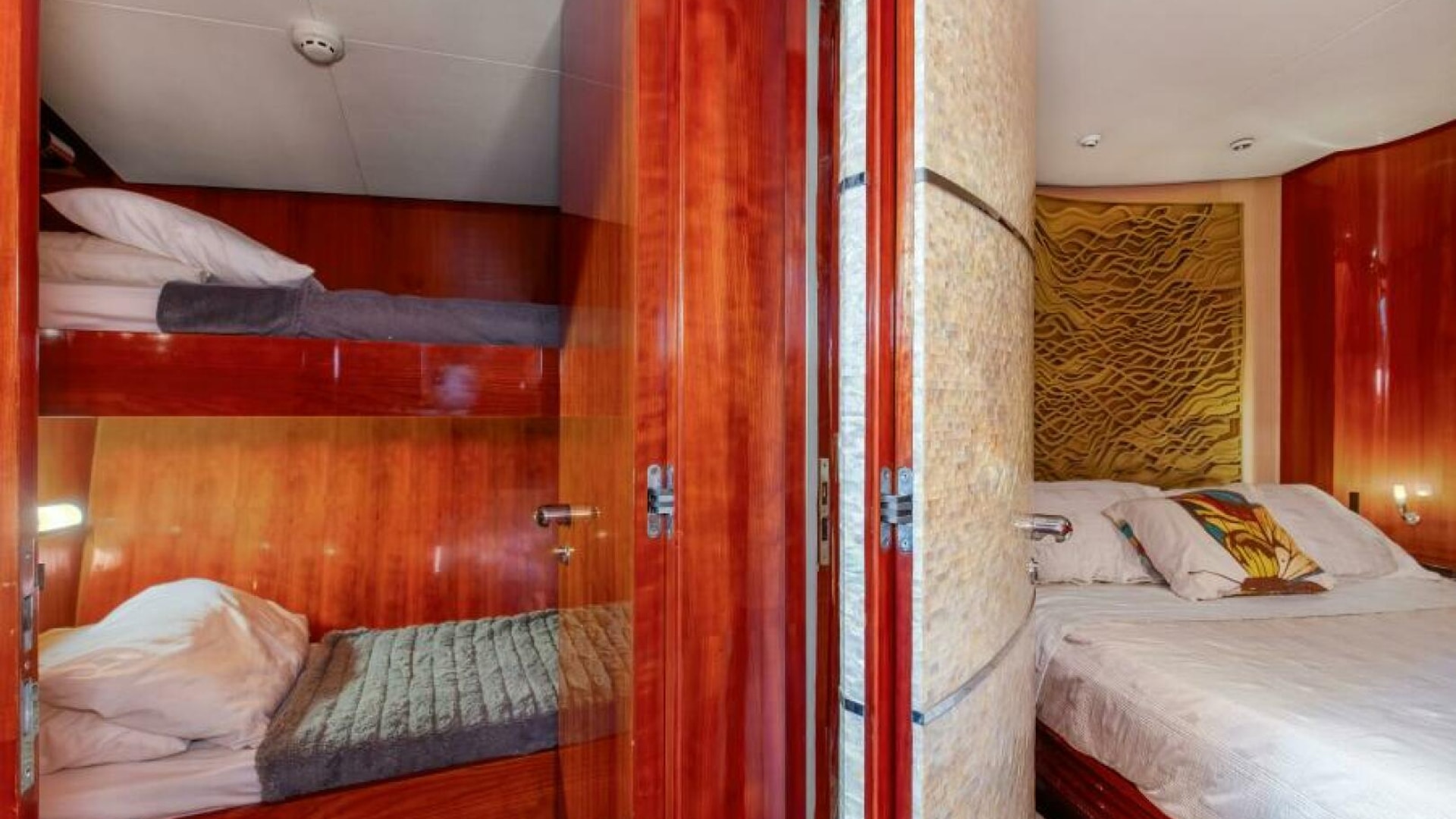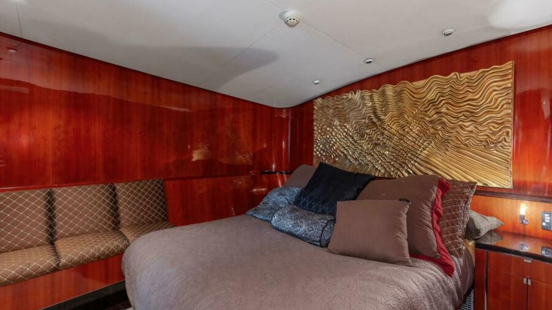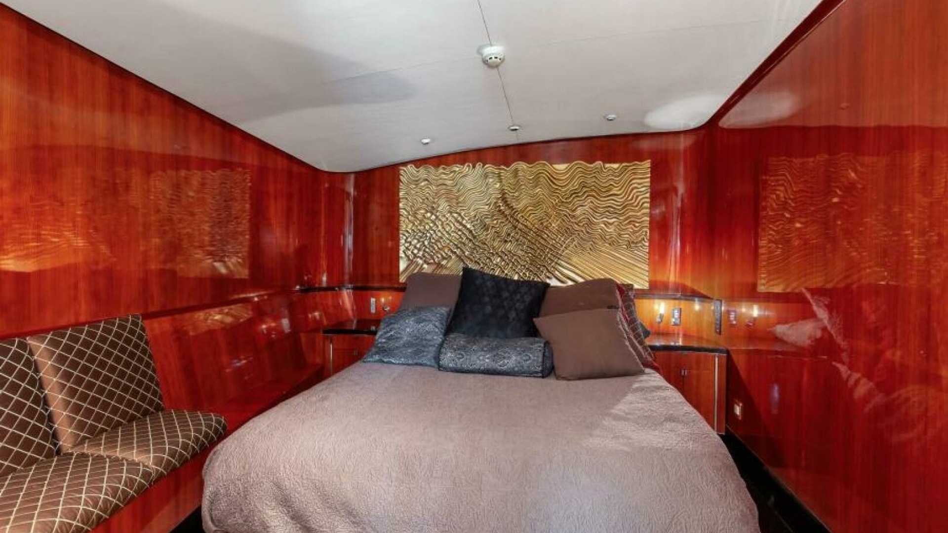 The cabin interior is arranged with guest's stateroom and crew's quarters along the port wing. The guest stateroom is fitted with an island berth, private head, a locker and a companionway privacy door. The Crew's quarters are fitted with over/under berths, a locker, a head and companionway privacy door. Crew's head can also be accessed through a companionway door. The cabin egress steps have a locker fitted with a clothes washer and dryer. The master stateroom's private head, master stateroom with an island berth, a settee, built-in cabinetry with a cold plate refrigerator and a privacy companionway door are along the starboard wing. The Up-cabin's companionway steps are the salon.