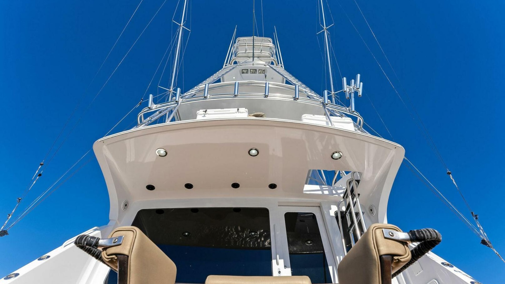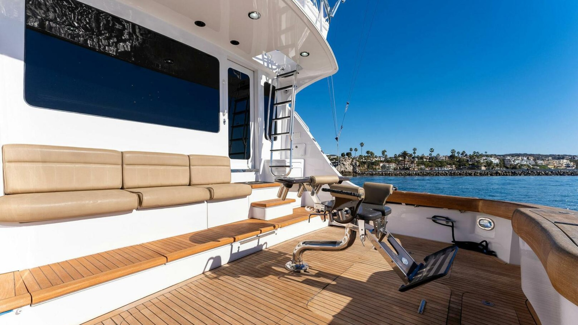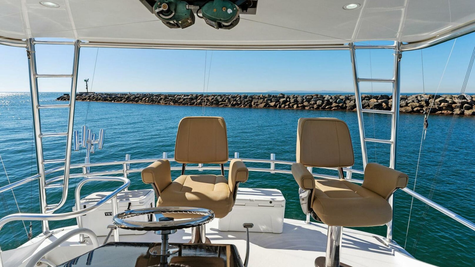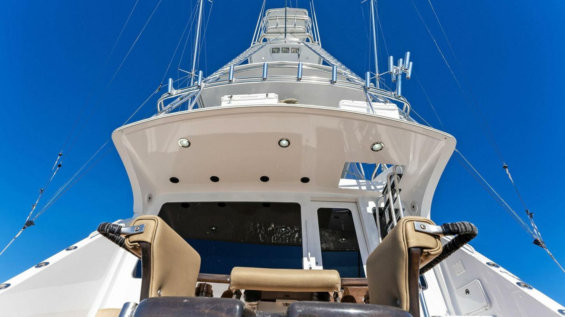 The cockpit is a full 164 square feet, loaded with features and conveniences to enhance the fishing experience. The raised mezzanine provides comfortable cushioned seating for viewing and tucked neatly under the mezzanine is an expansive freezer, stainless steel tackle drawers and additional storage boxes. Twin in deck fish boxes provides additional storage. Shorecord connections, quick disconnect salt and freshwater washdown outlets, are all hidden behind doors with no exposed hardware while the scuppers drain discretely through the quarter fenders. In addition, beneath the step you'll find a refrigerated drink box and wet storage compartments. Teak cockpit sole, cover and coaming boards accent the boat and inside the cockpit is a teak custom wood table and a custom ladder to bridge with six wide teak treads for easy access. in addition, you'll find a customized teak table with cup holders and cover positioned aft of the mezzanine seating. A custom fore and aft ladder, allows you to easily access the flybridge.