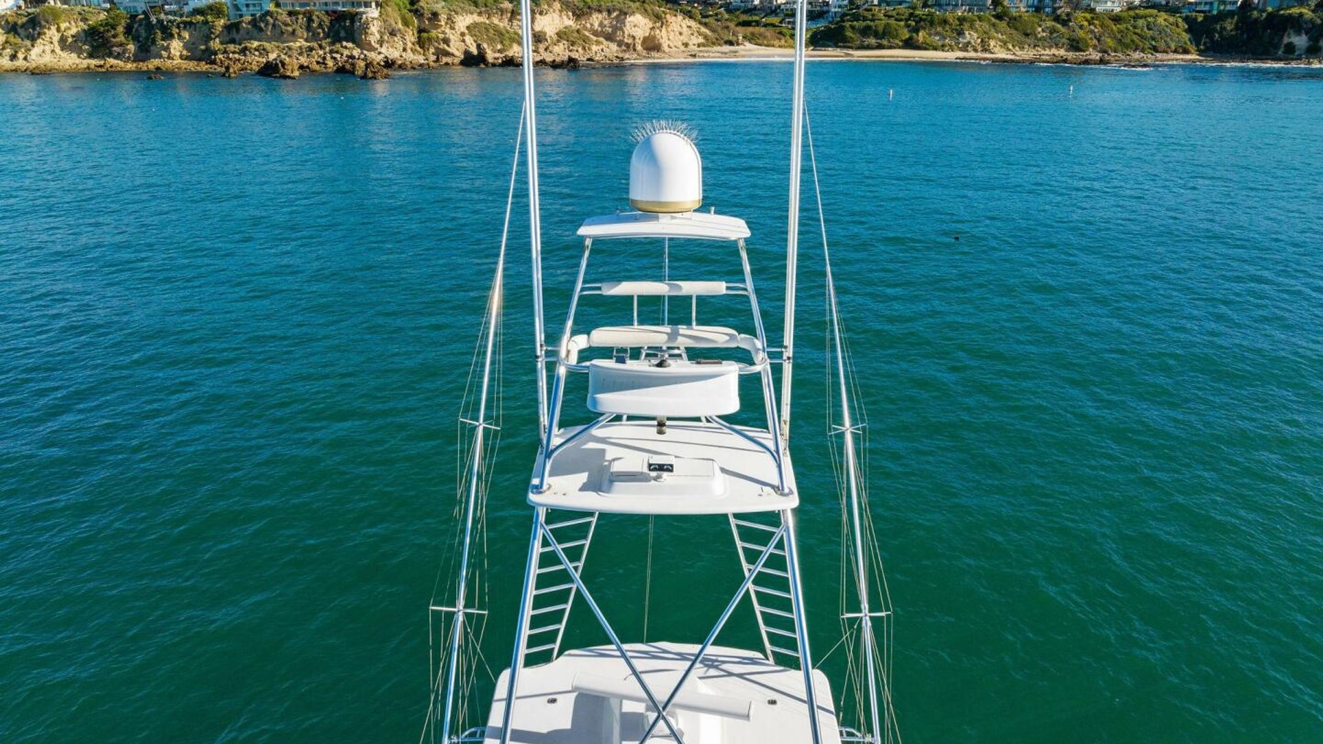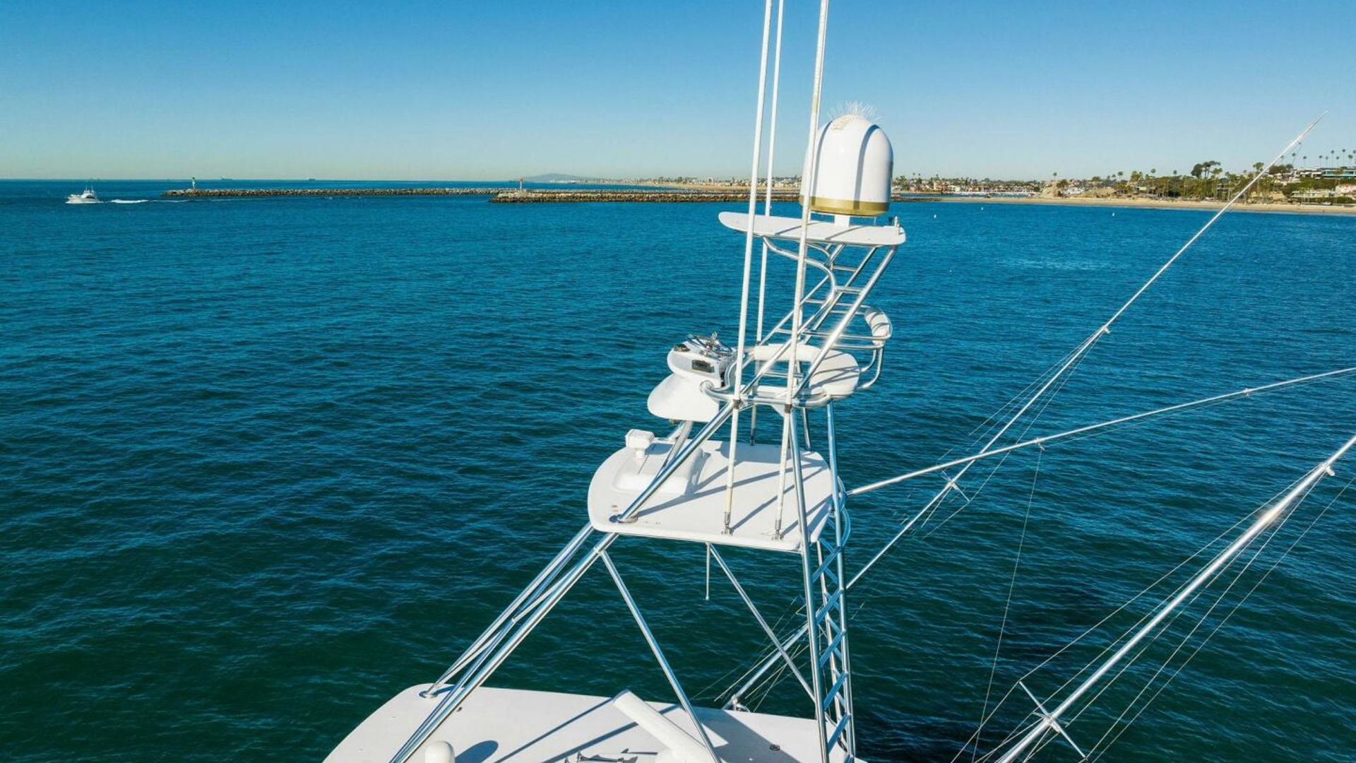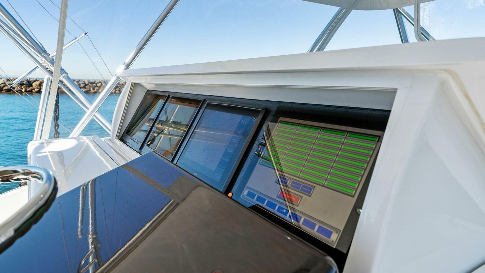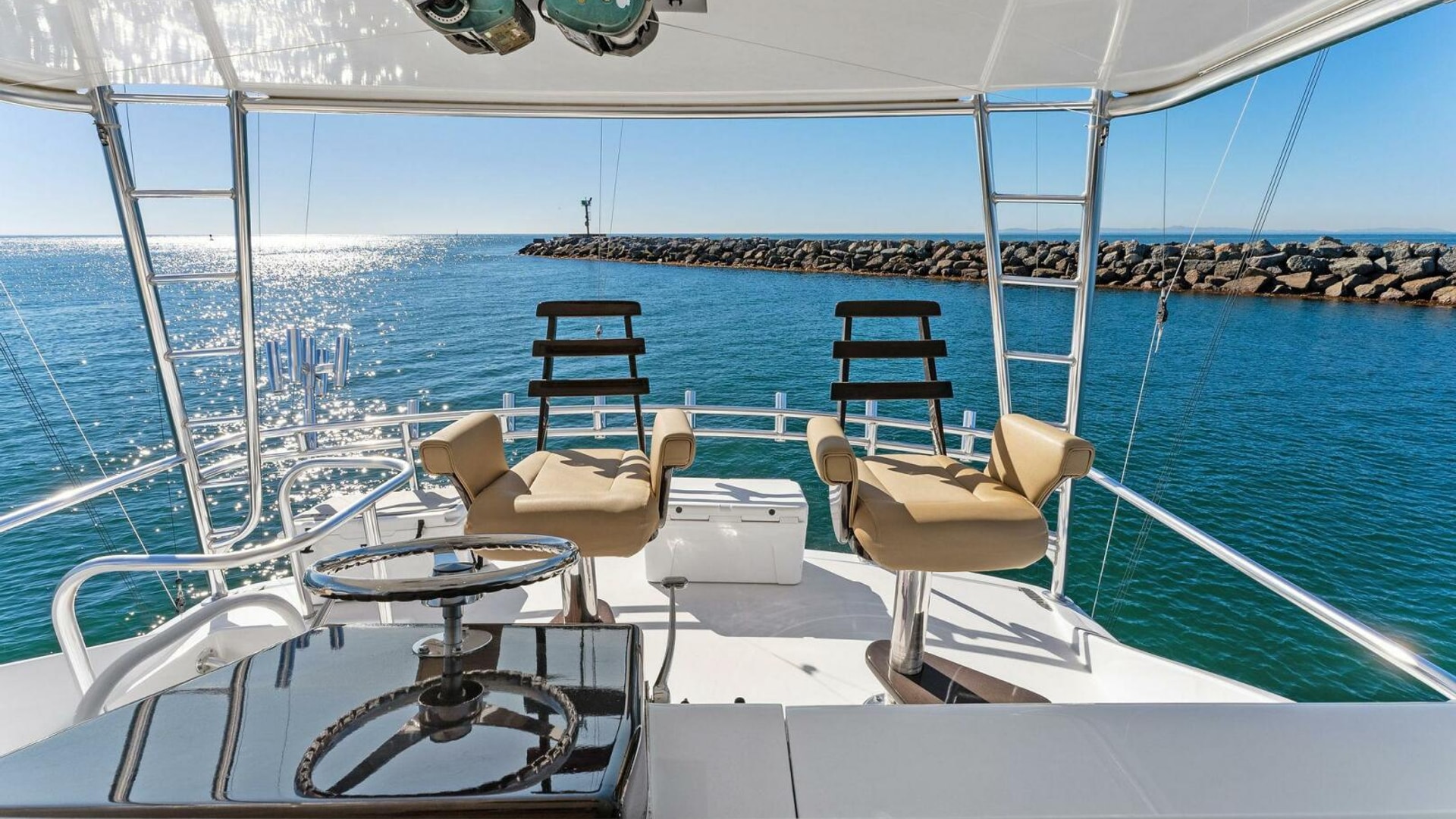The cockpit is a full 164 square feet, loaded with features and conveniences to enhance the fishing experience. The raised mezzanine provides comfortable cushioned seating for viewing and tucked neatly under the mezzanine is an expansive freezer, stainless steel tackle drawers and additional storage boxes. Twin in deck fish boxes provides additional storage. Shorecord connections, quick disconnect salt and freshwater washdown outlets, are all hidden behind doors with no exposed hardware while the scuppers drain discretely through the quarter fenders. In addition, beneath the step you'll find a refrigerated drink box and wet storage compartments. Teak cockpit sole, cover and coaming boards accent the boat and inside the cockpit is a teak custom wood table and a custom ladder to bridge with six wide teak treads for easy access. in addition, you'll find a customized teak table with cup holders and cover positioned aft of the mezzanine seating. A custom fore and aft ladder, allows you to easily access the flybridge.