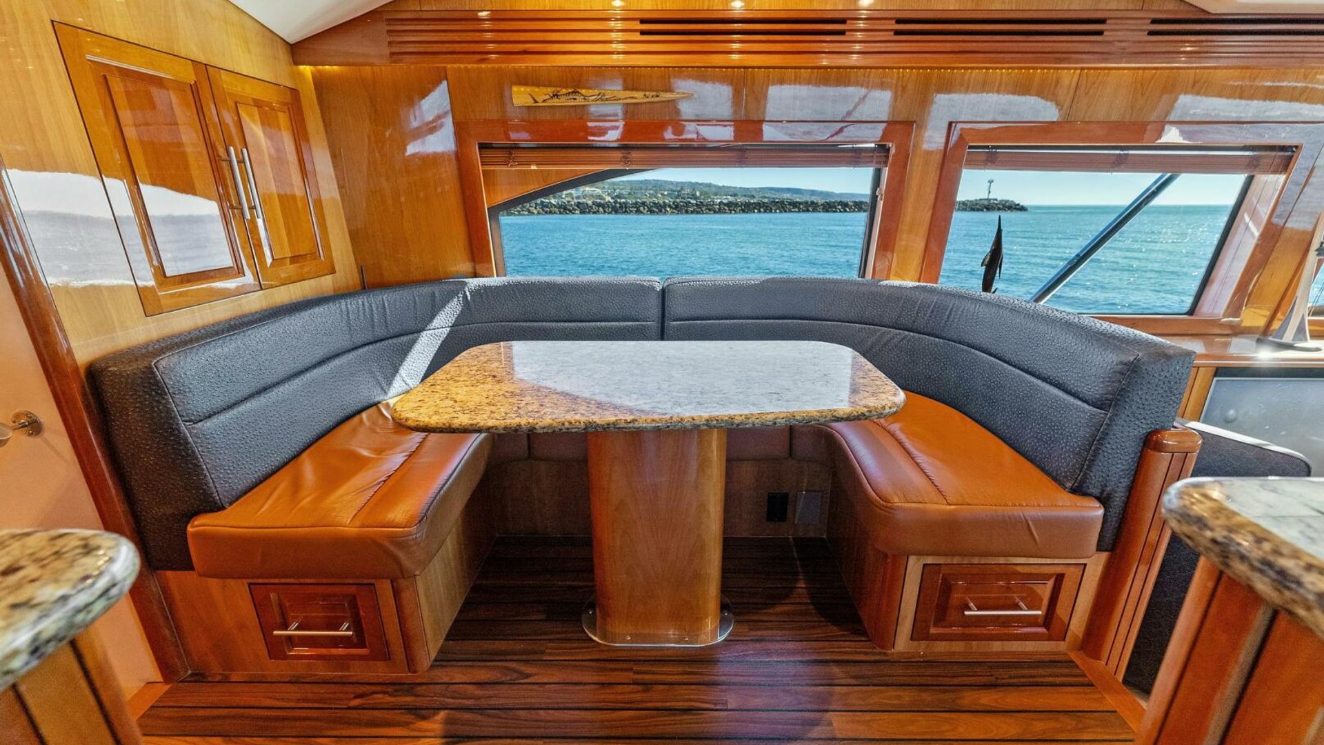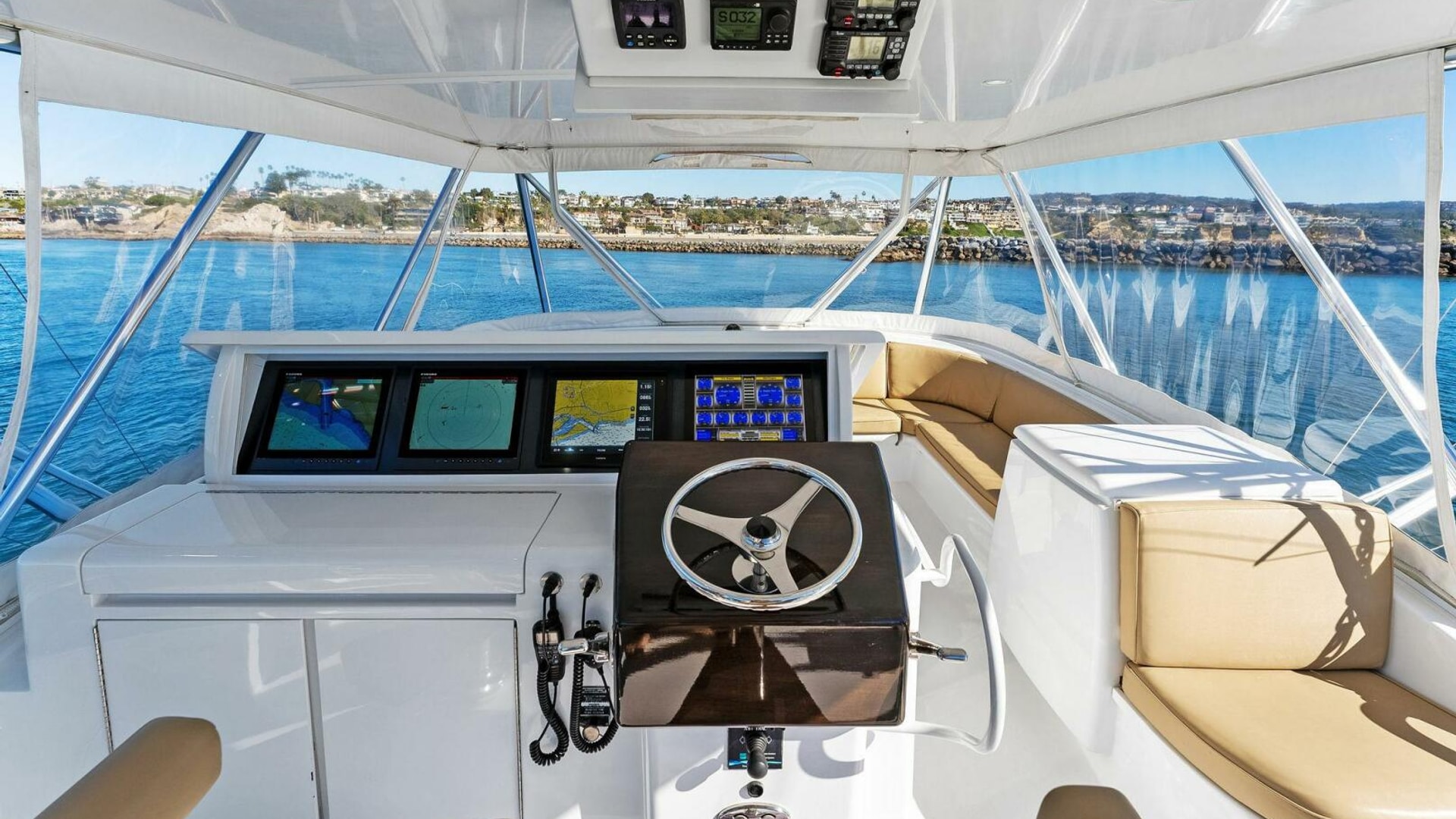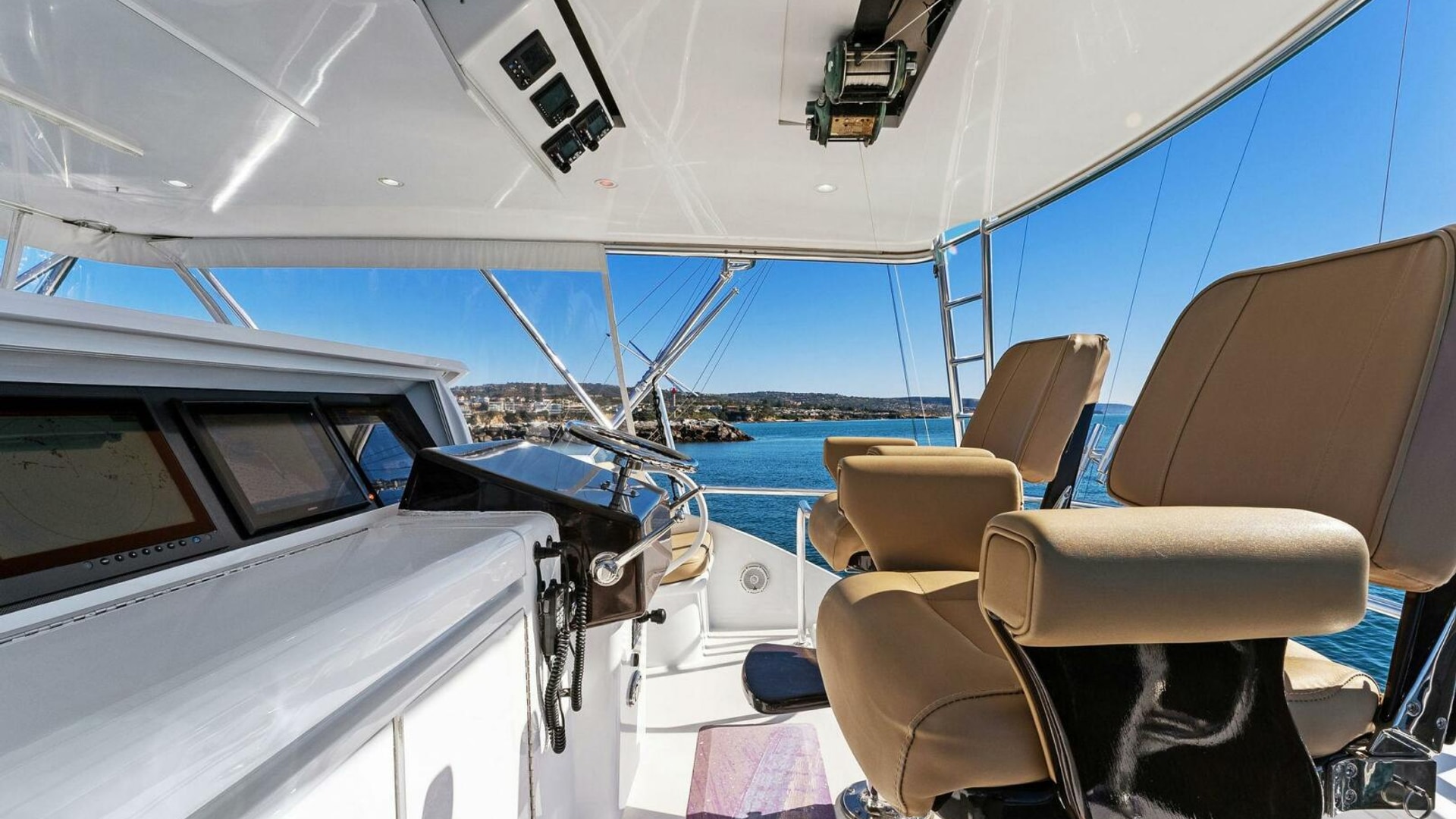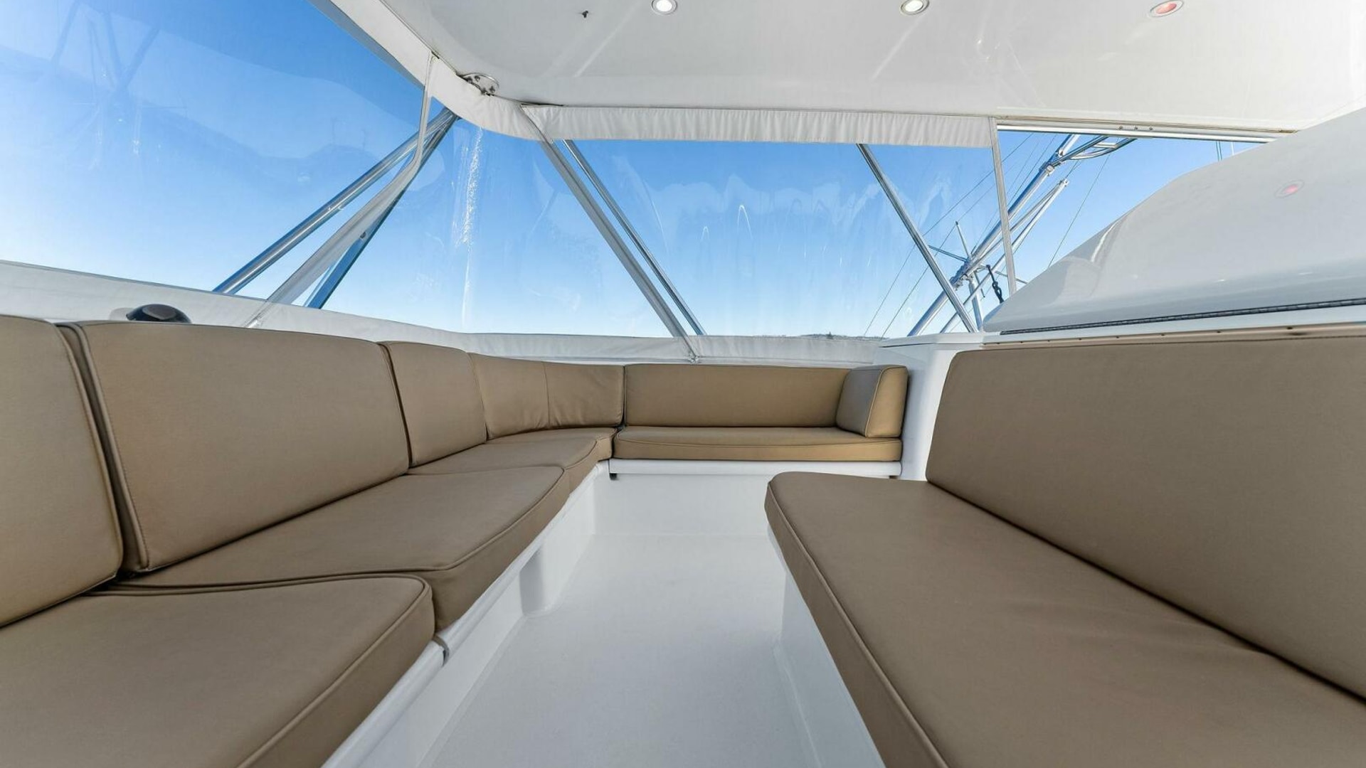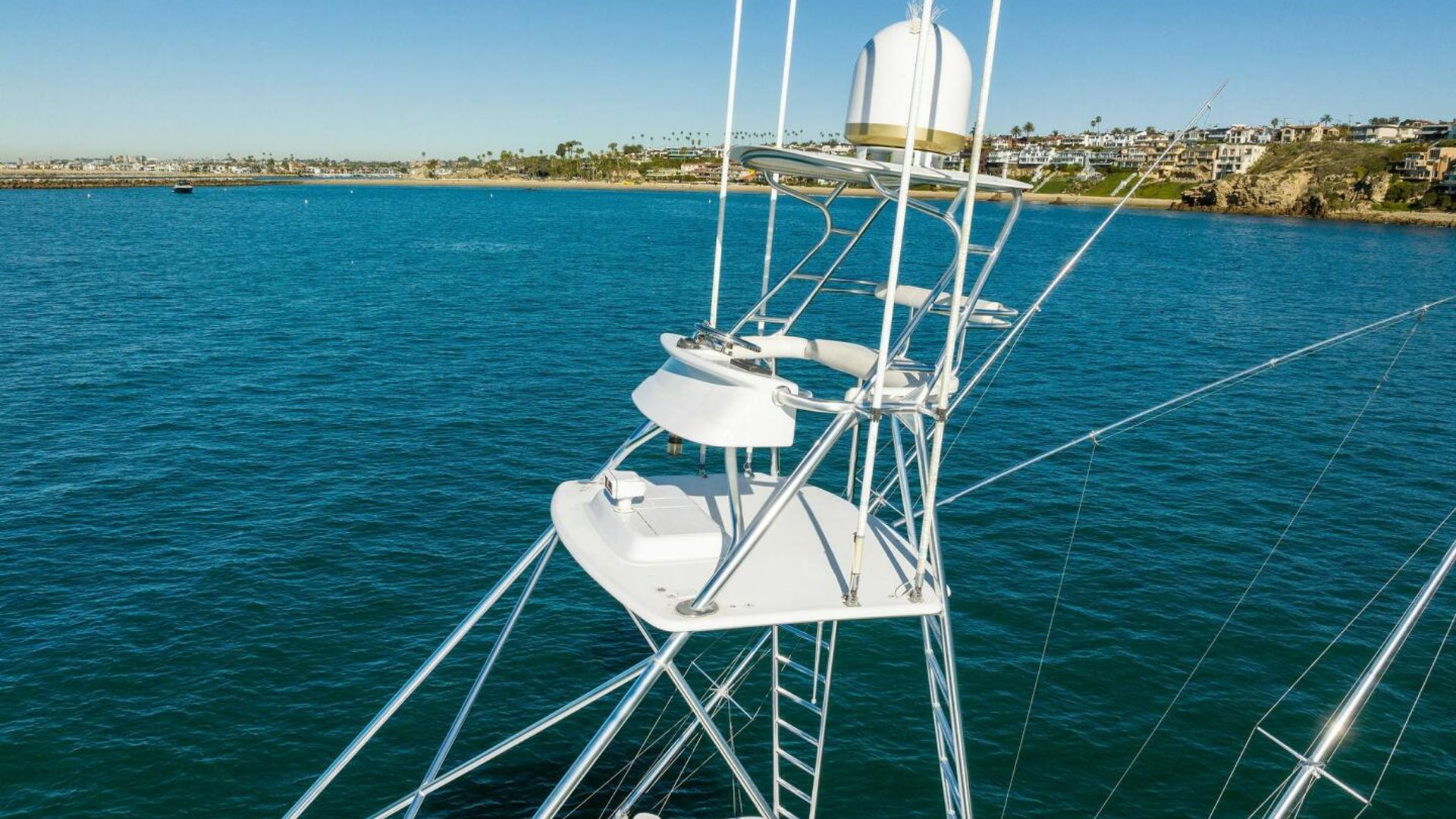 The cockpit is a full 164 square feet, loaded with features and conveniences to enhance the fishing experience. The raised mezzanine provides comfortable cushioned seating for viewing and tucked neatly under the mezzanine is an expansive freezer, stainless steel tackle drawers and additional storage boxes. Twin in deck fish boxes provides additional storage. Shorecord connections, quick disconnect salt and freshwater washdown outlets, are all hidden behind doors with no exposed hardware while the scuppers drain discretely through the quarter fenders. In addition, beneath the step you'll find a refrigerated drink box and wet storage compartments. Teak cockpit sole, cover and coaming boards accent the boat and inside the cockpit is a teak custom wood table and a custom ladder to bridge with six wide teak treads for easy access. in addition, you'll find a customized teak table with cup holders and cover positioned aft of the mezzanine seating. A custom fore and aft ladder, allows you to easily access the flybridge.
