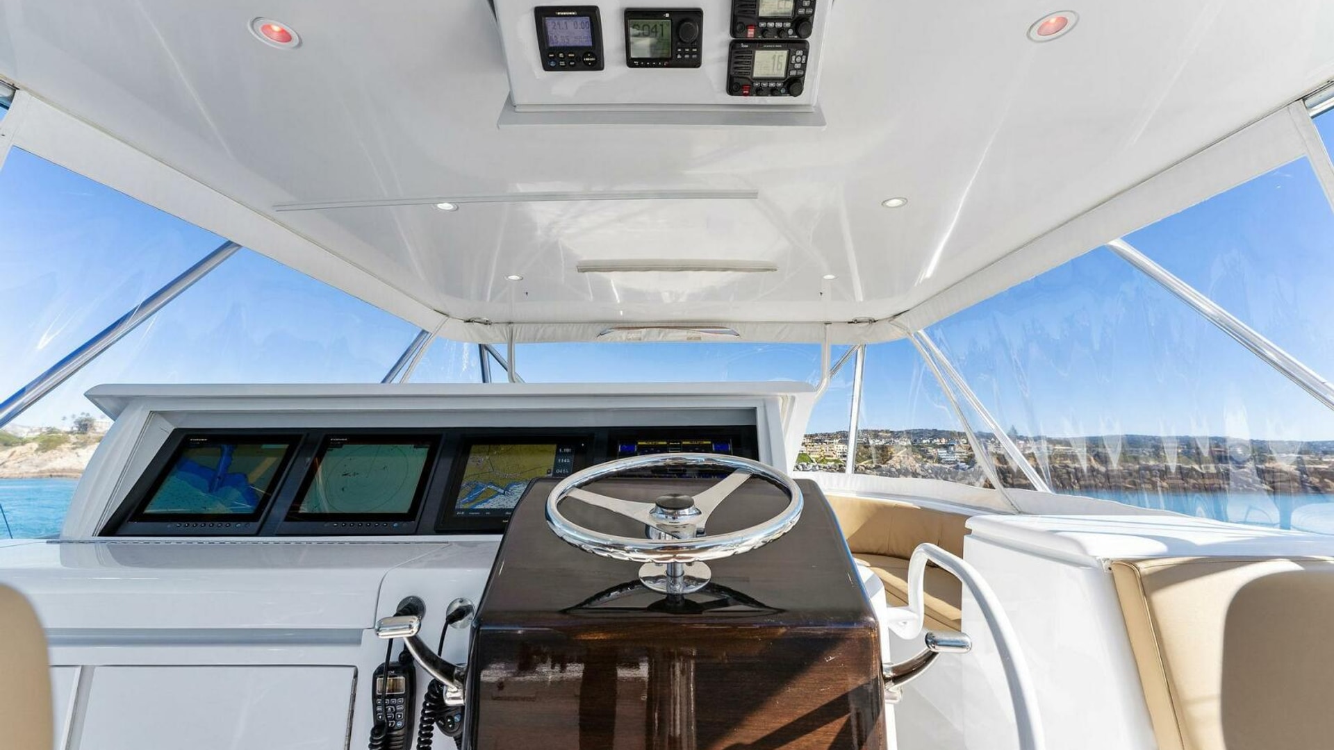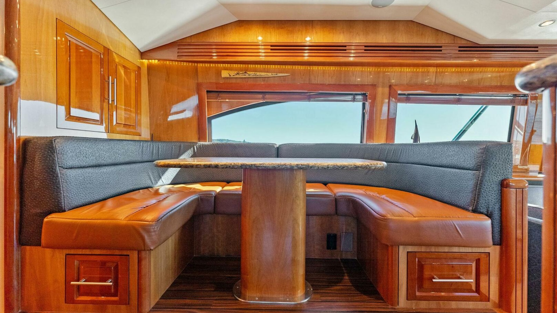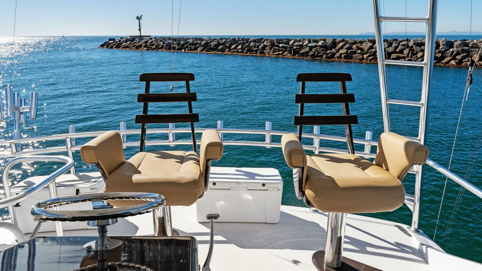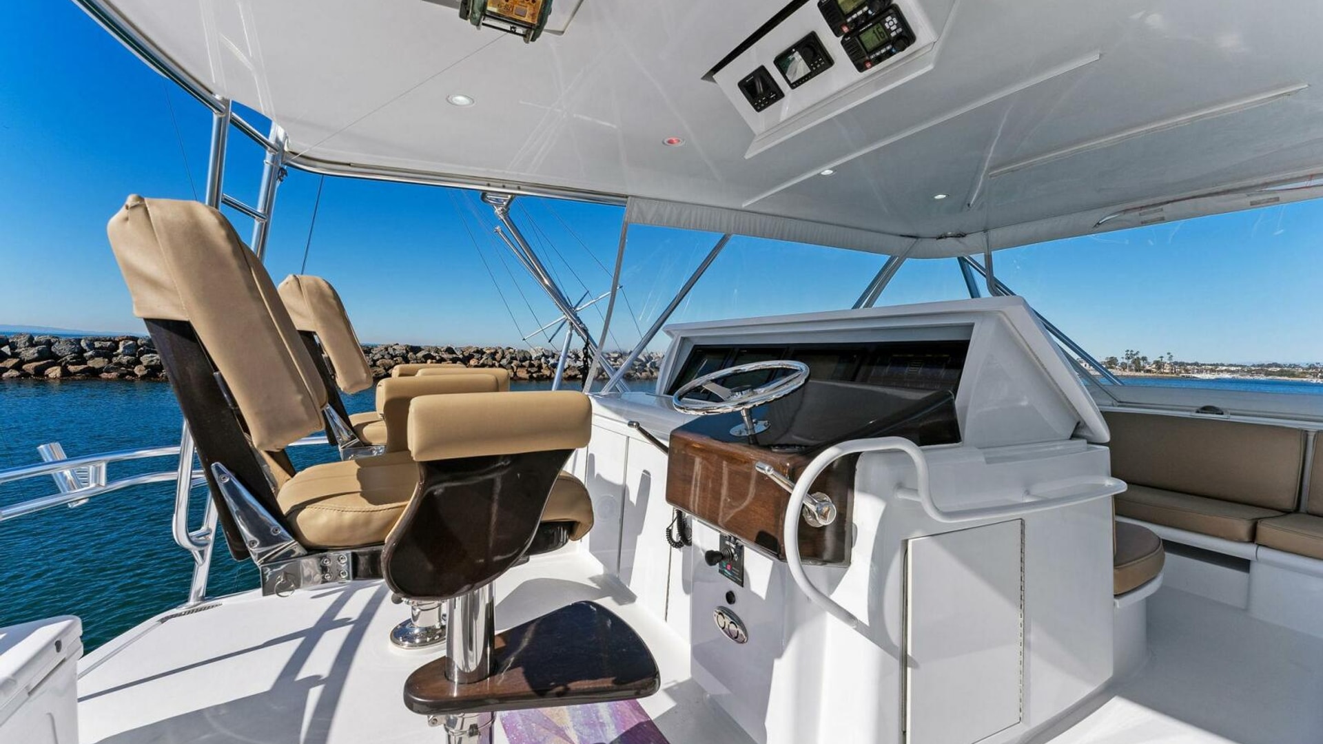 The cockpit is a full 164 square feet, loaded with features and conveniences to enhance the fishing experience. The raised mezzanine provides comfortable cushioned seating for viewing and tucked neatly under the mezzanine is an expansive freezer, stainless steel tackle drawers and additional storage boxes. Twin in deck fish boxes provides additional storage. Shorecord connections, quick disconnect salt and freshwater washdown outlets, are all hidden behind doors with no exposed hardware while the scuppers drain discretely through the quarter fenders. In addition, beneath the step you'll find a refrigerated drink box and wet storage compartments. Teak cockpit sole, cover and coaming boards accent the boat and inside the cockpit is a teak custom wood table and a custom ladder to bridge with six wide teak treads for easy access. in addition, you'll find a customized teak table with cup holders and cover positioned aft of the mezzanine seating. A custom fore and aft ladder, allows you to easily access the flybridge.