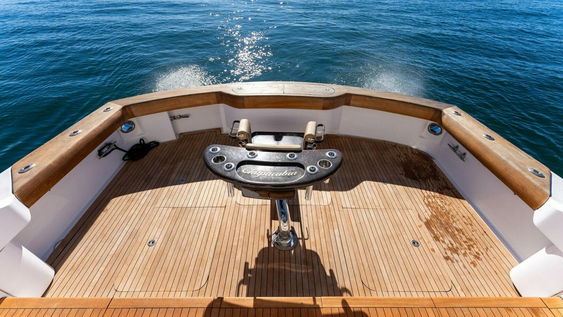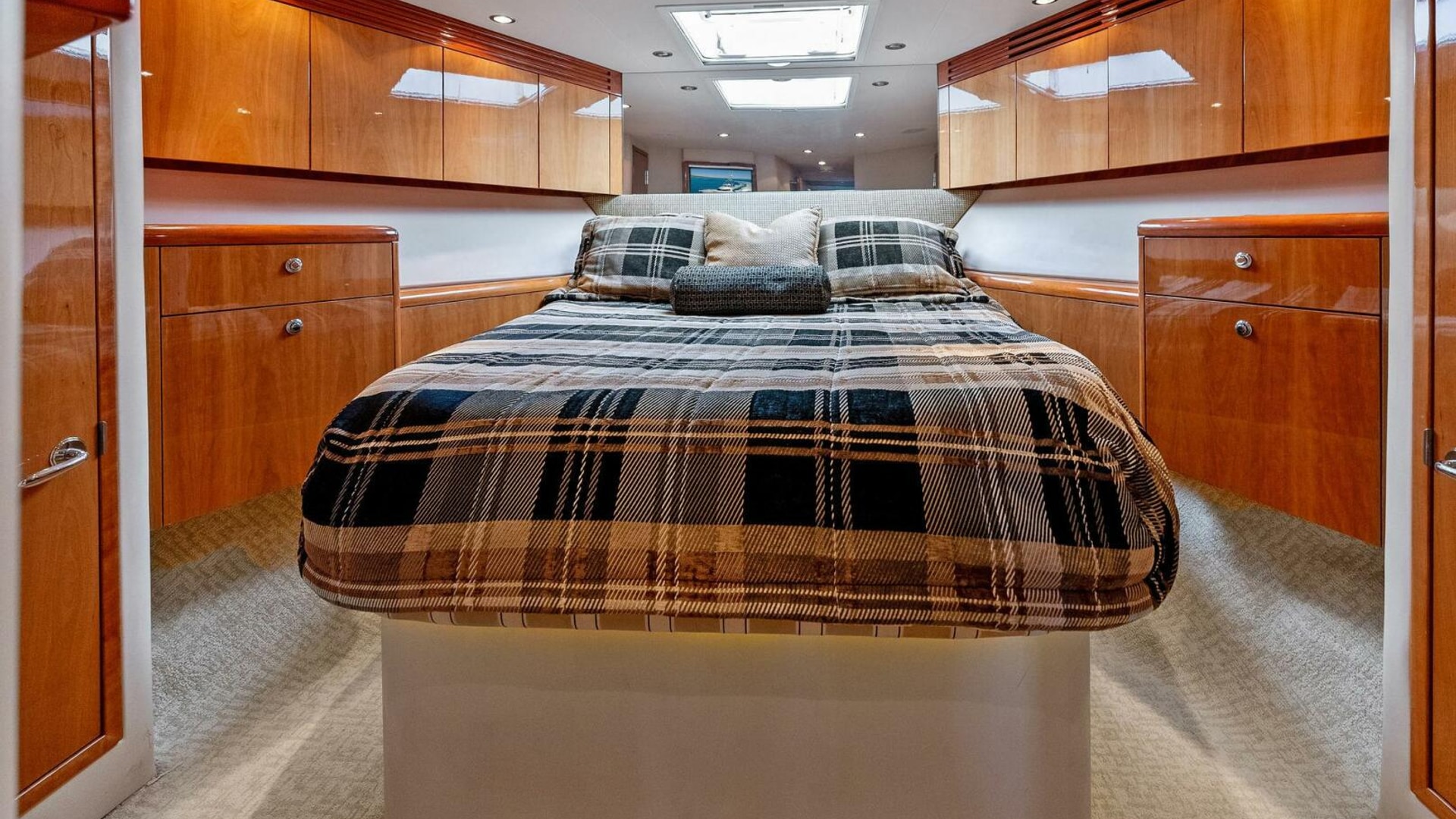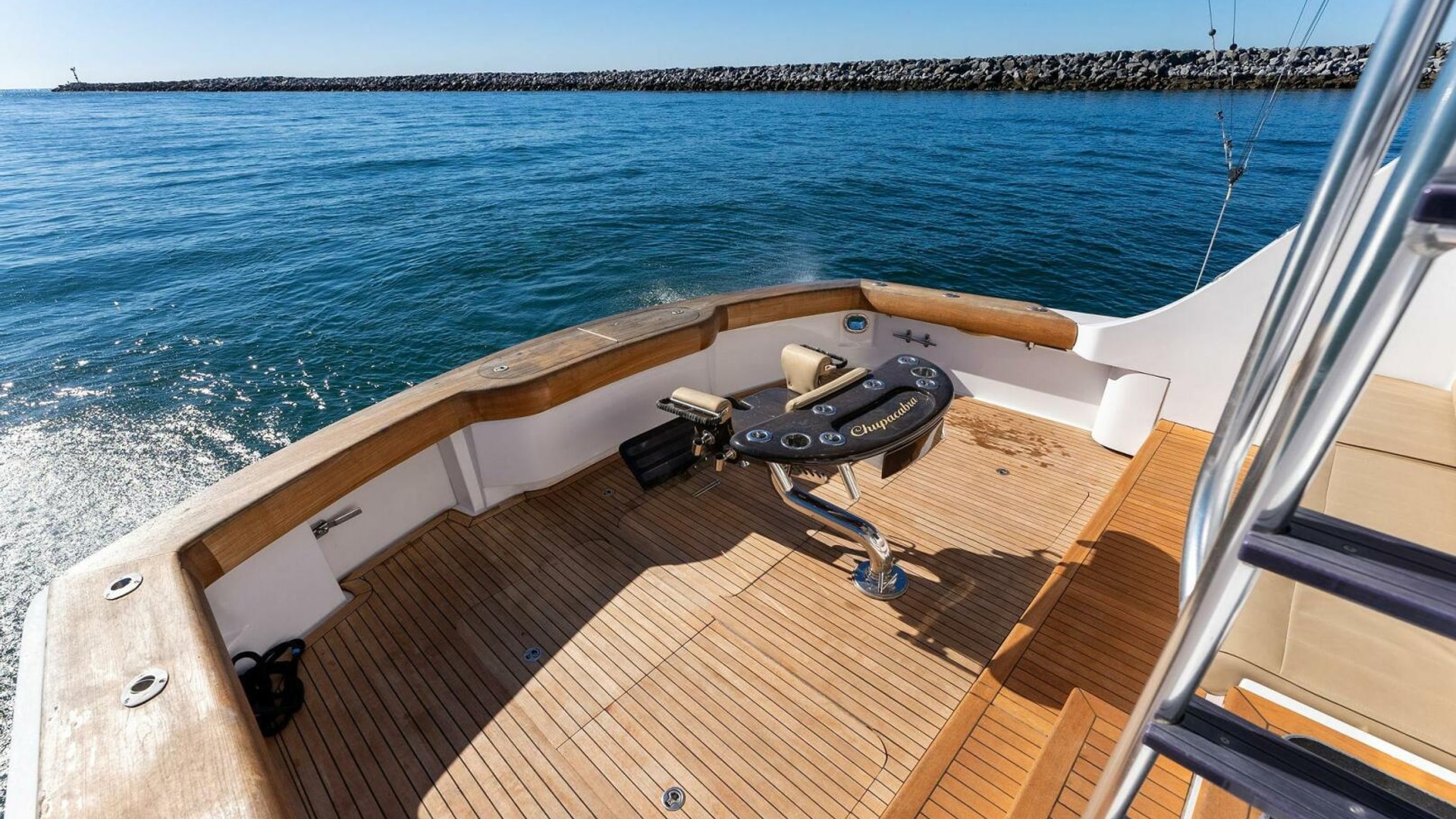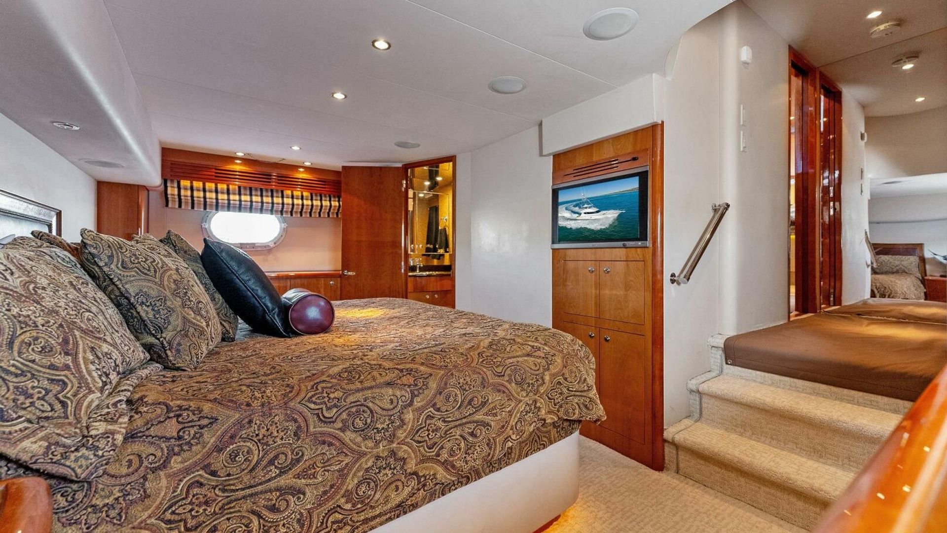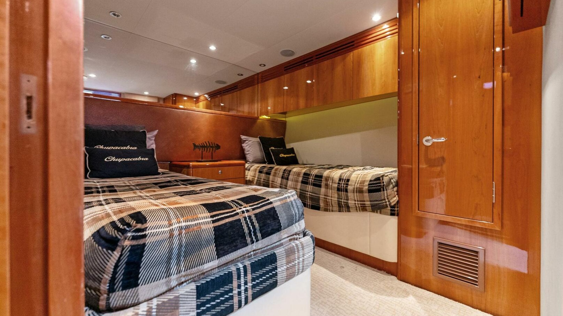 The "CHUPACABRA" has a very comfortable layout and features a 19' 6" beam and provides generous accommodations and unsurpassed for luxurious comfort. This 64’s 3/3 arrangement consists of three staterooms and three heads, with the only full beam master stateroom in its size range. Throughout, the emphasis is on spacious and luxurious accommodations ideal for relaxation or entertaining. With more than 150 square feet of area the salon exudes the warmth of genuine American black cherry paneling, pre-filled and finished in high gloss. To port, a custom U shaped sofa provides ample storage underneath. To starboard, a 42 inch plasma TV with surround sound can fill the salon with entertainment. Linear valences distribute cooled air evenly throughout salon and galley, without the hot and cold spots associated with overhead vents. One step up from the salon, the 64's galley features solid surface granite countertops, under counter refrigeration including freezer, a four burner ceramic cook top, and garbage disposal and microwave convection oven. Opposite is a large dinette with granite tabletop. Down below, the full beam configuration of the master suite is more than just best in class. It offers an unparalleled 166 square feet of floor space virtually identical to that of the 68 Convertible! Accessed through a private foyer flanked by a full 92 inch hanging locker, the master suite has more than enough room for a king sized berth, twin nightstands, and dressers port and starboard plus a 20 inch LCD TV. Two oversized port lights admit light and provide a water level view to either side. At 74 square feet, the bow stateroom on the 64 Convertible is virtually identical to its counterpart on the 68. It has a queen sized berth with storage underneath. Two cedar lined hanging lockers are included along with ample drawer and cabinet space along the hull sides. The port stateroom is fitted with twin berths, along with a hanging locker, hull side storage and nightstand. The wide beam creates a generously sized flybridge with ample space for all your guests. Equipped with electronics in a pop up console, a tuna tower, 3-sided enclosure, freezer and plenty of storage and seating, the flybridge is the place to be while running. The cockpit, spacious in its own right, is rigged for the serious angler. The mezzanine offers plenty of storage and seating, freezer, 4 drawer tackle station, modular storage and refrigeration. The cockpit has an ice chipper, fish boxes, and livewell.