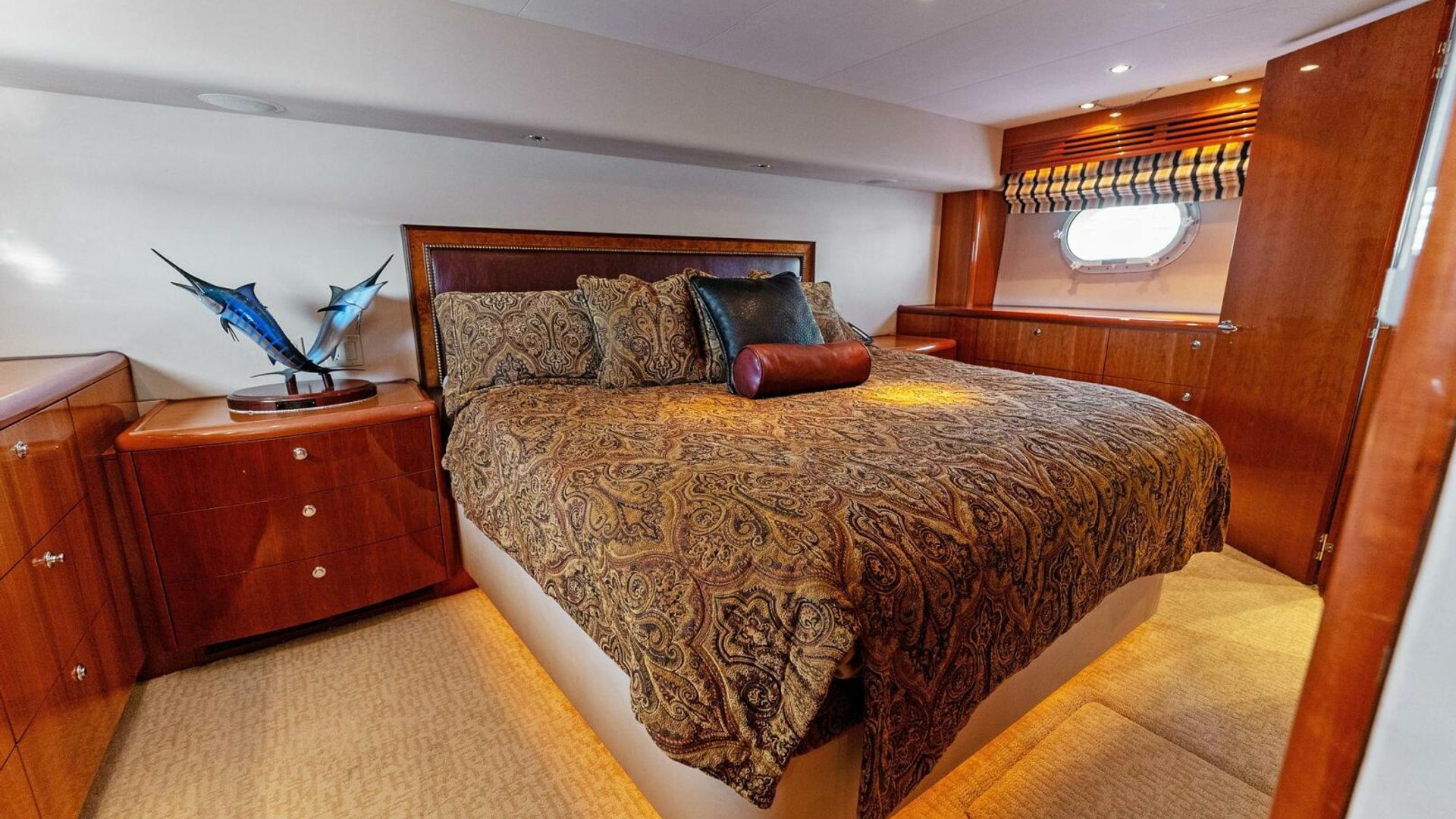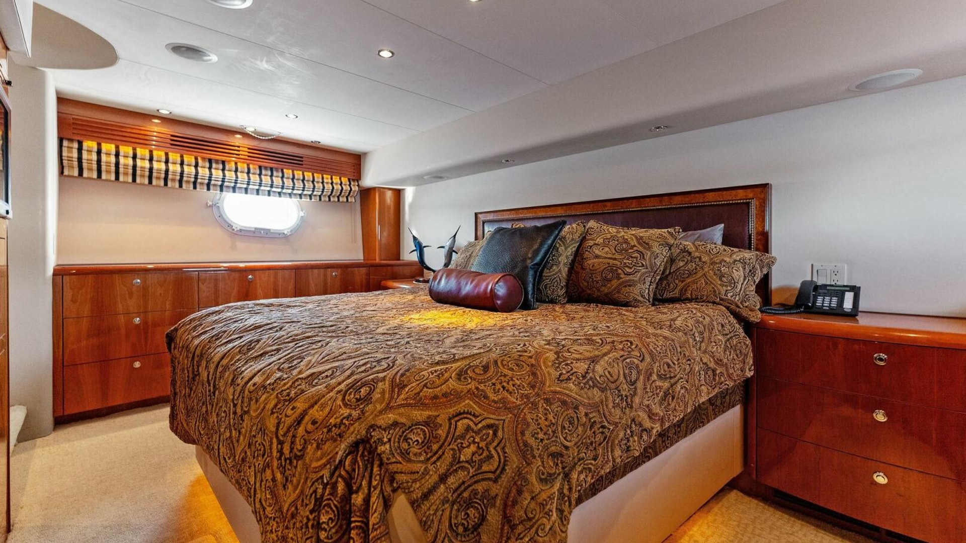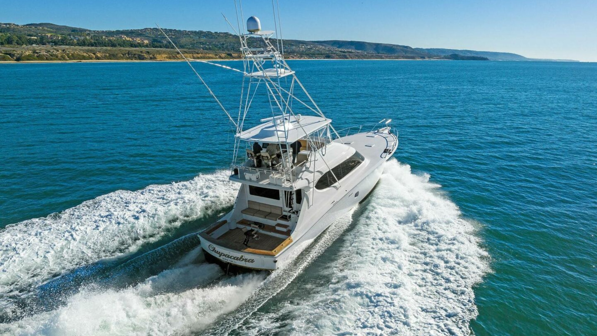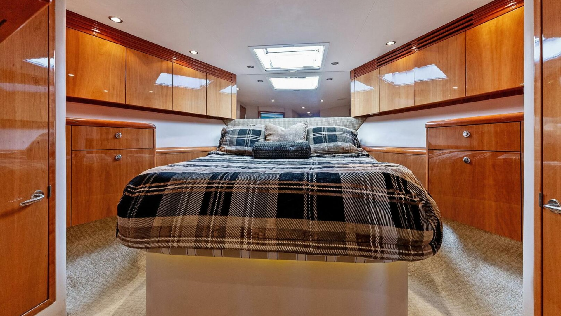 The "CHUPACABRA" has a very comfortable layout and features a 19' 6" beam and provides generous accommodations and unsurpassed for luxurious comfort. This 64’s 3/3 arrangement consists of three staterooms and three heads, with the only full beam master stateroom in its size range. Throughout, the emphasis is on spacious and luxurious accommodations ideal for relaxation or entertaining. With more than 150 square feet of area the salon exudes the warmth of genuine American black cherry paneling, pre-filled and finished in high gloss. To port, a custom U shaped sofa provides ample storage underneath. To starboard, a 42 inch plasma TV with surround sound can fill the salon with entertainment. Linear valences distribute cooled air evenly throughout salon and galley, without the hot and cold spots associated with overhead vents. One step up from the salon, the 64's galley features solid surface granite countertops, under counter refrigeration including freezer, a four burner ceramic cook top, and garbage disposal and microwave convection oven. Opposite is a large dinette with granite tabletop. Down below, the full beam configuration of the master suite is more than just best in class. It offers an unparalleled 166 square feet of floor space virtually identical to that of the 68 Convertible! Accessed through a private foyer flanked by a full 92 inch hanging locker, the master suite has more than enough room for a king sized berth, twin nightstands, and dressers port and starboard plus a 20 inch LCD TV. Two oversized port lights admit light and provide a water level view to either side. At 74 square feet, the bow stateroom on the 64 Convertible is virtually identical to its counterpart on the 68. It has a queen sized berth with storage underneath. Two cedar lined hanging lockers are included along with ample drawer and cabinet space along the hull sides. The port stateroom is fitted with twin berths, along with a hanging locker, hull side storage and nightstand. The wide beam creates a generously sized flybridge with ample space for all your guests. Equipped with electronics in a pop up console, a tuna tower, 3-sided enclosure, freezer and plenty of storage and seating, the flybridge is the place to be while running. The cockpit, spacious in its own right, is rigged for the serious angler. The mezzanine offers plenty of storage and seating, freezer, 4 drawer tackle station, modular storage and refrigeration. The cockpit has an ice chipper, fish boxes, and livewell.