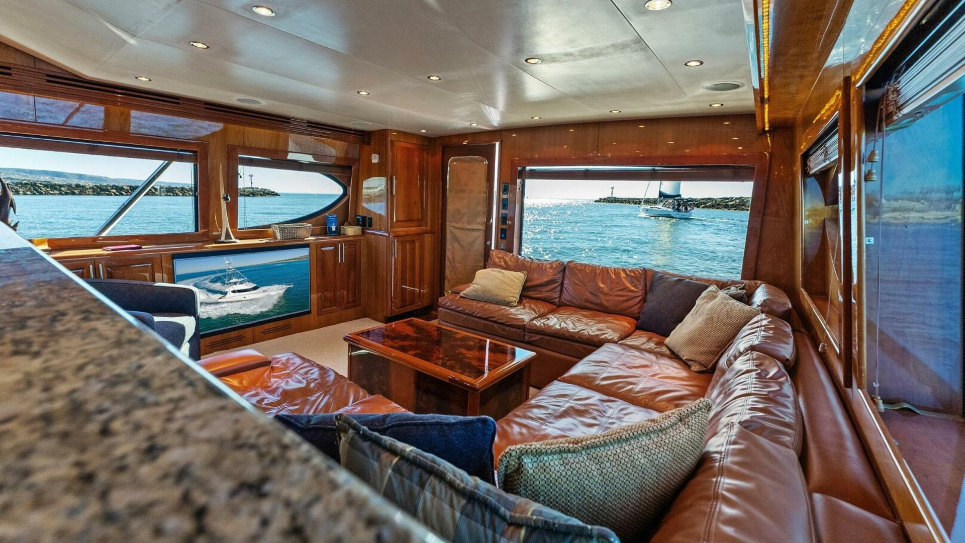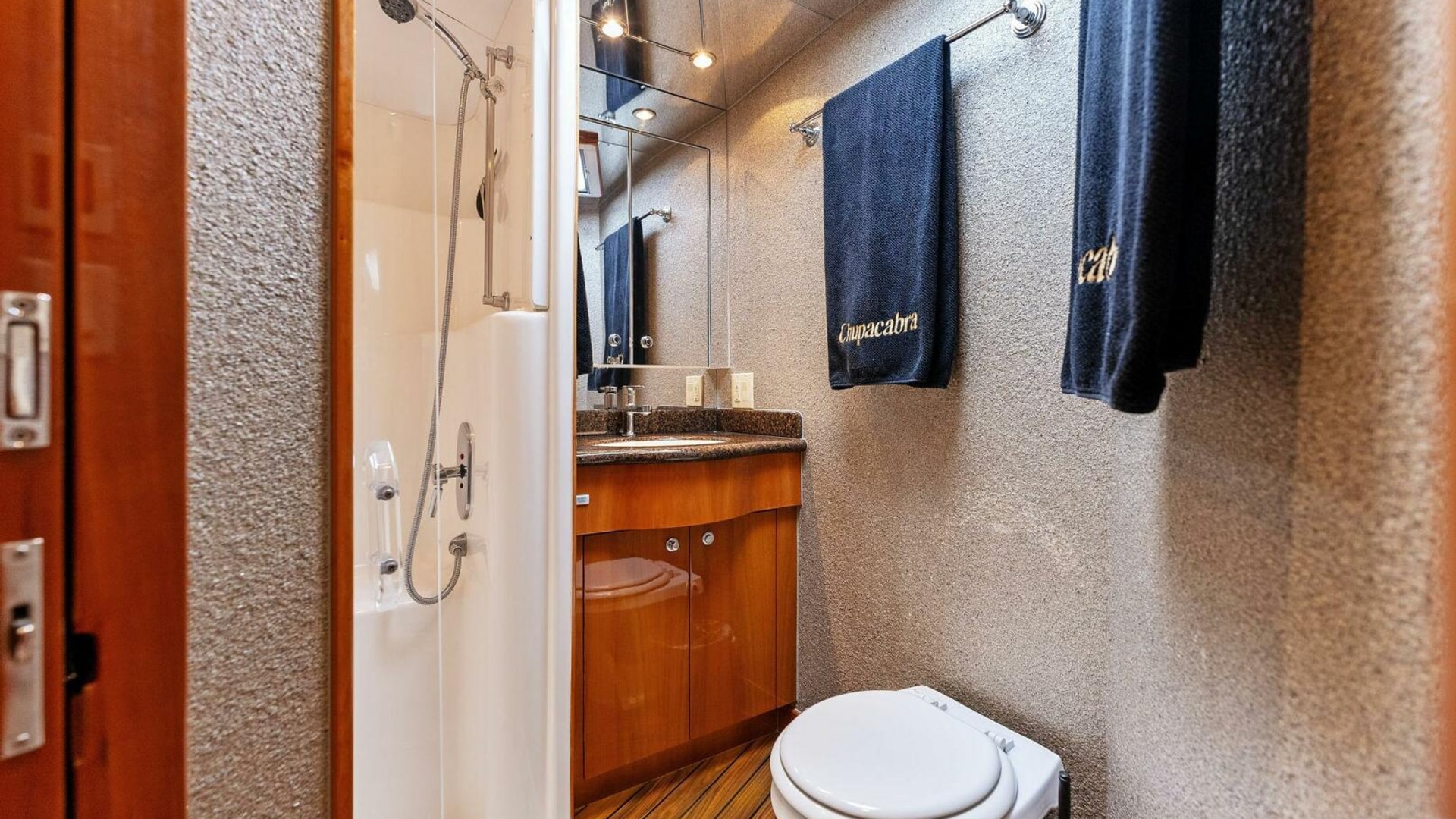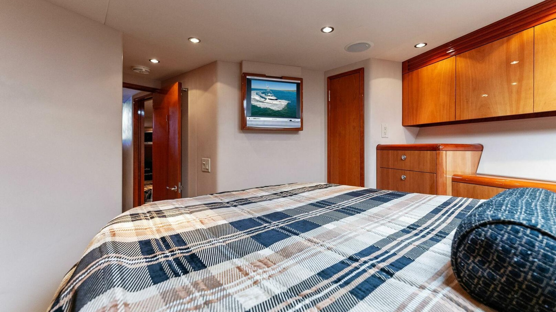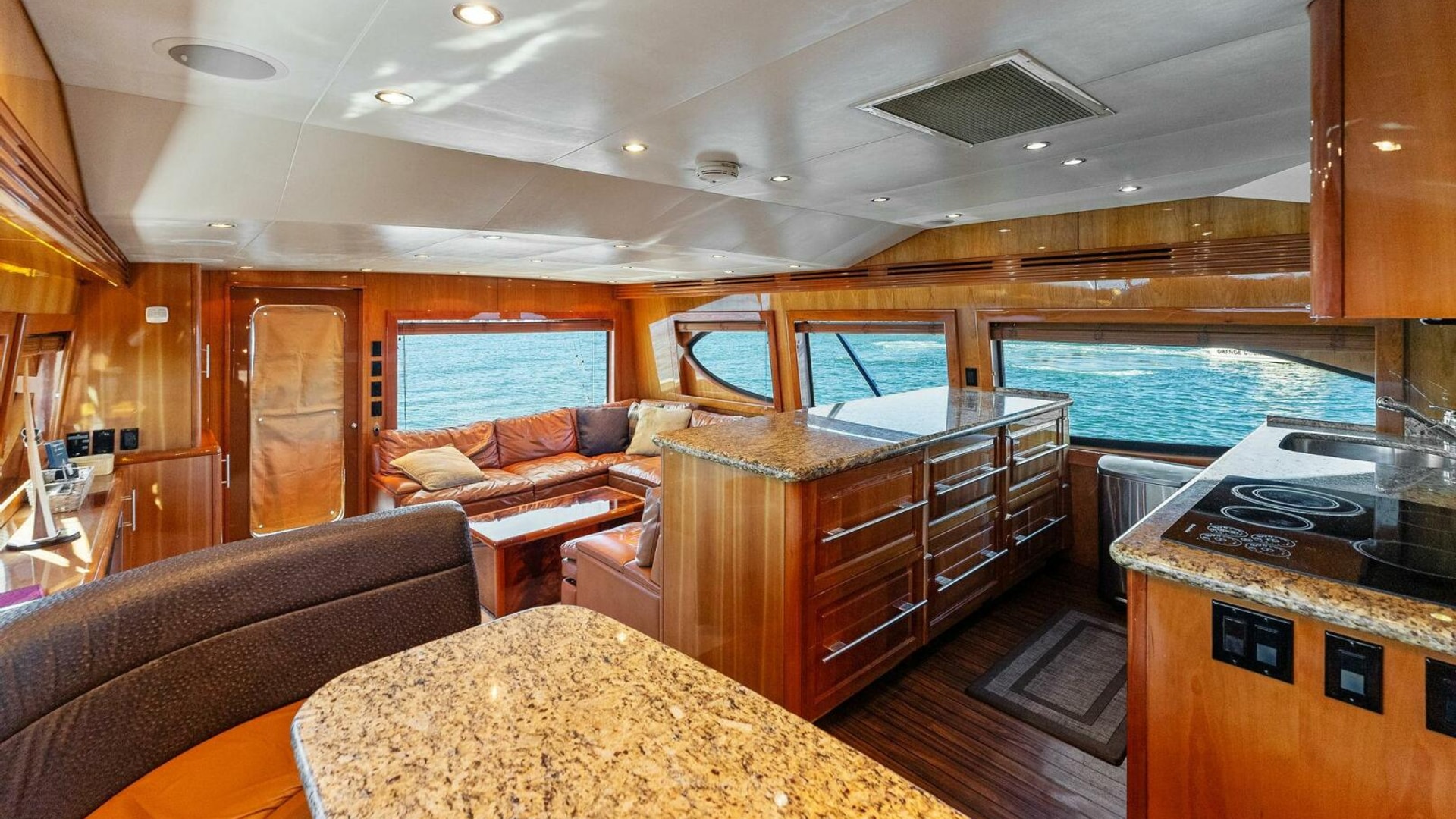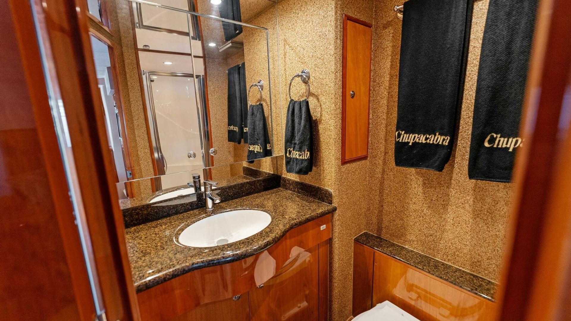 The "CHUPACABRA" has a very comfortable layout and features a 19' 6" beam and provides generous accommodations and unsurpassed for luxurious comfort. This 64’s 3/3 arrangement consists of three staterooms and three heads, with the only full beam master stateroom in its size range. Throughout, the emphasis is on spacious and luxurious accommodations ideal for relaxation or entertaining. With more than 150 square feet of area the salon exudes the warmth of genuine American black cherry paneling, pre-filled and finished in high gloss. To port, a custom U shaped sofa provides ample storage underneath. To starboard, a 42 inch plasma TV with surround sound can fill the salon with entertainment. Linear valences distribute cooled air evenly throughout salon and galley, without the hot and cold spots associated with overhead vents. One step up from the salon, the 64's galley features solid surface granite countertops, under counter refrigeration including freezer, a four burner ceramic cook top, and garbage disposal and microwave convection oven. Opposite is a large dinette with granite tabletop. Down below, the full beam configuration of the master suite is more than just best in class. It offers an unparalleled 166 square feet of floor space virtually identical to that of the 68 Convertible! Accessed through a private foyer flanked by a full 92 inch hanging locker, the master suite has more than enough room for a king sized berth, twin nightstands, and dressers port and starboard plus a 20 inch LCD TV. Two oversized port lights admit light and provide a water level view to either side. At 74 square feet, the bow stateroom on the 64 Convertible is virtually identical to its counterpart on the 68. It has a queen sized berth with storage underneath. Two cedar lined hanging lockers are included along with ample drawer and cabinet space along the hull sides. The port stateroom is fitted with twin berths, along with a hanging locker, hull side storage and nightstand. The wide beam creates a generously sized flybridge with ample space for all your guests. Equipped with electronics in a pop up console, a tuna tower, 3-sided enclosure, freezer and plenty of storage and seating, the flybridge is the place to be while running. The cockpit, spacious in its own right, is rigged for the serious angler. The mezzanine offers plenty of storage and seating, freezer, 4 drawer tackle station, modular storage and refrigeration. The cockpit has an ice chipper, fish boxes, and livewell.