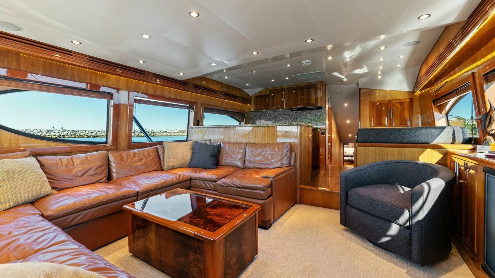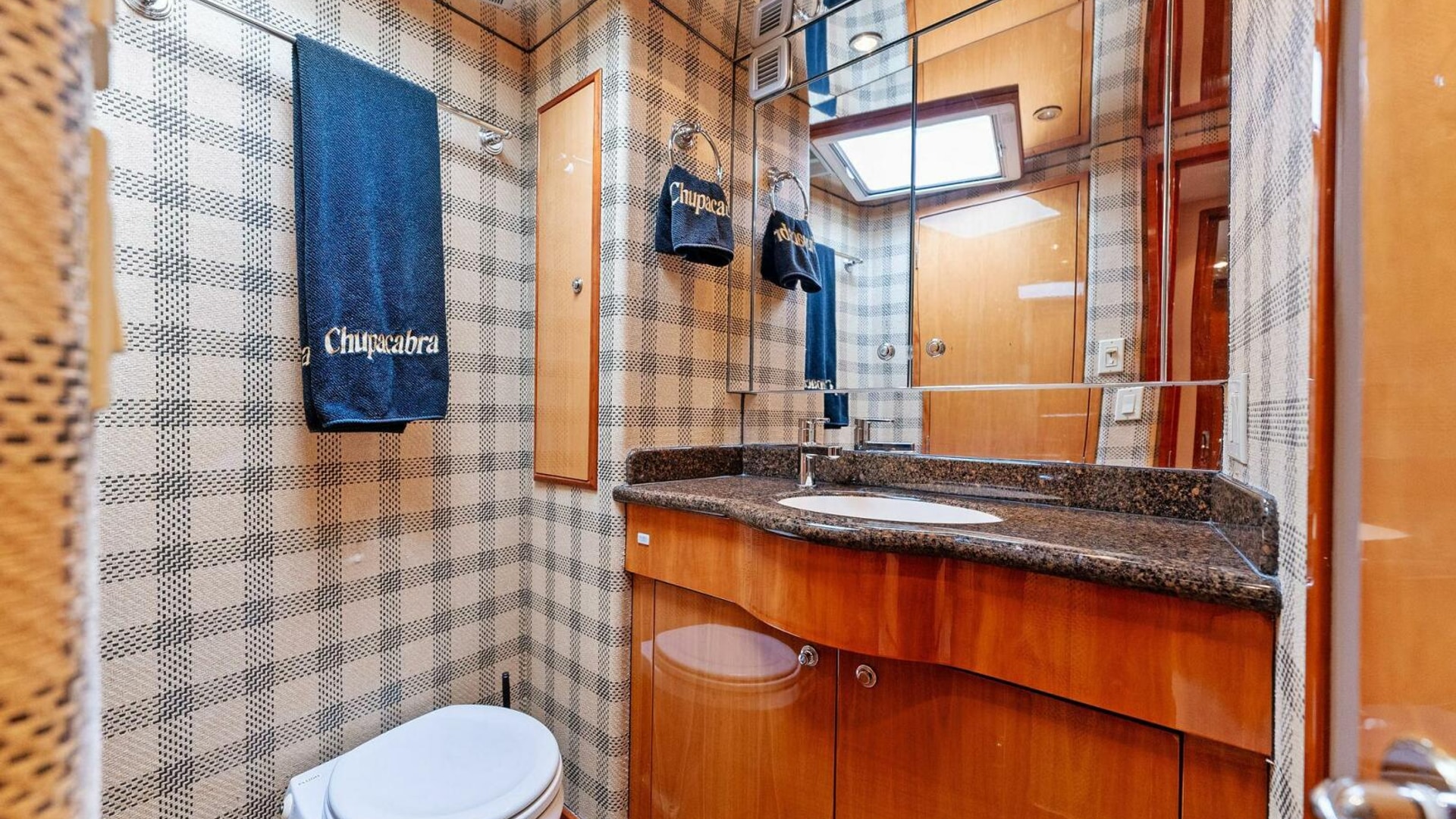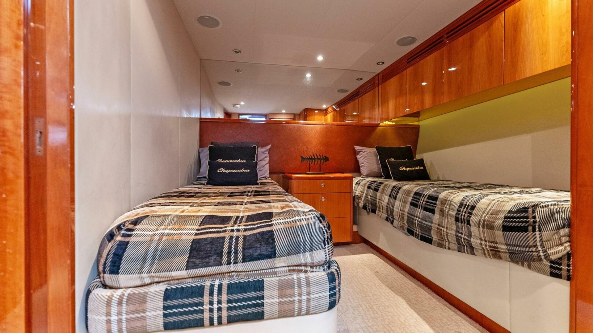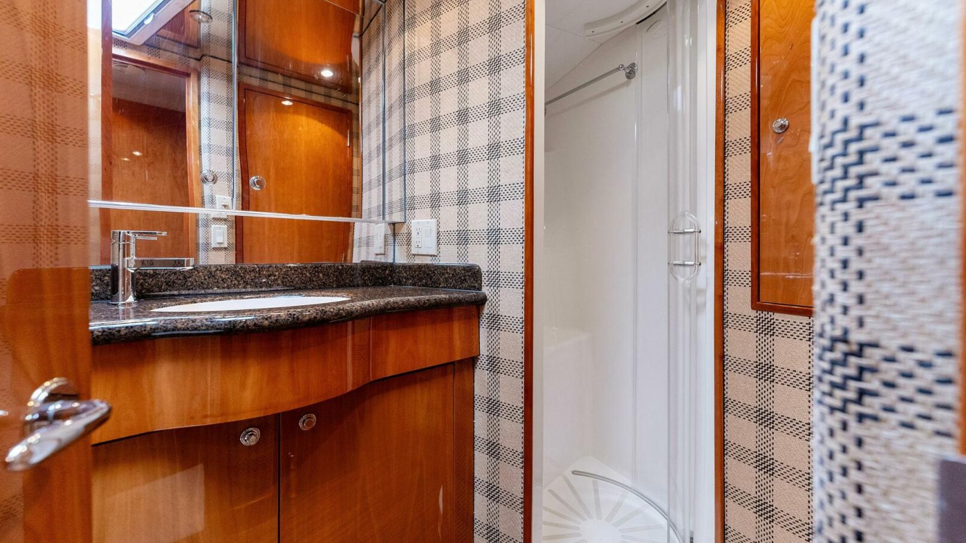 The "CHUPACABRA" has a very comfortable layout and features a 19' 6" beam and provides generous accommodations and unsurpassed for luxurious comfort. This 64’s 3/3 arrangement consists of three staterooms and three heads, with the only full beam master stateroom in its size range. Throughout, the emphasis is on spacious and luxurious accommodations ideal for relaxation or entertaining. With more than 150 square feet of area the salon exudes the warmth of genuine American black cherry paneling, pre-filled and finished in high gloss. To port, a custom U shaped sofa provides ample storage underneath. To starboard, a 42 inch plasma TV with surround sound can fill the salon with entertainment. Linear valences distribute cooled air evenly throughout salon and galley, without the hot and cold spots associated with overhead vents. One step up from the salon, the 64's galley features solid surface granite countertops, under counter refrigeration including freezer, a four burner ceramic cook top, and garbage disposal and microwave convection oven. Opposite is a large dinette with granite tabletop. Down below, the full beam configuration of the master suite is more than just best in class. It offers an unparalleled 166 square feet of floor space virtually identical to that of the 68 Convertible! Accessed through a private foyer flanked by a full 92 inch hanging locker, the master suite has more than enough room for a king sized berth, twin nightstands, and dressers port and starboard plus a 20 inch LCD TV. Two oversized port lights admit light and provide a water level view to either side. At 74 square feet, the bow stateroom on the 64 Convertible is virtually identical to its counterpart on the 68. It has a queen sized berth with storage underneath. Two cedar lined hanging lockers are included along with ample drawer and cabinet space along the hull sides. The port stateroom is fitted with twin berths, along with a hanging locker, hull side storage and nightstand. The wide beam creates a generously sized flybridge with ample space for all your guests. Equipped with electronics in a pop up console, a tuna tower, 3-sided enclosure, freezer and plenty of storage and seating, the flybridge is the place to be while running. The cockpit, spacious in its own right, is rigged for the serious angler. The mezzanine offers plenty of storage and seating, freezer, 4 drawer tackle station, modular storage and refrigeration. The cockpit has an ice chipper, fish boxes, and livewell.