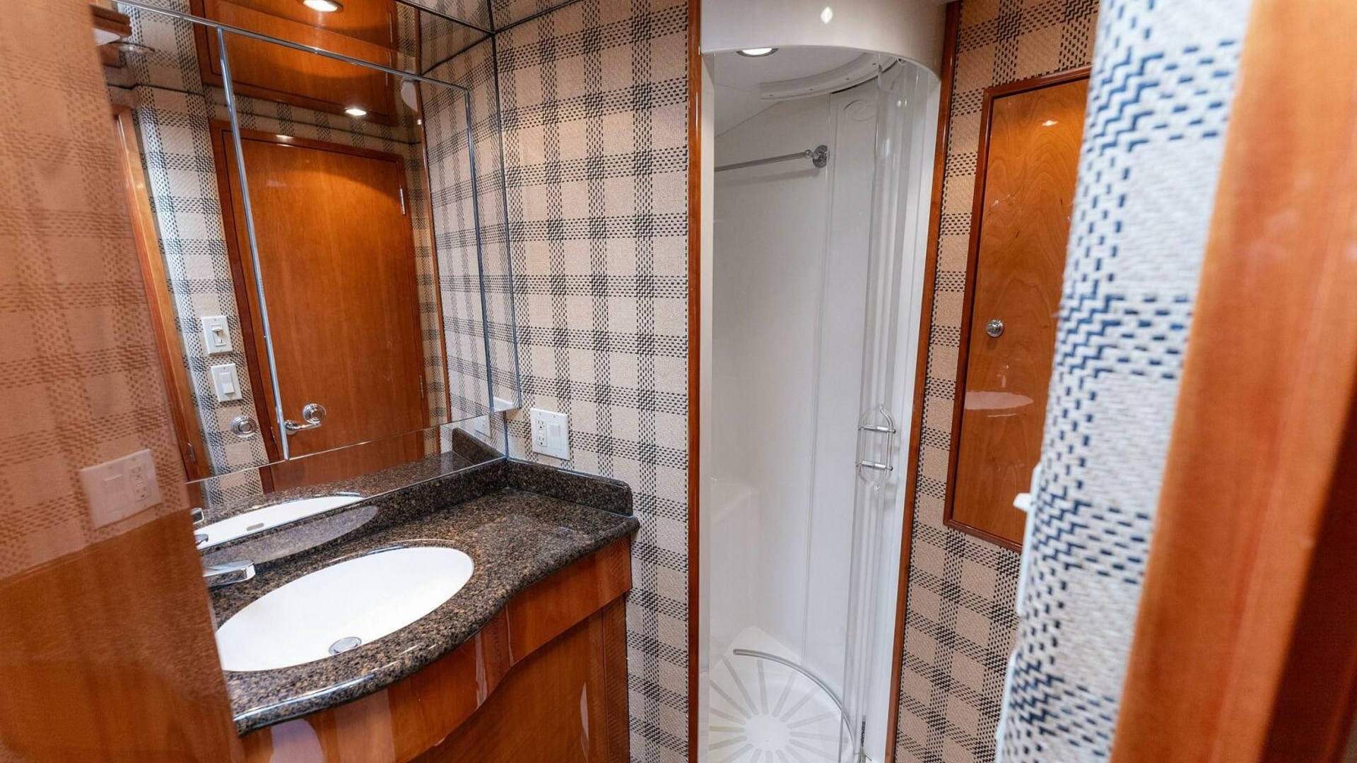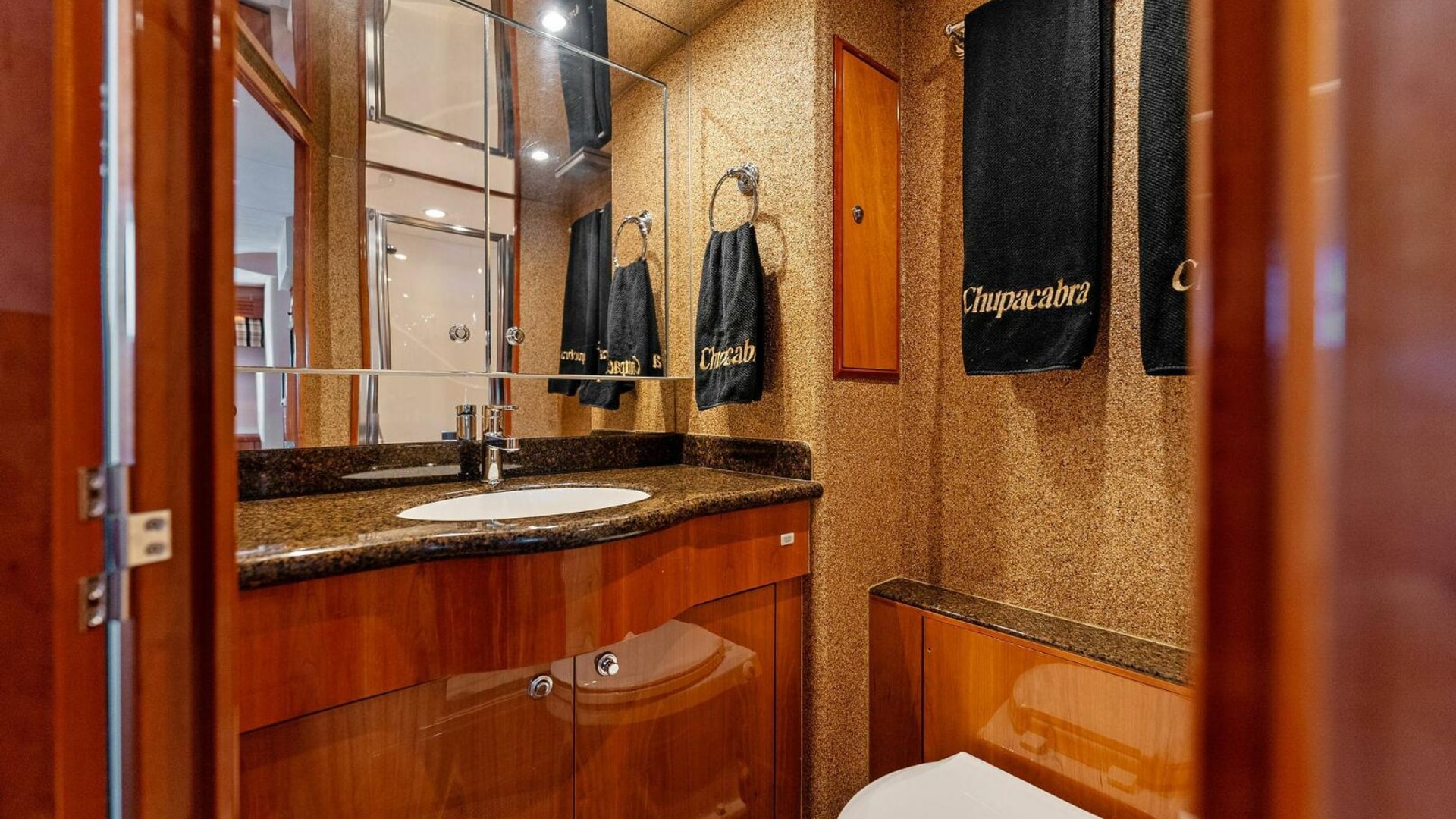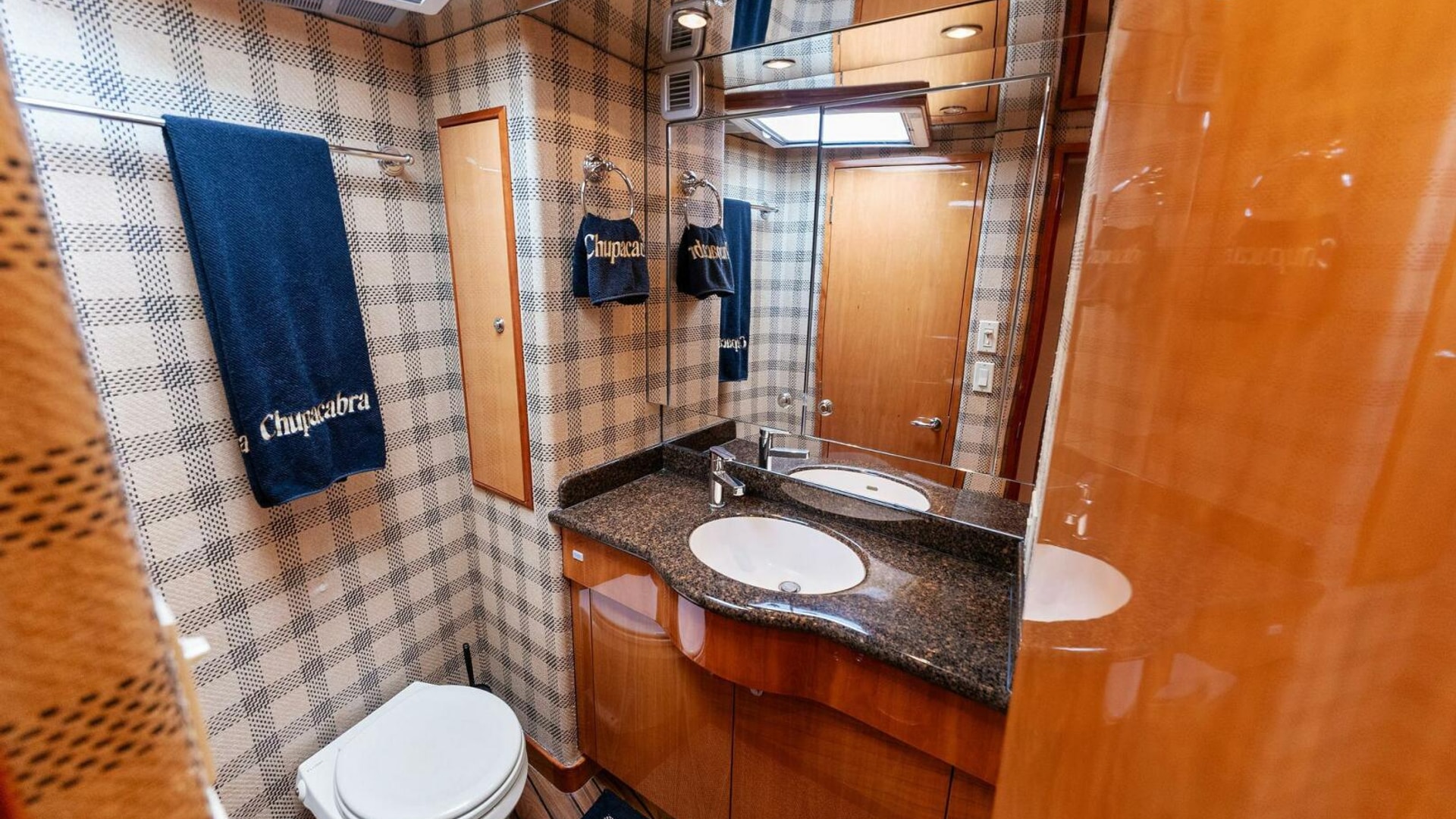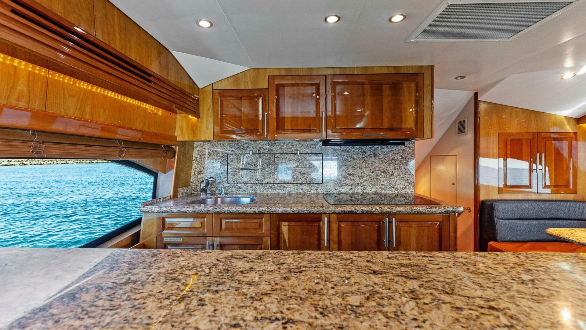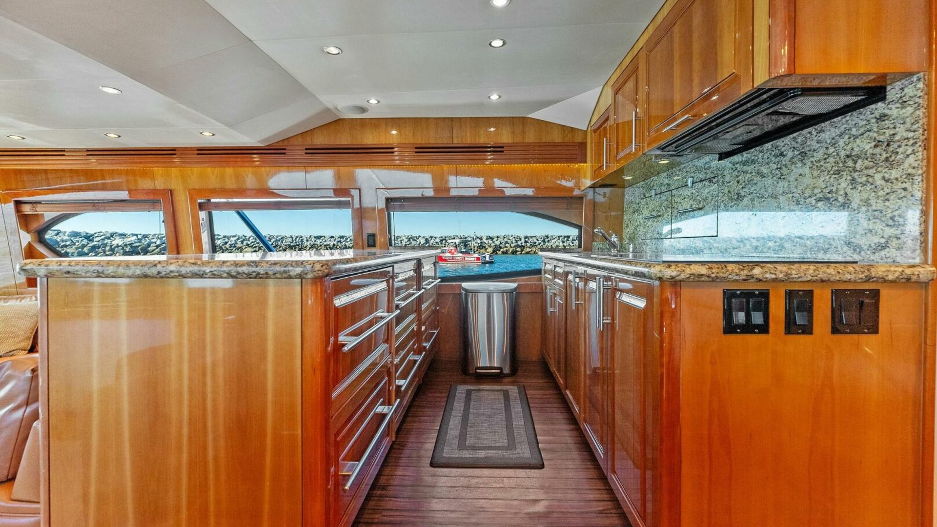 The "CHUPACABRA" has a very comfortable layout and features a 19' 6" beam and provides generous accommodations and unsurpassed for luxurious comfort. This 64’s 3/3 arrangement consists of three staterooms and three heads, with the only full beam master stateroom in its size range. Throughout, the emphasis is on spacious and luxurious accommodations ideal for relaxation or entertaining. With more than 150 square feet of area the salon exudes the warmth of genuine American black cherry paneling, pre-filled and finished in high gloss. To port, a custom U shaped sofa provides ample storage underneath. To starboard, a 42 inch plasma TV with surround sound can fill the salon with entertainment. Linear valences distribute cooled air evenly throughout salon and galley, without the hot and cold spots associated with overhead vents. One step up from the salon, the 64's galley features solid surface granite countertops, under counter refrigeration including freezer, a four burner ceramic cook top, and garbage disposal and microwave convection oven. Opposite is a large dinette with granite tabletop. Down below, the full beam configuration of the master suite is more than just best in class. It offers an unparalleled 166 square feet of floor space virtually identical to that of the 68 Convertible! Accessed through a private foyer flanked by a full 92 inch hanging locker, the master suite has more than enough room for a king sized berth, twin nightstands, and dressers port and starboard plus a 20 inch LCD TV. Two oversized port lights admit light and provide a water level view to either side. At 74 square feet, the bow stateroom on the 64 Convertible is virtually identical to its counterpart on the 68. It has a queen sized berth with storage underneath. Two cedar lined hanging lockers are included along with ample drawer and cabinet space along the hull sides. The port stateroom is fitted with twin berths, along with a hanging locker, hull side storage and nightstand. The wide beam creates a generously sized flybridge with ample space for all your guests. Equipped with electronics in a pop up console, a tuna tower, 3-sided enclosure, freezer and plenty of storage and seating, the flybridge is the place to be while running. The cockpit, spacious in its own right, is rigged for the serious angler. The mezzanine offers plenty of storage and seating, freezer, 4 drawer tackle station, modular storage and refrigeration. The cockpit has an ice chipper, fish boxes, and livewell.