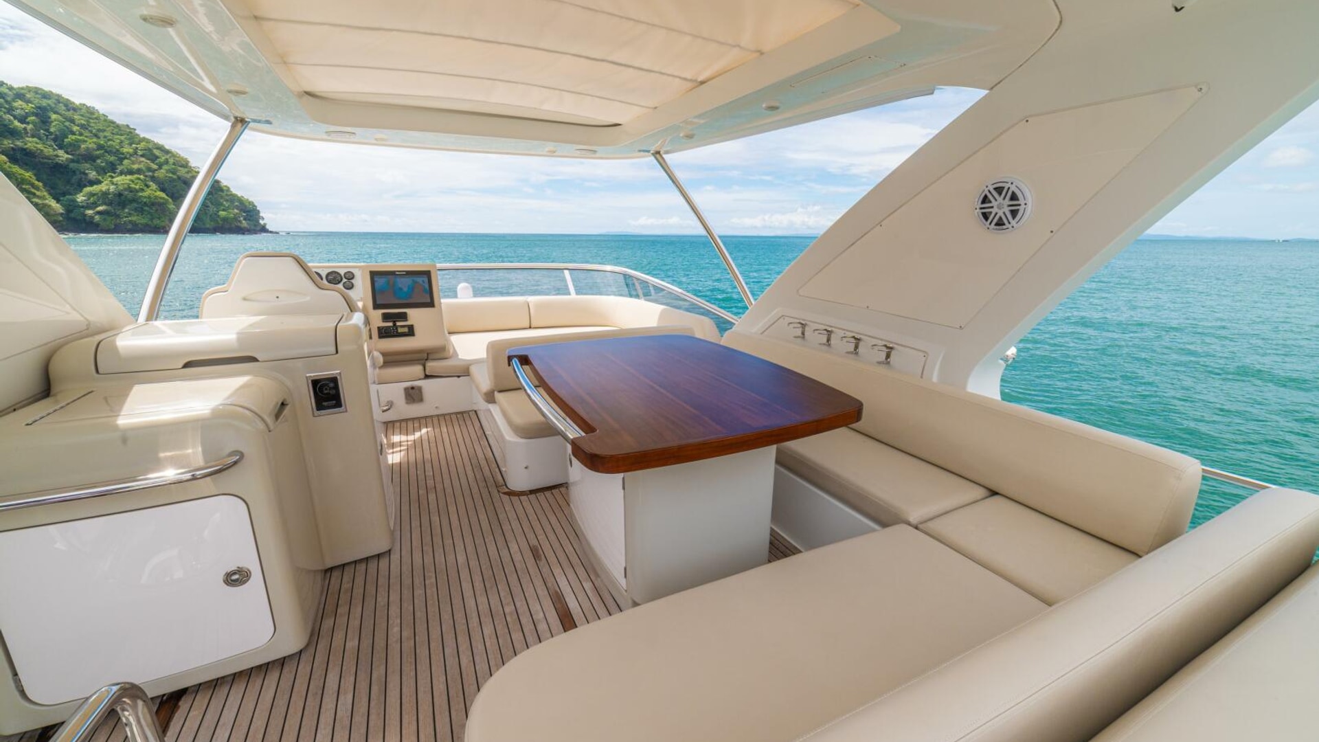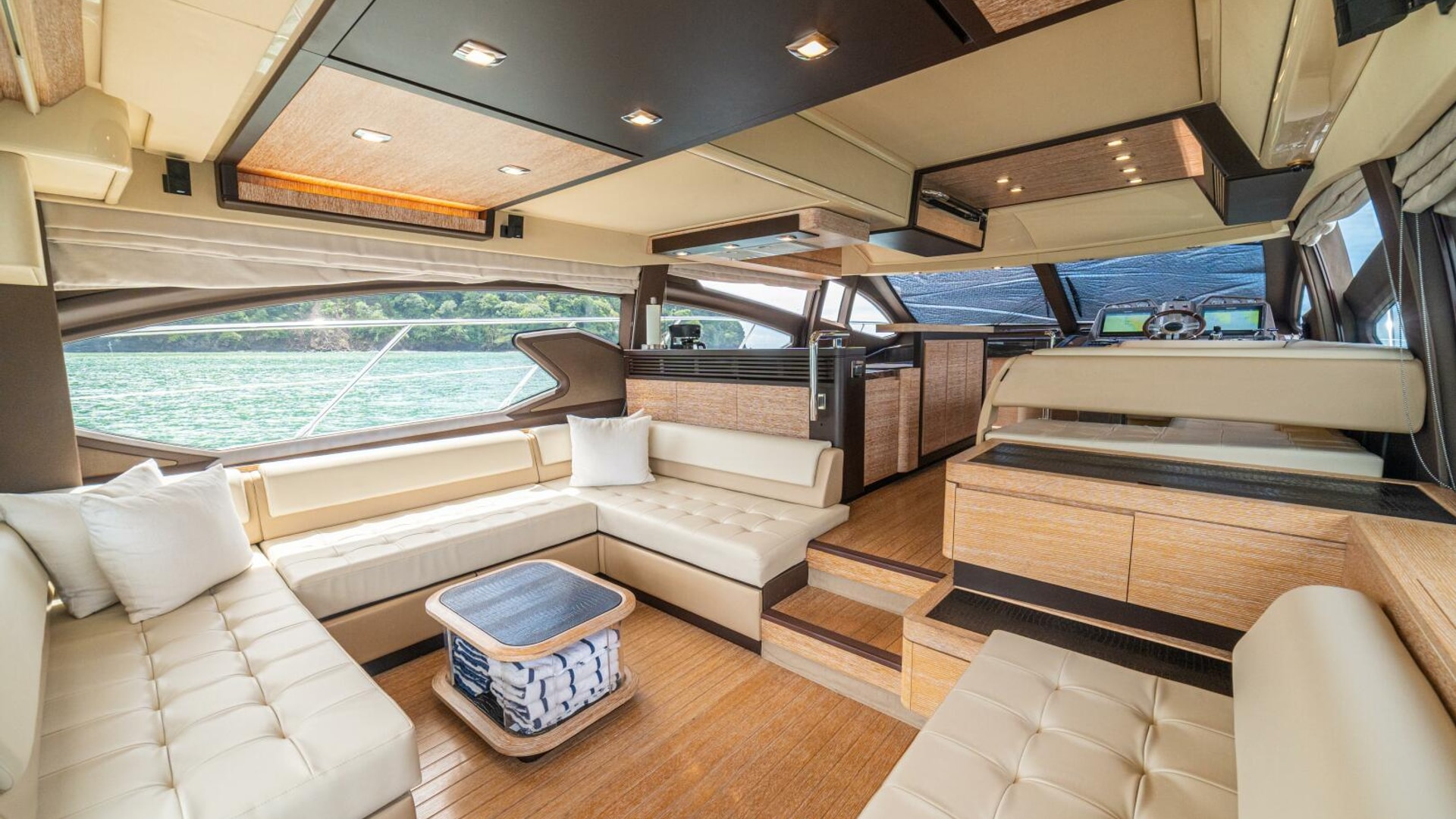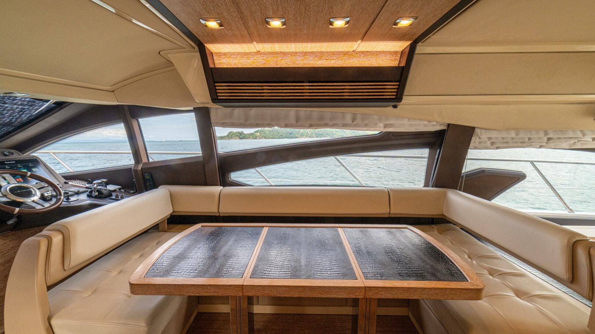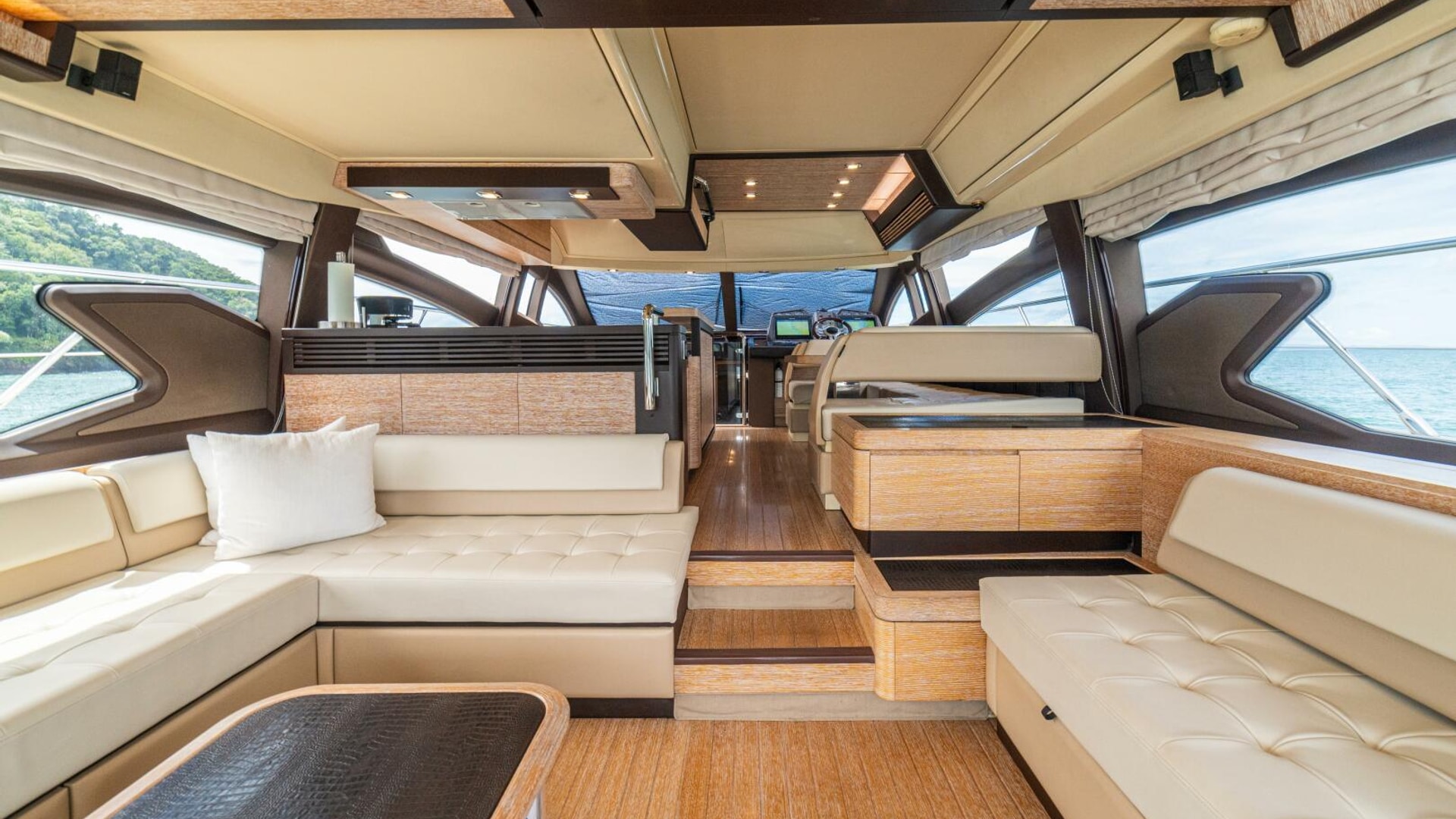 The cockpit area is spacious and well-appointed, featuring comfortable seating, quality finishes, and integrated entertainment and safety equipment. It provides ample space for relaxation, dining, and socializing, with easy access to the water and upper deck.