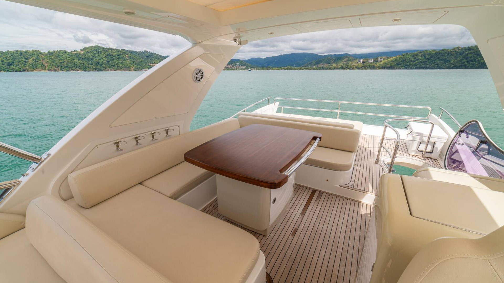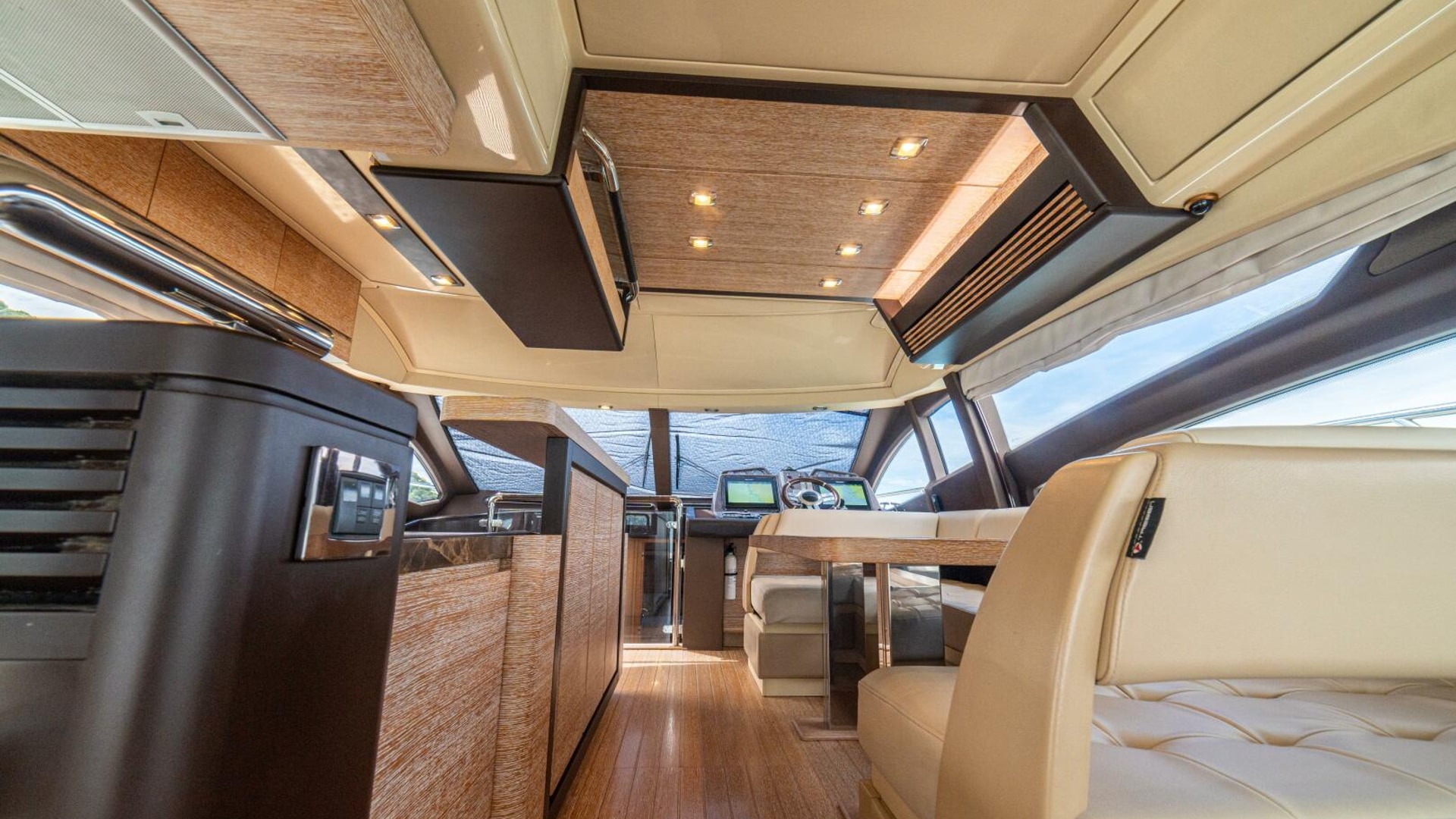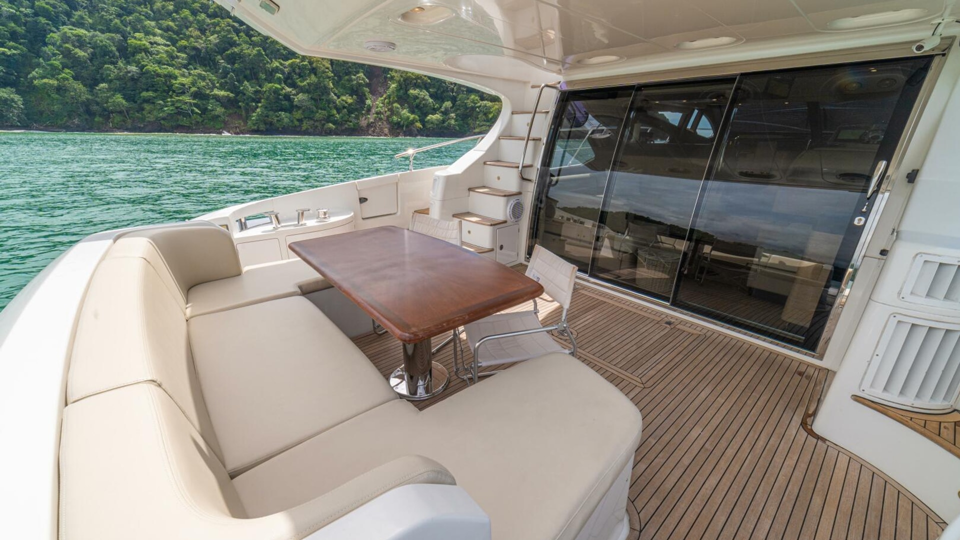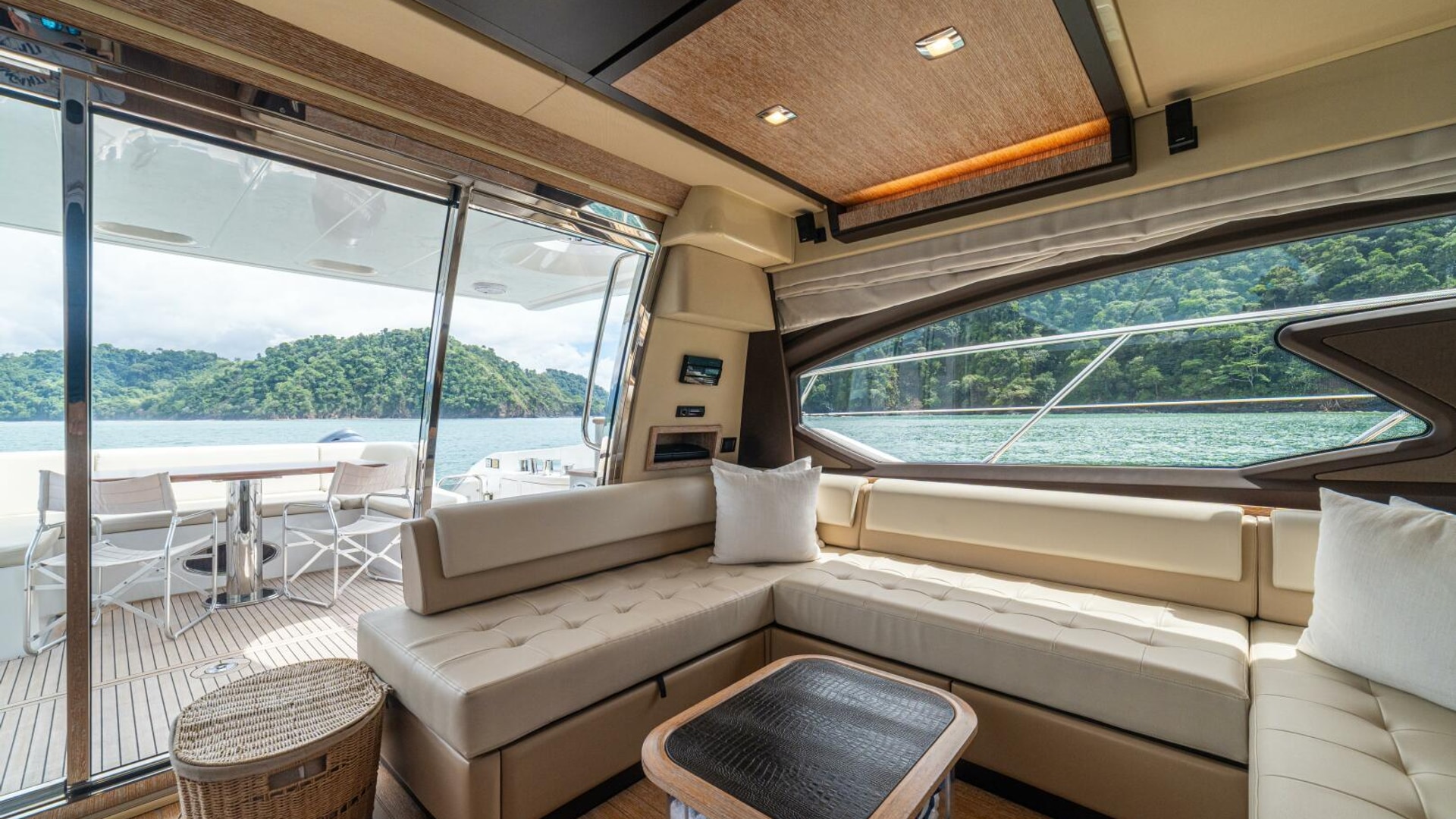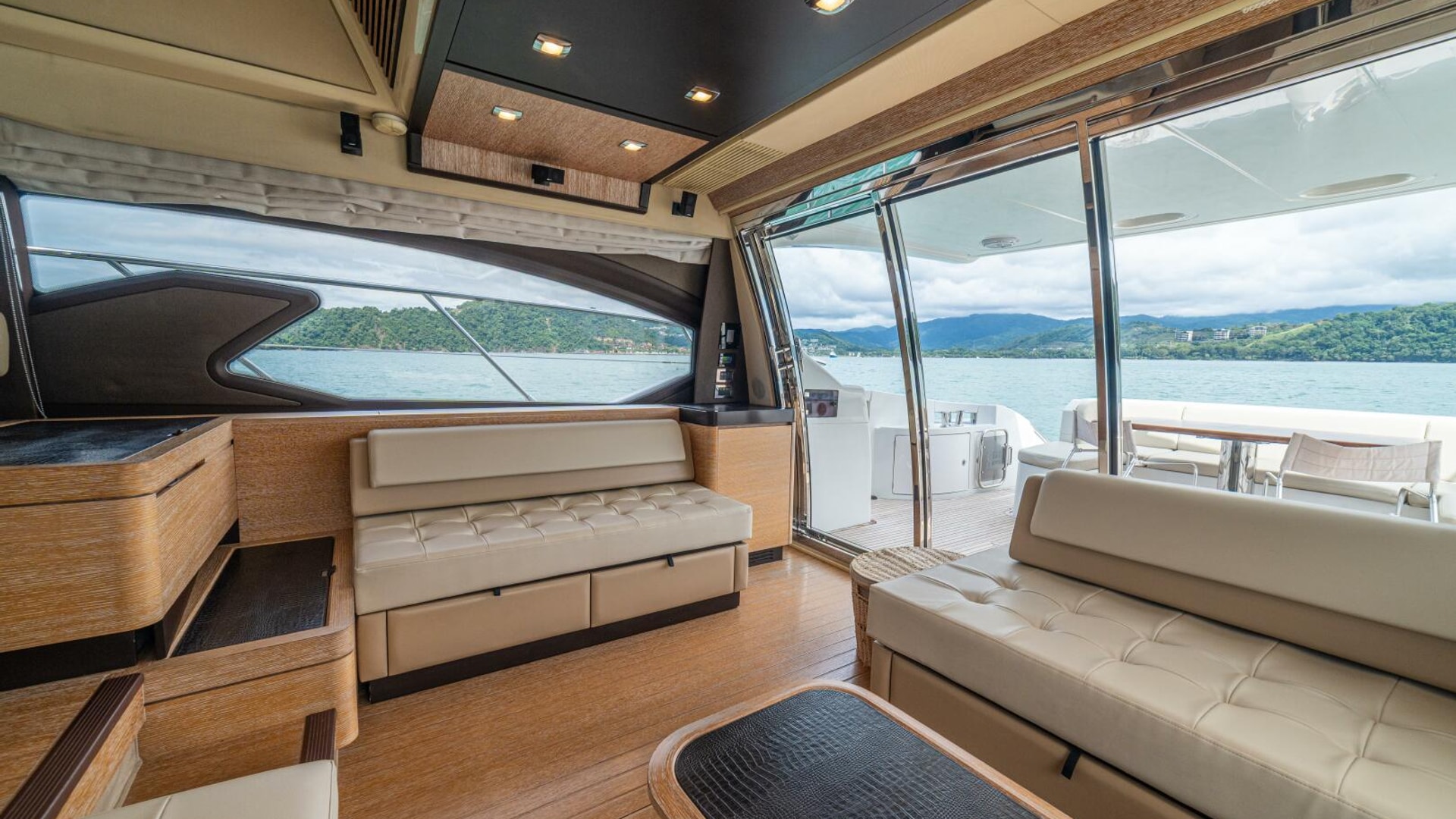 The cockpit area is spacious and well-appointed, featuring comfortable seating, quality finishes, and integrated entertainment and safety equipment. It provides ample space for relaxation, dining, and socializing, with easy access to the water and upper deck.
