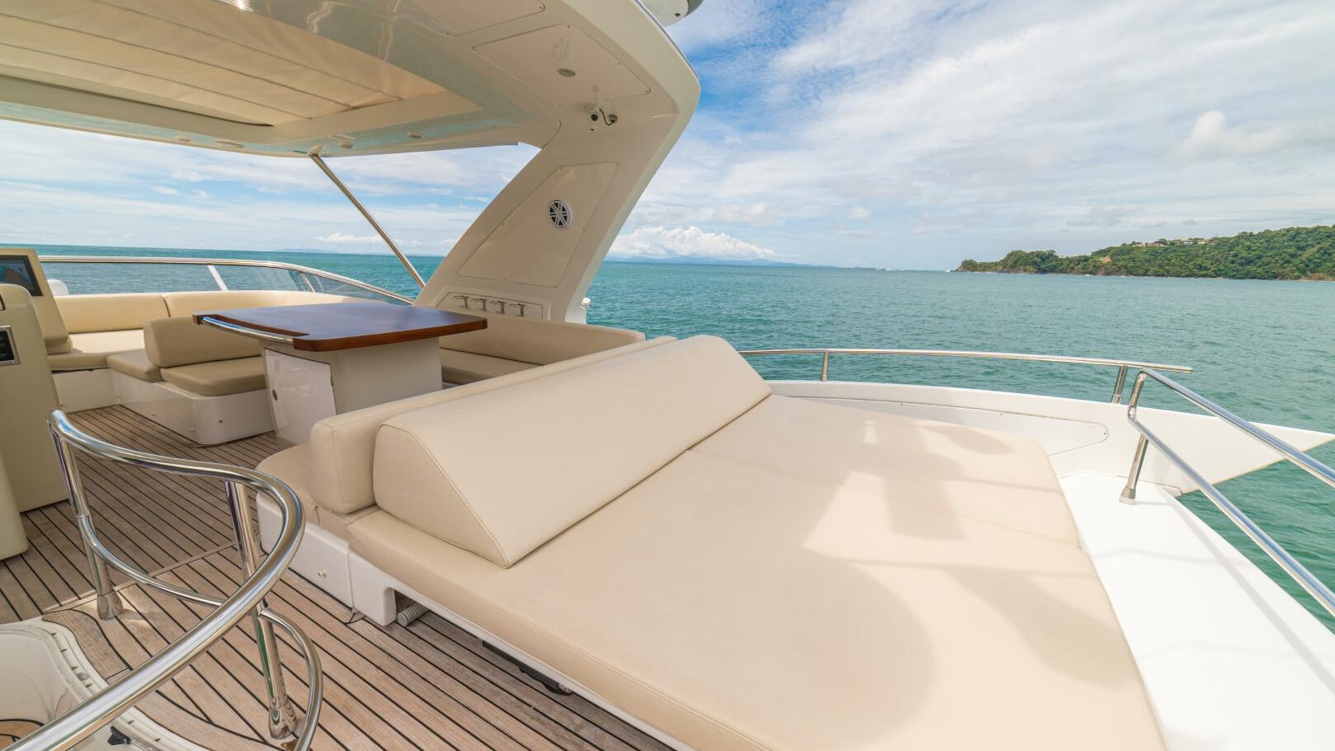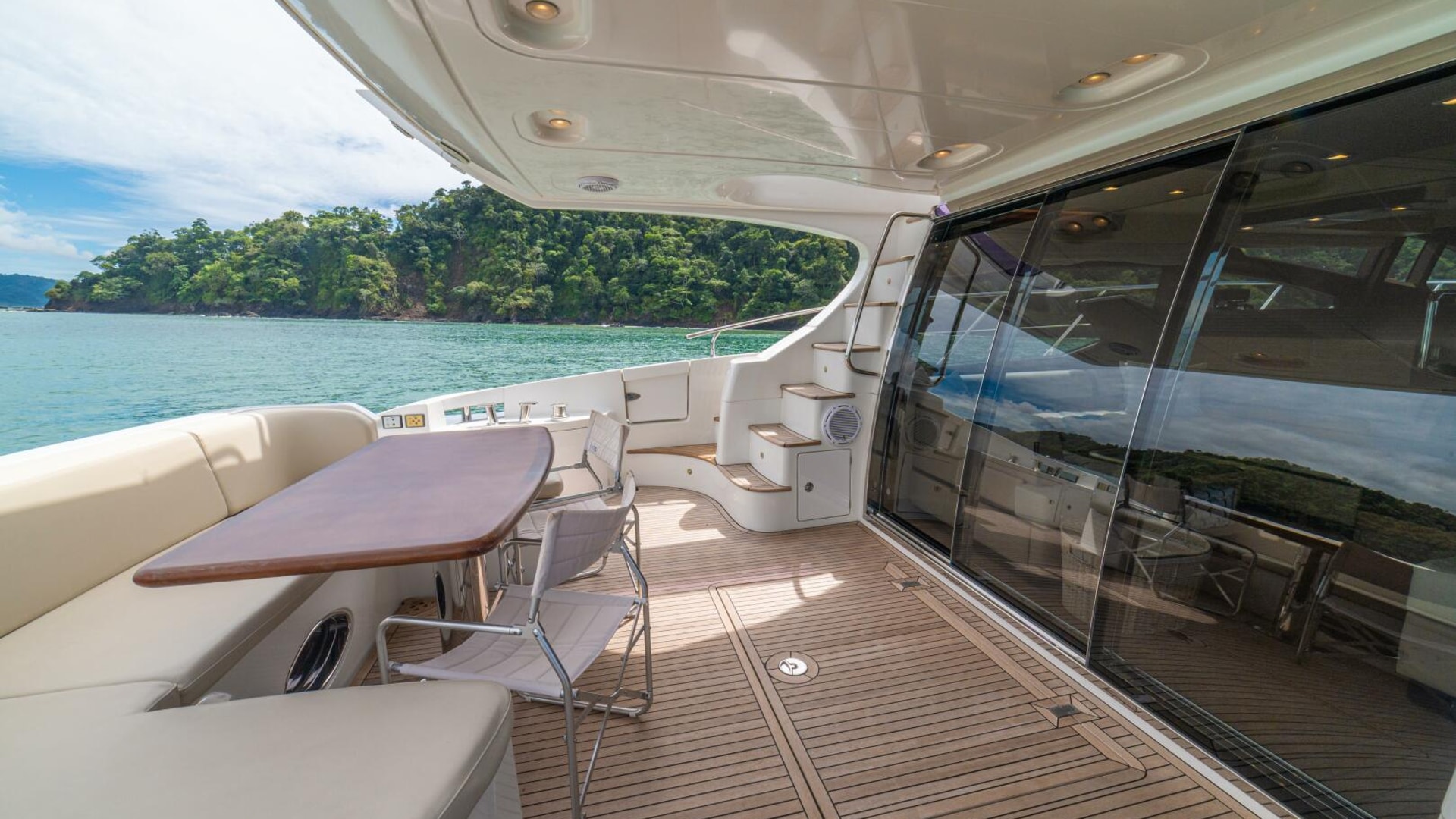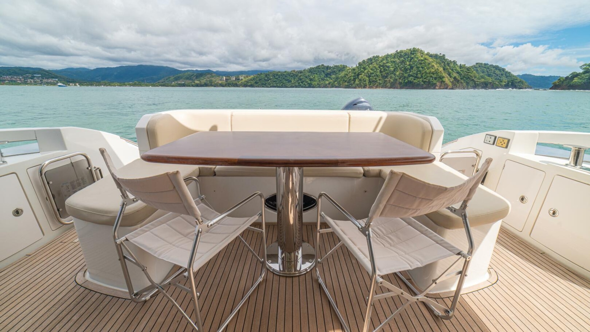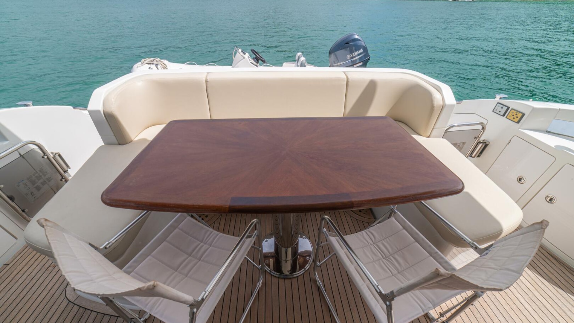 The cockpit area is spacious and well-appointed, featuring comfortable seating, quality finishes, and integrated entertainment and safety equipment. It provides ample space for relaxation, dining, and socializing, with easy access to the water and upper deck.