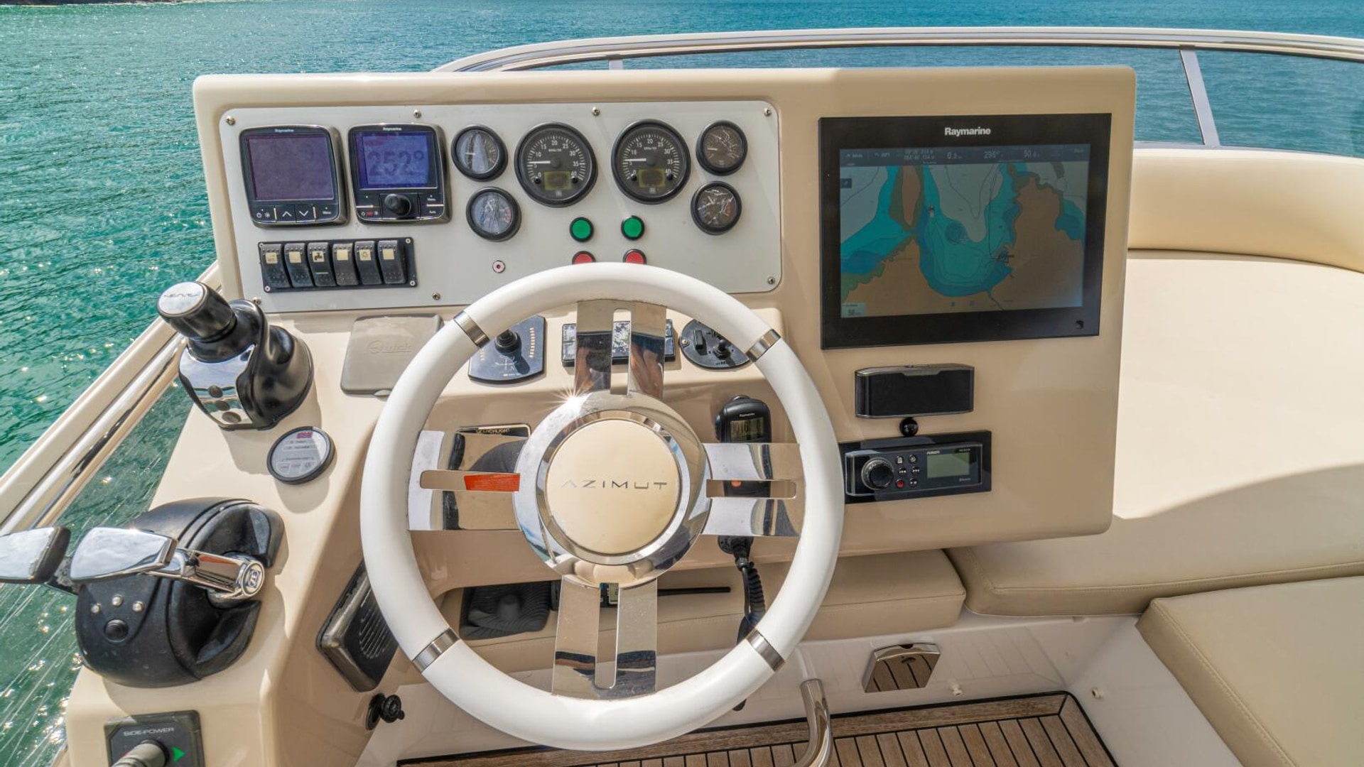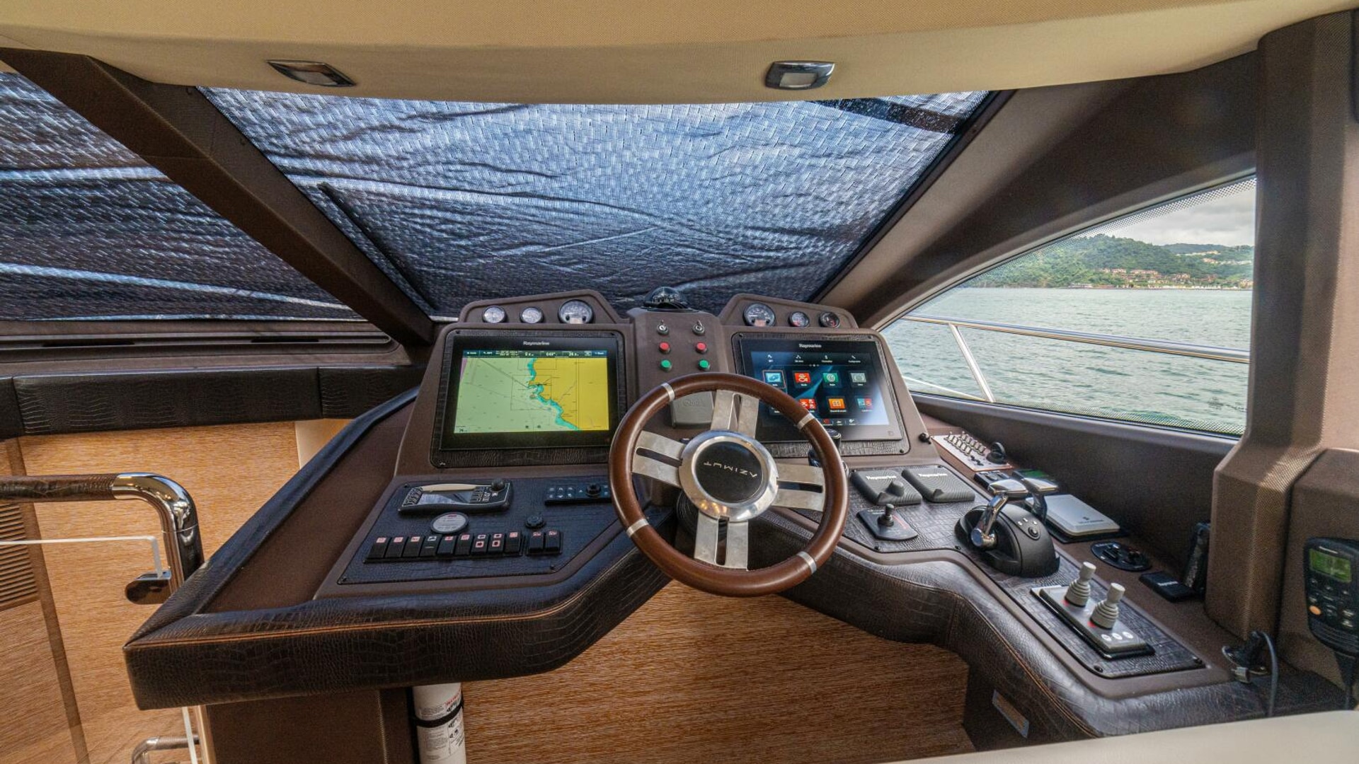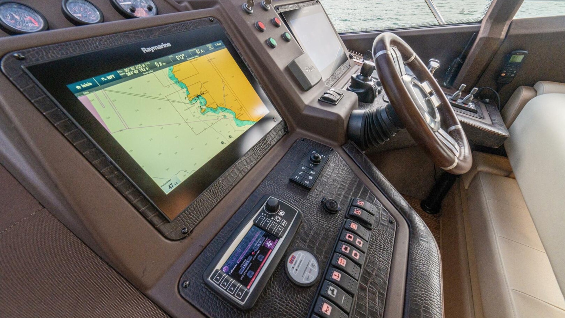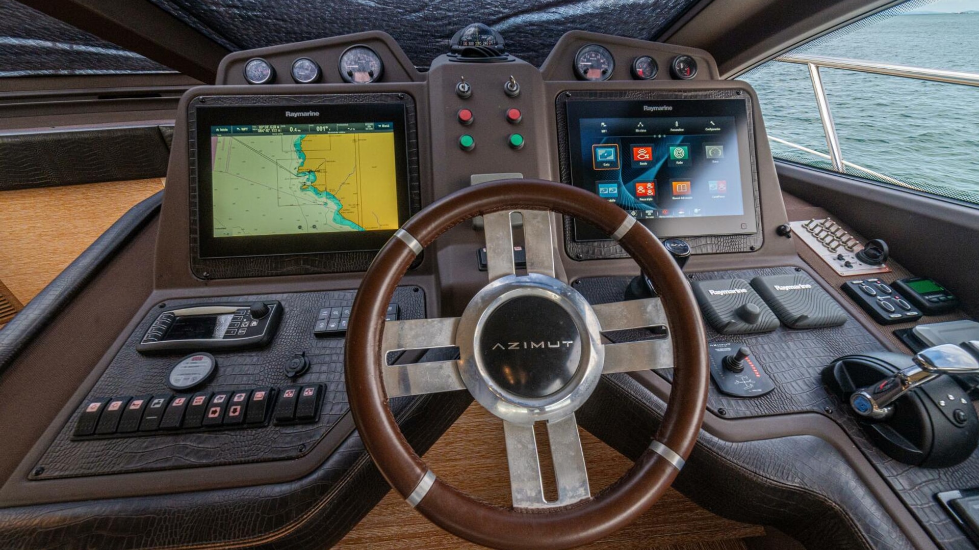 The helm station is equipped with advanced marine electronics and navigation instruments, neatly arranged for optimal visibility and ease of use.