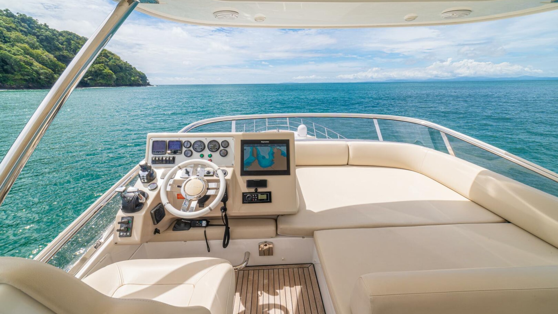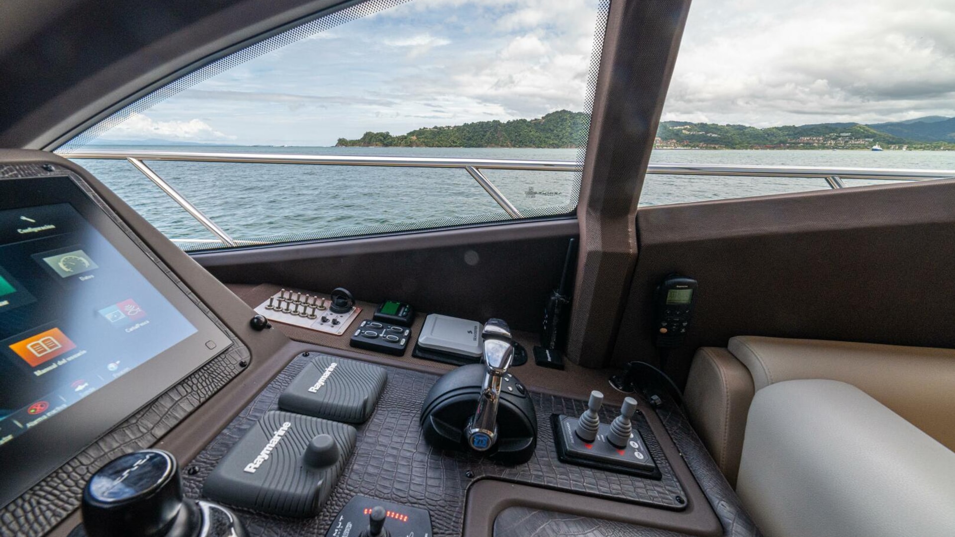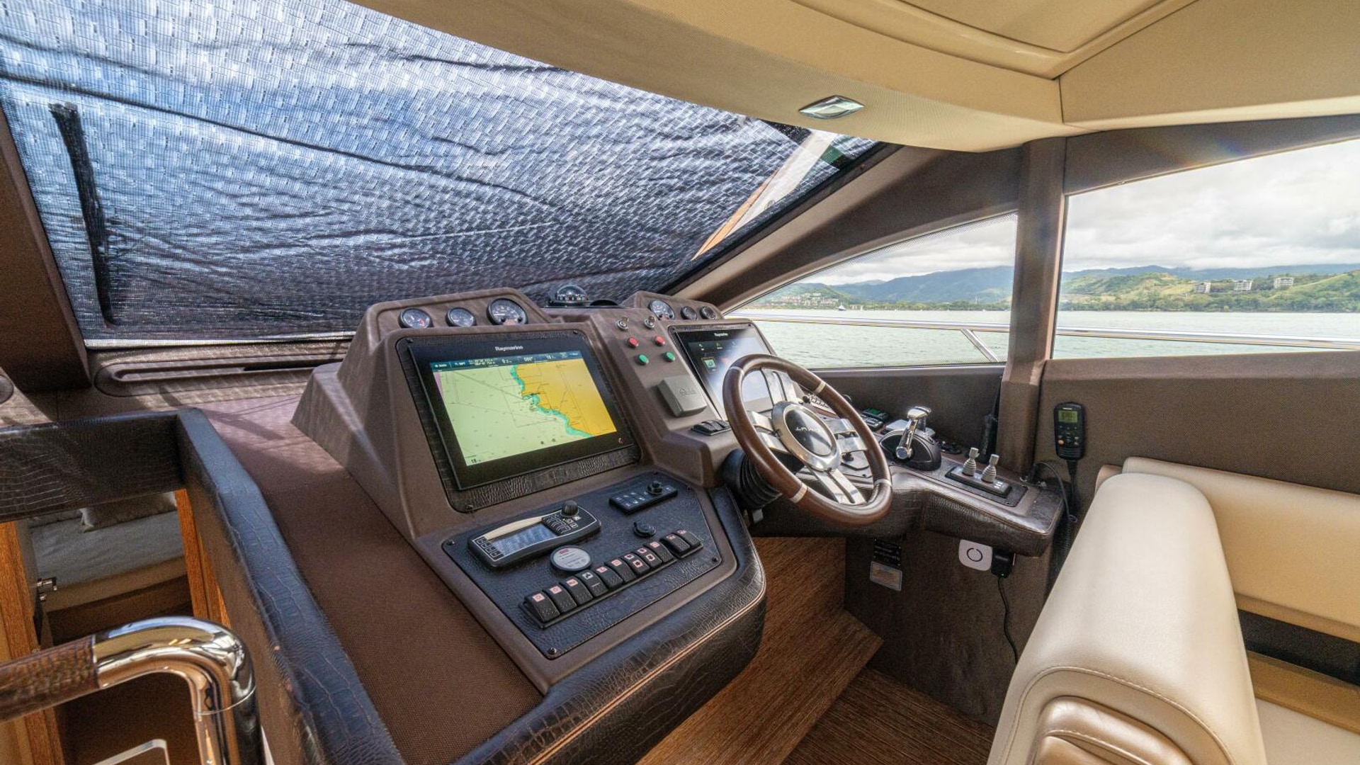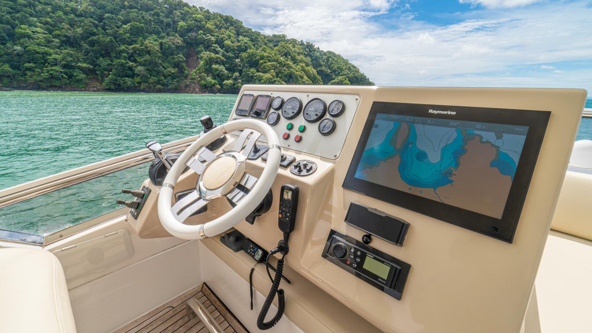 The helm station is equipped with advanced marine electronics and navigation instruments, neatly arranged for optimal visibility and ease of use.