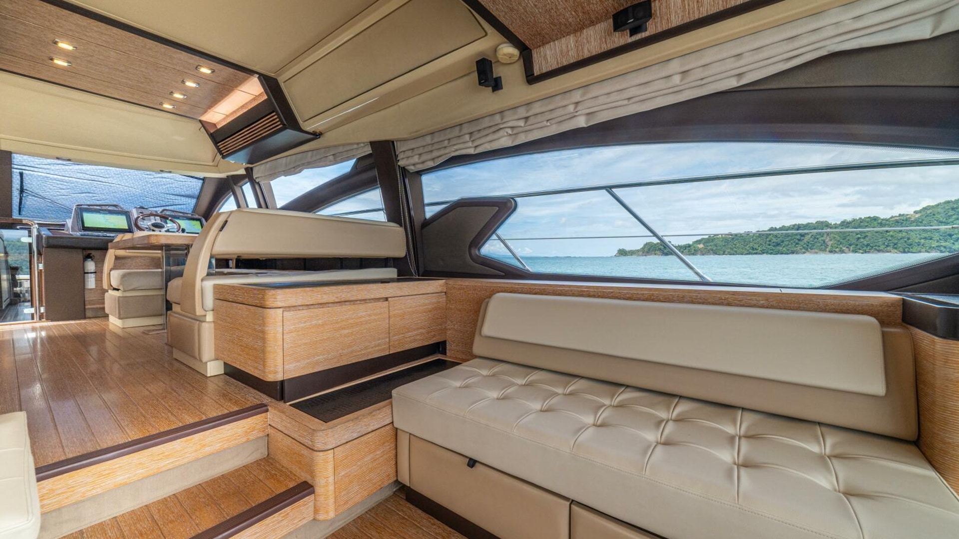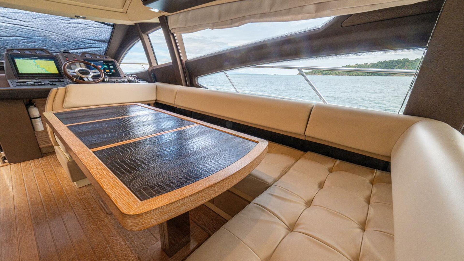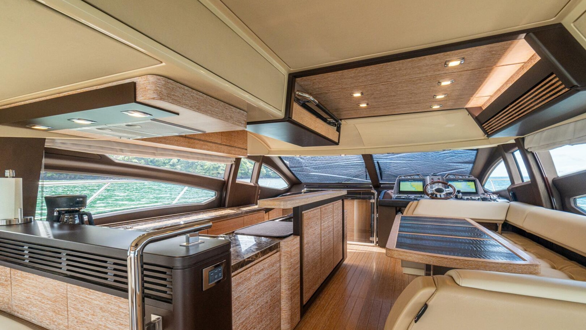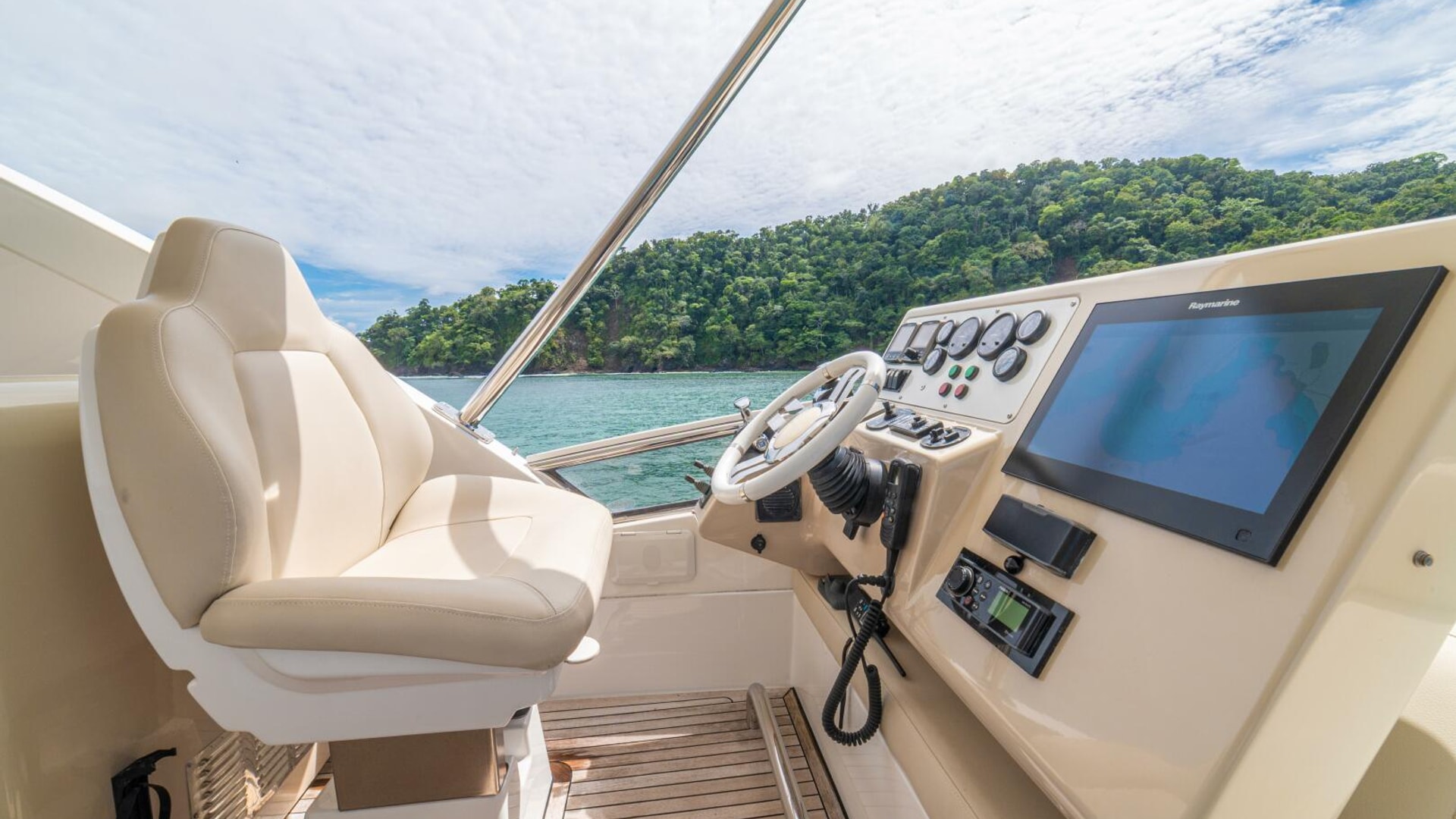 The helm station is equipped with advanced marine electronics and navigation instruments, neatly arranged for optimal visibility and ease of use.