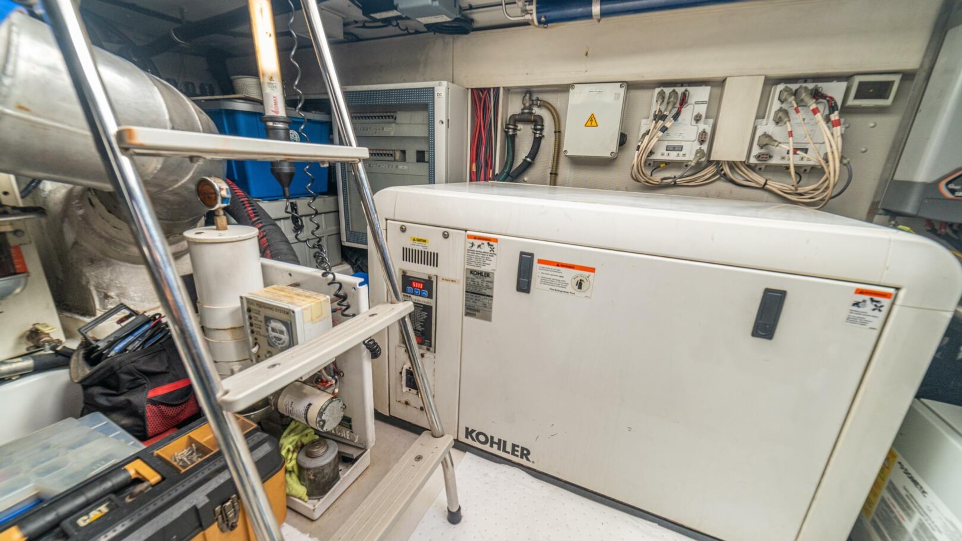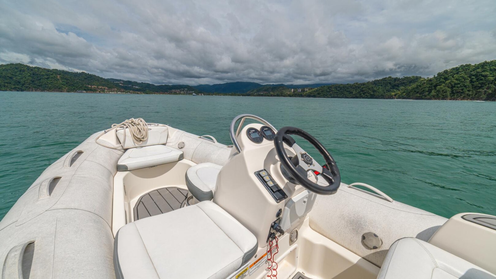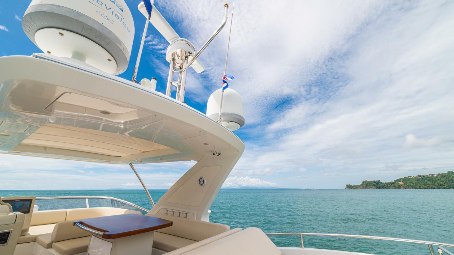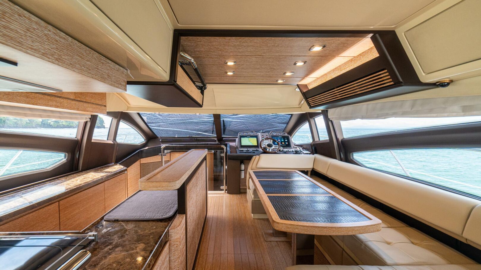 The helm station is equipped with advanced marine electronics and navigation instruments, neatly arranged for optimal visibility and ease of use.