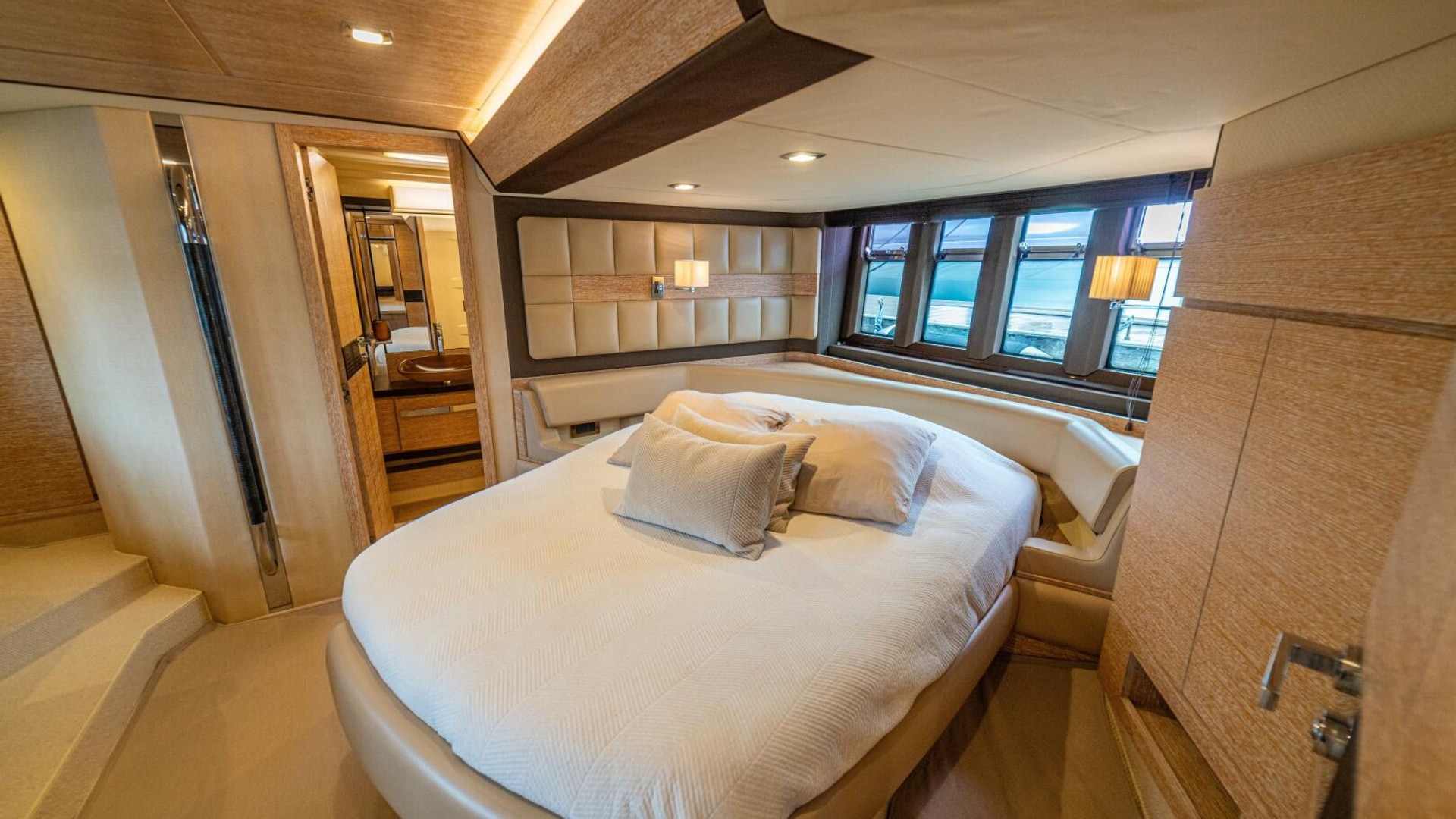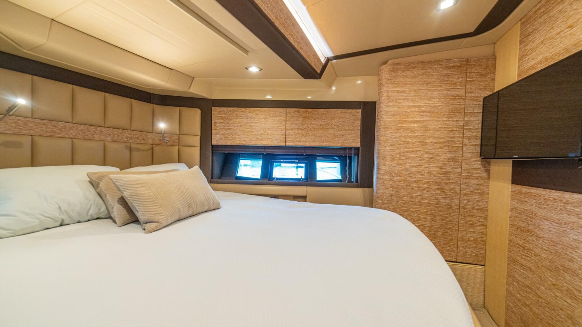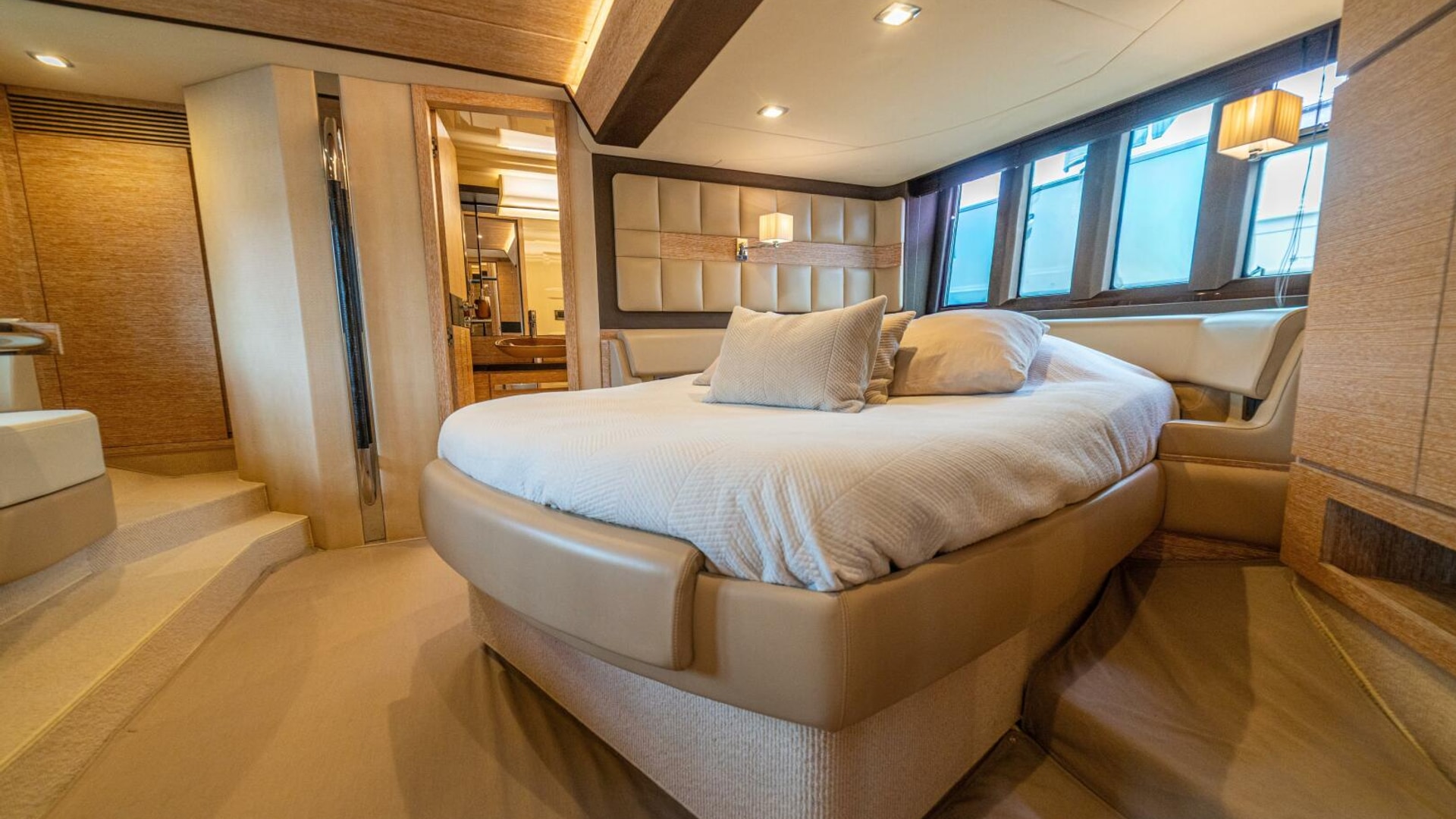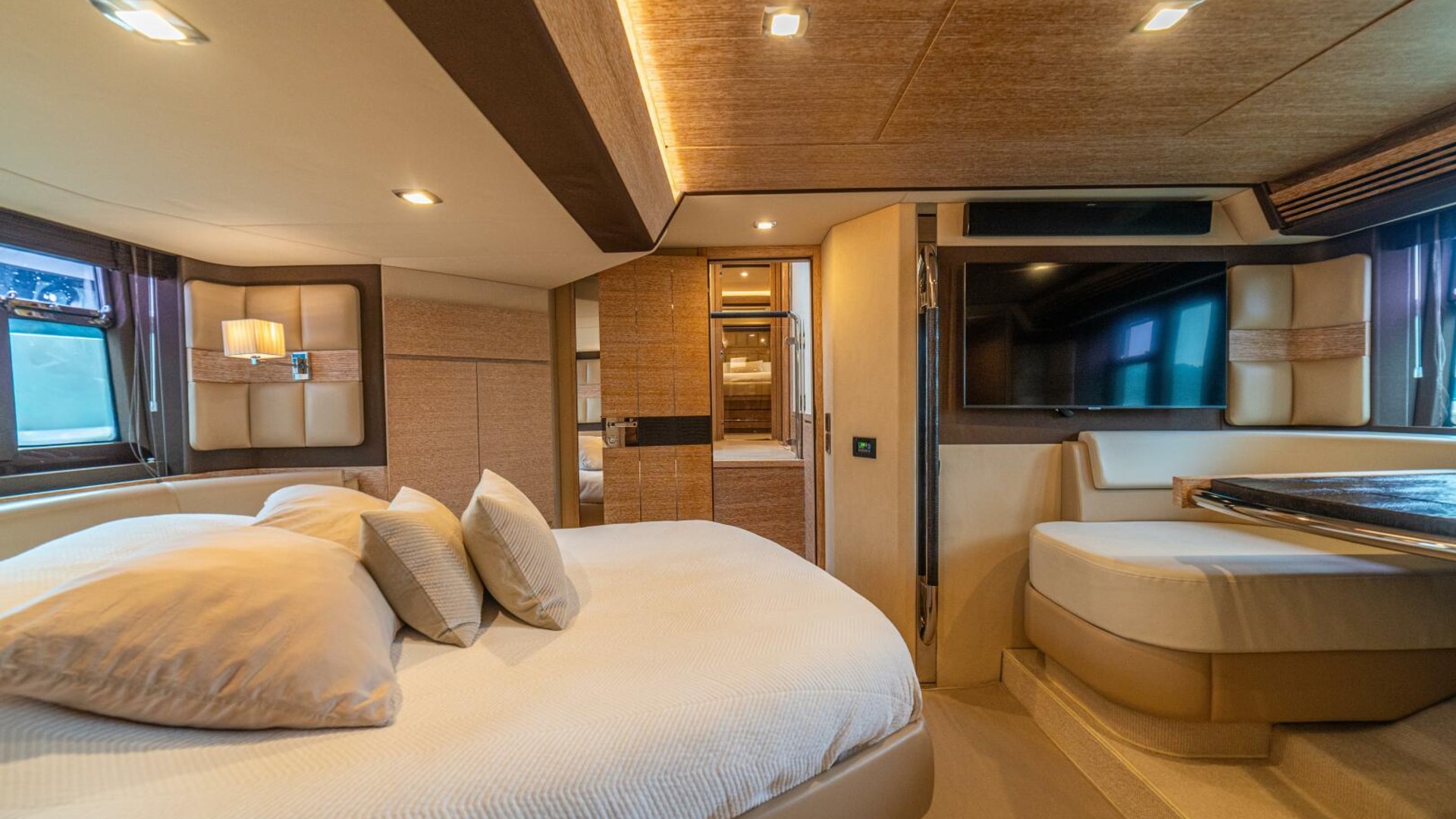 The master stateroom is elegantly appointed, featuring contemporary styling, luxurious finishes, and ample natural lighting. It offers comfortable accommodations, entertainment amenities, and practical storage solutions.