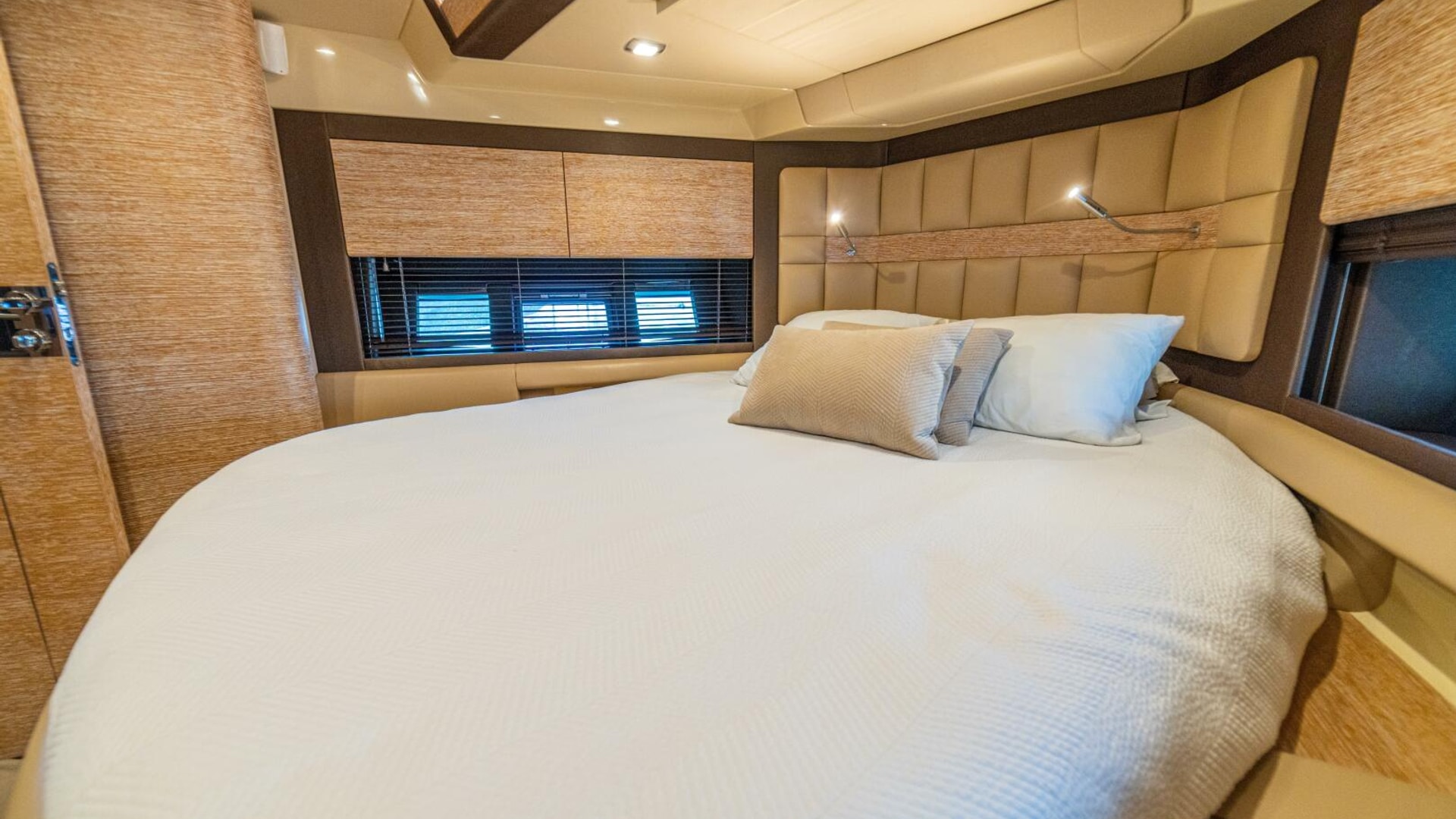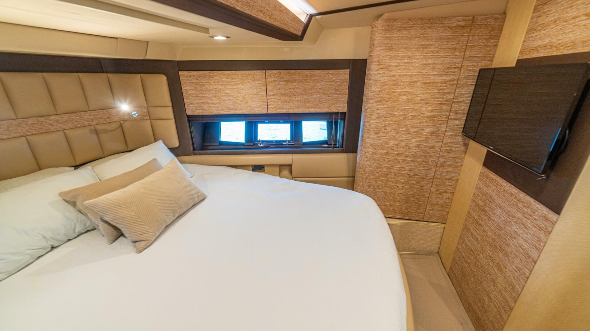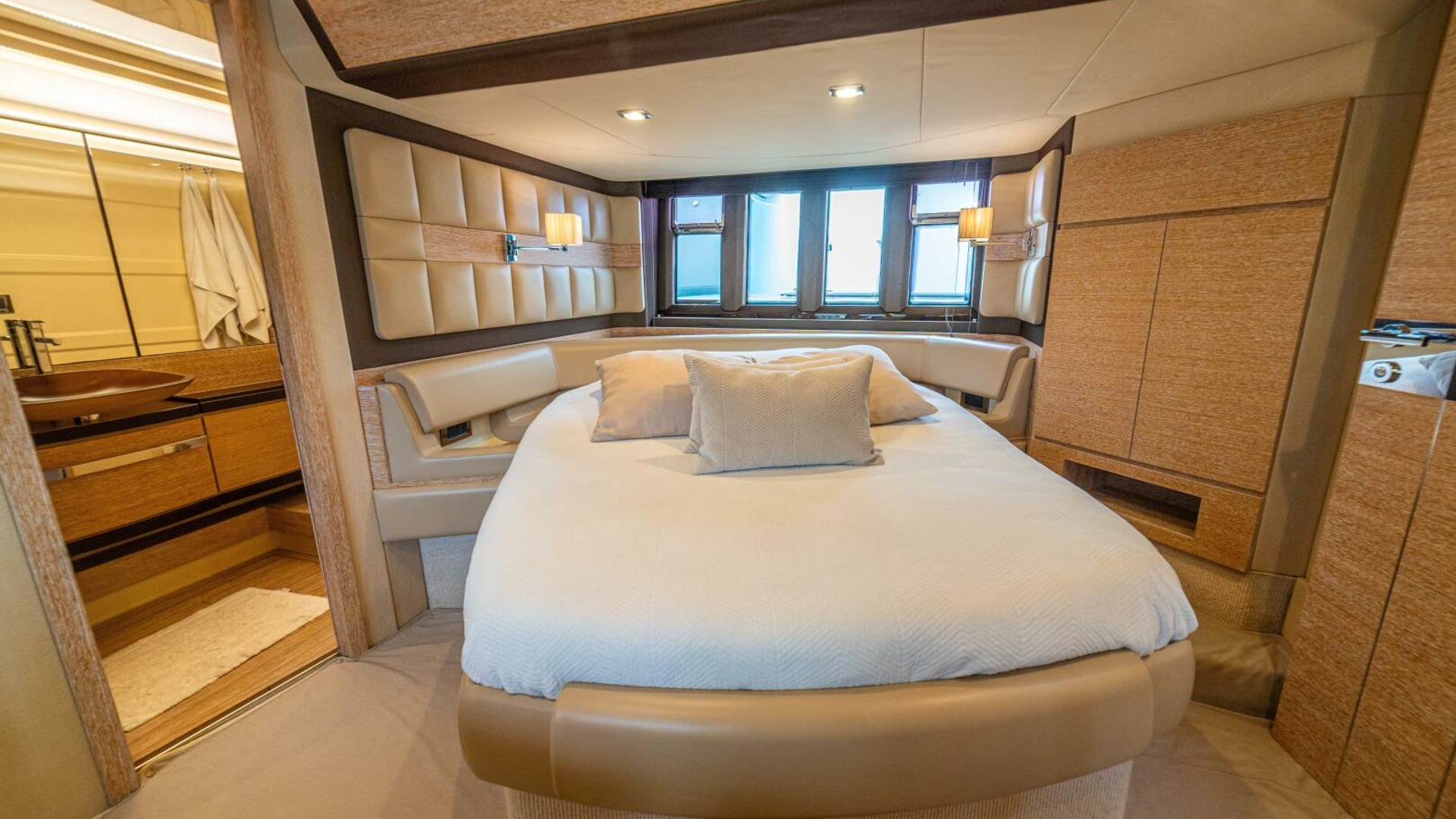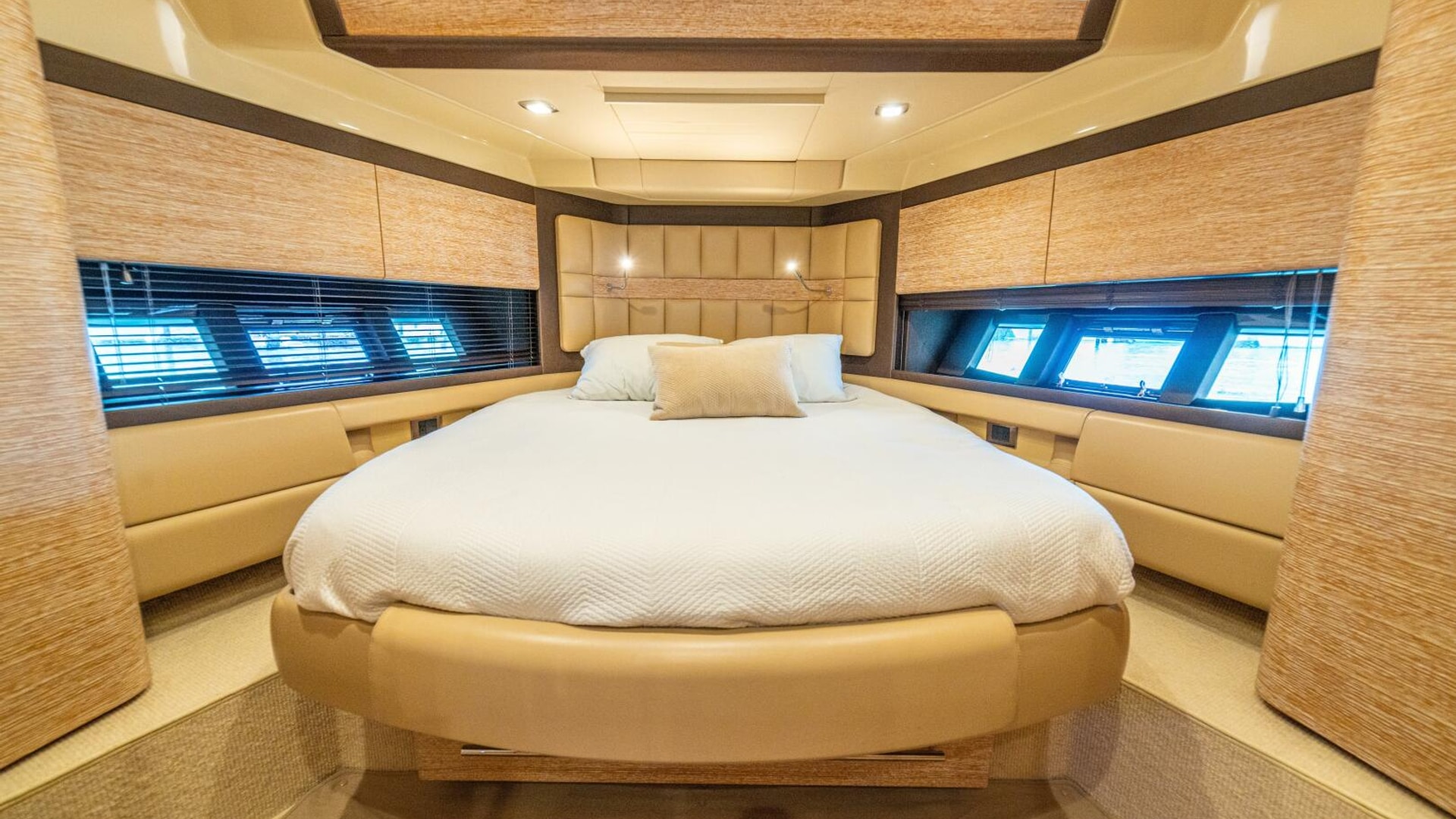 The master stateroom is elegantly appointed, featuring contemporary styling, luxurious finishes, and ample natural lighting. It offers comfortable accommodations, entertainment amenities, and practical storage solutions.