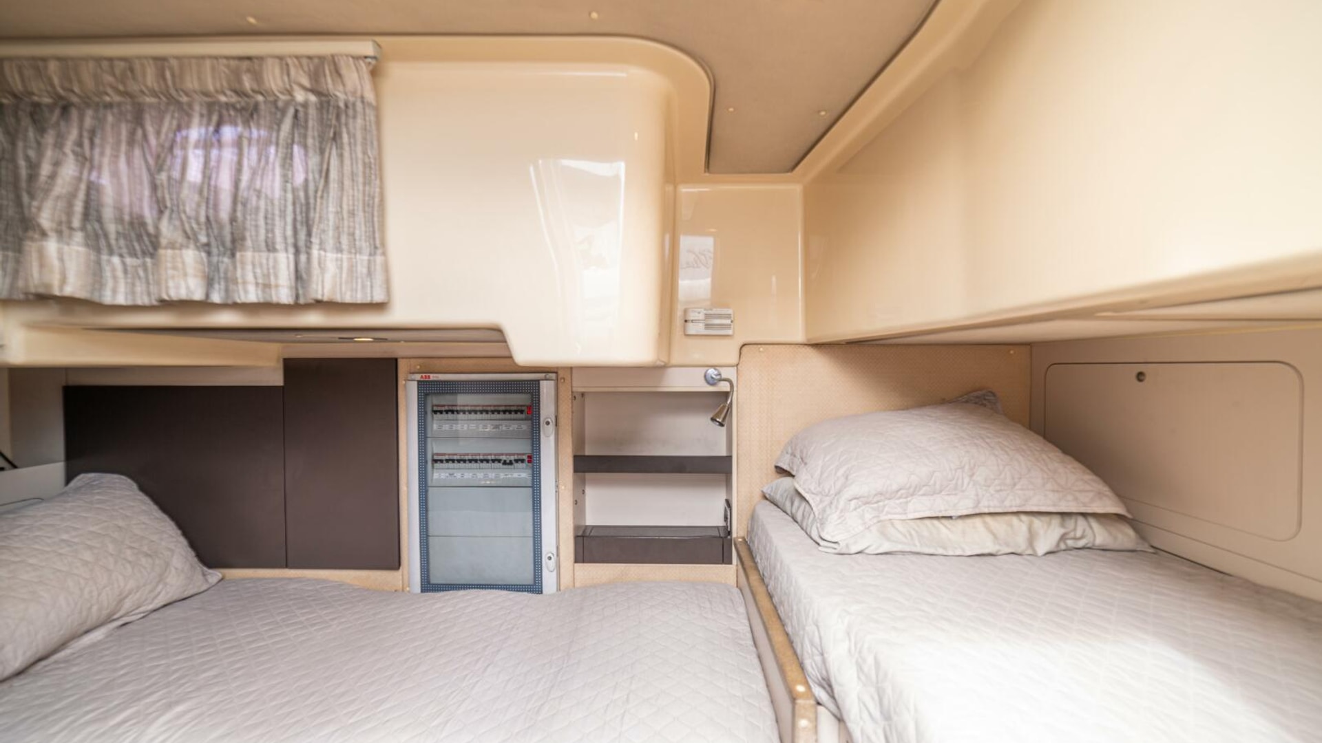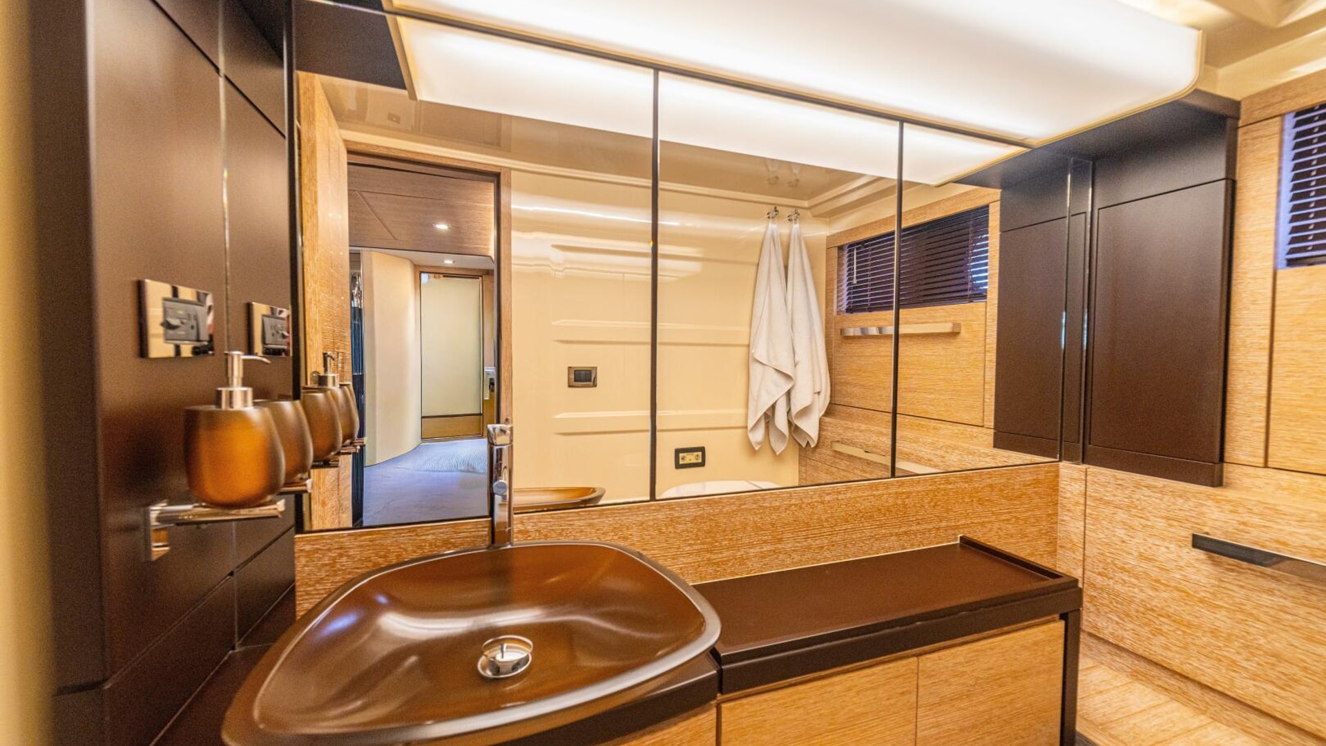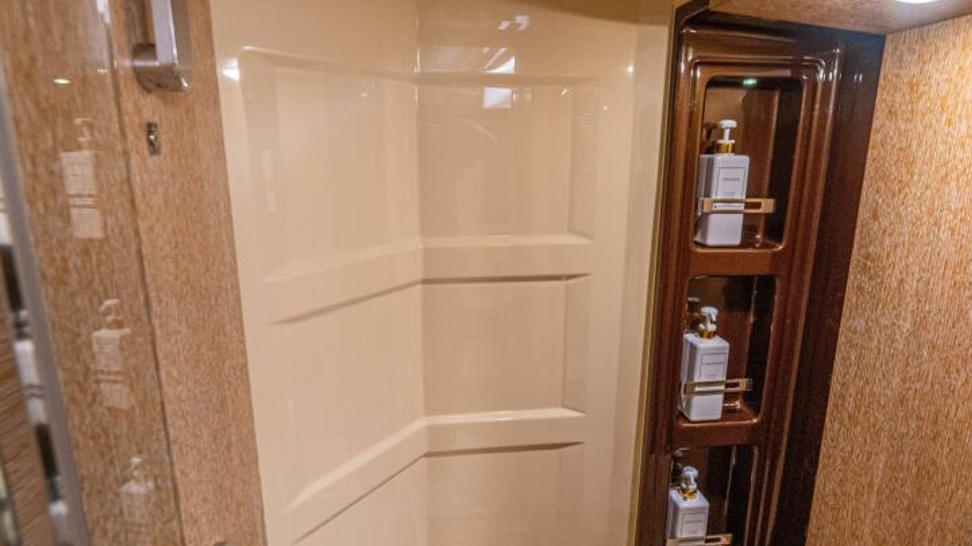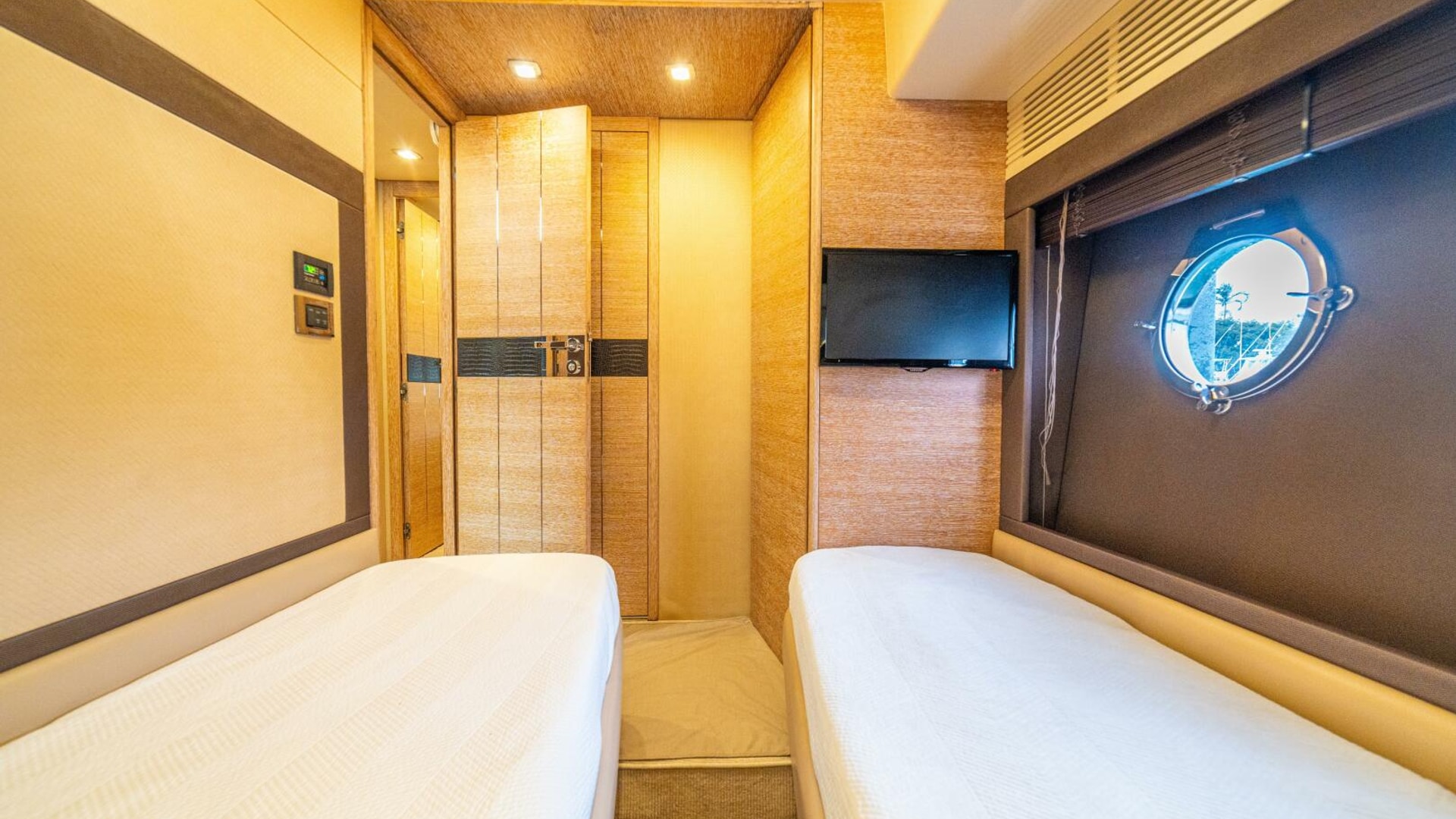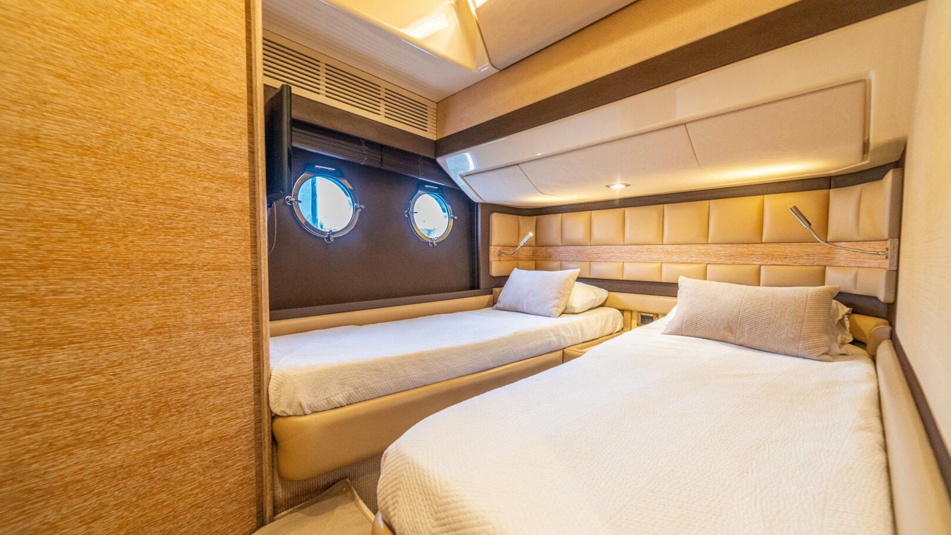 The master stateroom is elegantly appointed, featuring contemporary styling, luxurious finishes, and ample natural lighting. It offers comfortable accommodations, entertainment amenities, and practical storage solutions.