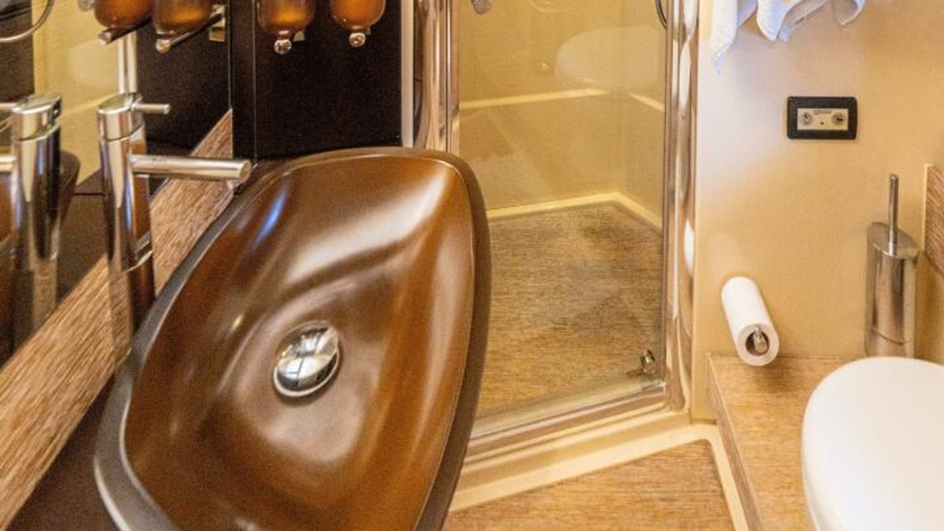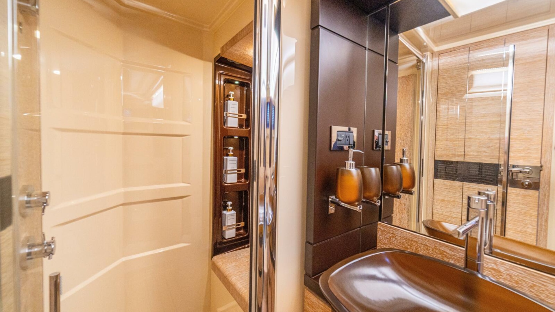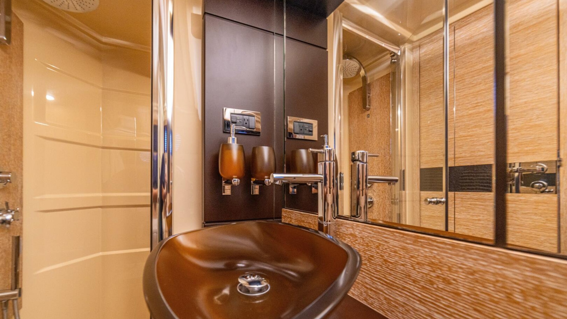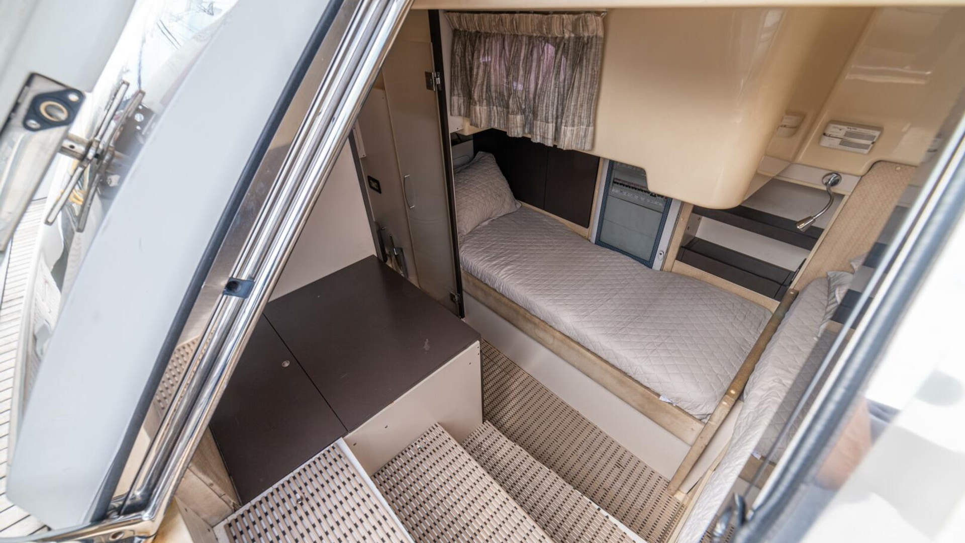 The master stateroom is elegantly appointed, featuring contemporary styling, luxurious finishes, and ample natural lighting. It offers comfortable accommodations, entertainment amenities, and practical storage solutions.