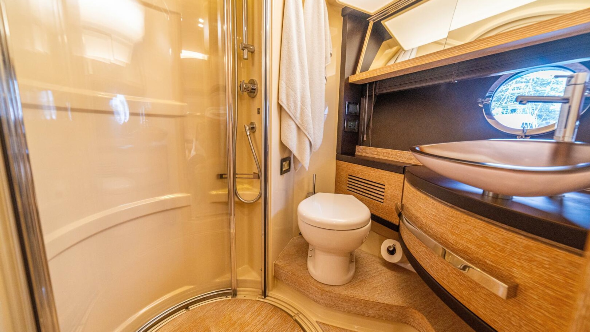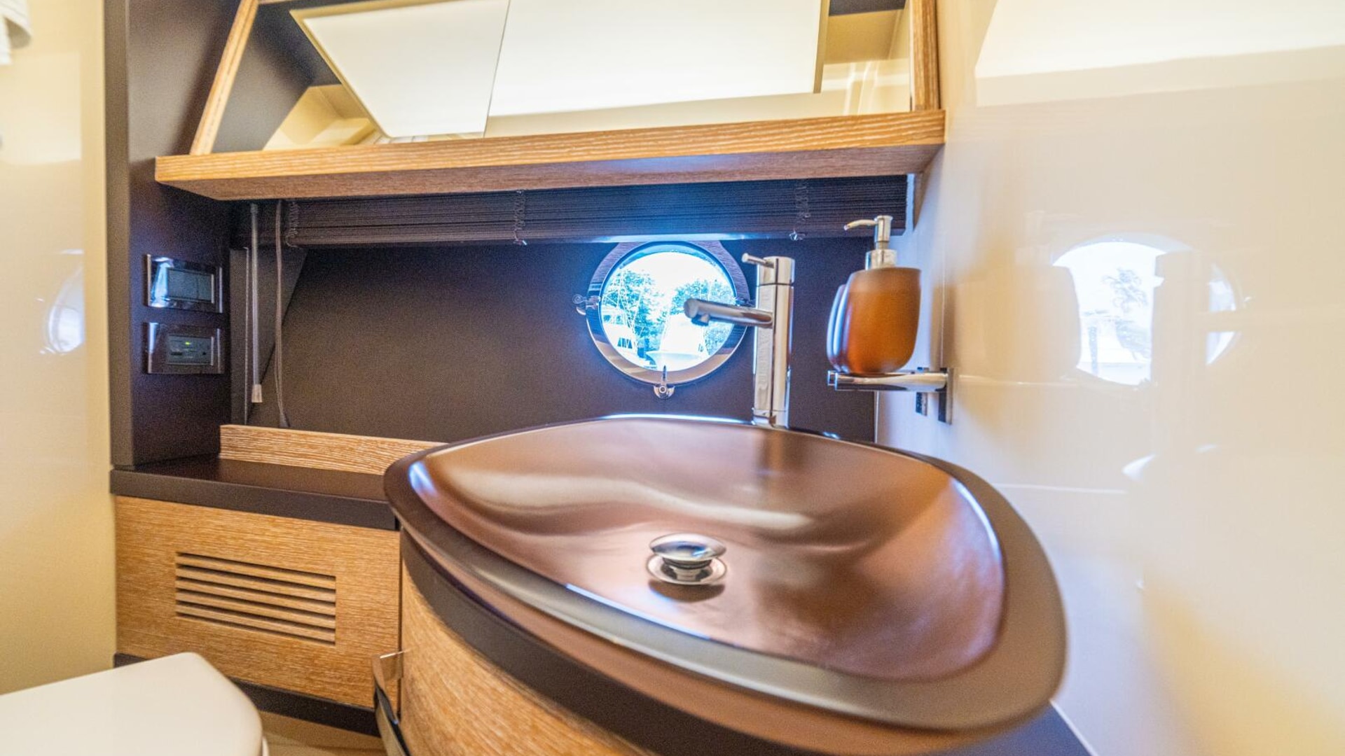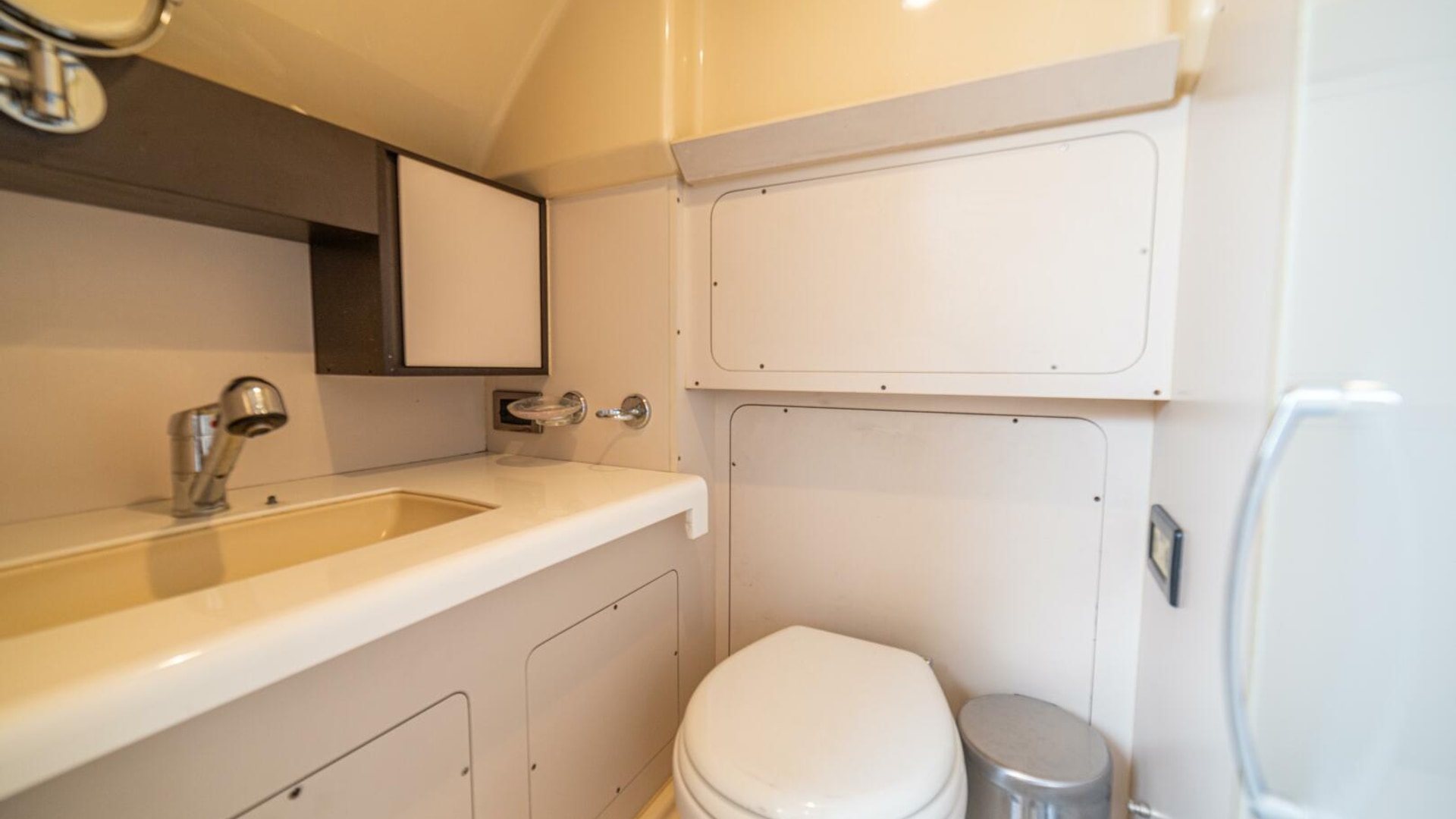 - Ensuite head compartment with marine toilet, window with privacy blinds, and storage cabinetry