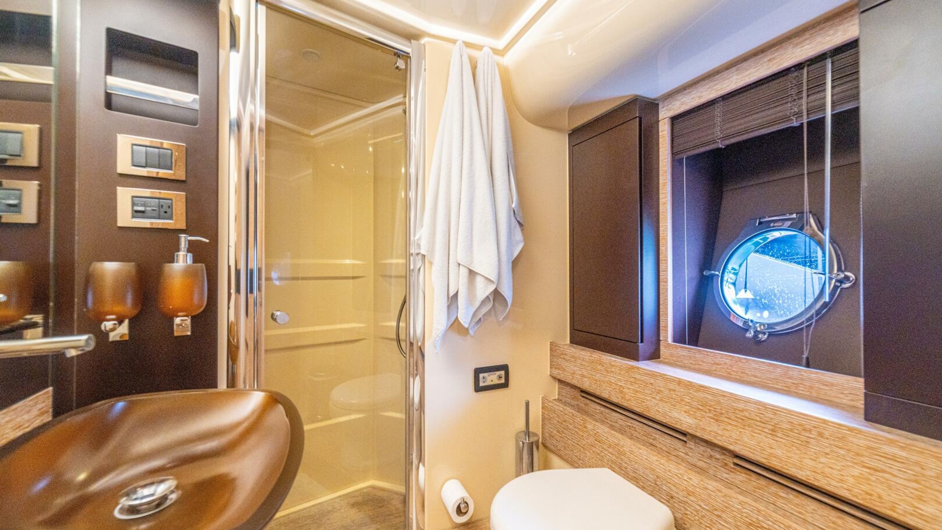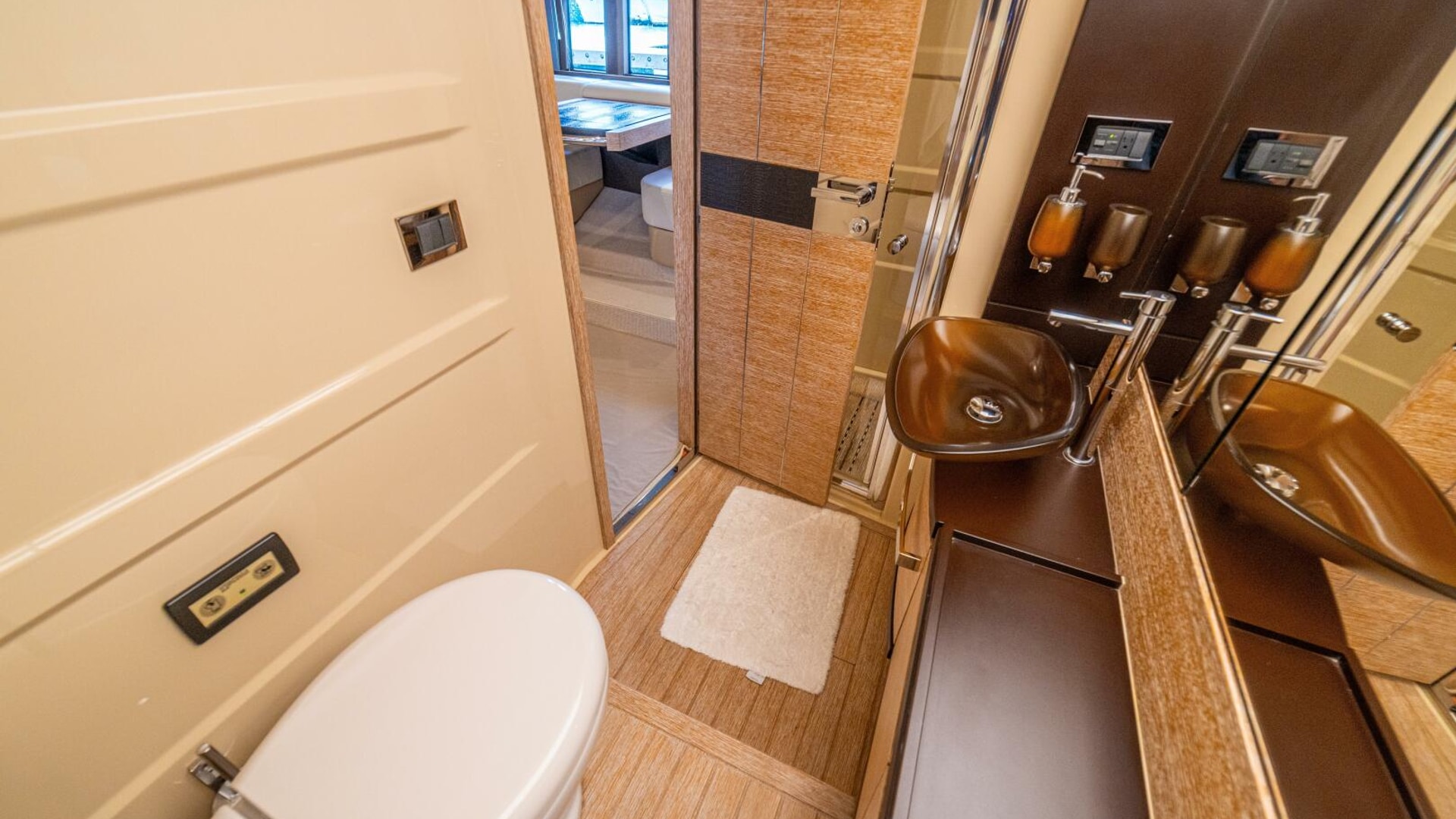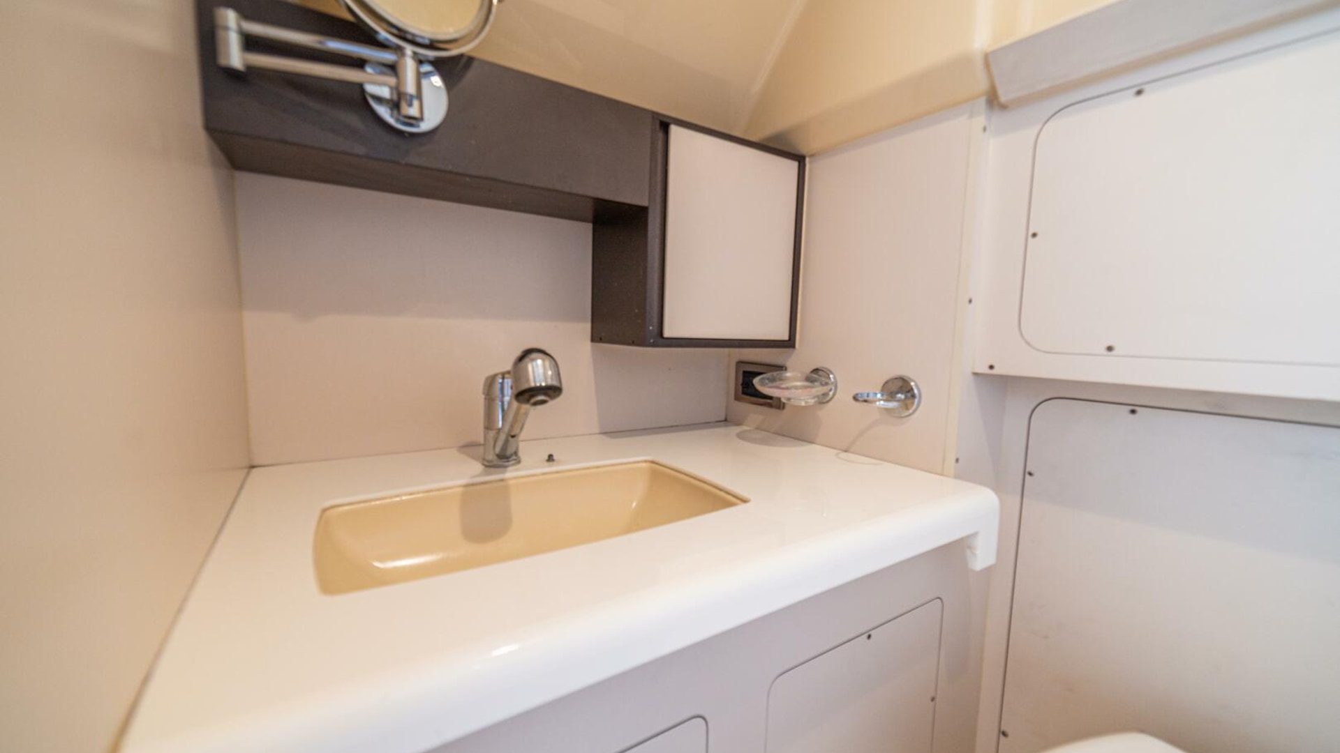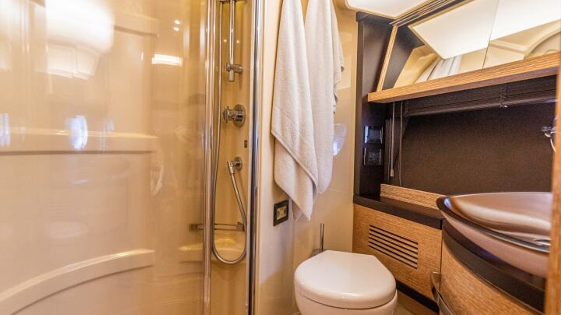 - Ensuite head compartment with marine toilet, window with privacy blinds, and storage cabinetry
