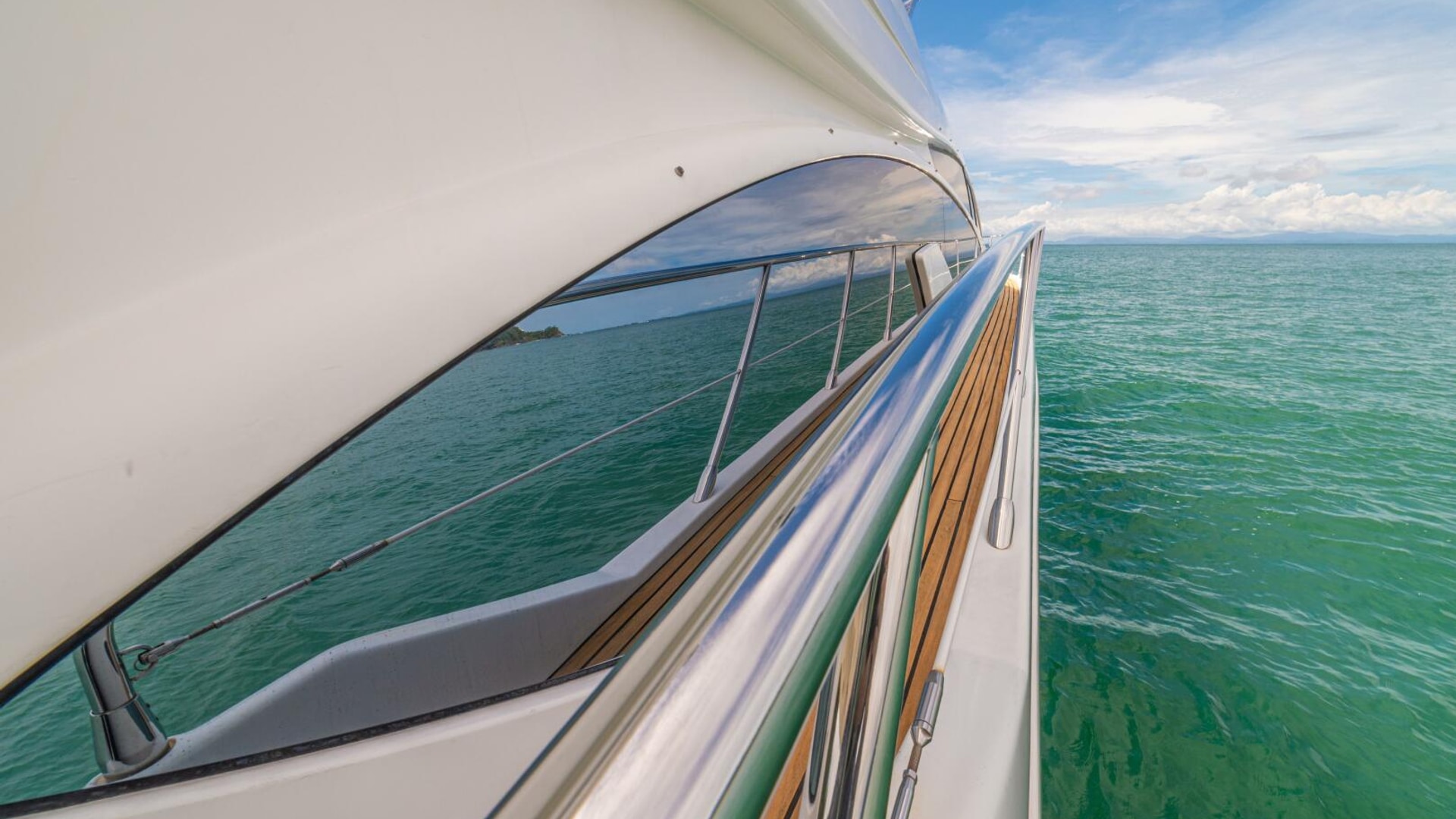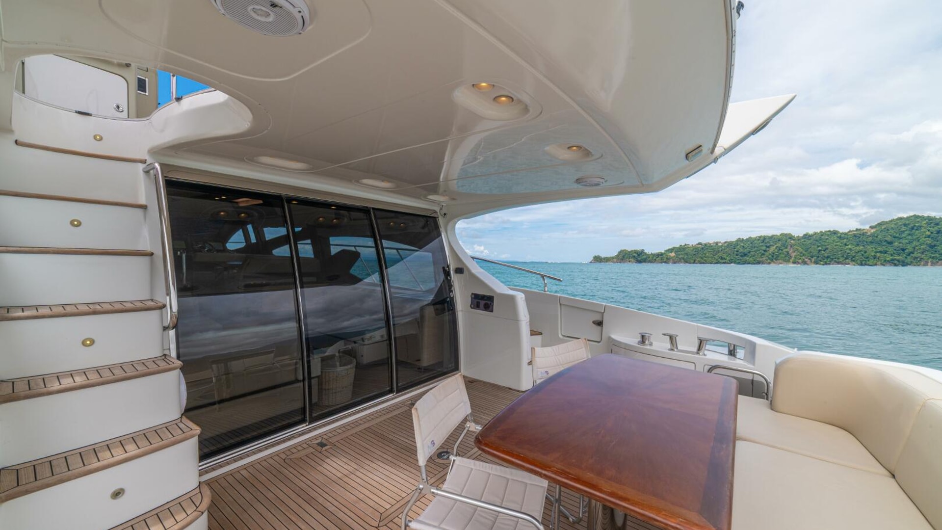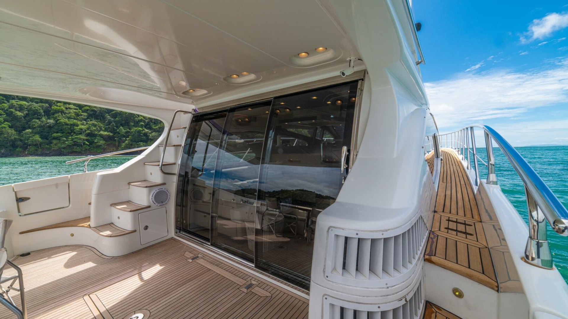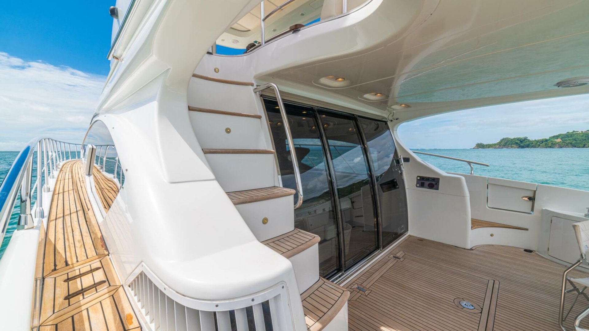 - Cockpit stairs leading to upper deck with teak steps and stainless-steel handrail